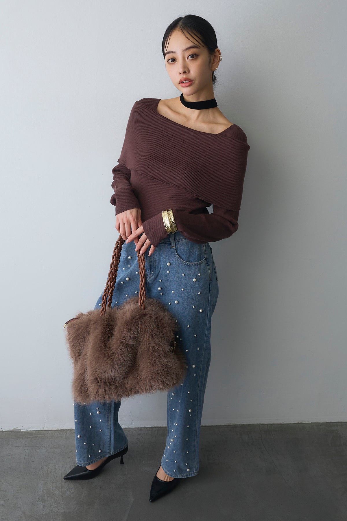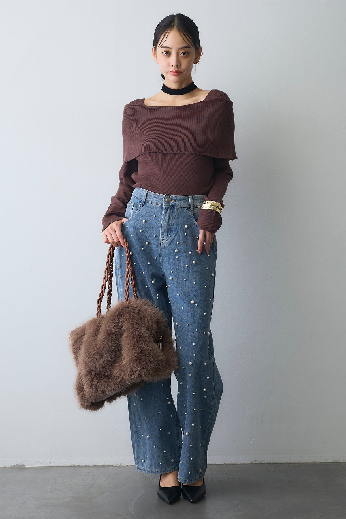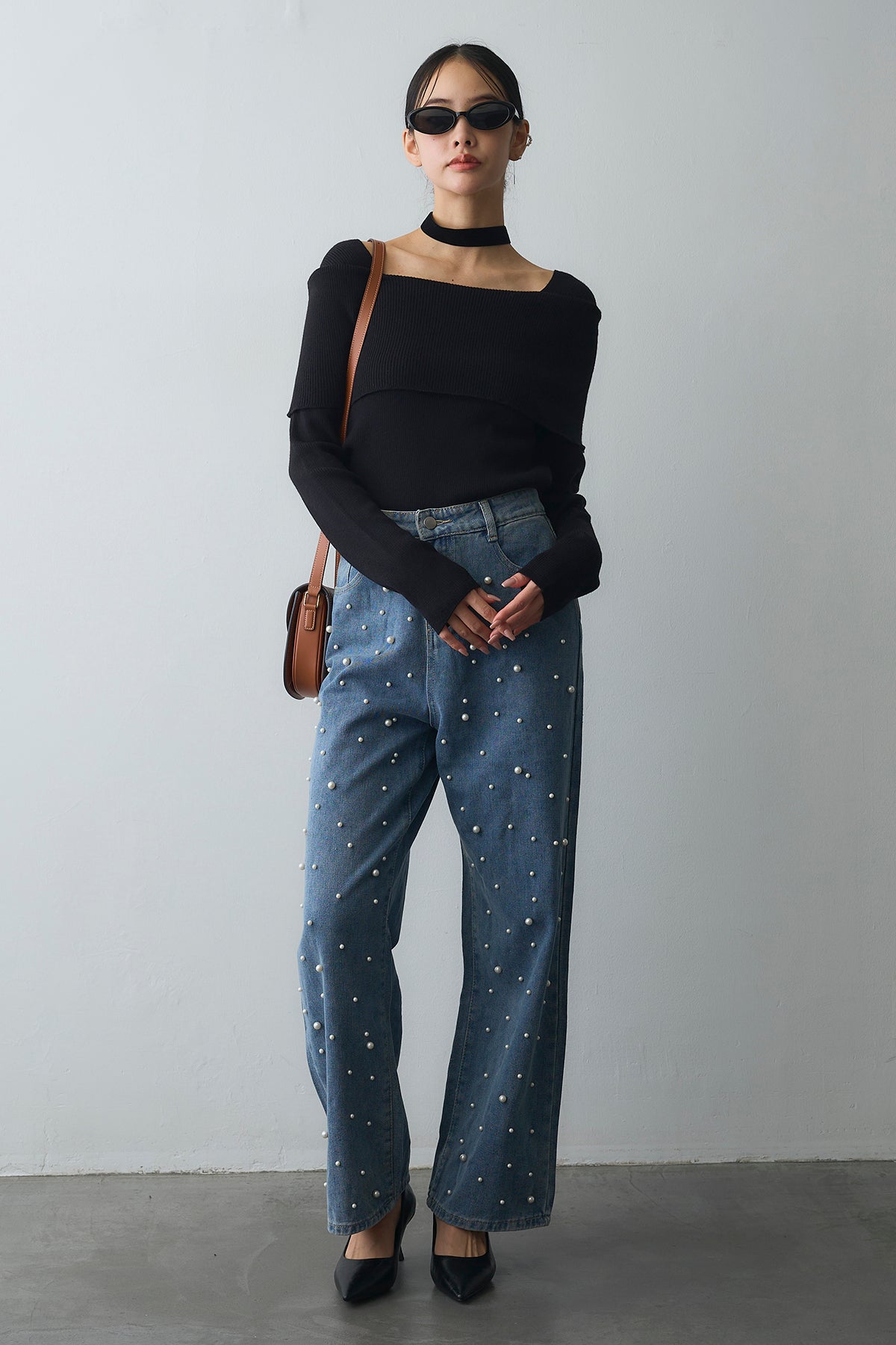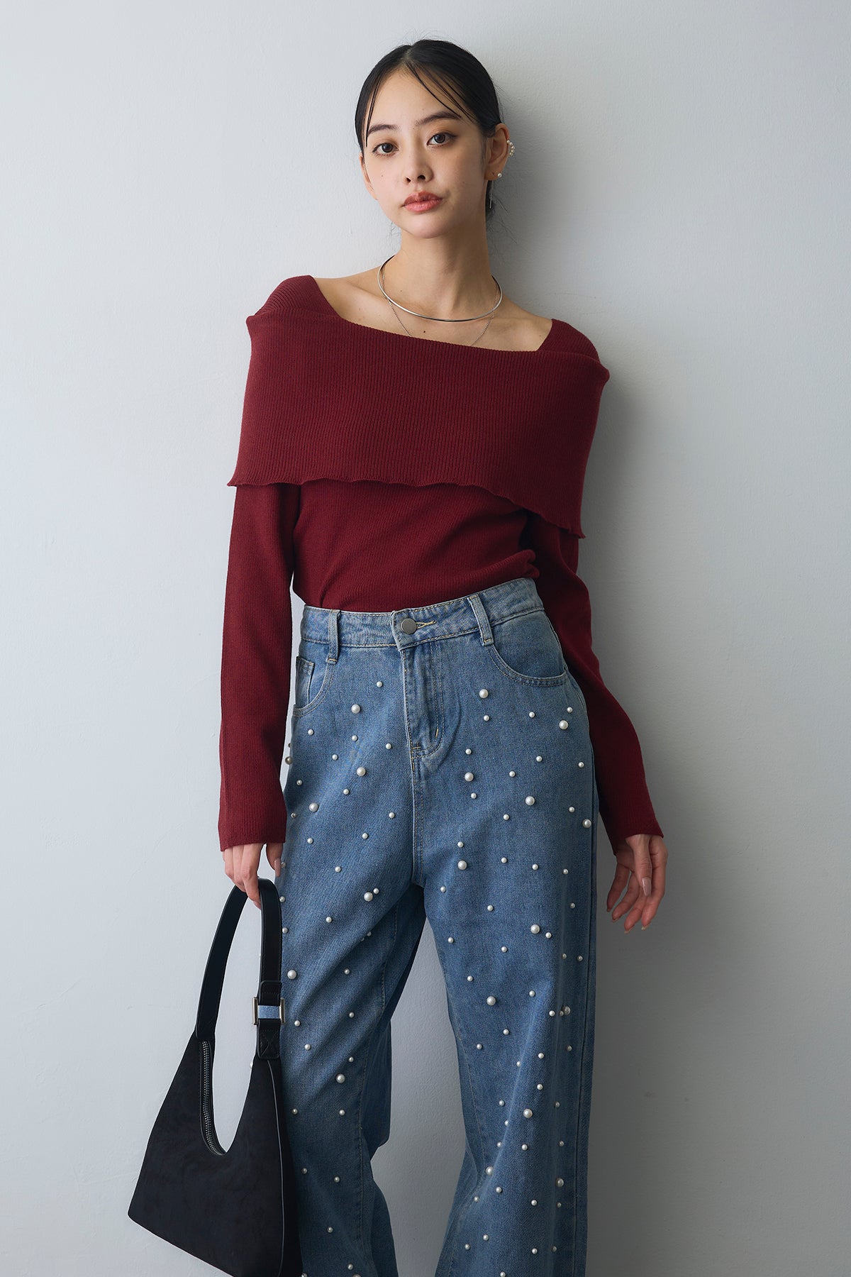 [予約/SET]リブオフショルロングスリーブニット+ランダムパールハイウエストストレートデニム(2set)