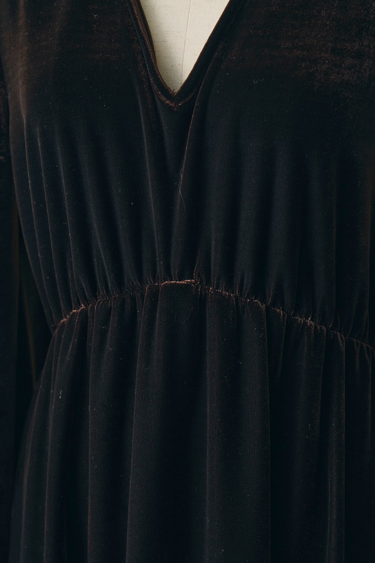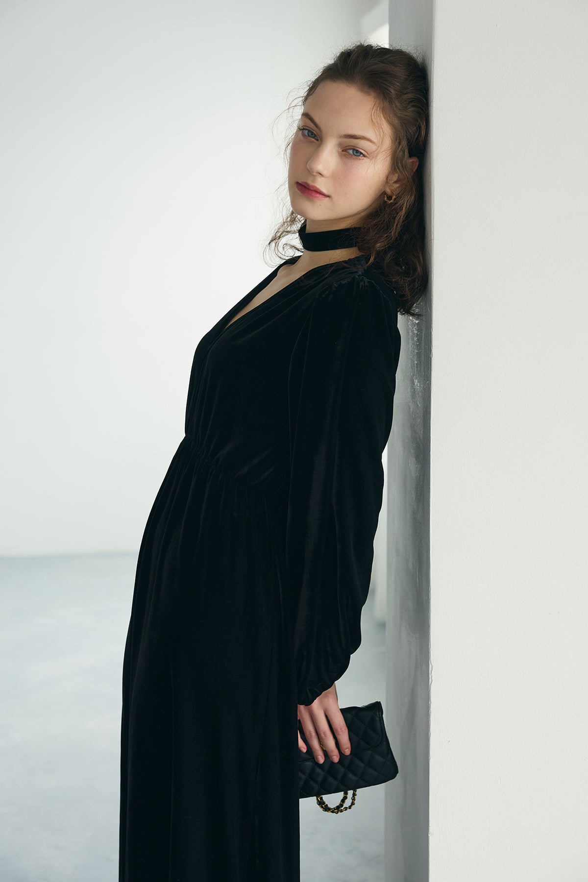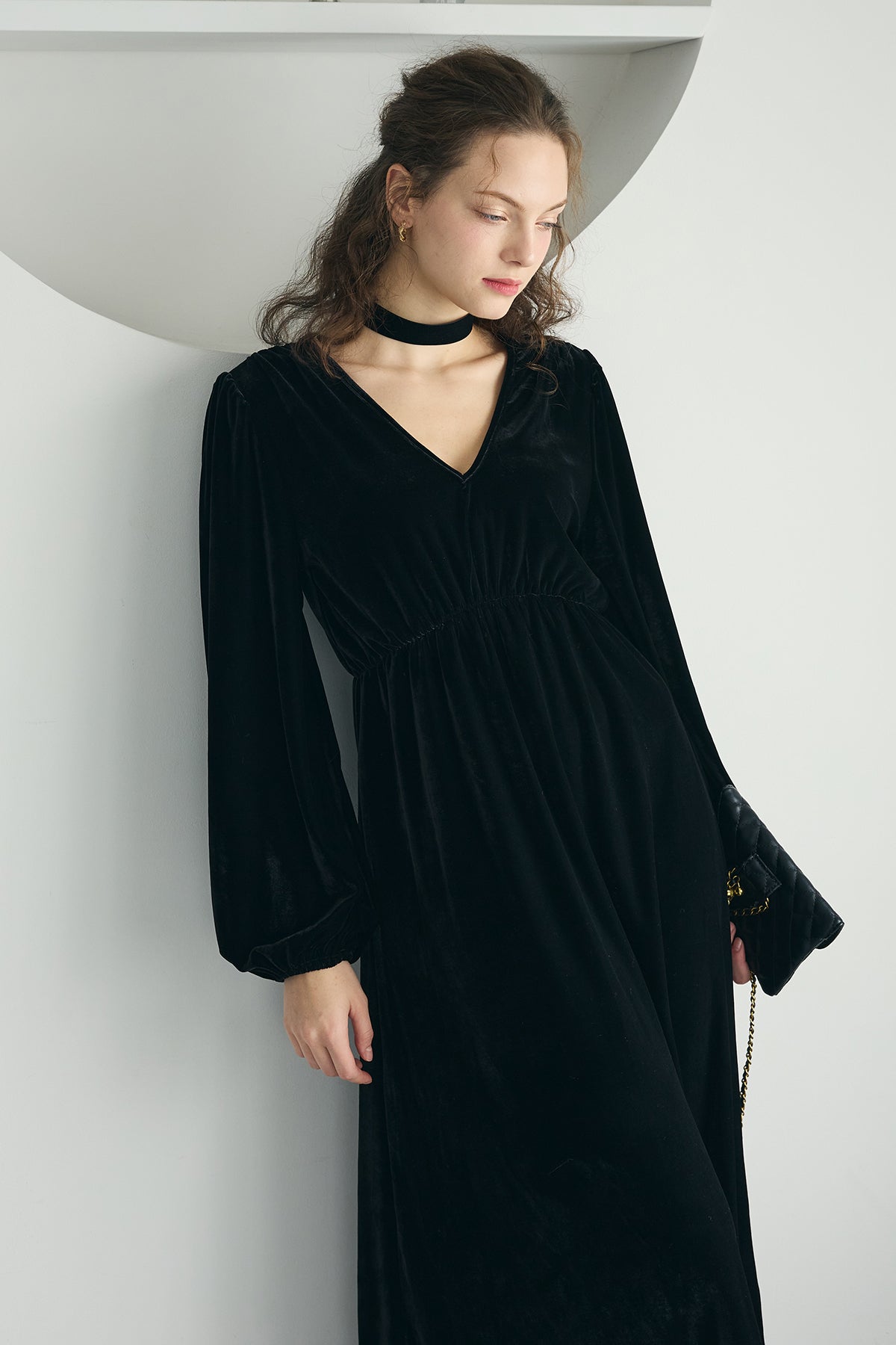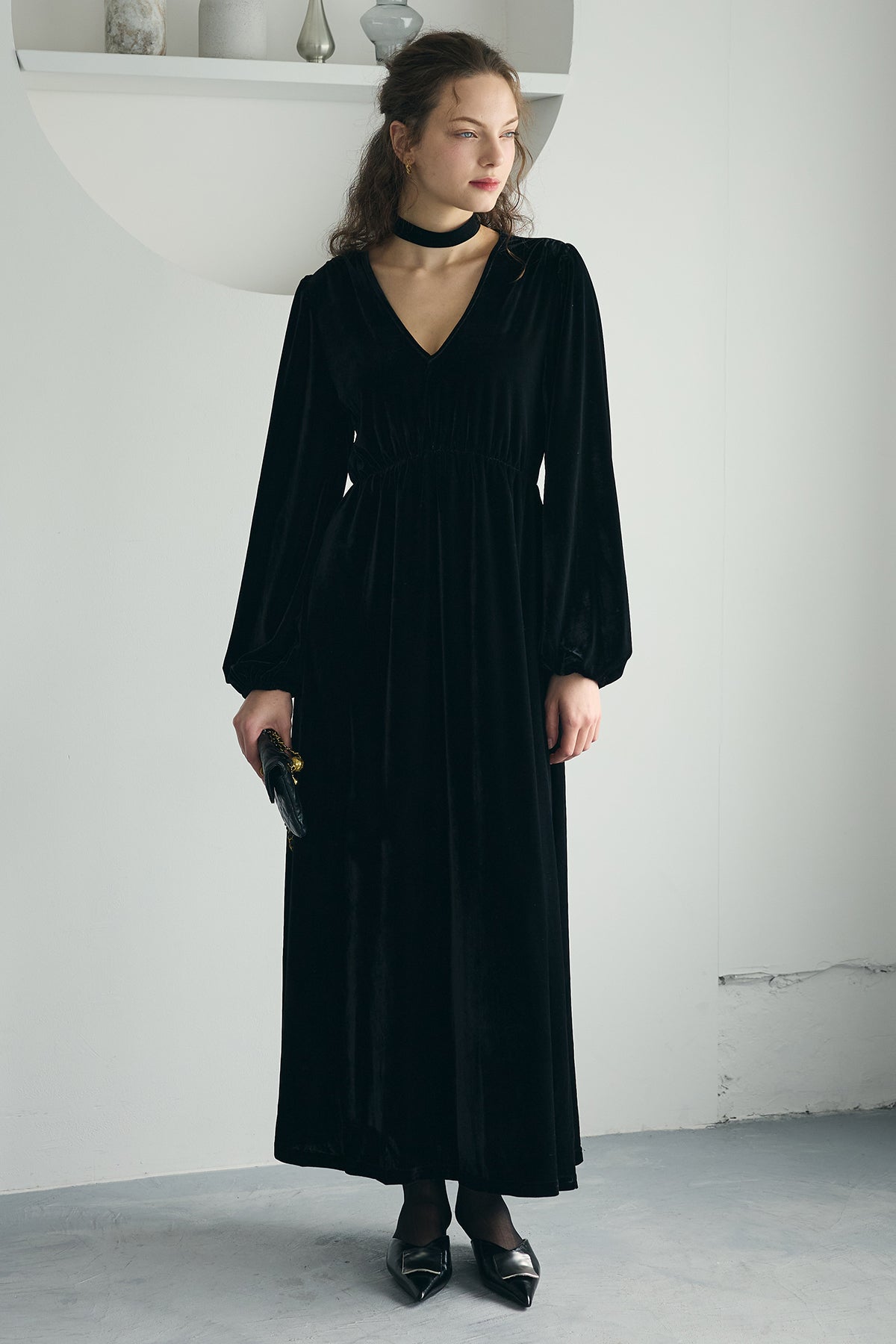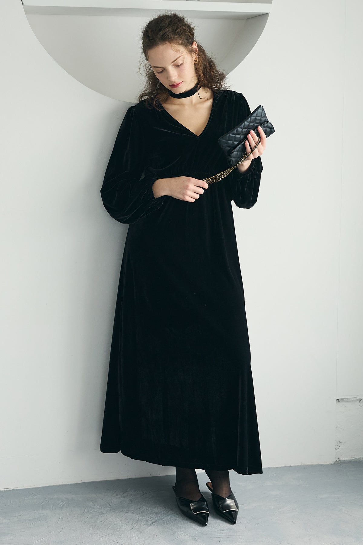 深いVネックとやわらかな光沢のベロアが上品なロングワンピース。胸下の切り替えでスタイルがすっきり見え、裾に向かってゆるく広がるシルエットが歩くたびきれい。ふんわり袖で女性らしさをプラス。パールやチョーカー、ショートブーツでお呼ばれにも、カーディガンやショートジャケットを羽織れば普段使いにもなじみます。