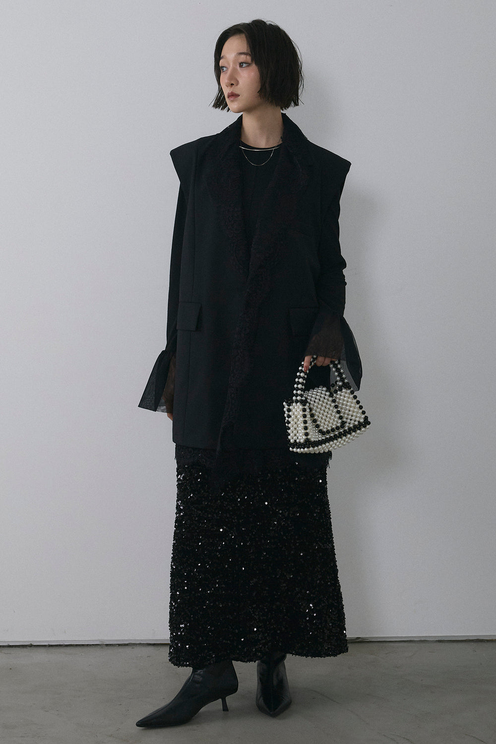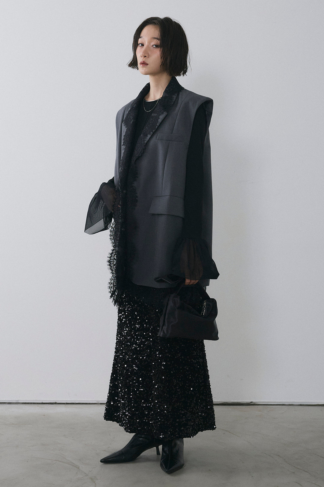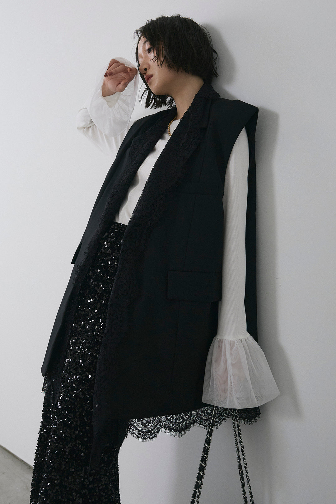 [予約/SET]チュールシアーカフスリブニット+アシメレースドッキングデザインボタンジレ+スパンコールシャイニースカート(3set)