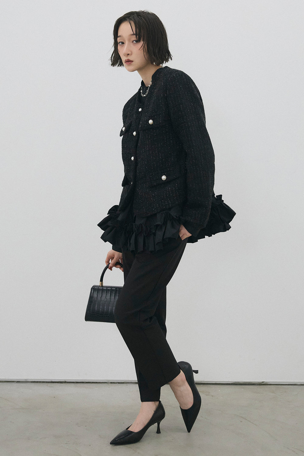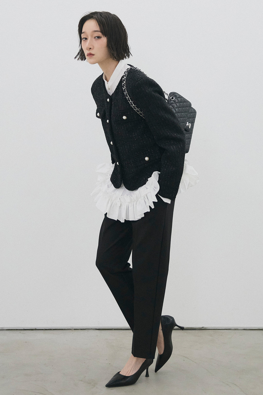 [予約/SET]フリルヘムノーカラーブラウス+パールボタンクラシカルツイードジャケット+タックテーパードパンツ(3set)