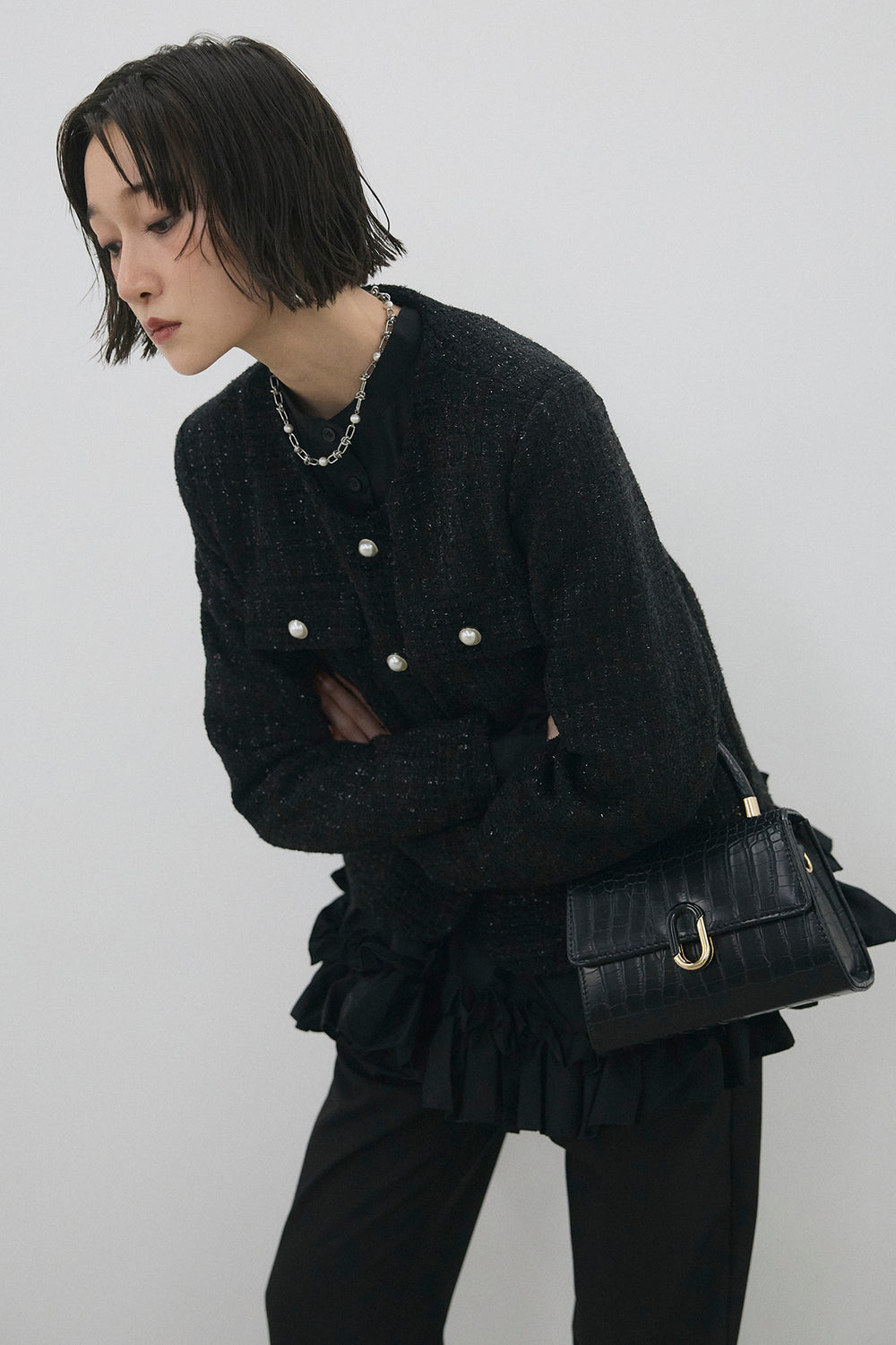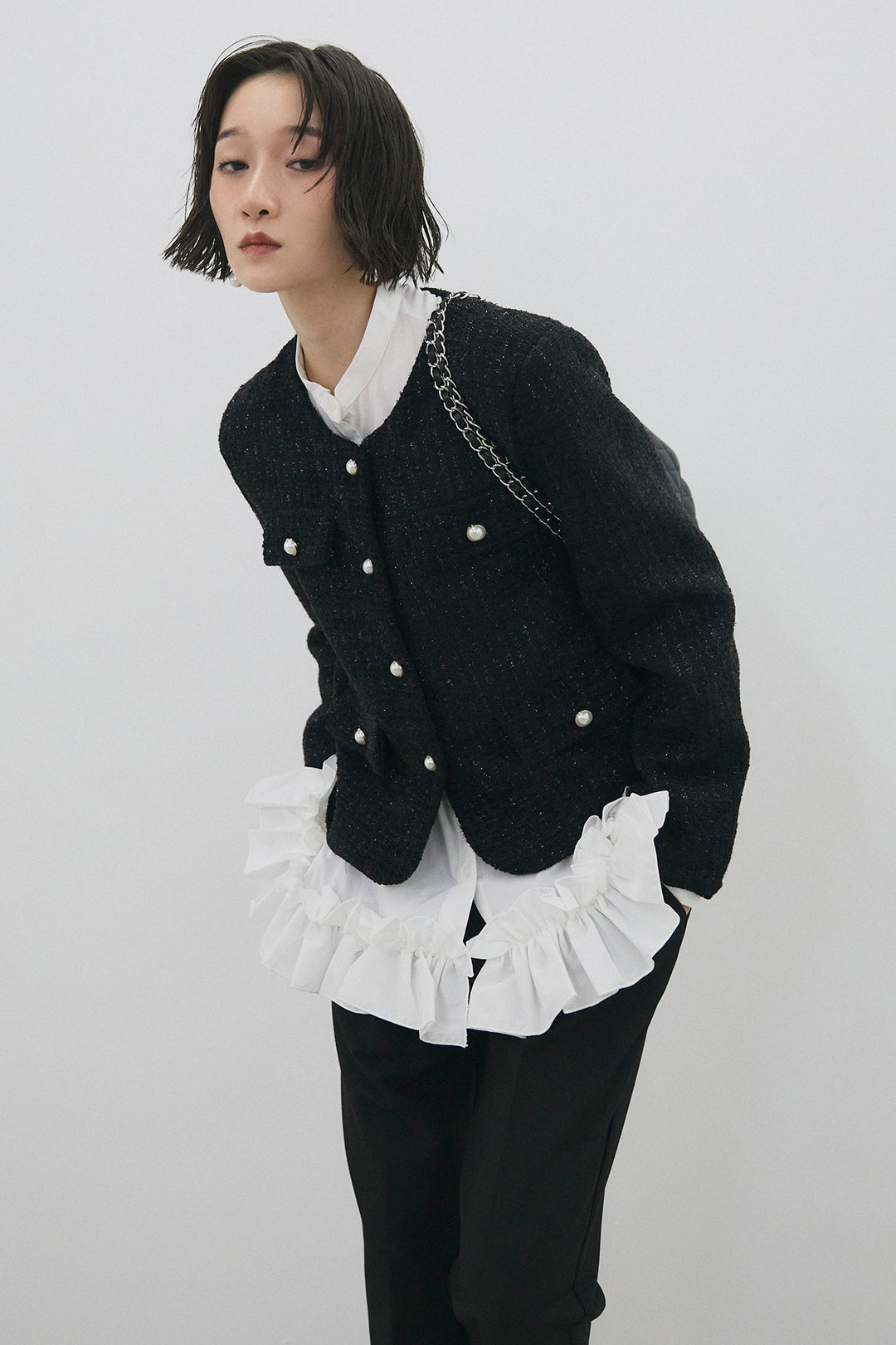 [予約/SET]フリルヘムノーカラーブラウス+パールボタンクラシカルツイードジャケット(2set)