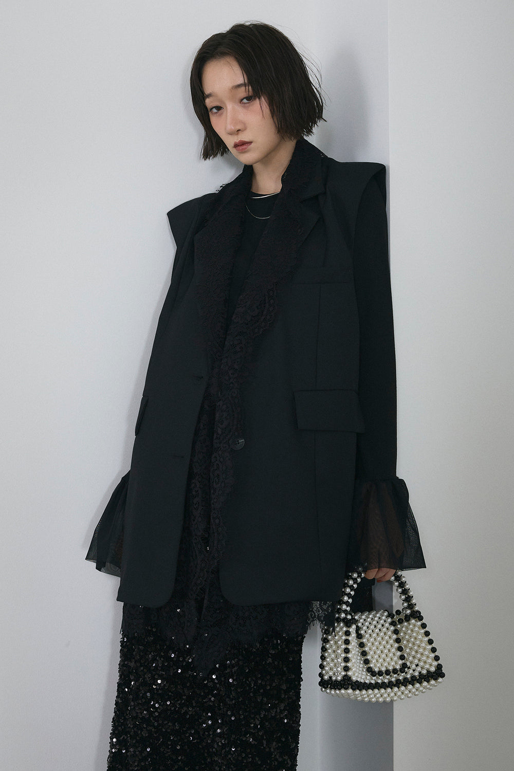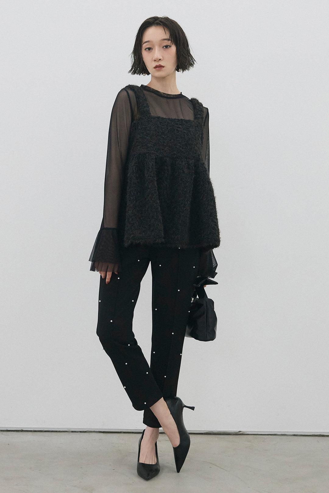 [予約/SET]シアーメッシュフレアスリーブトップス+ブークレシャギーペプラムビスチェ+センターシームランダムパールパンツ(3set)
