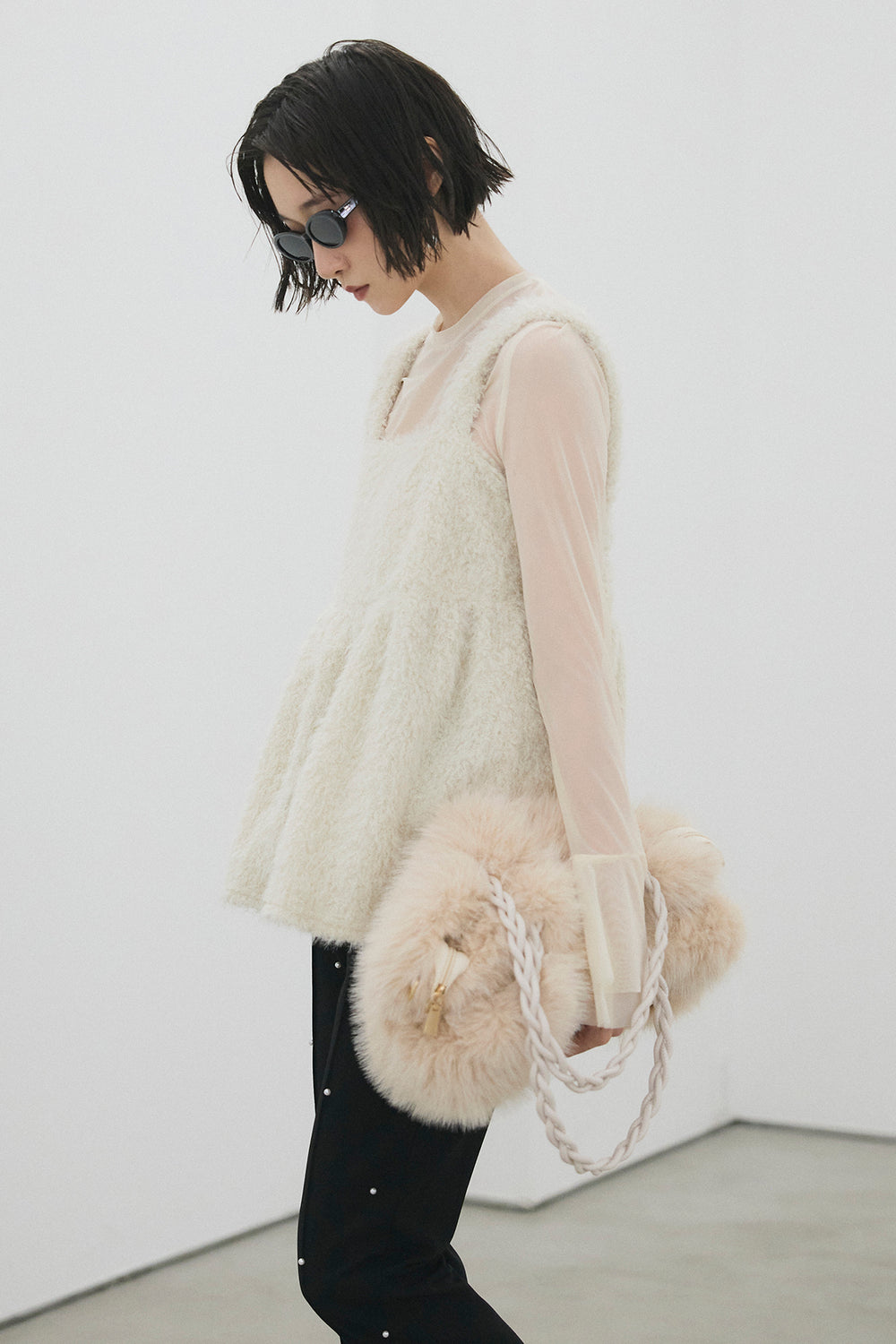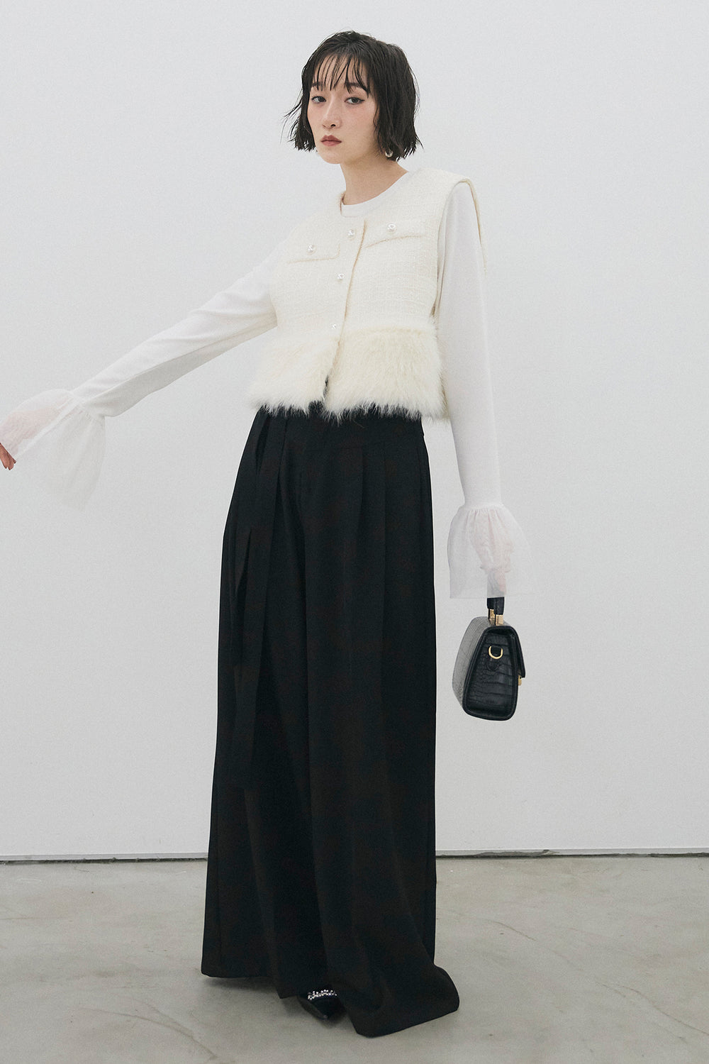 [予約/SET]チュールシアーカフスリブニット+ファー×ツイードショートベスト+とろみタックハイウエストタックワイドパンツ(3set)