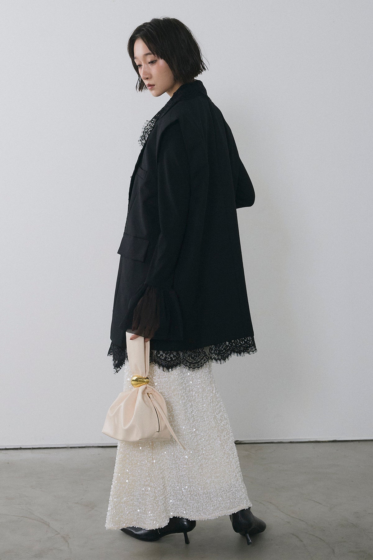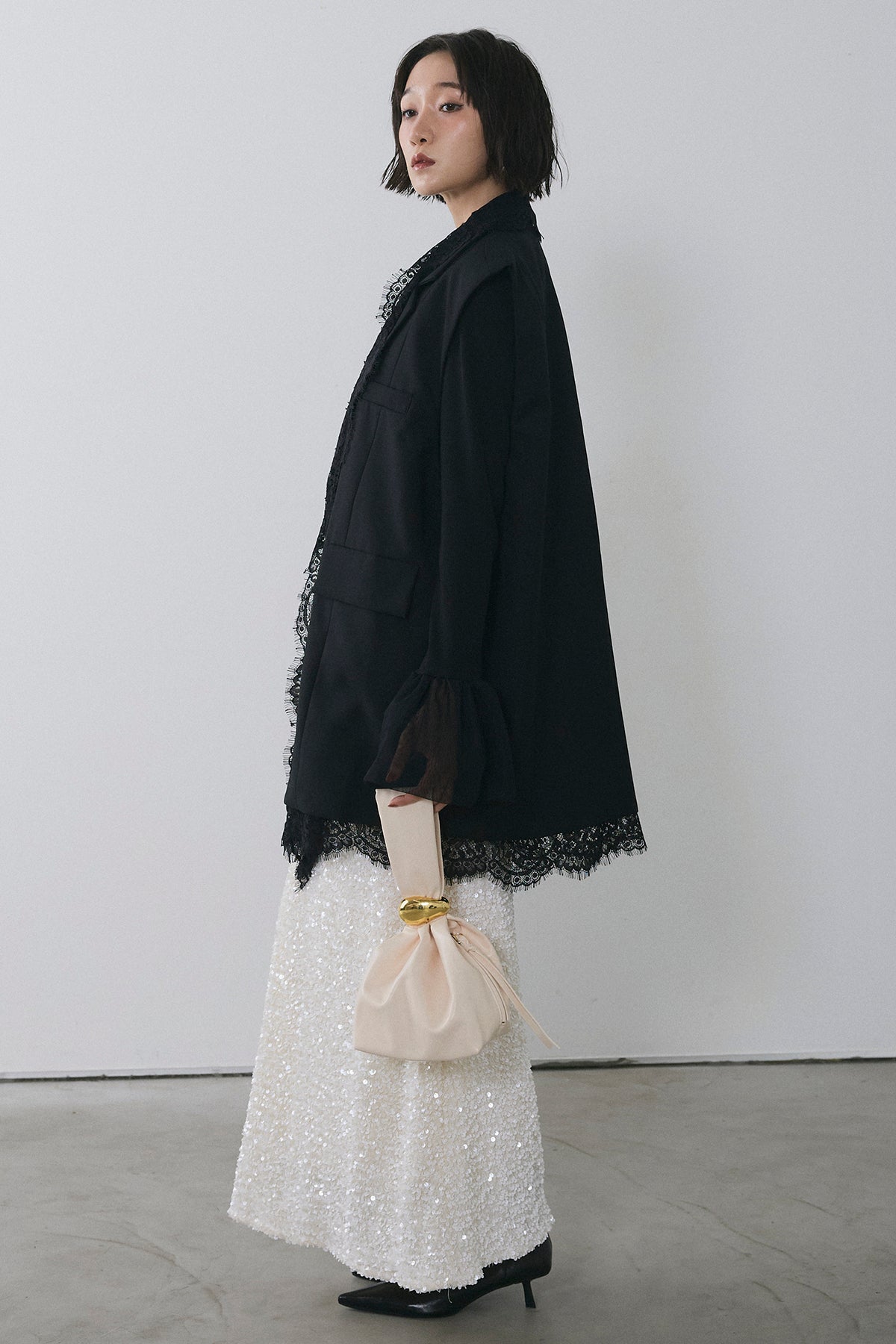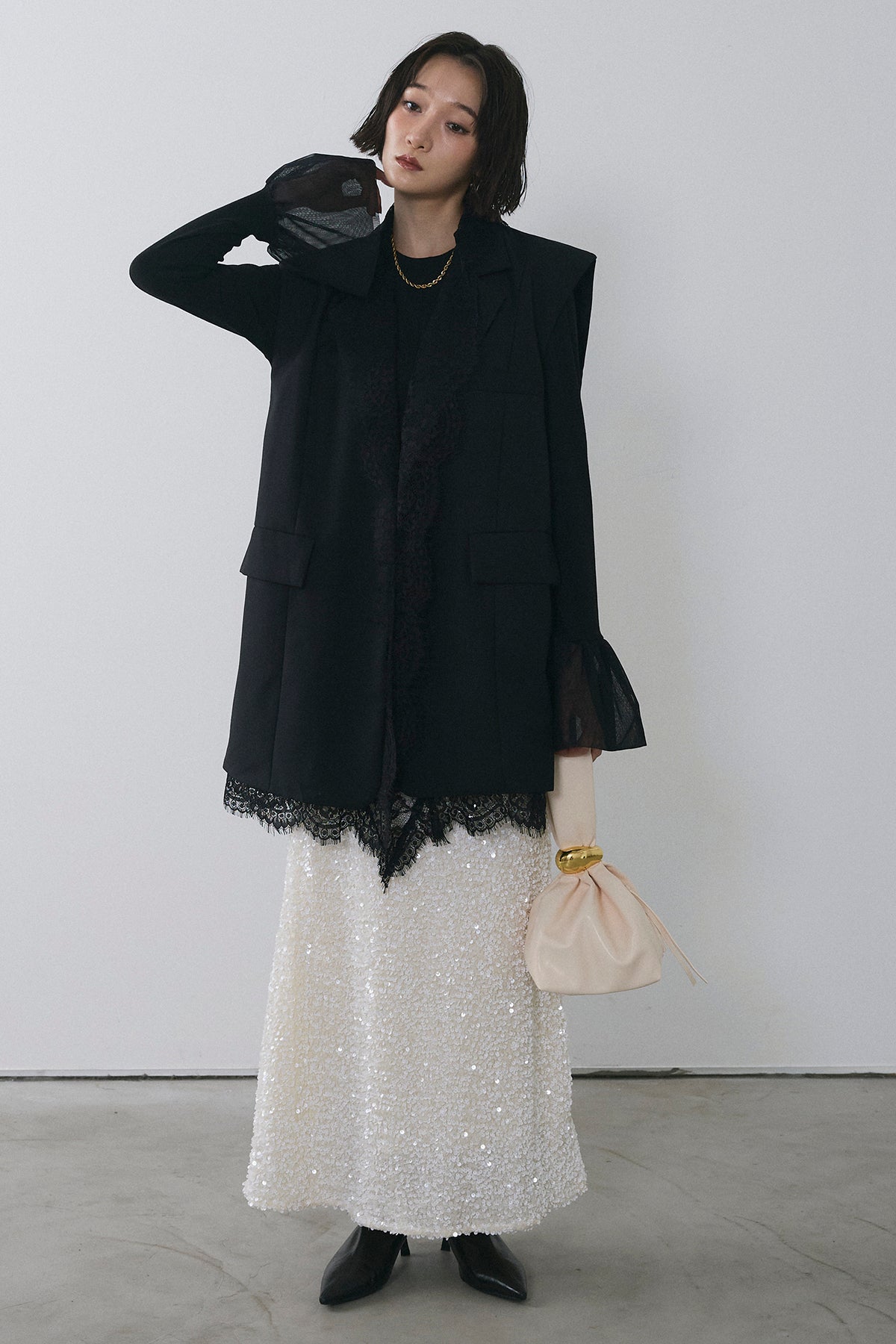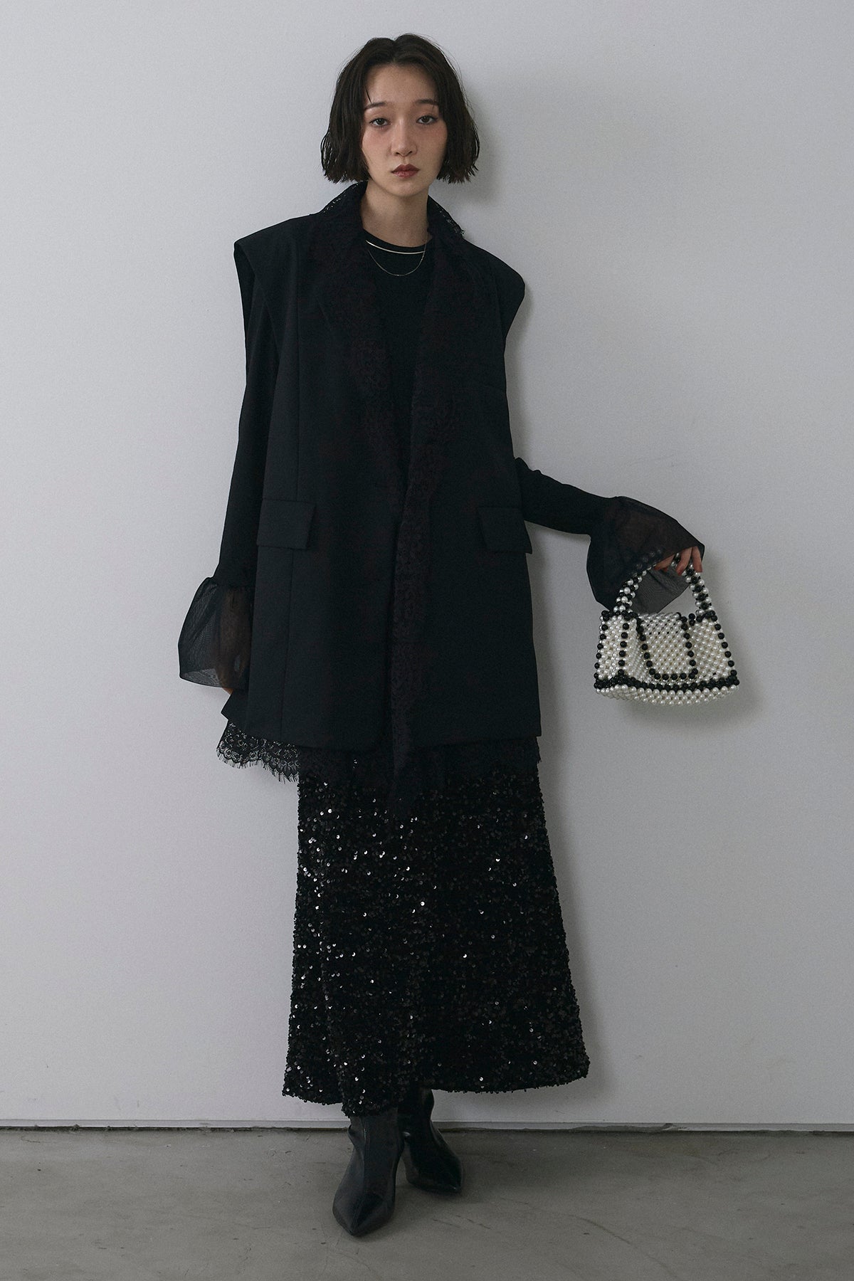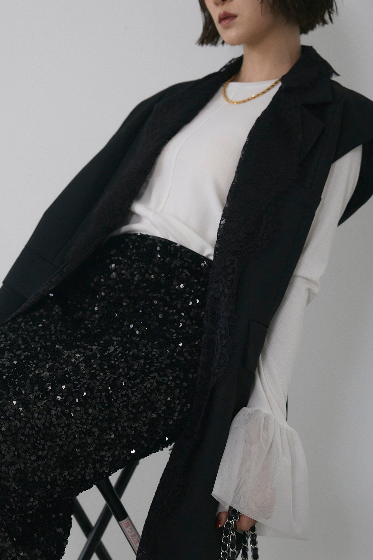 [予約/SET]アシメレースドッキングデザインボタンジレ+スパンコールシャイニースカート(2set)