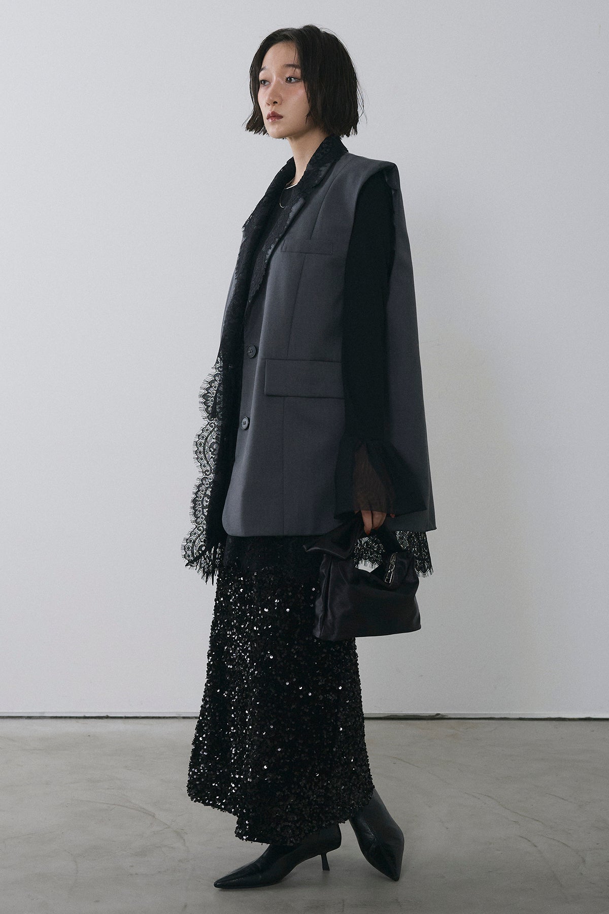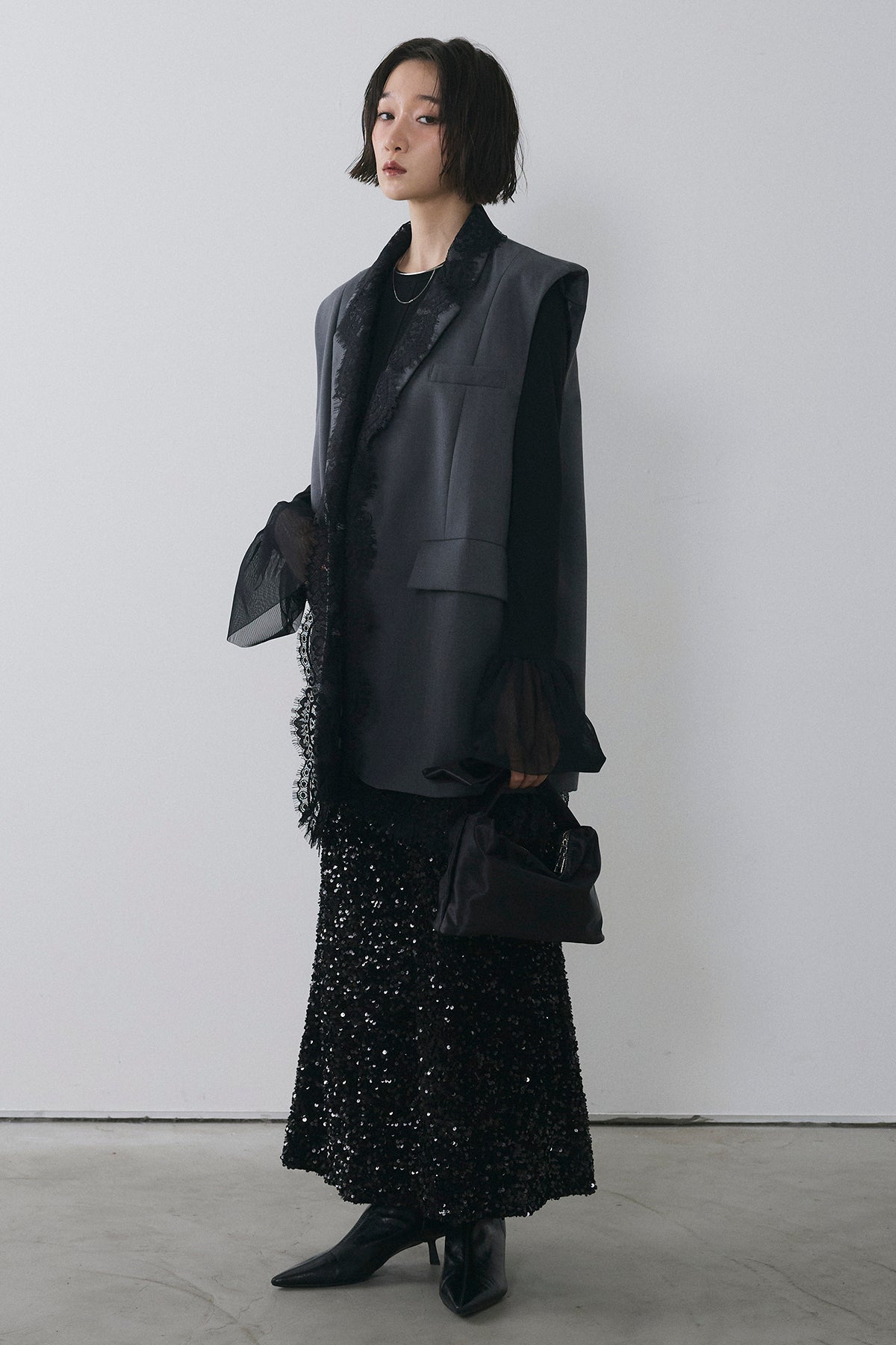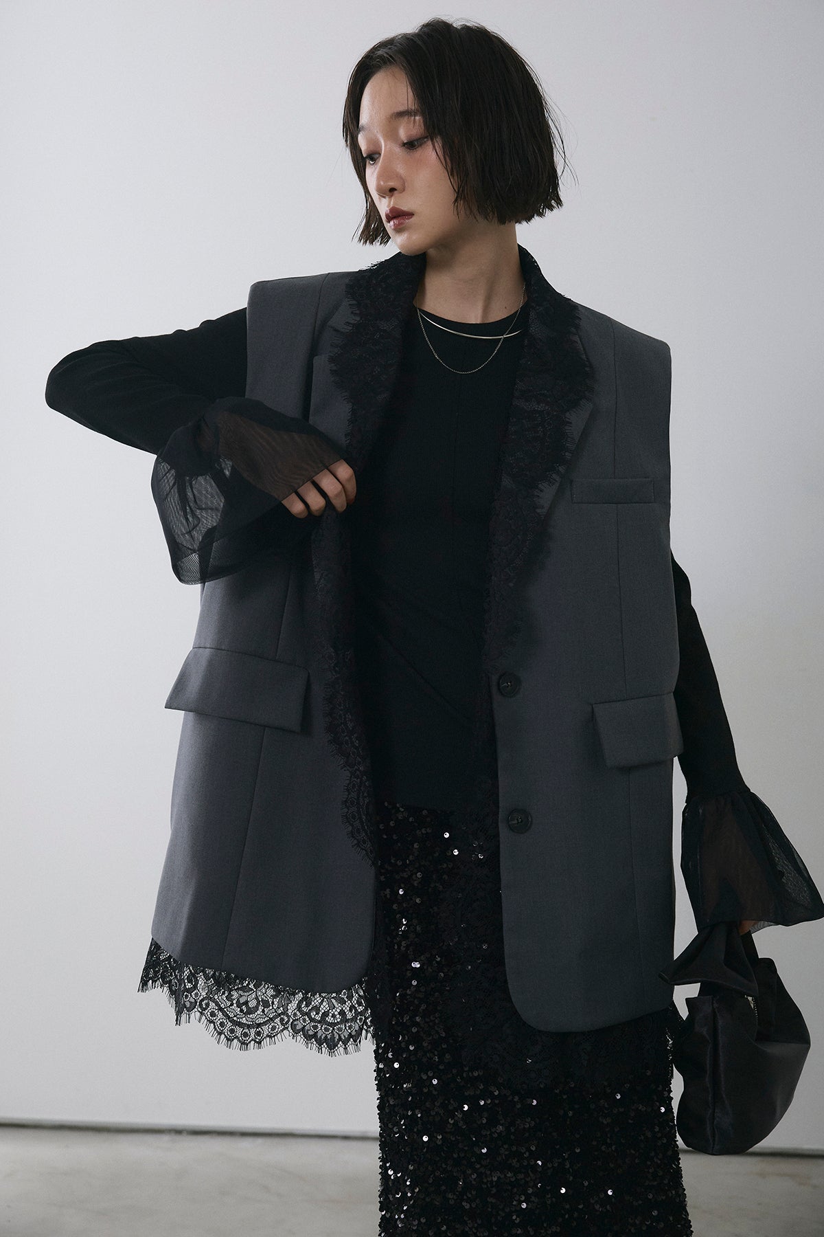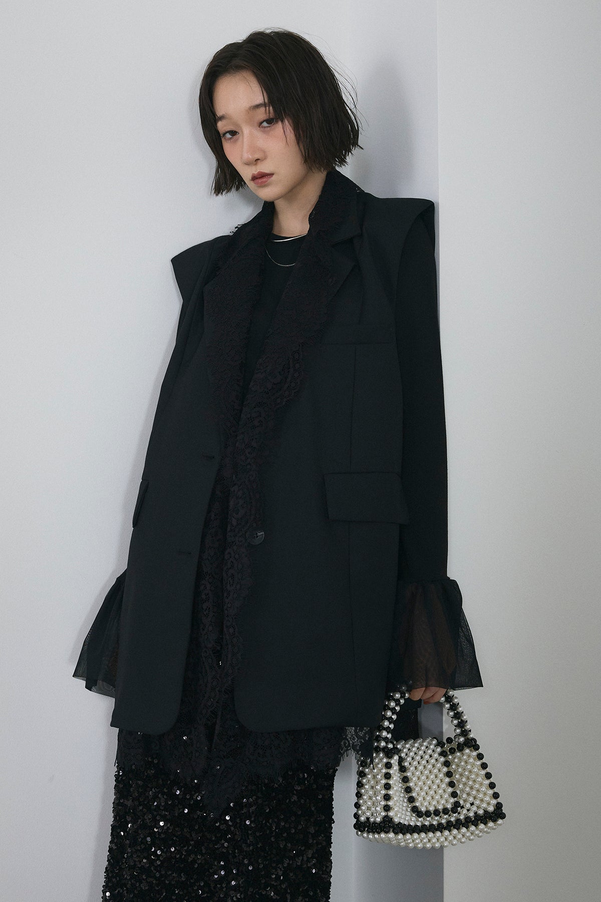 [予約/SET]アシメレースドッキングデザインボタンジレ+スパンコールシャイニースカート(2set)