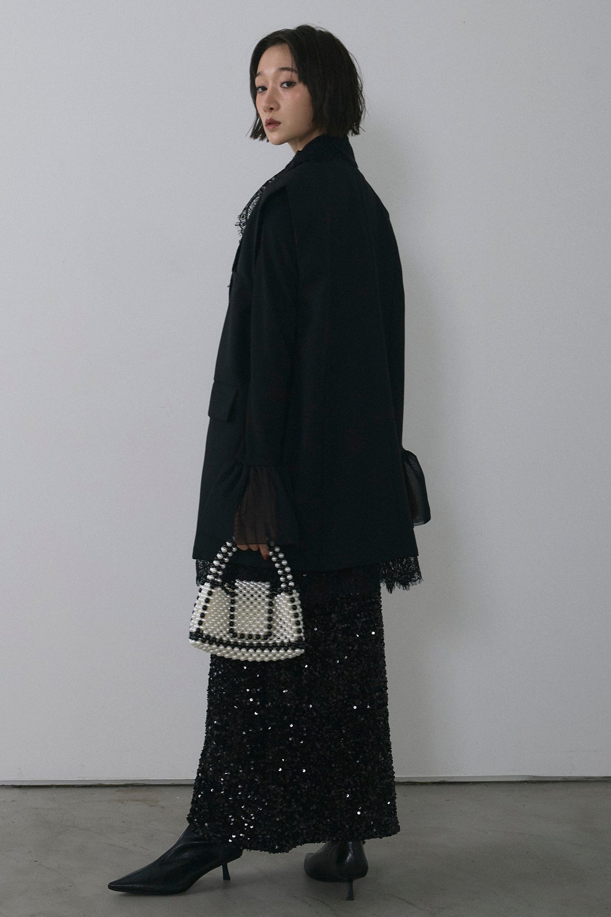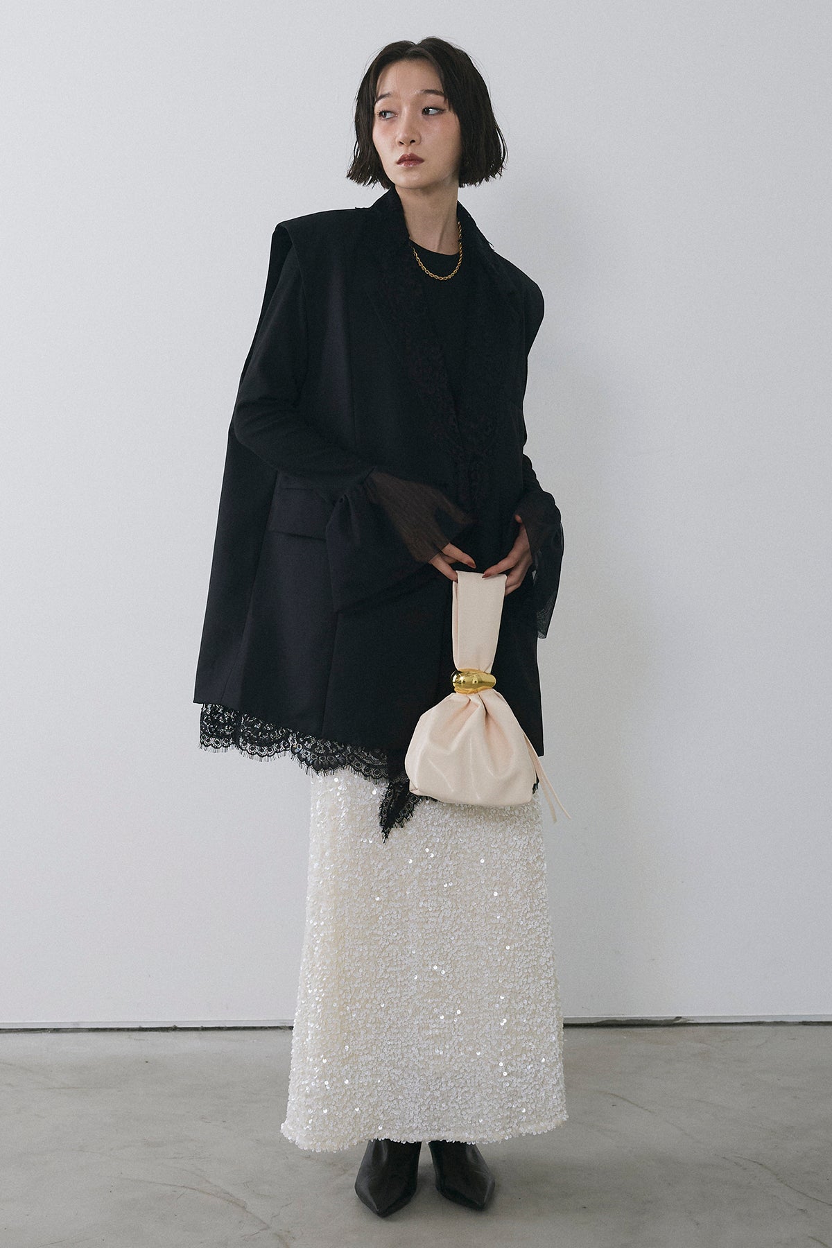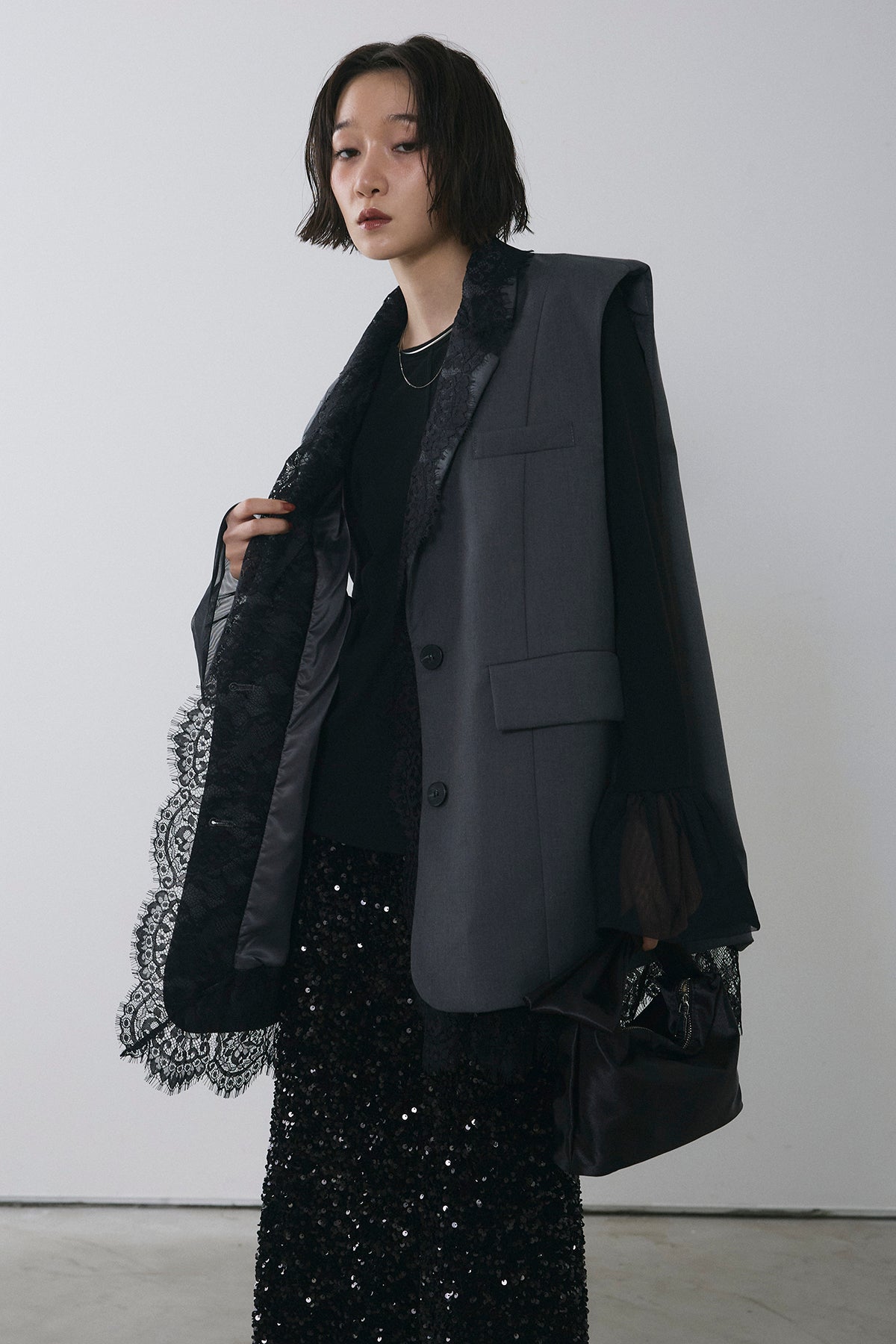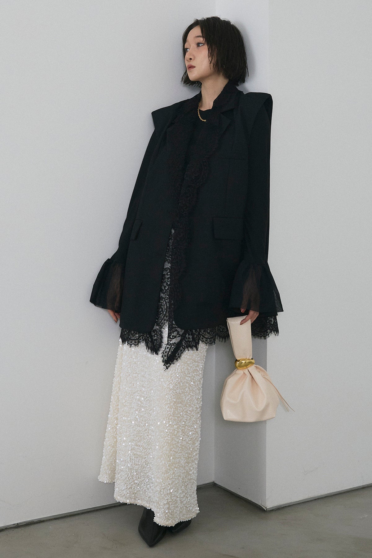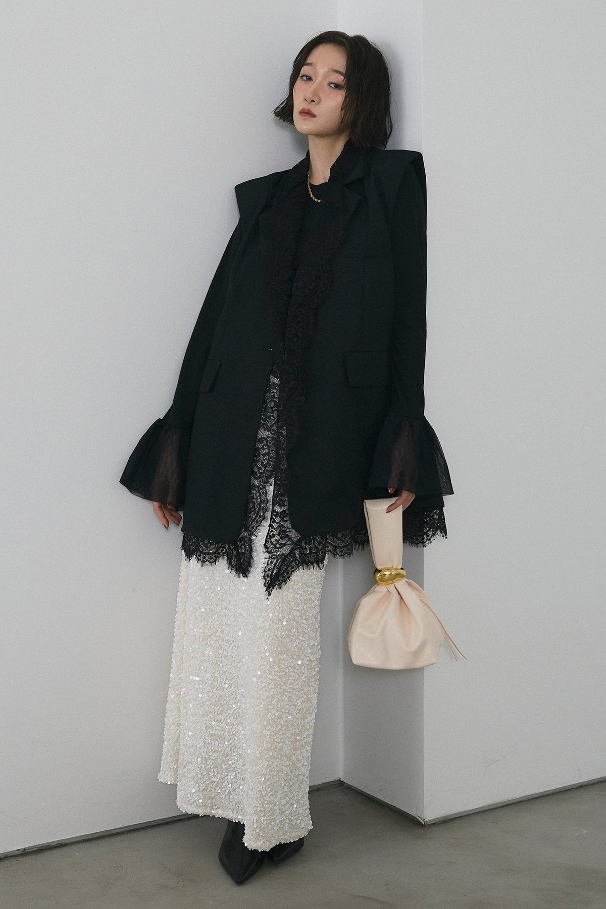 [予約/SET]アシメレースドッキングデザインボタンジレ+スパンコールシャイニースカート(2set)