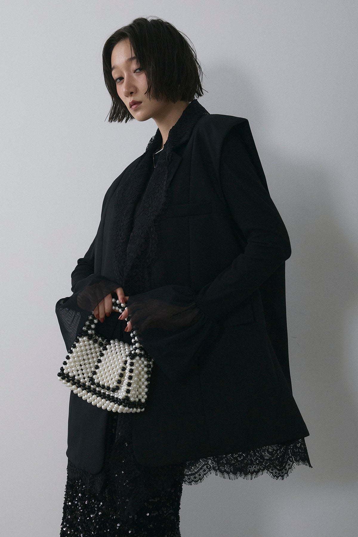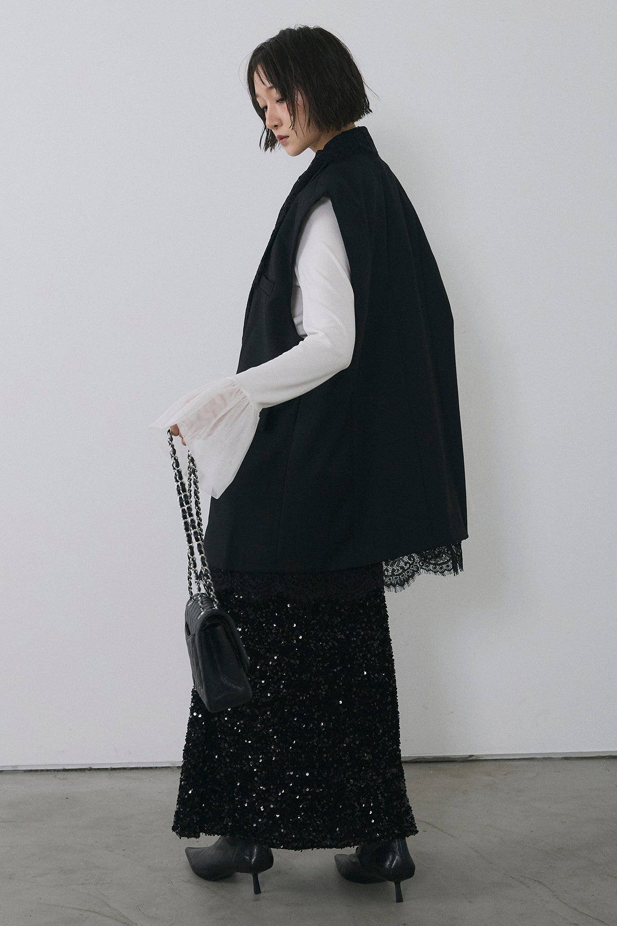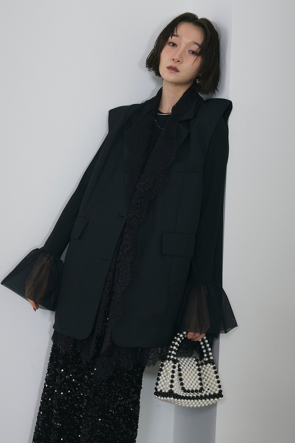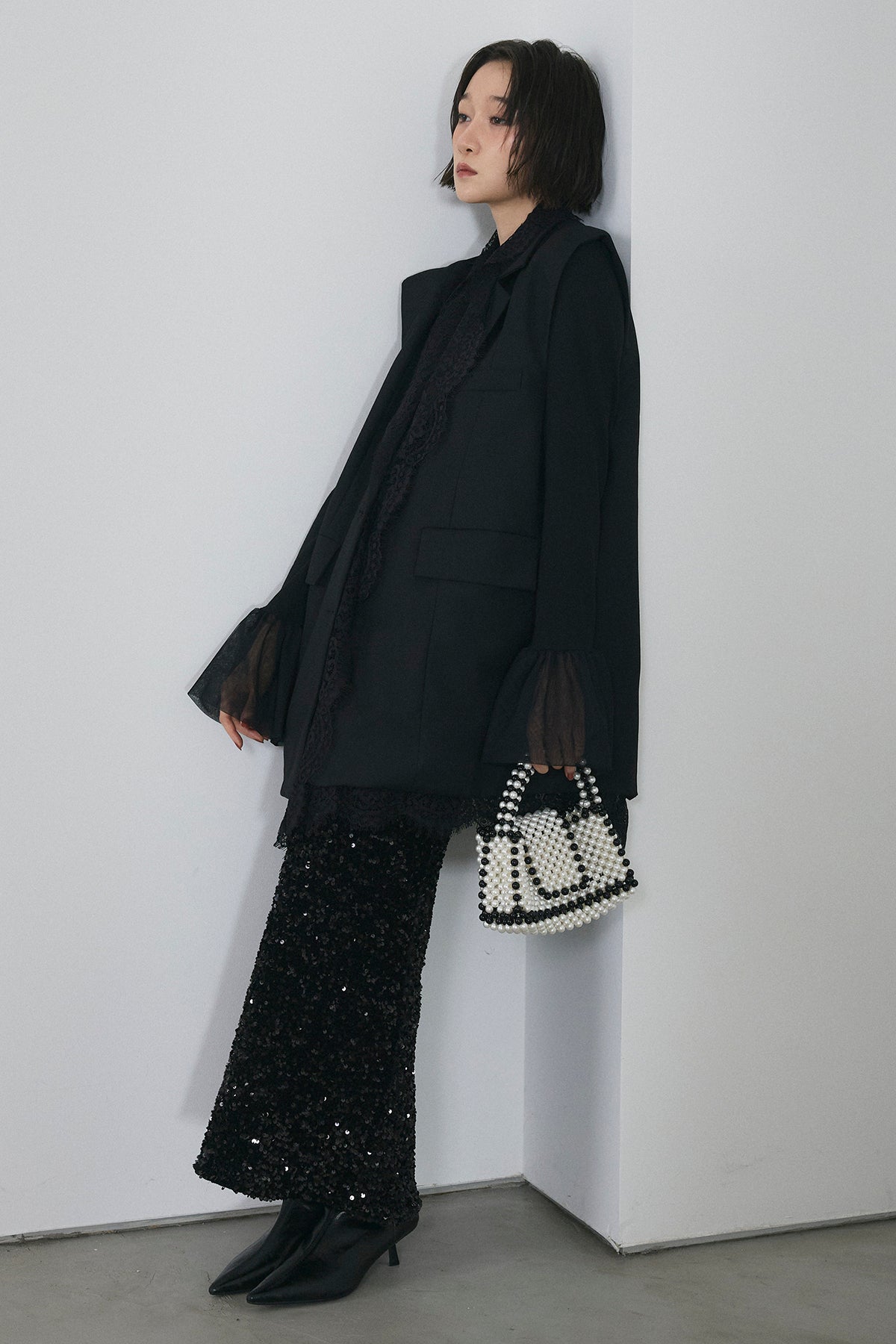 [予約/SET]アシメレースドッキングデザインボタンジレ+スパンコールシャイニースカート(2set)