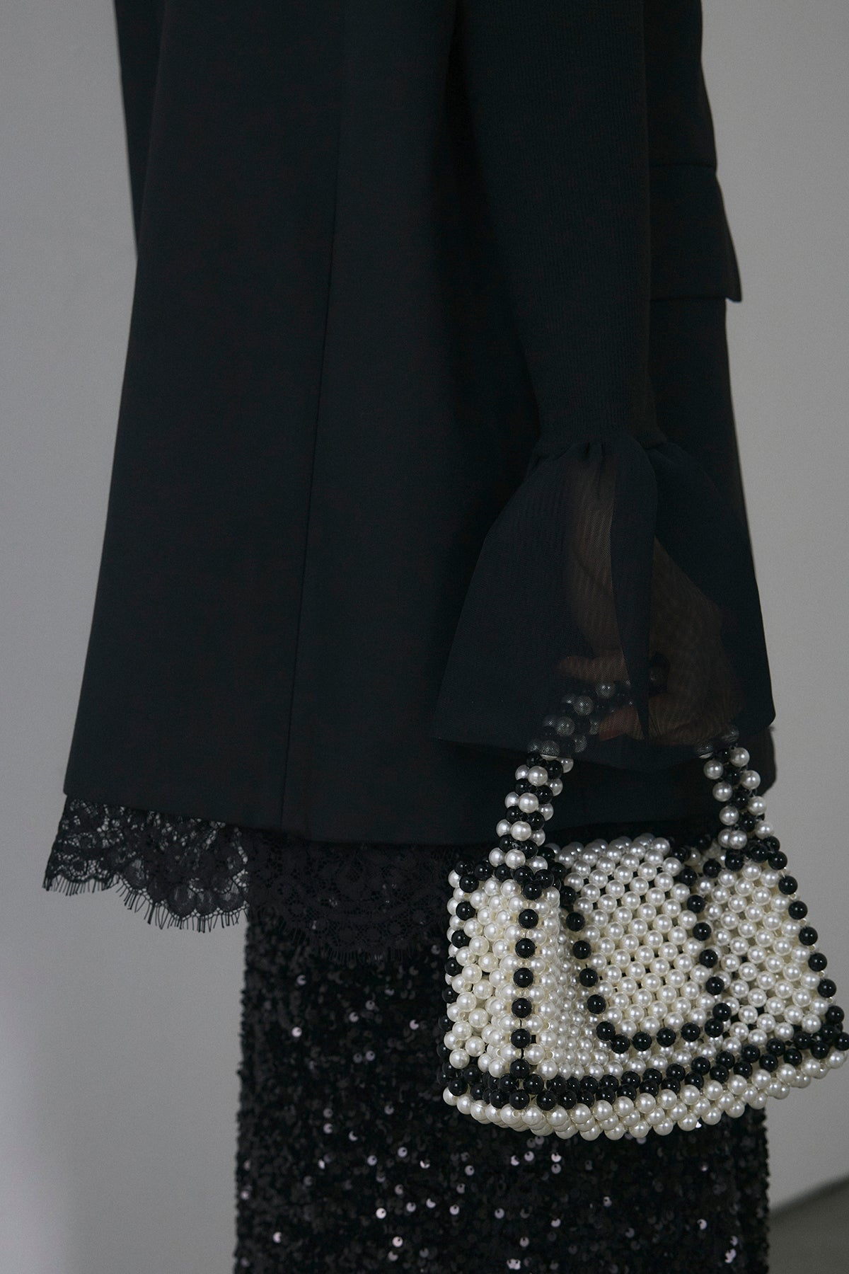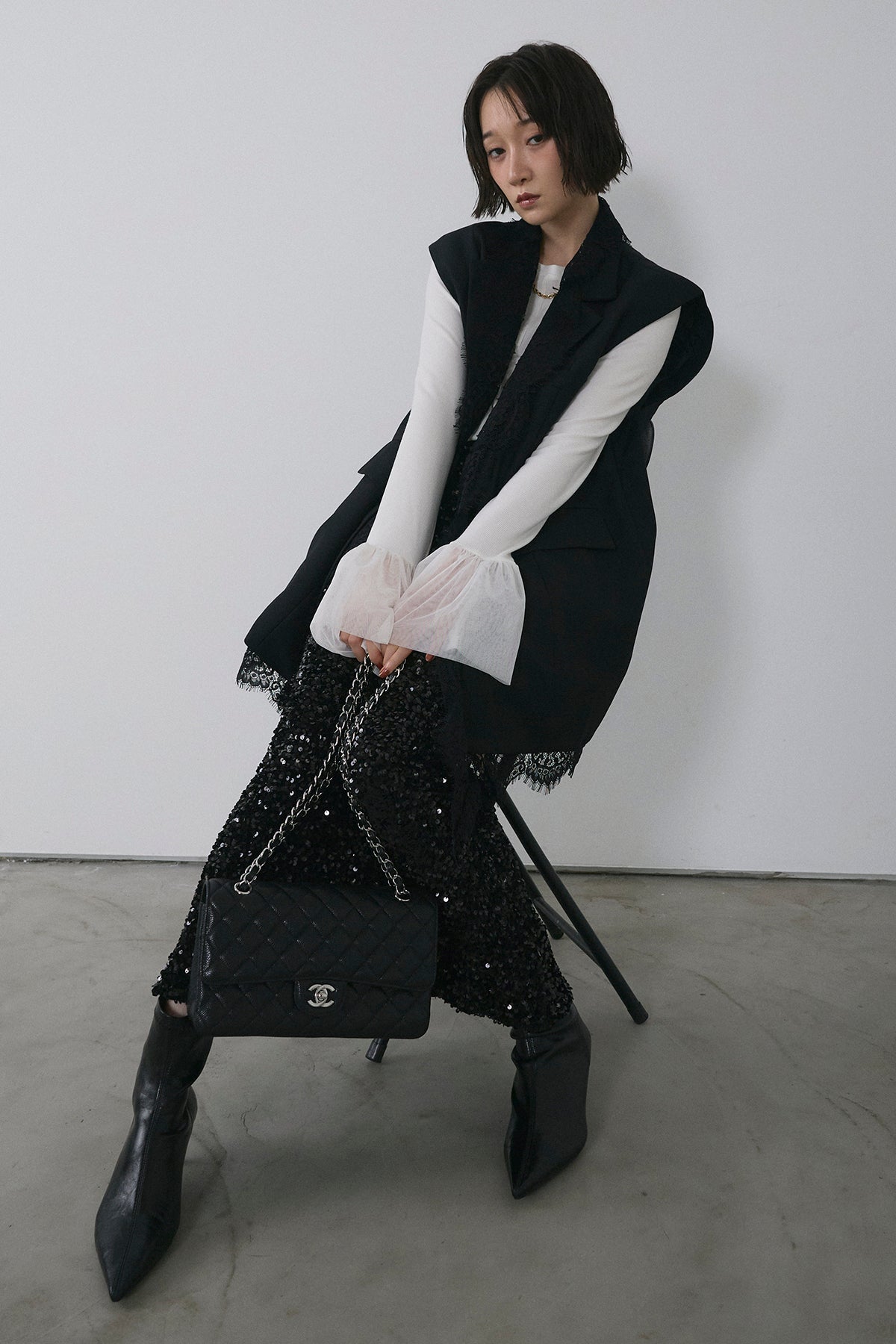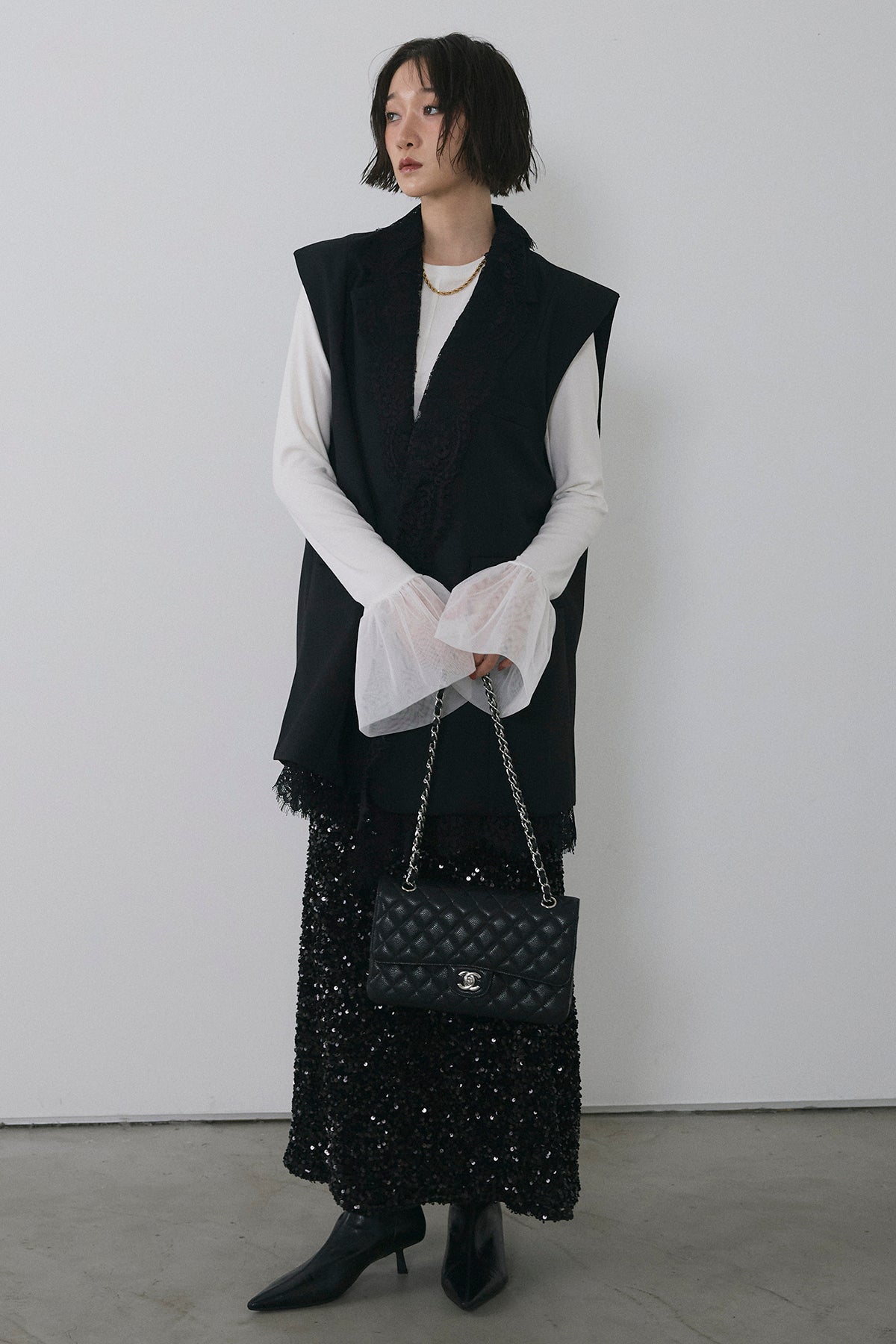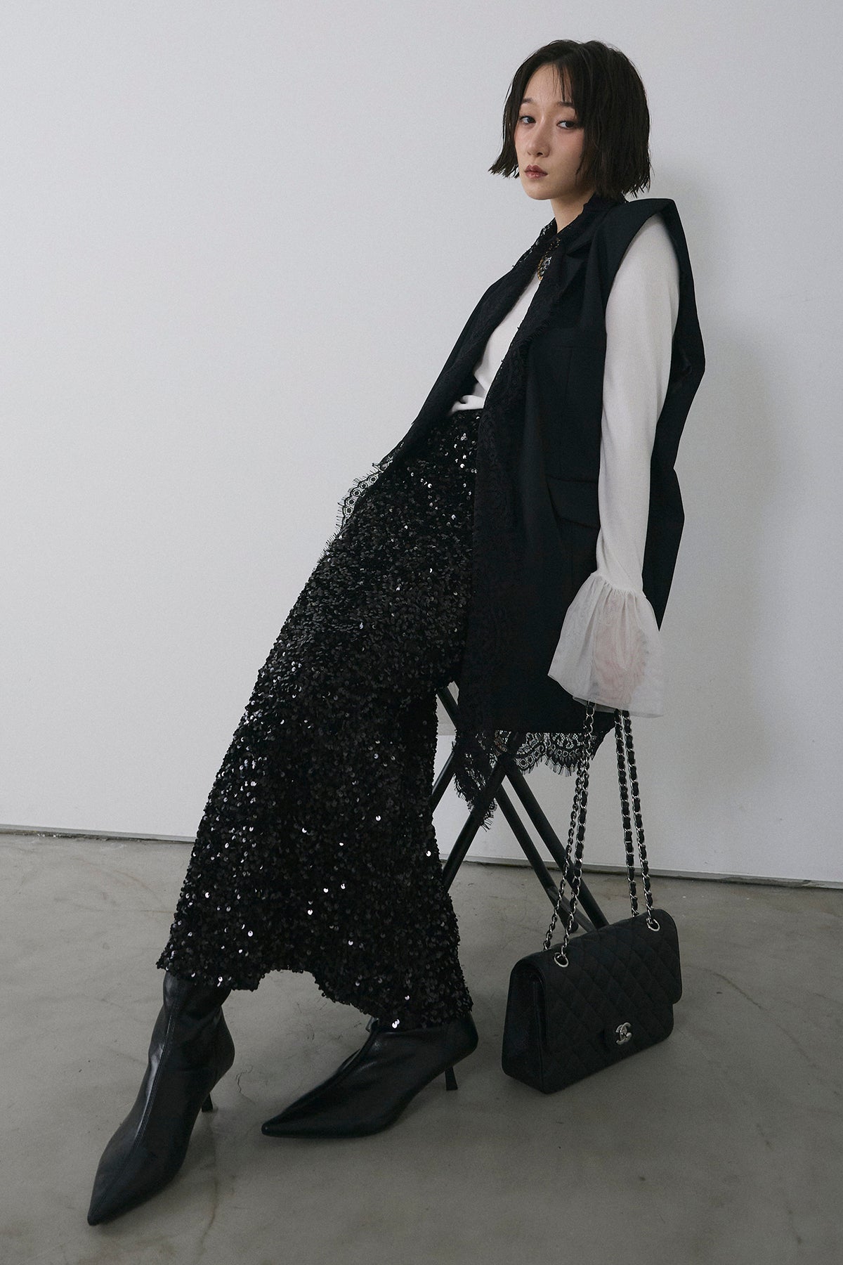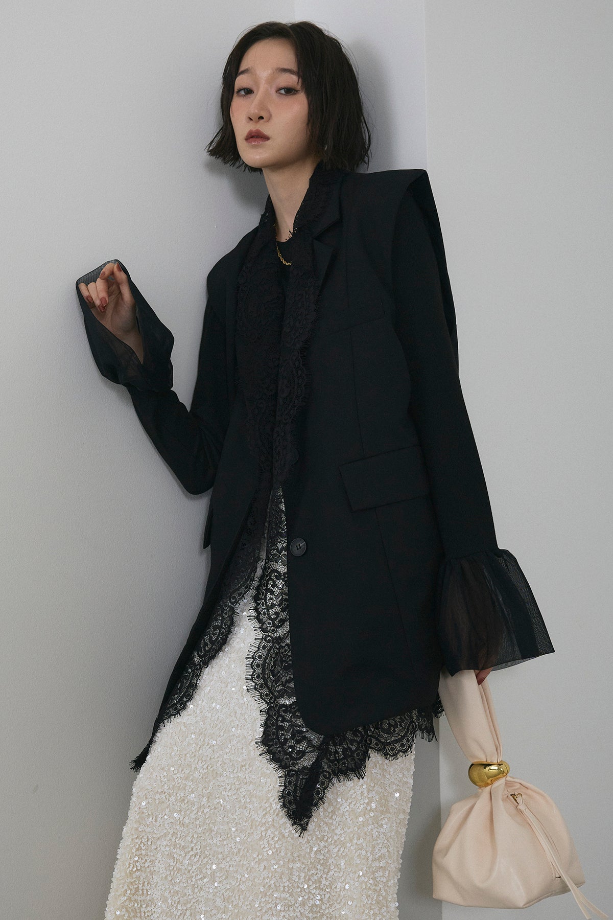 [予約/SET]アシメレースドッキングデザインボタンジレ+スパンコールシャイニースカート(2set)
