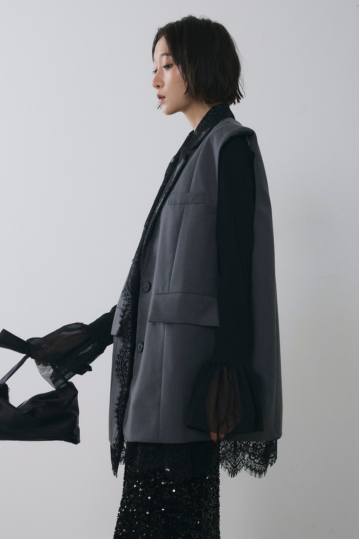 [予約]アシメレースドッキングデザインボタンジレ