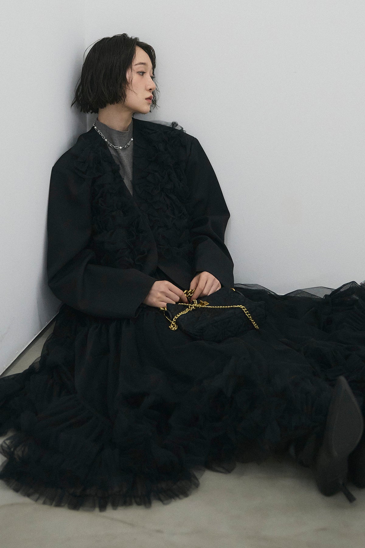 [予約/SET]ハーフスリーブハイネックニット+ホイップチュールショート丈ジャケット+スウィートチュールフリルスカート(3set)