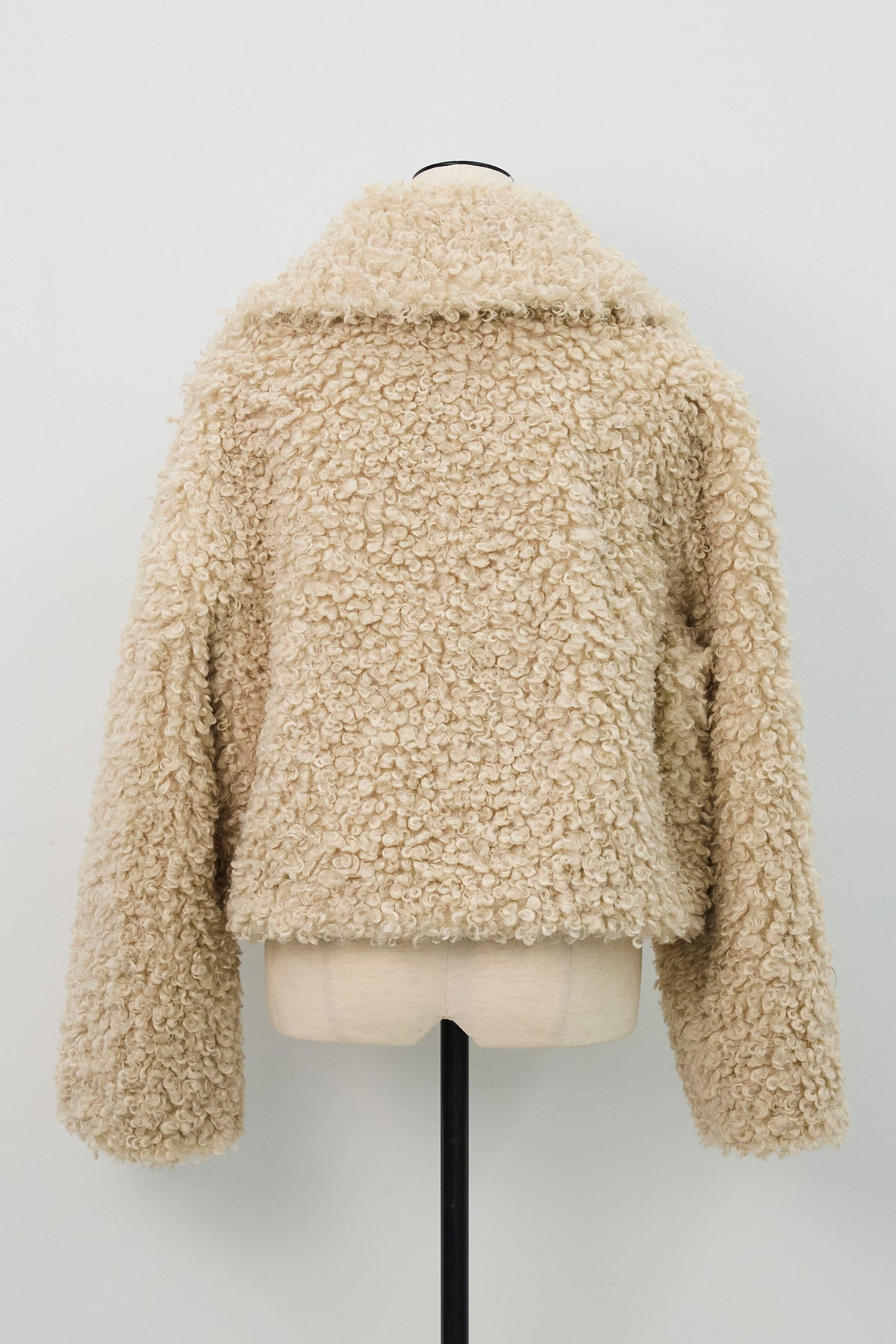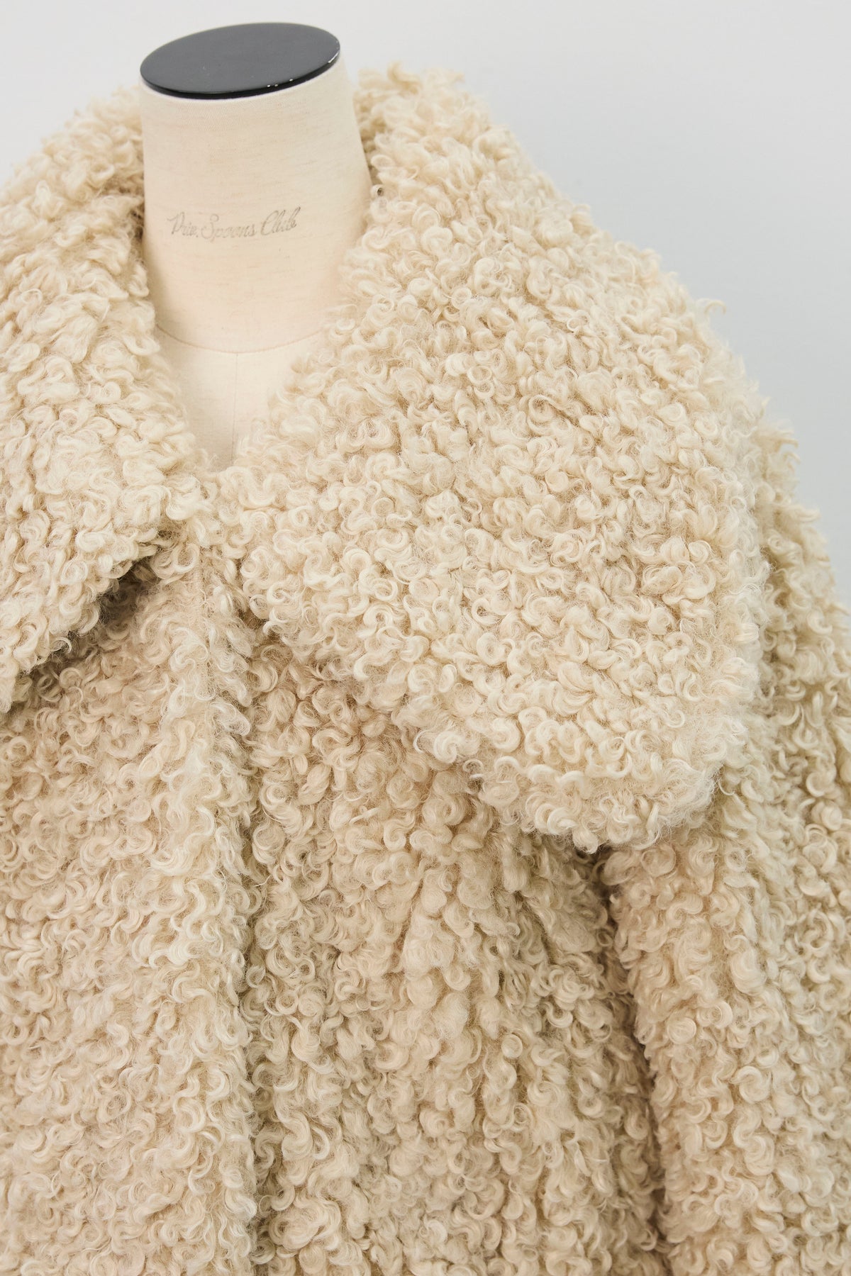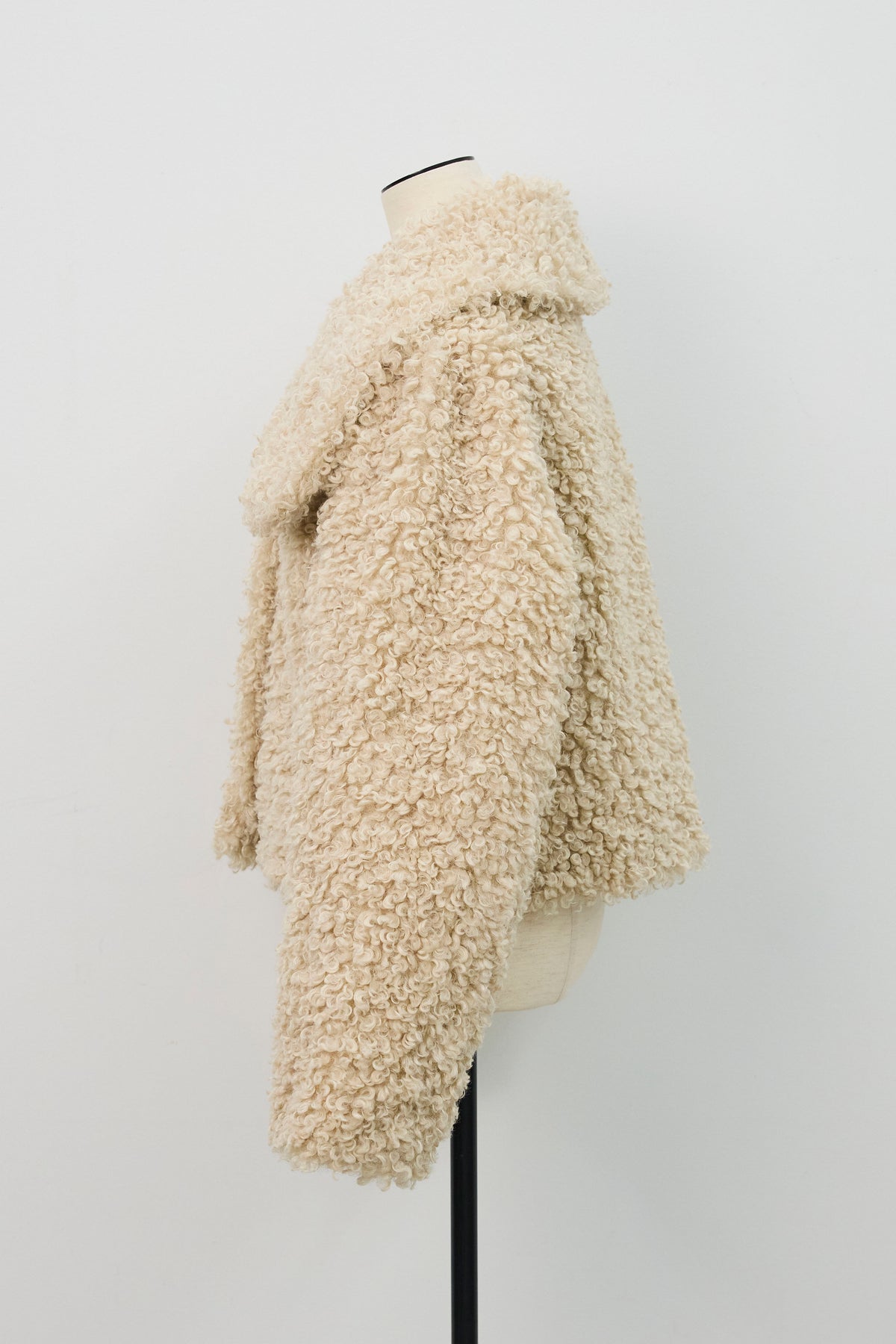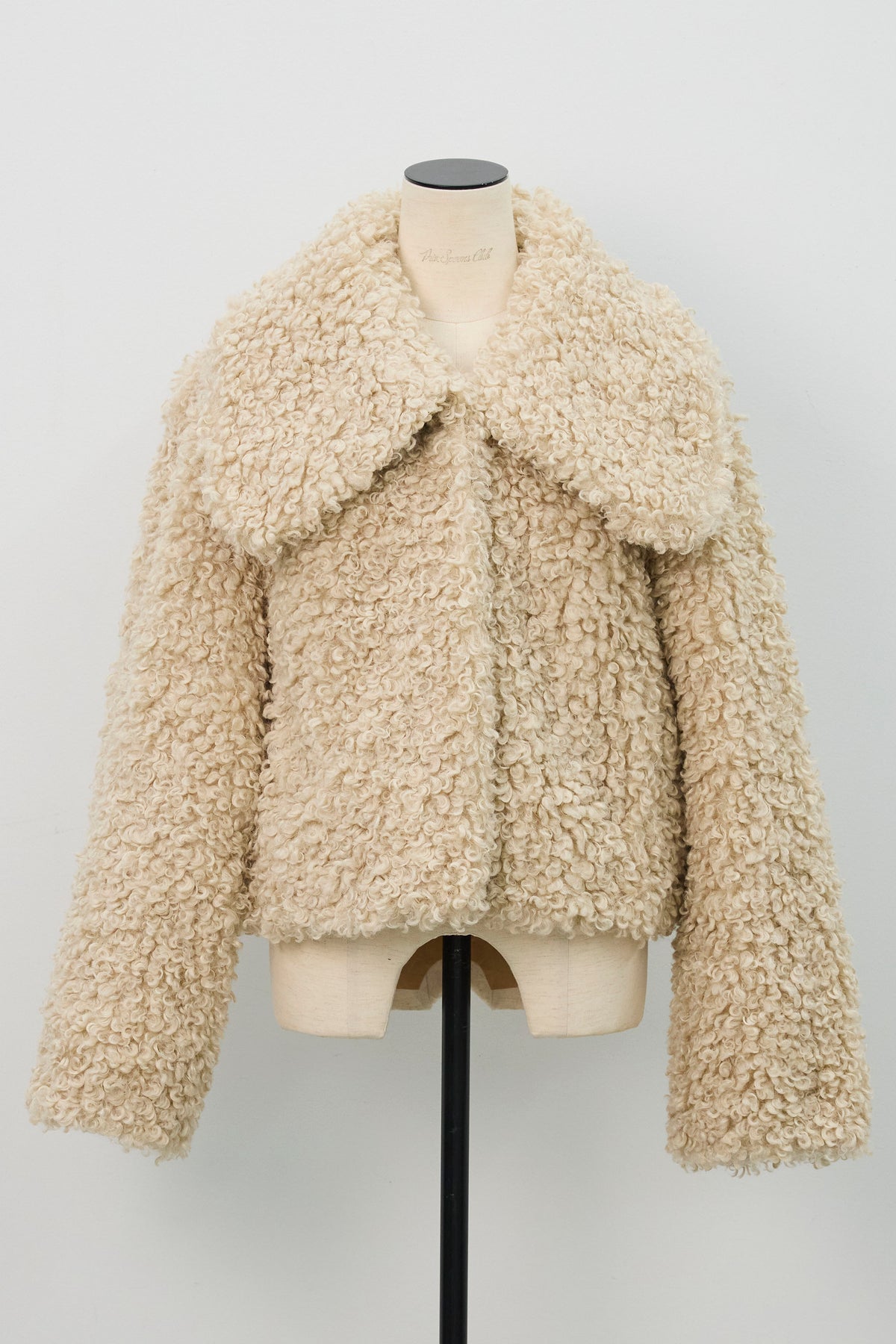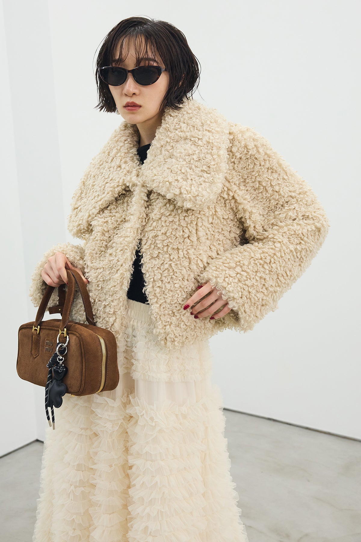 もこもことした質感が愛らしいプードル調ショートコート。 大きめのカラーが顔まわりに華やかさを添え、羽織るだけで旬なムードに。 ふんわり軽く、見た目以上にあたたかな着心地も魅力です。 甘さのある素材ながら、ショート丈でバランスよく、ボリュームスカートやワイドパンツとも好相性。 主役級の存在感で、冬のスタイリングをぐっと印象的に仕上げます。