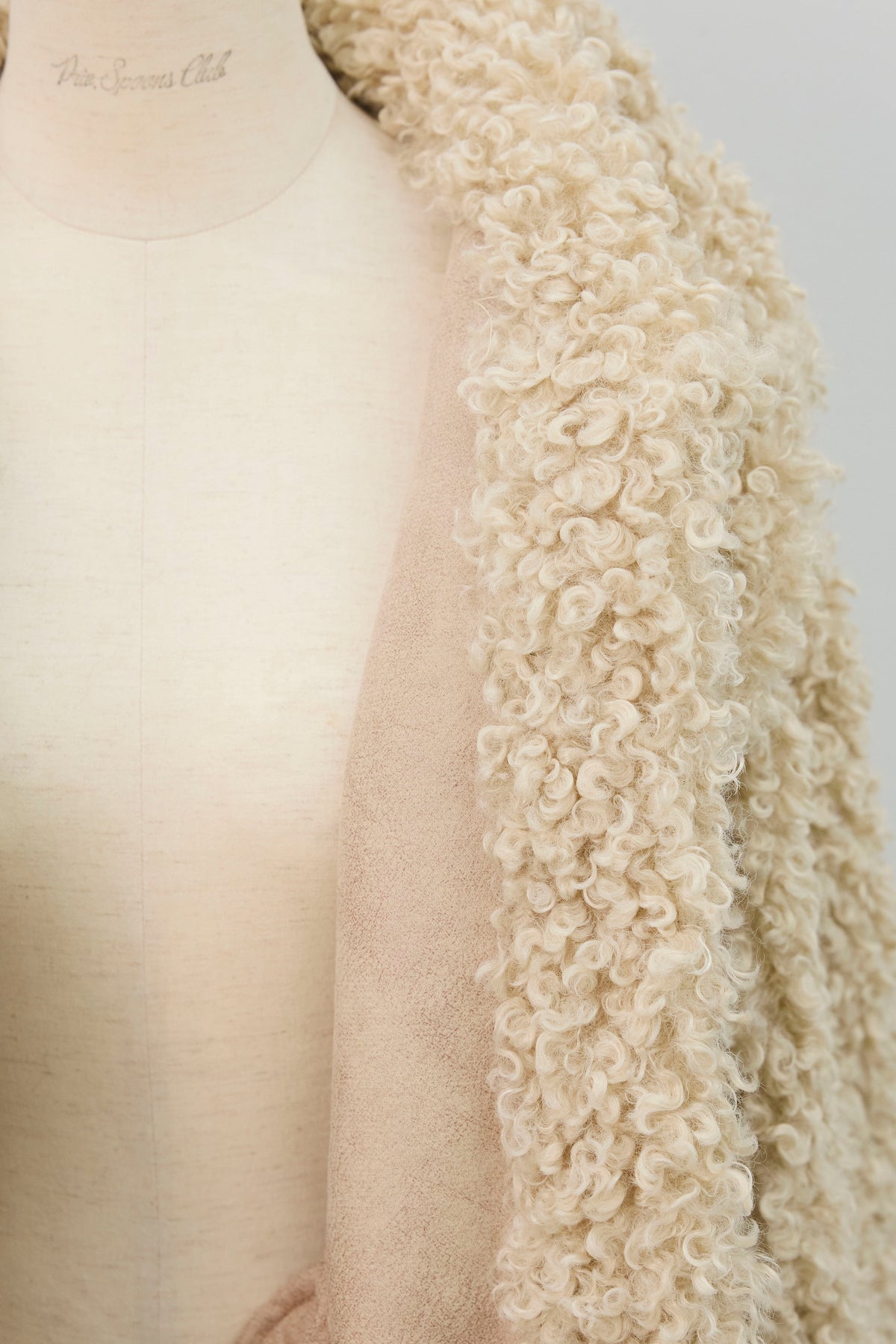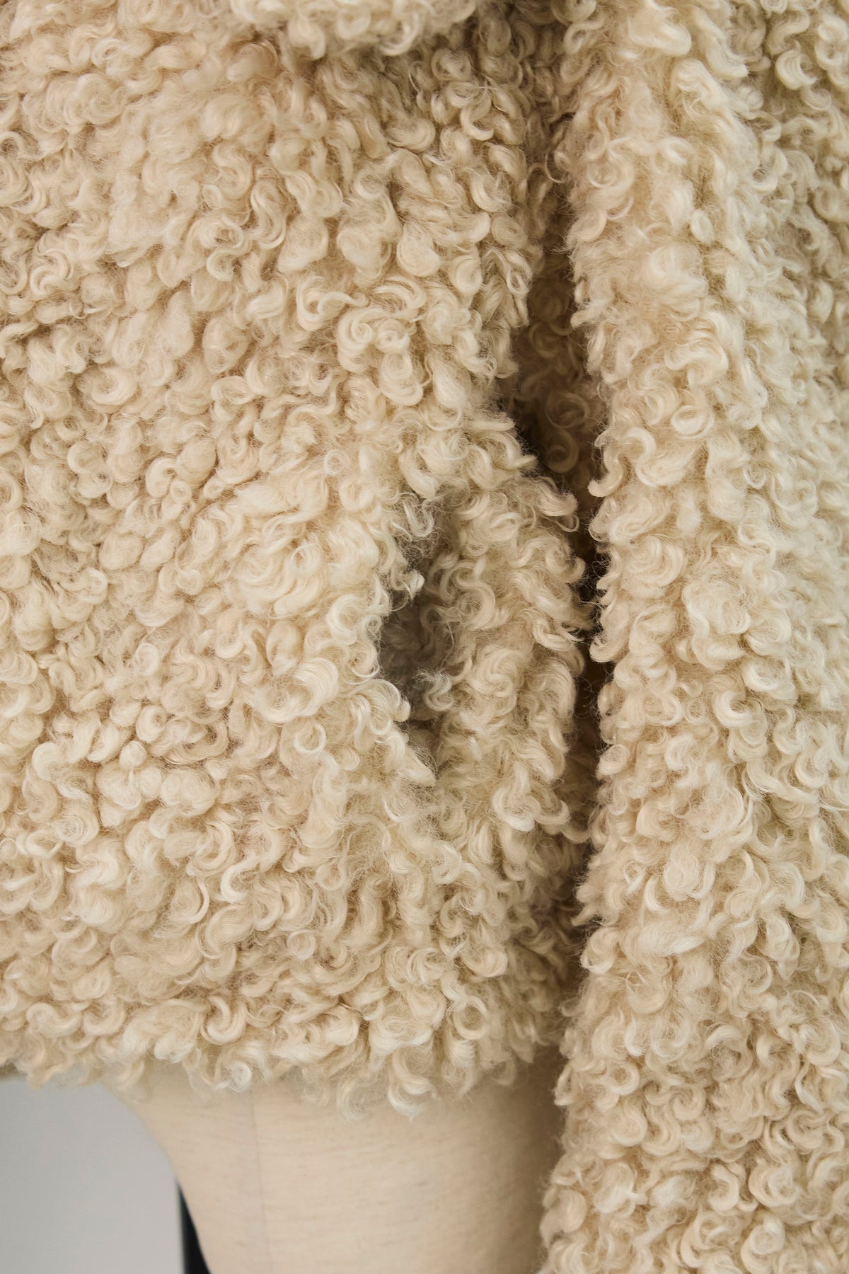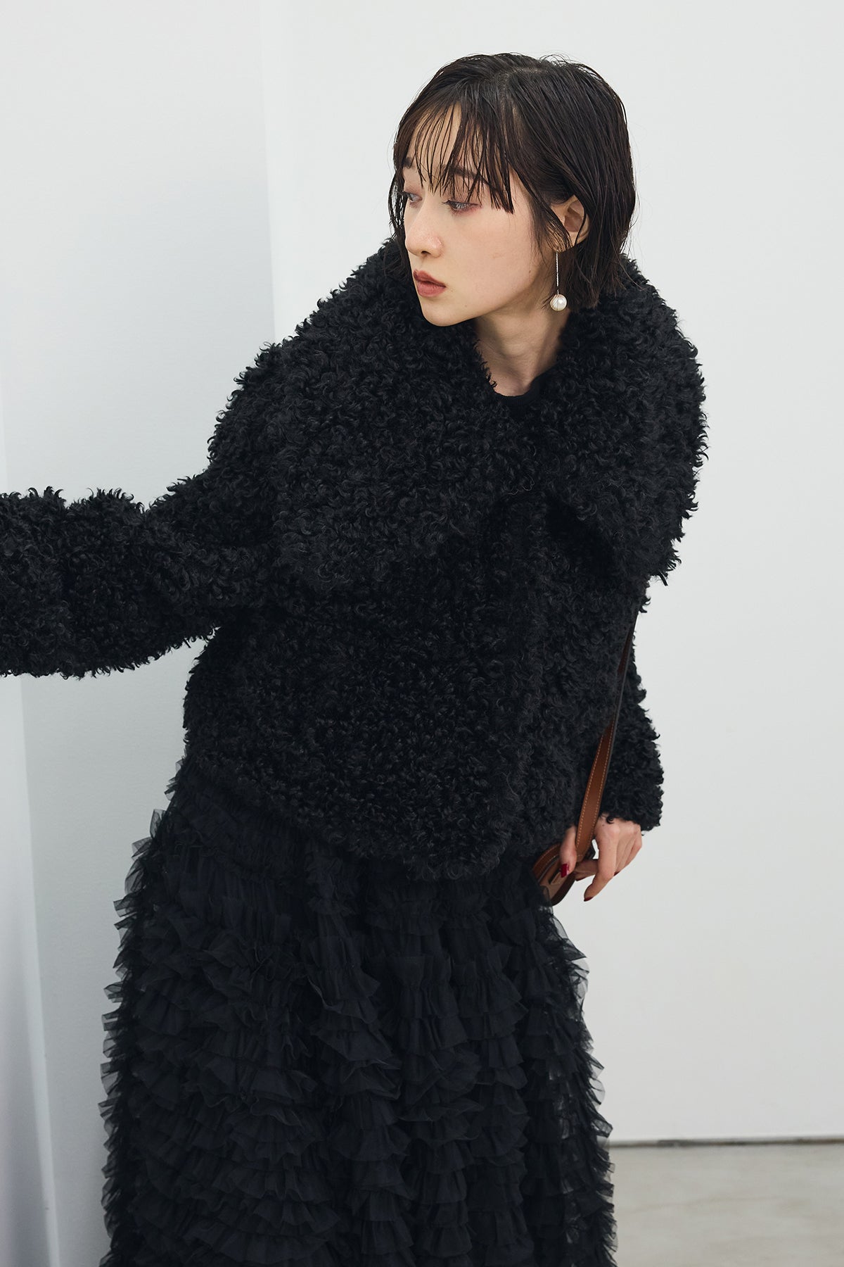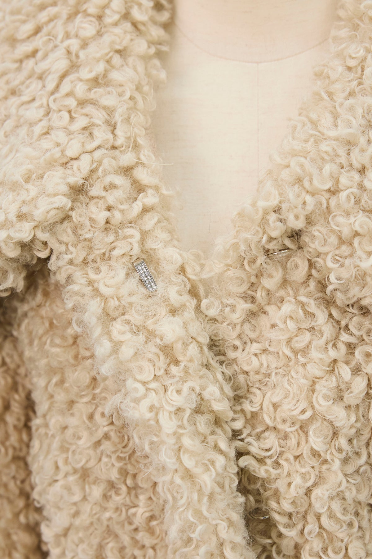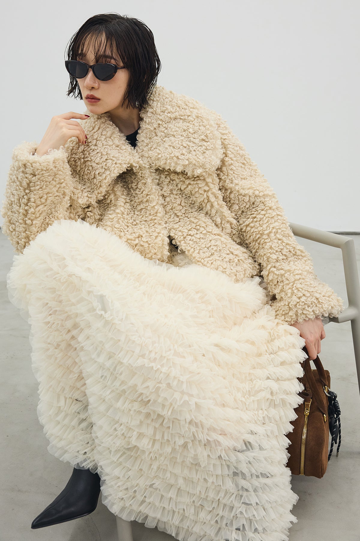 もこもことした質感が愛らしいプードル調ショートコート。 大きめのカラーが顔まわりに華やかさを添え、羽織るだけで旬なムードに。 ふんわり軽く、見た目以上にあたたかな着心地も魅力です。 甘さのある素材ながら、ショート丈でバランスよく、ボリュームスカートやワイドパンツとも好相性。 主役級の存在感で、冬のスタイリングをぐっと印象的に仕上げます。