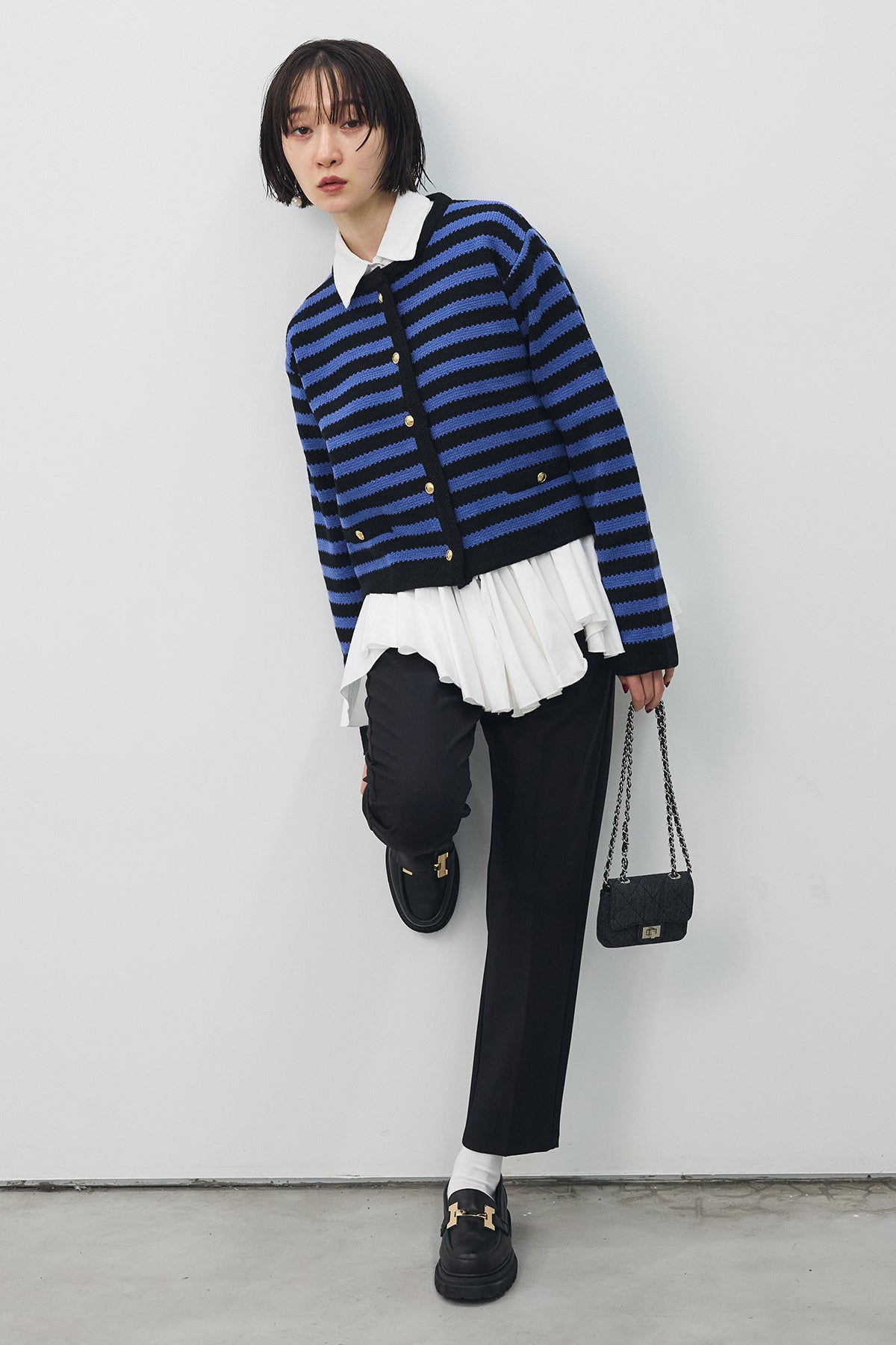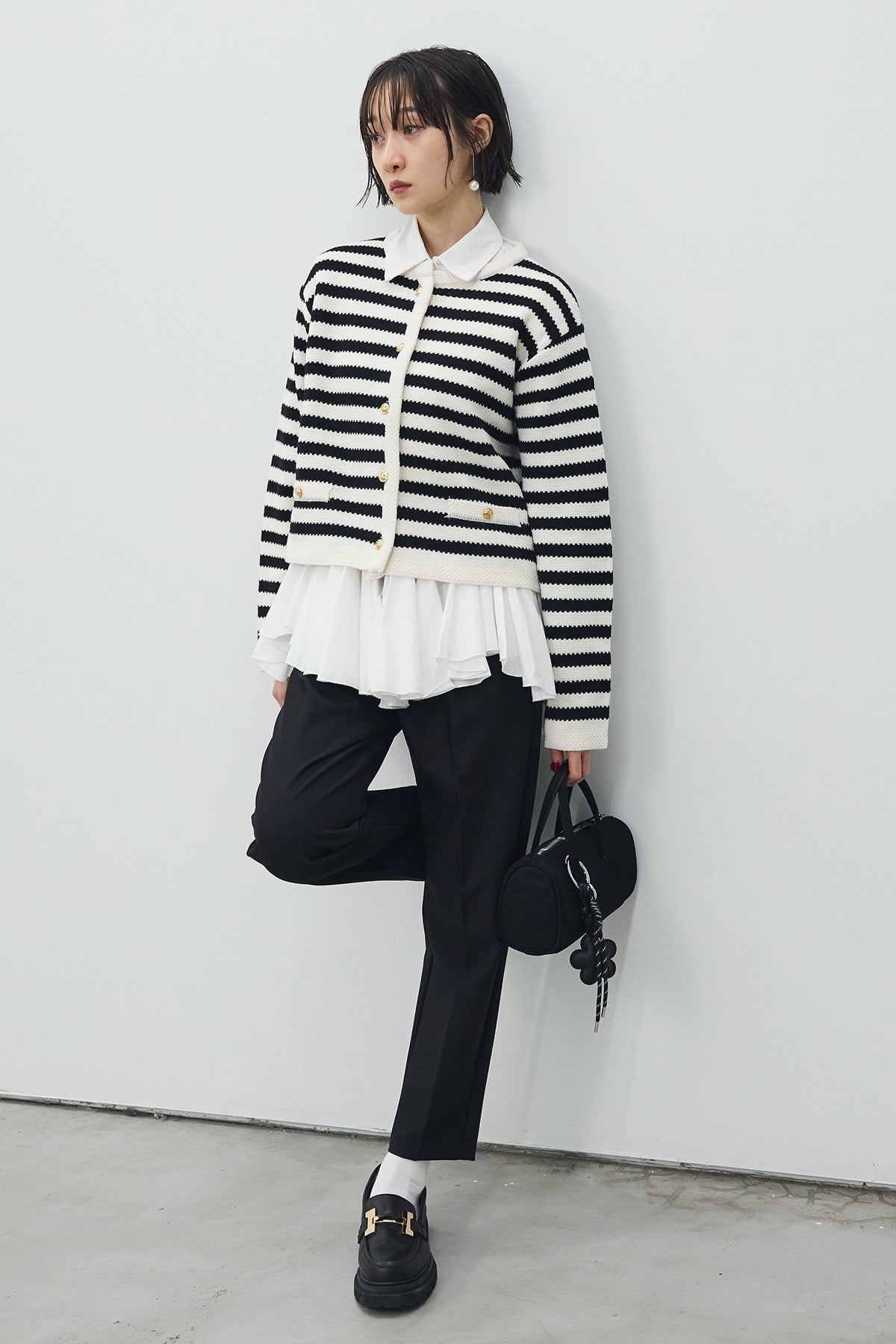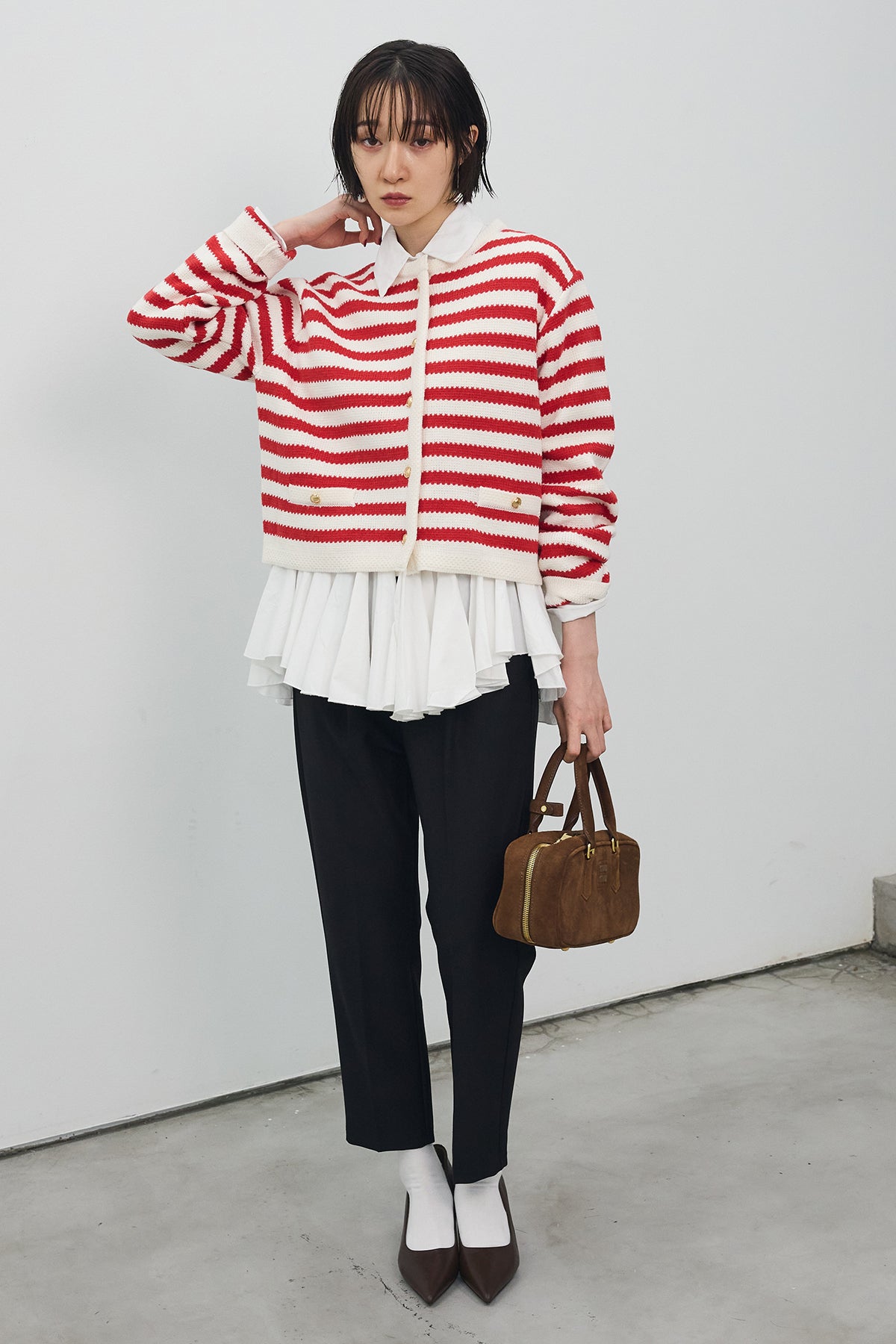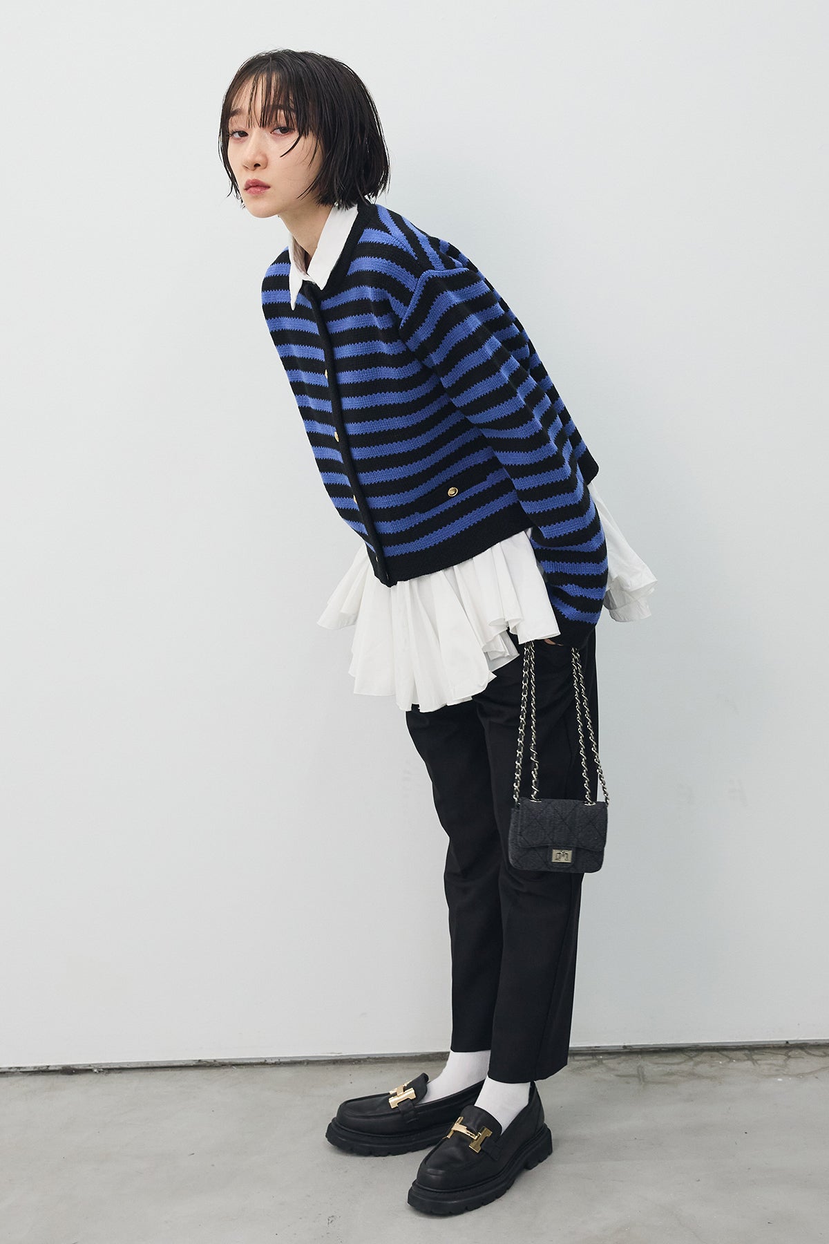 [予約/SET]マリンボタンボーダーカーデ+パネルフレアヘムシャツ+タックテーパードパンツ(3set)