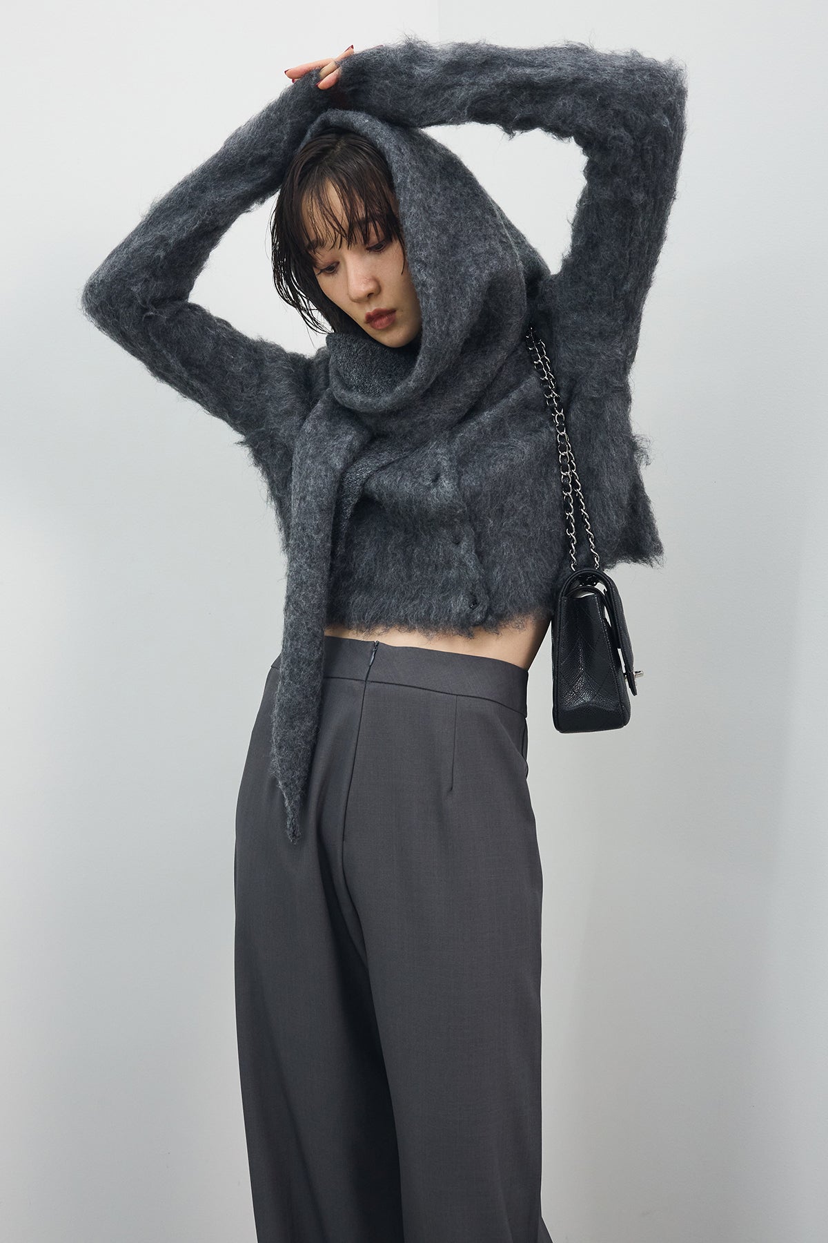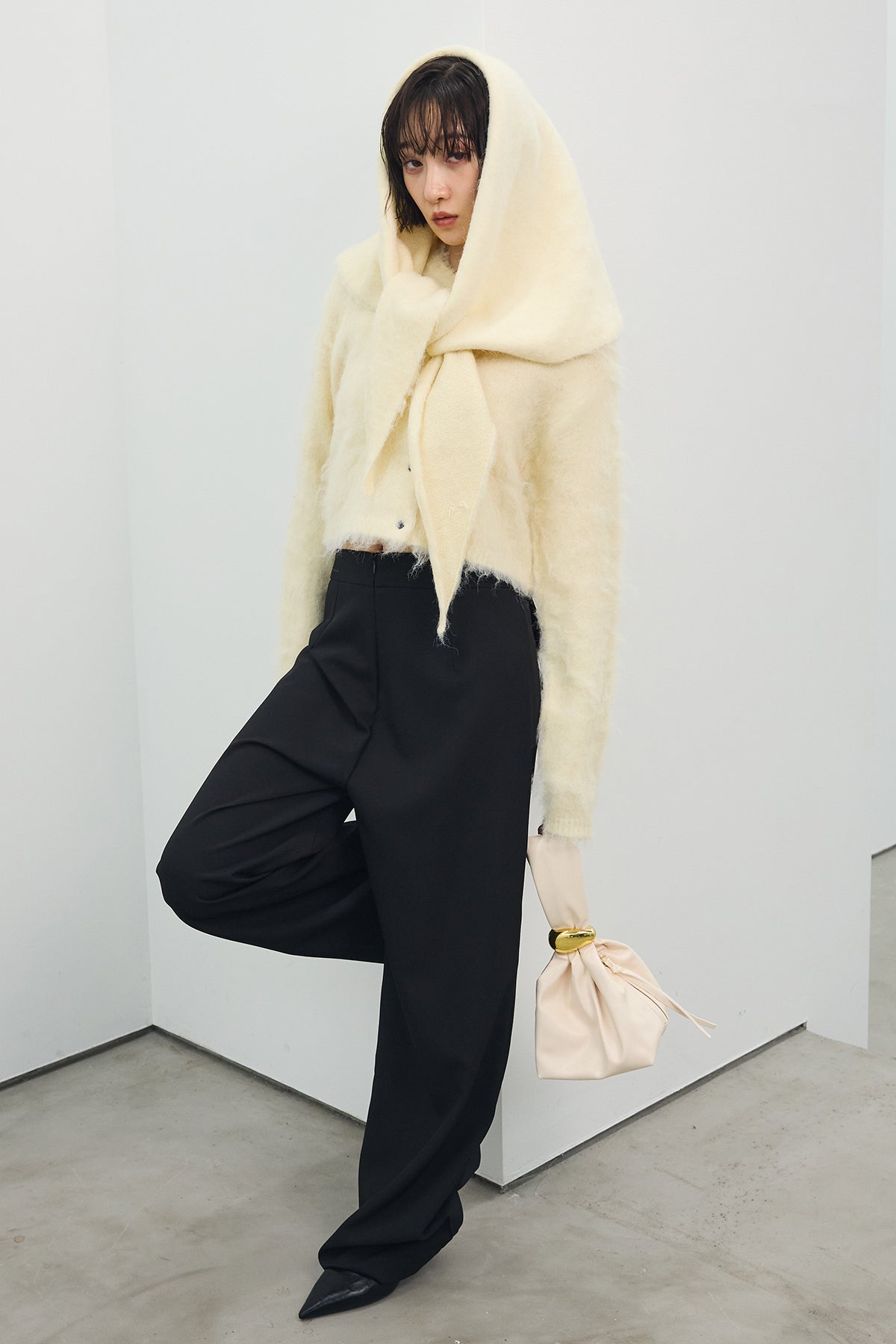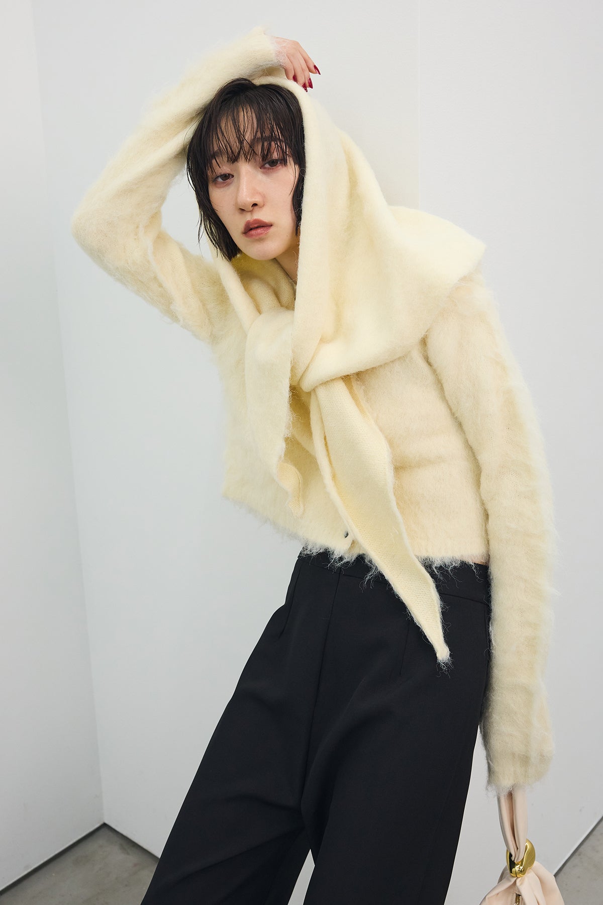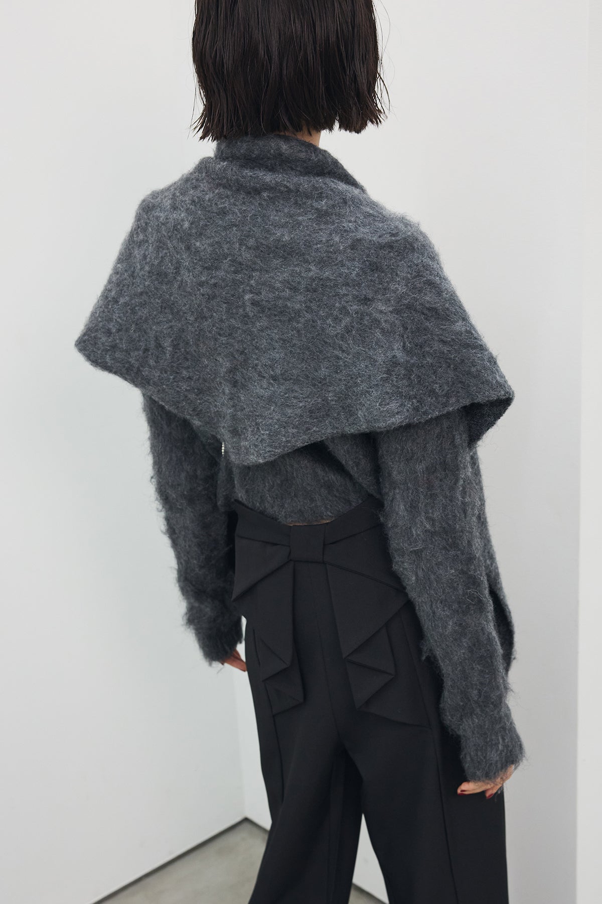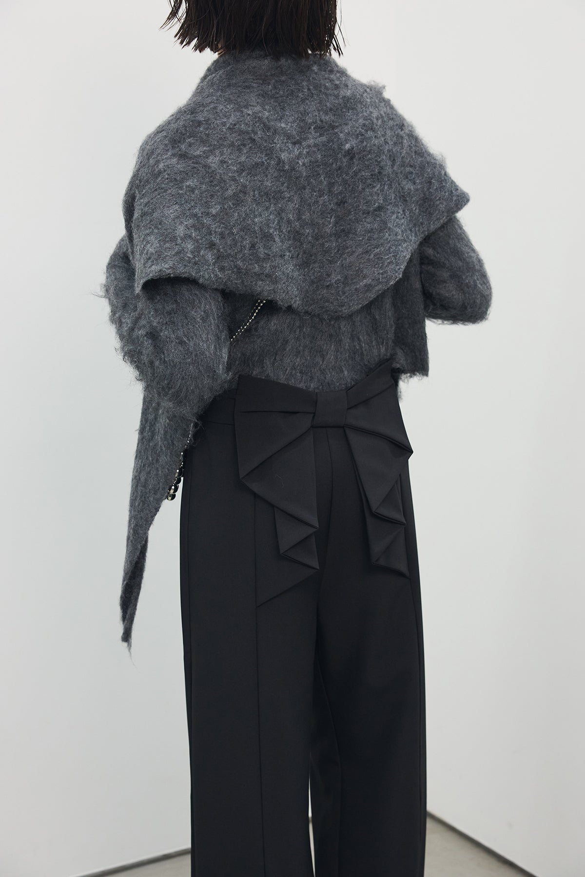 [予約/SET]モヘアタッチクロップドニットカーデ+モヘアタッチトライアングルスカーフ+バックリボンストレートパンツ(3set)