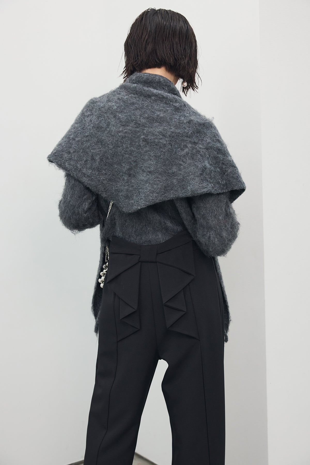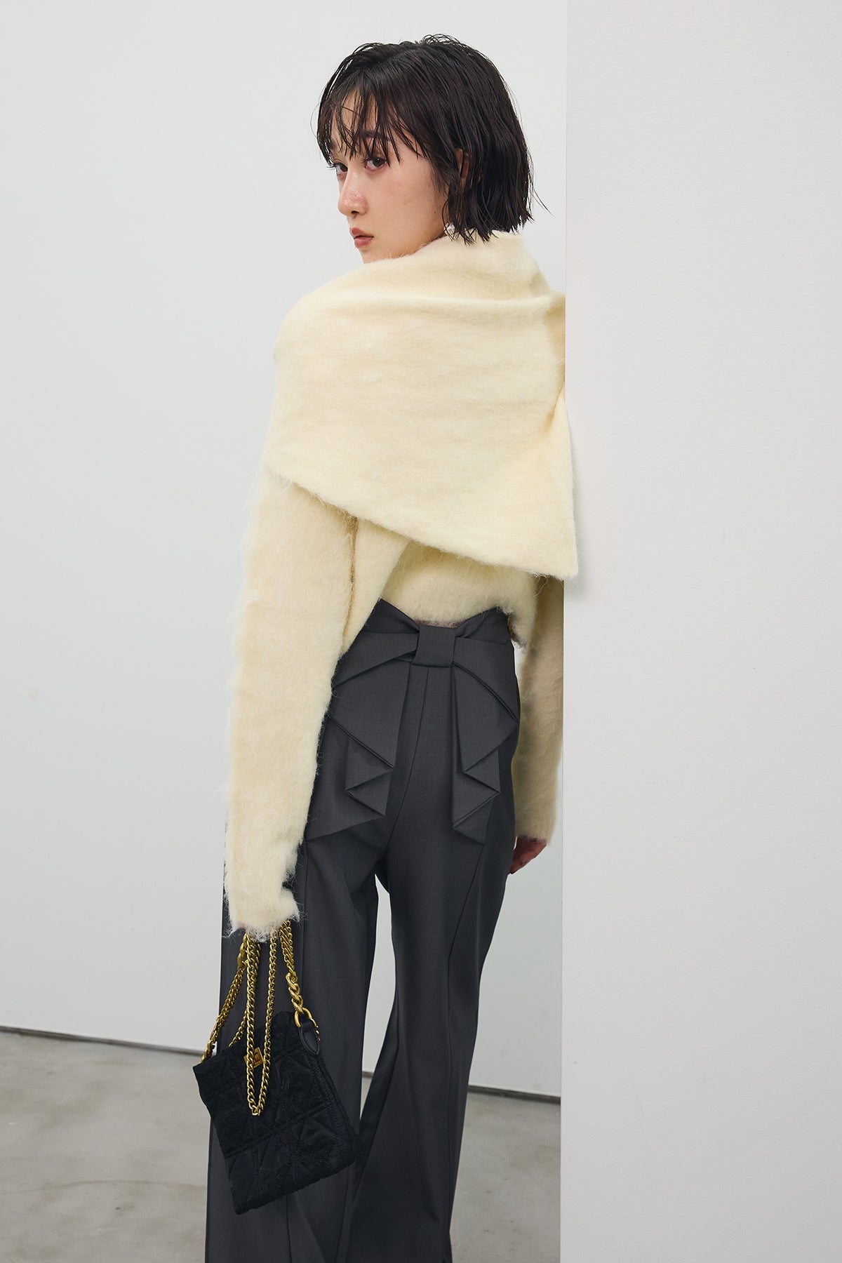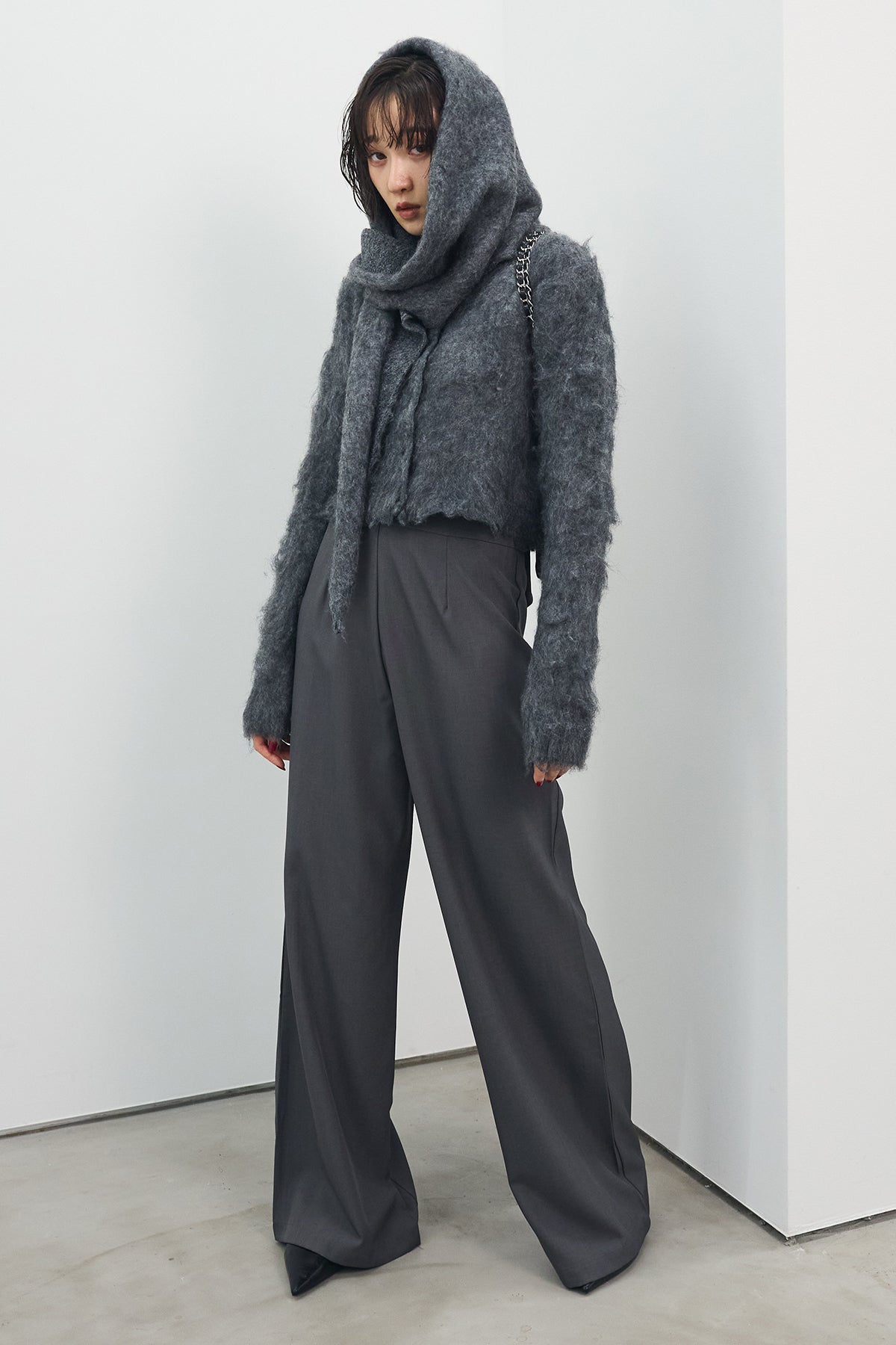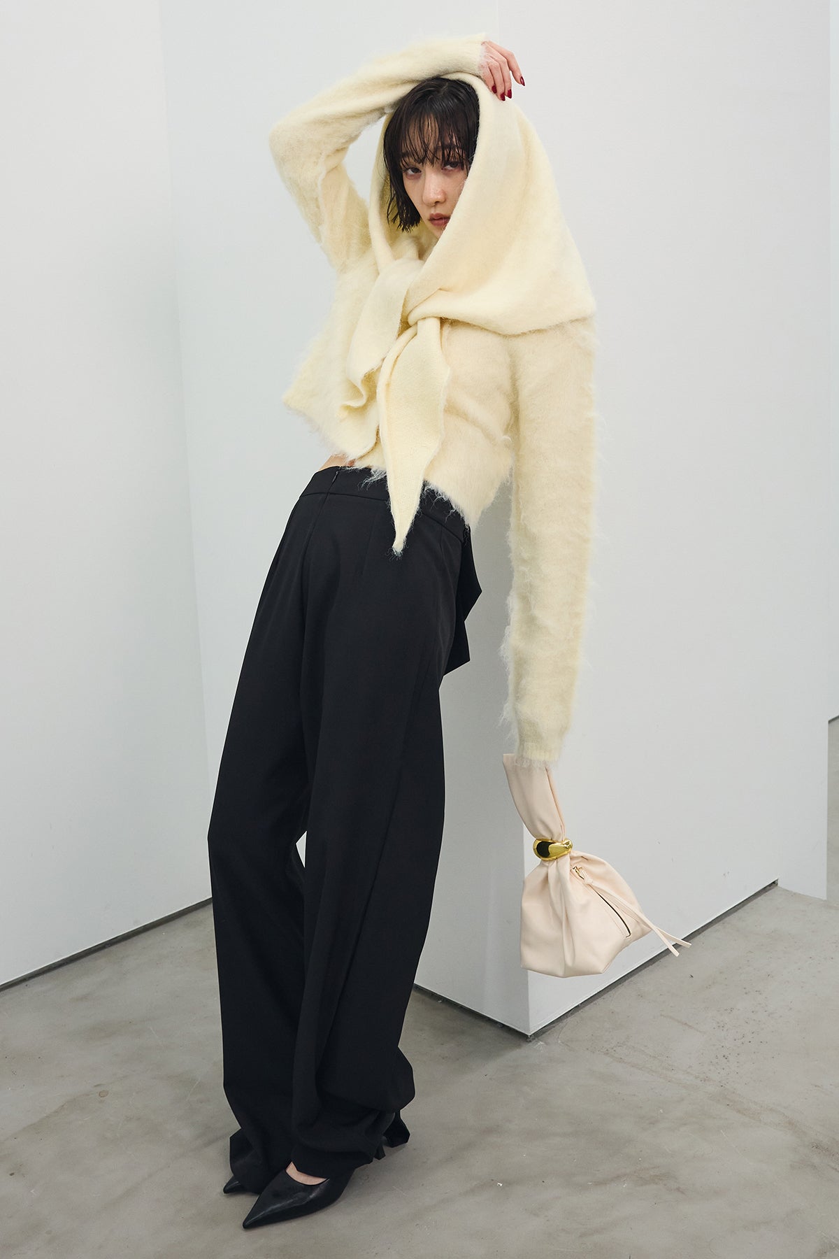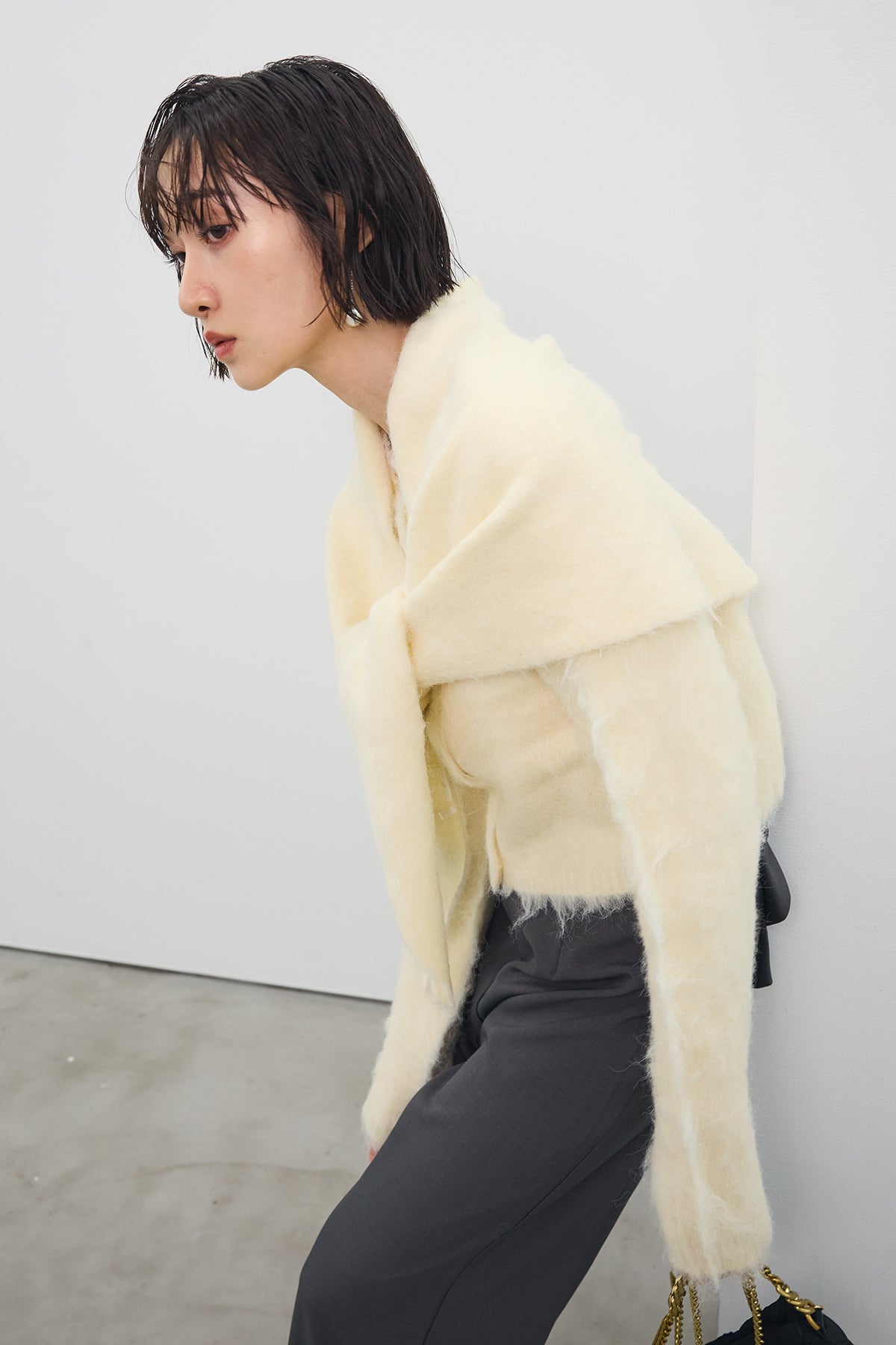 [予約/SET]モヘアタッチクロップドニットカーデ+モヘアタッチトライアングルスカーフ+バックリボンストレートパンツ(3set)