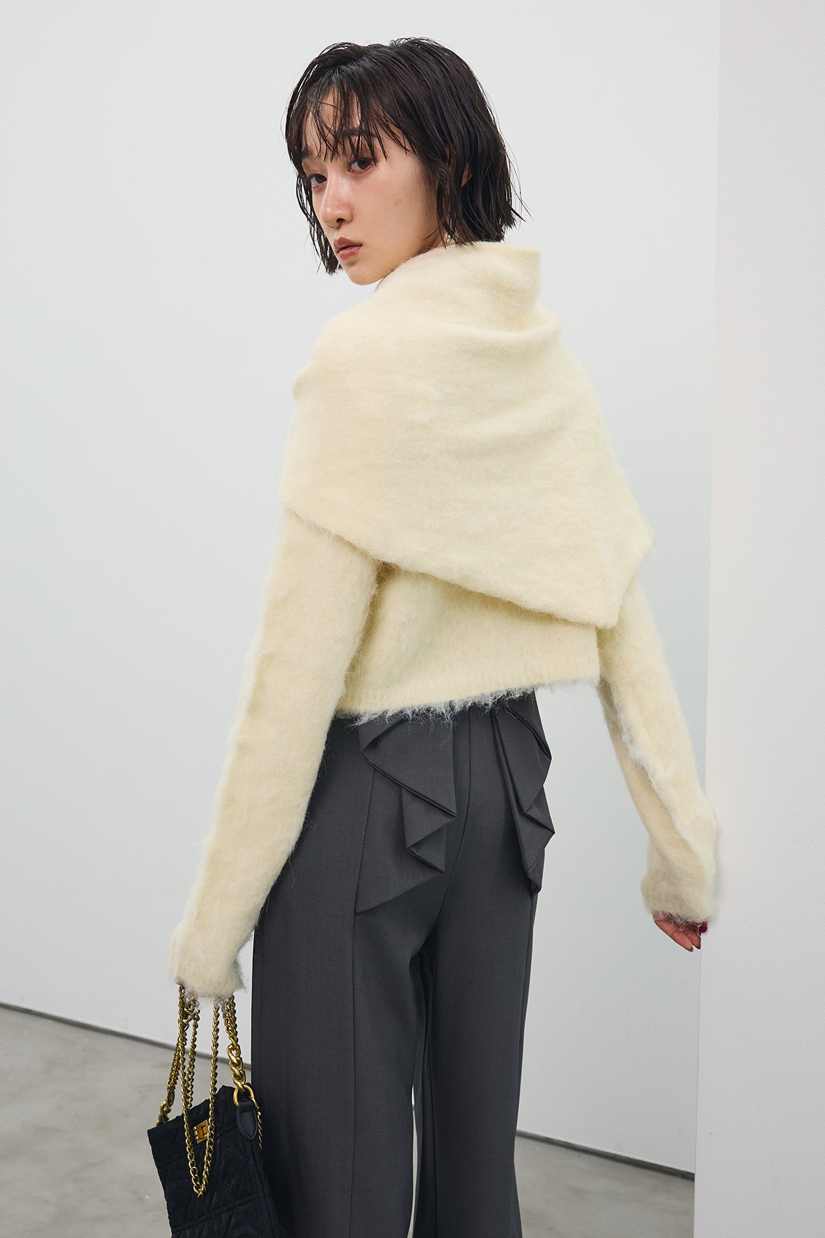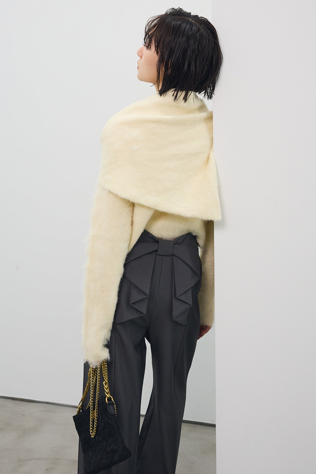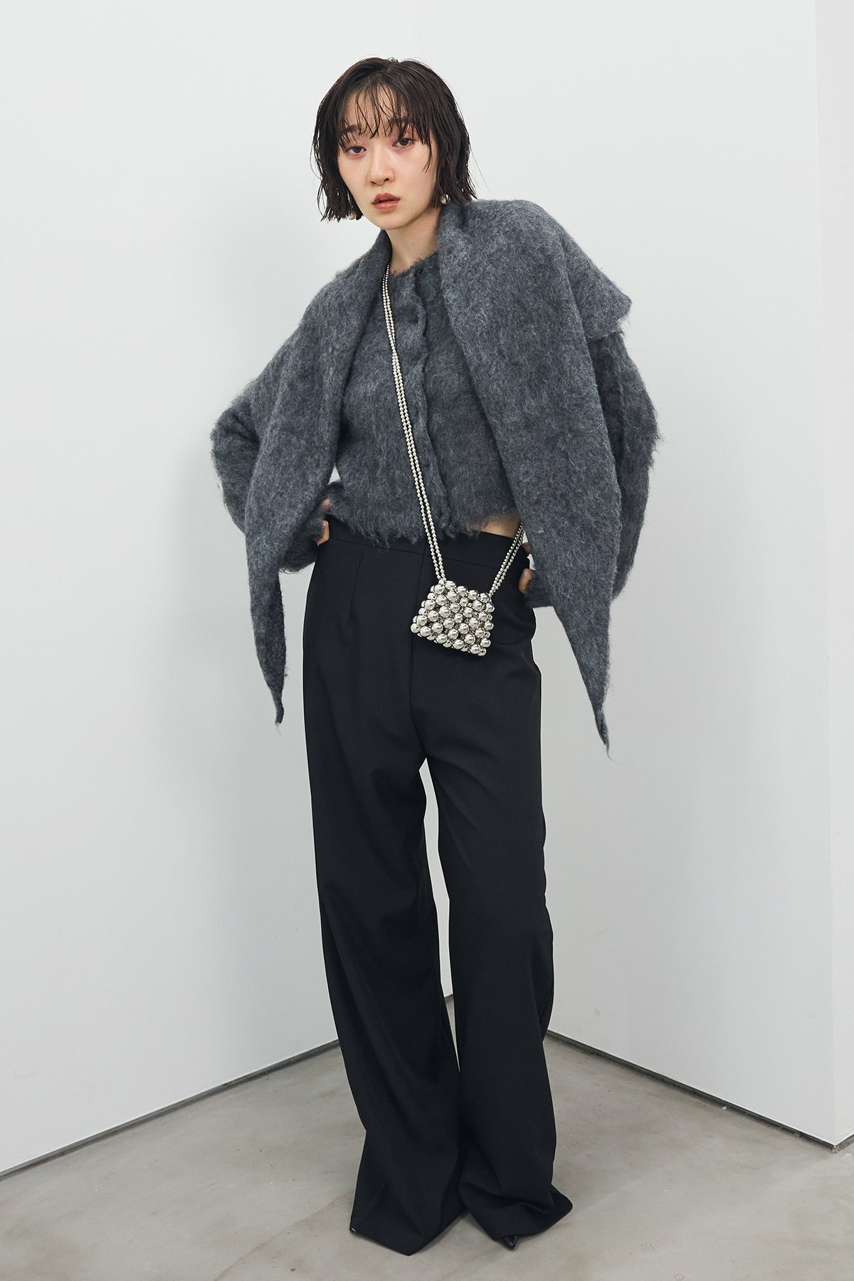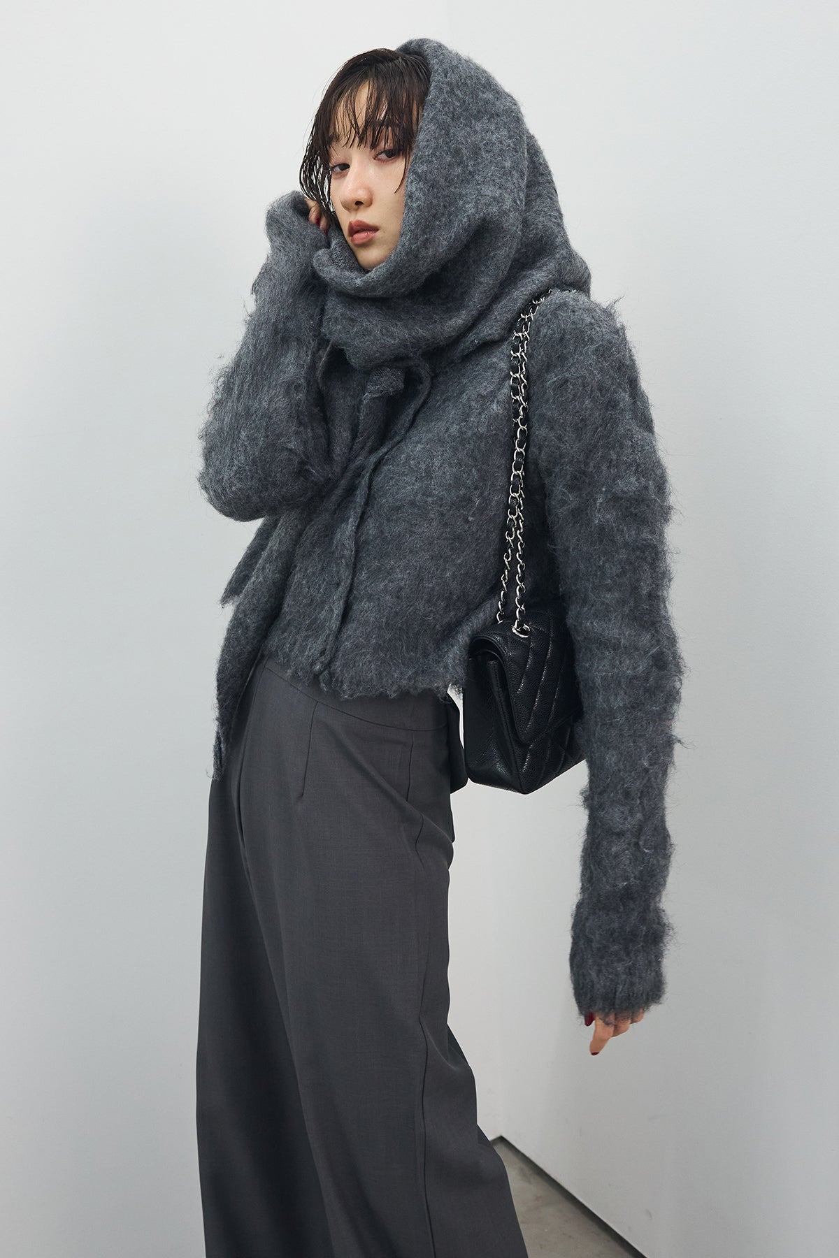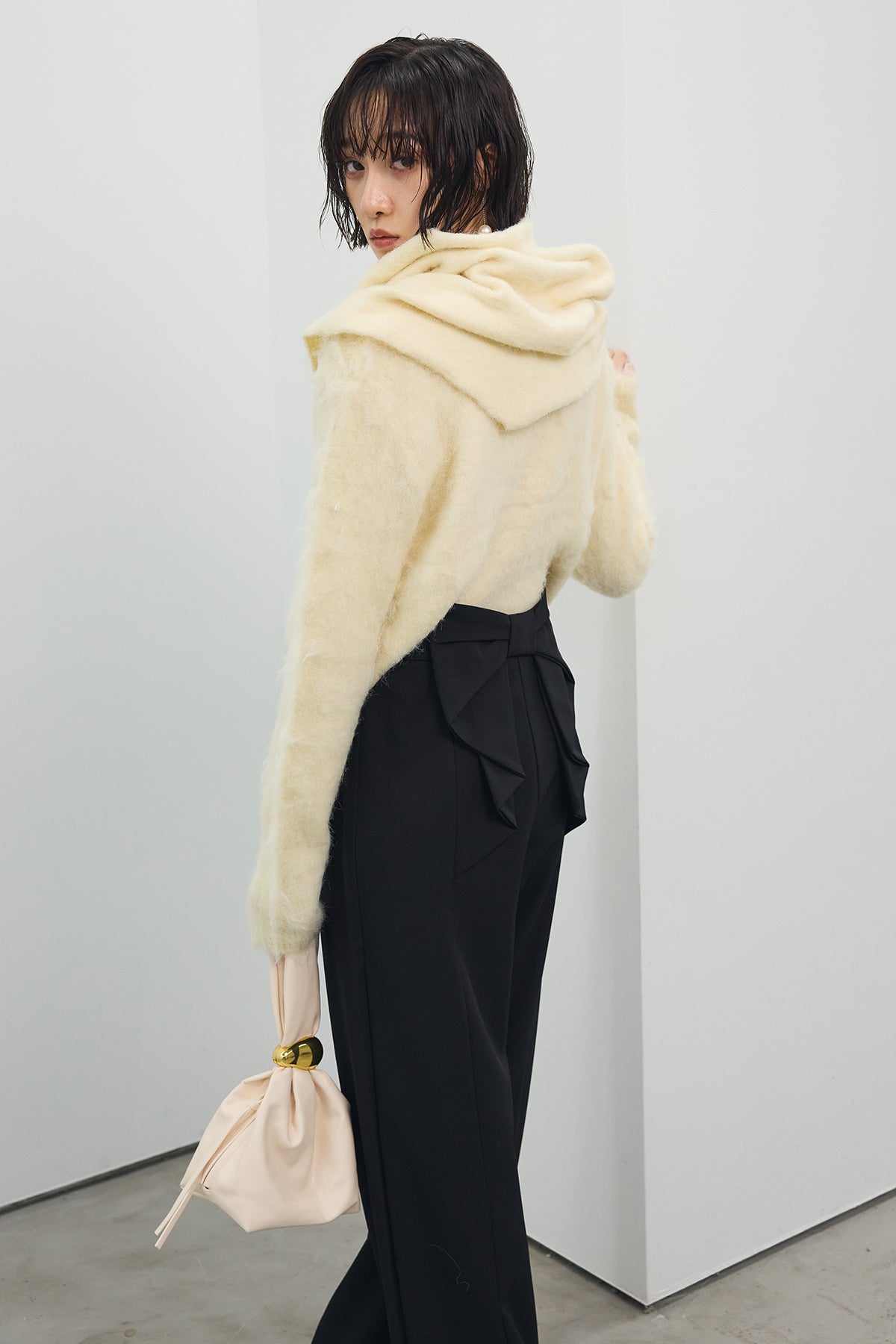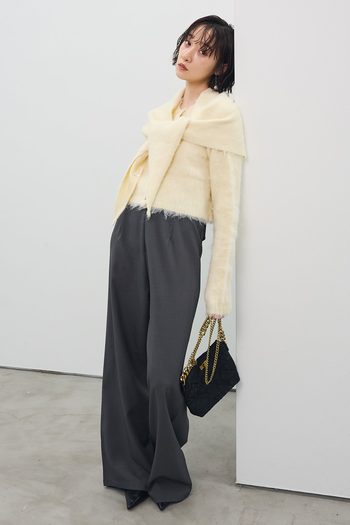 [予約/SET]モヘアタッチクロップドニットカーデ+モヘアタッチトライアングルスカーフ+バックリボンストレートパンツ(3set)