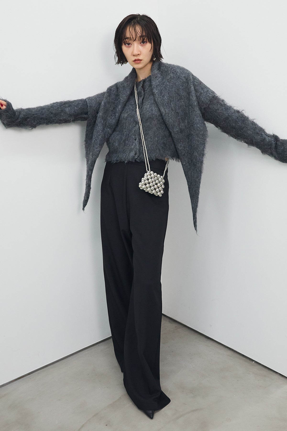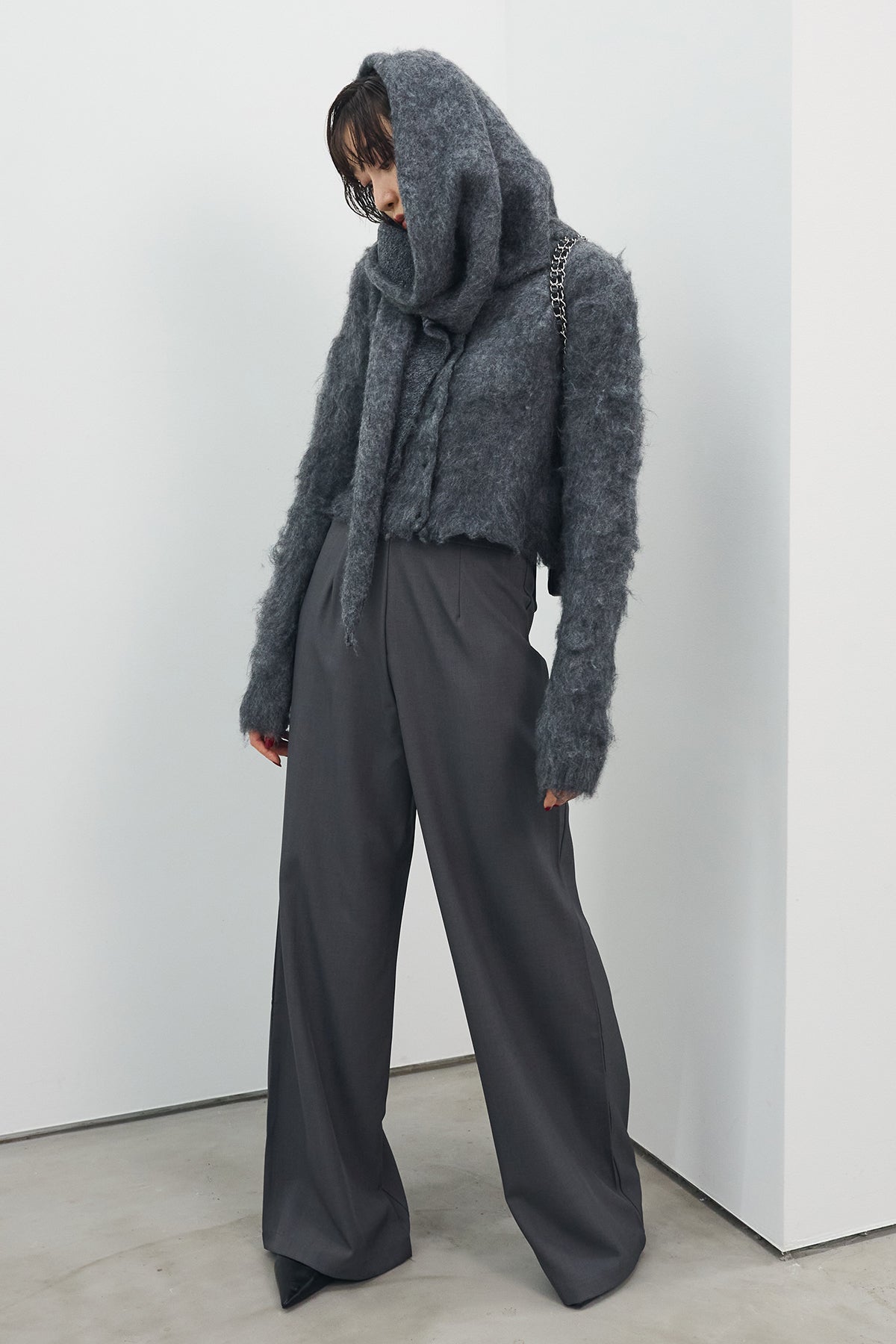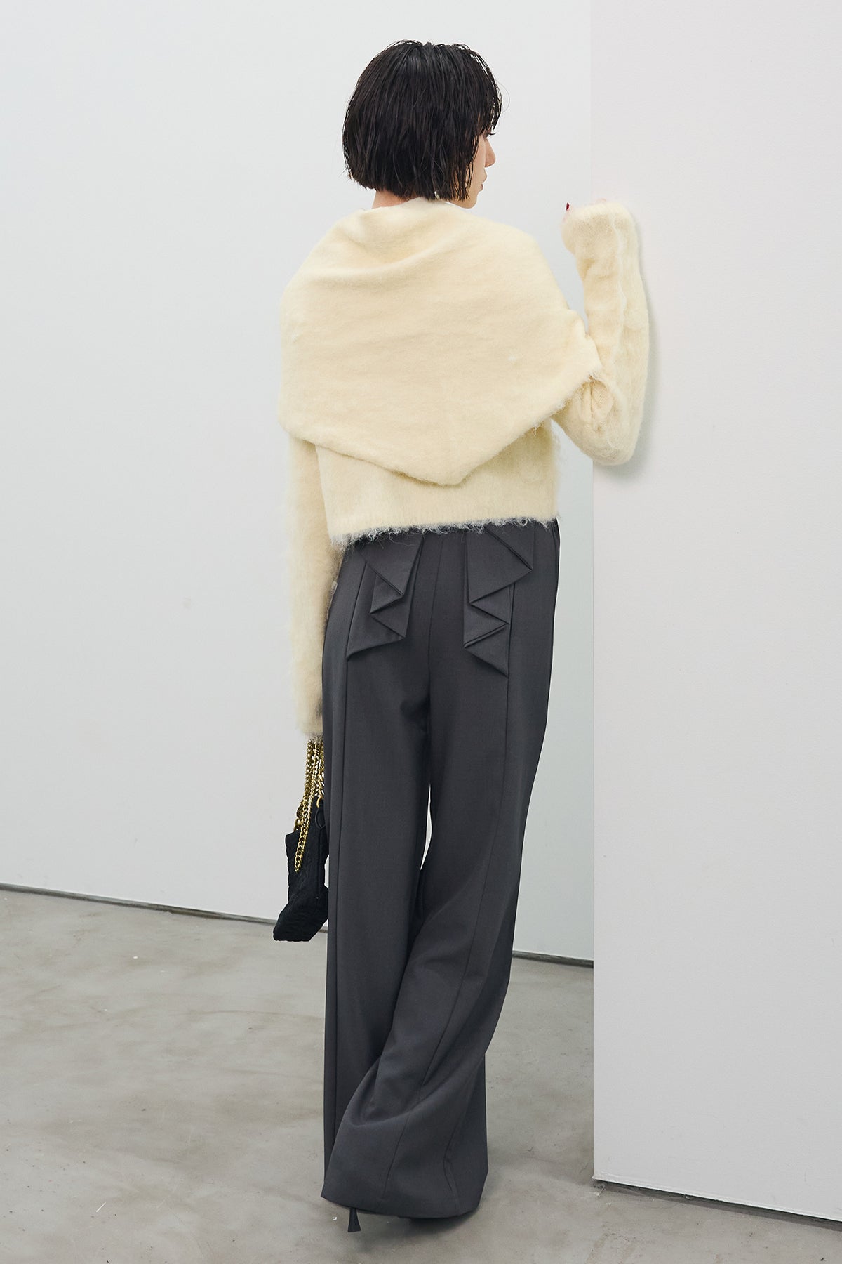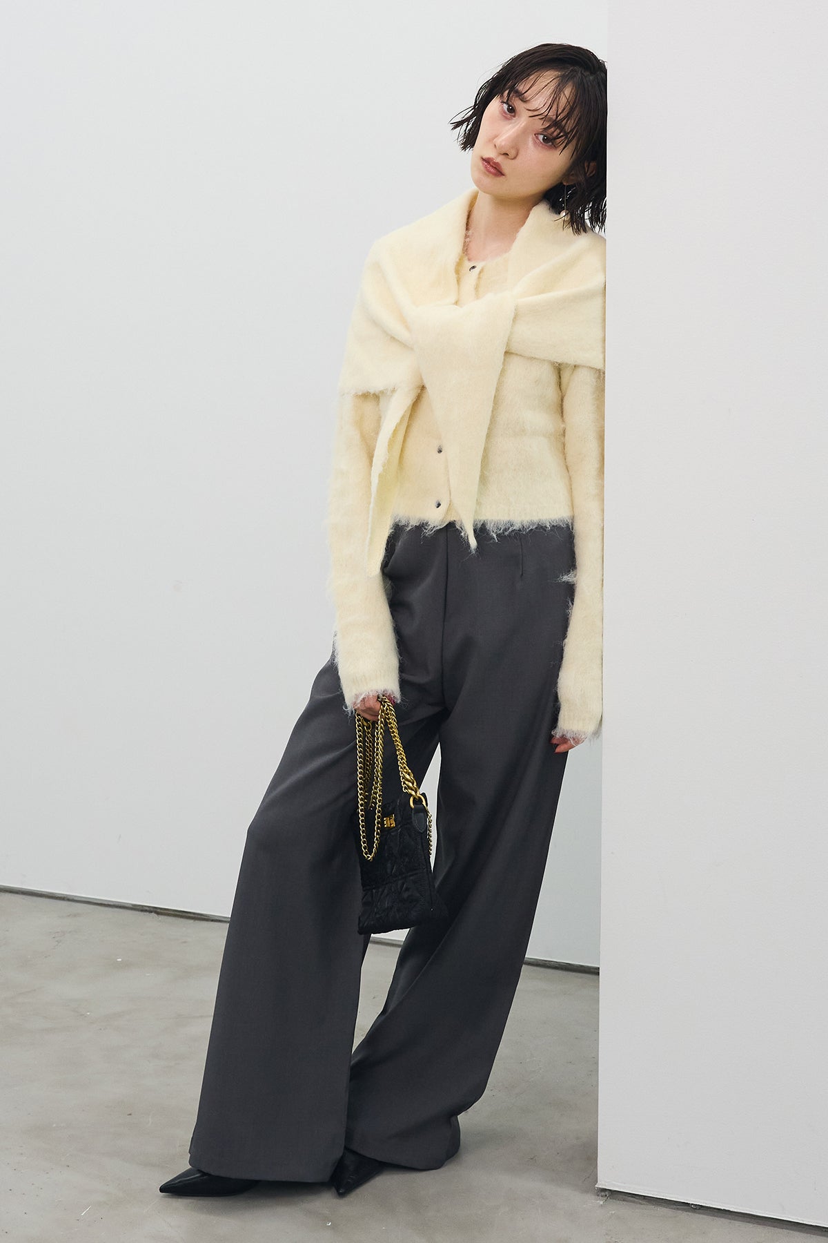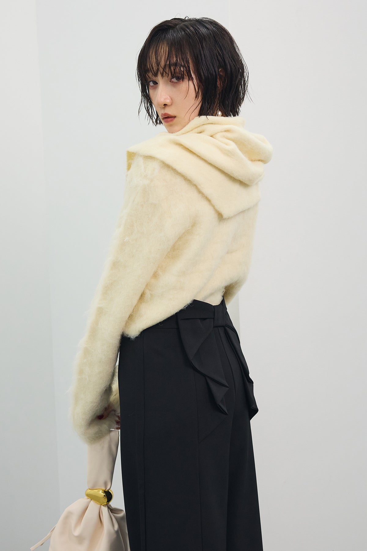 [予約/SET]モヘアタッチクロップドニットカーデ+モヘアタッチトライアングルスカーフ+バックリボンストレートパンツ(3set)