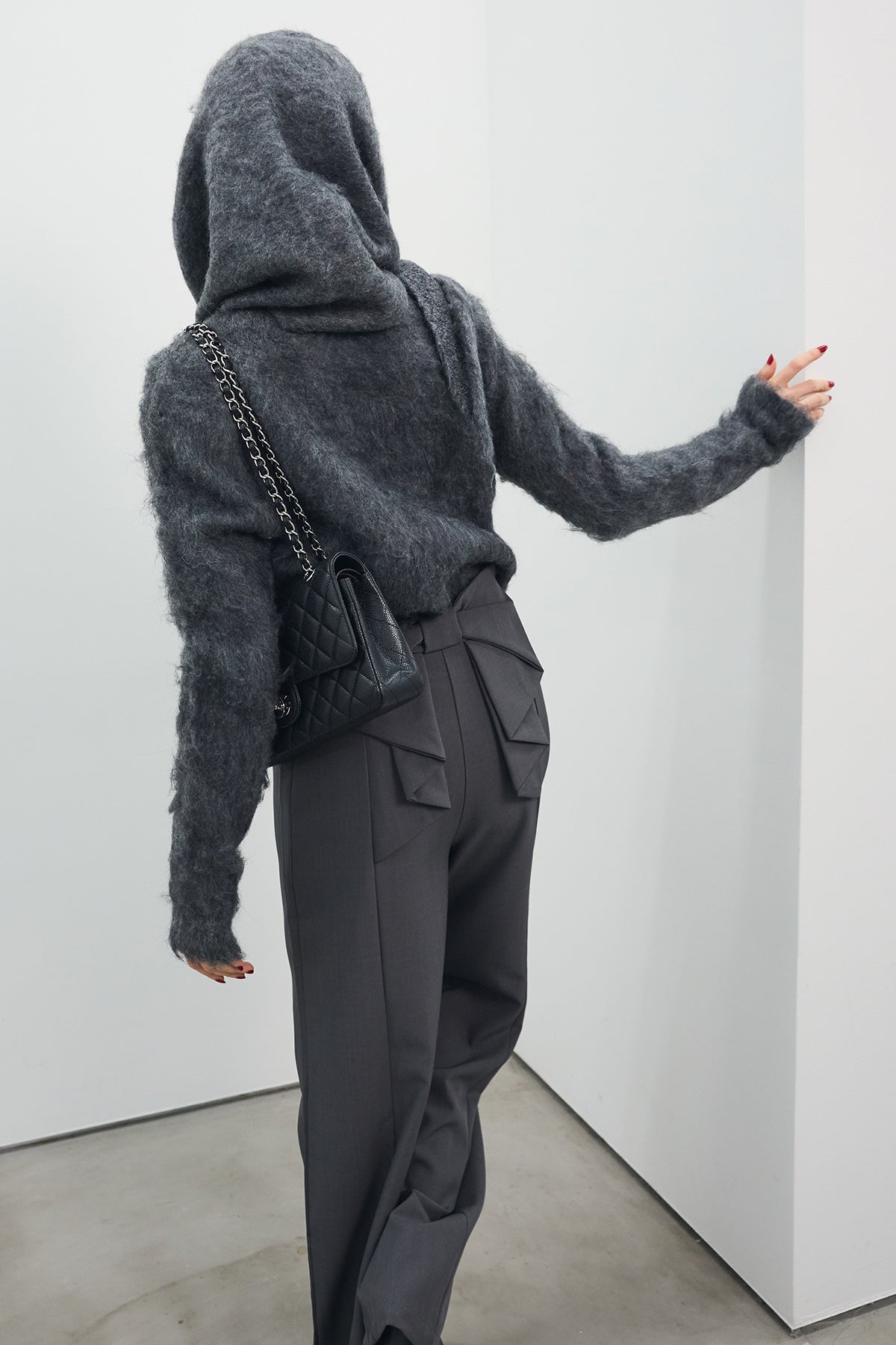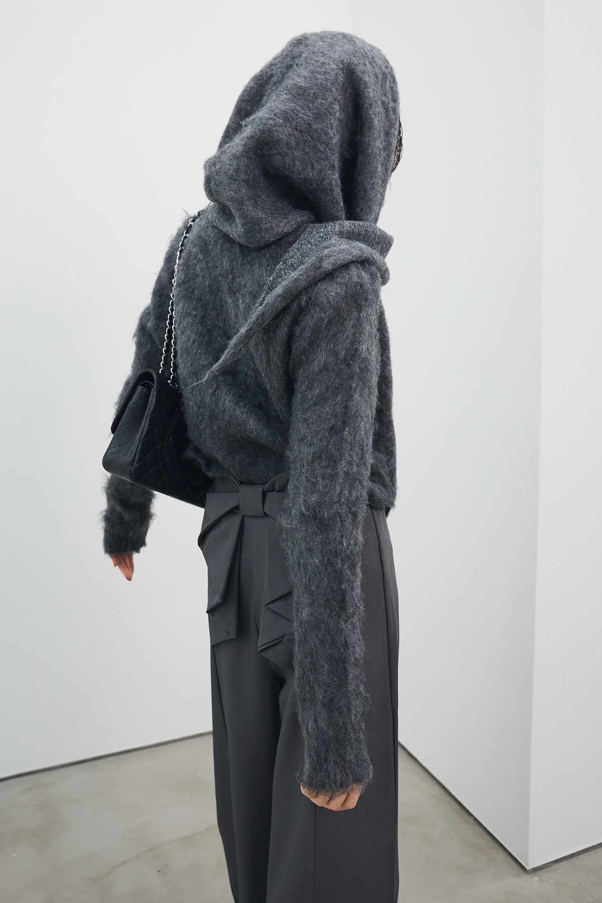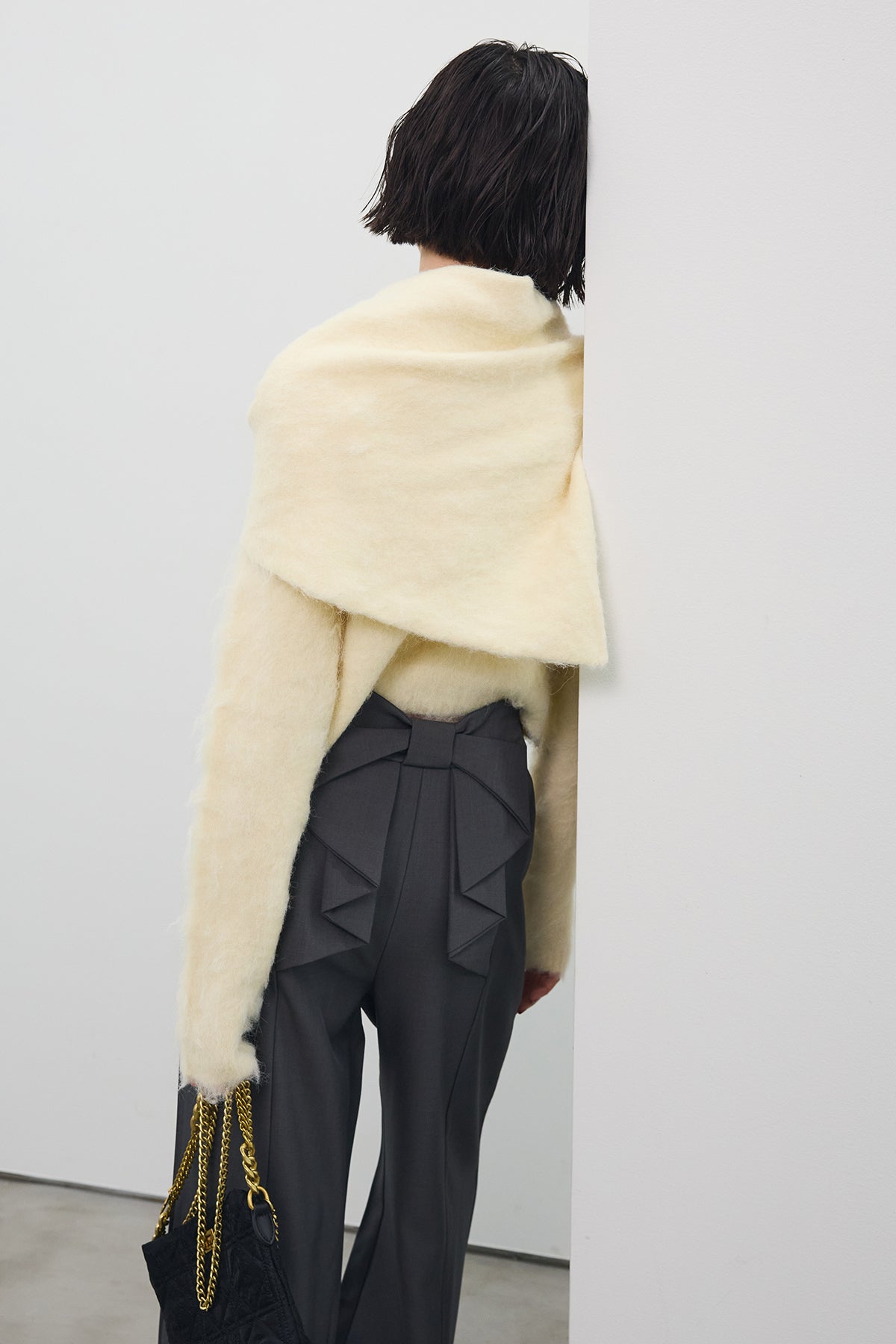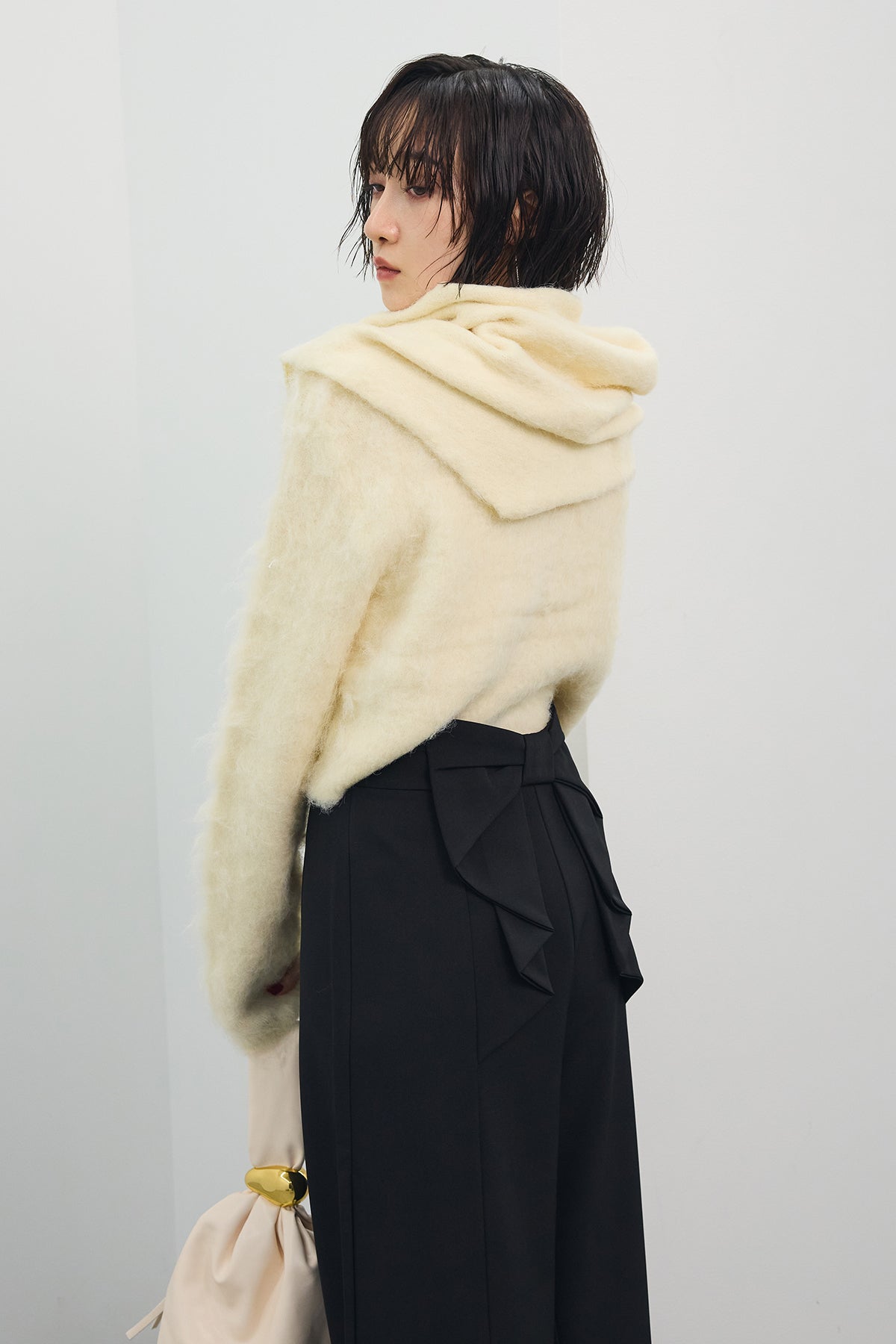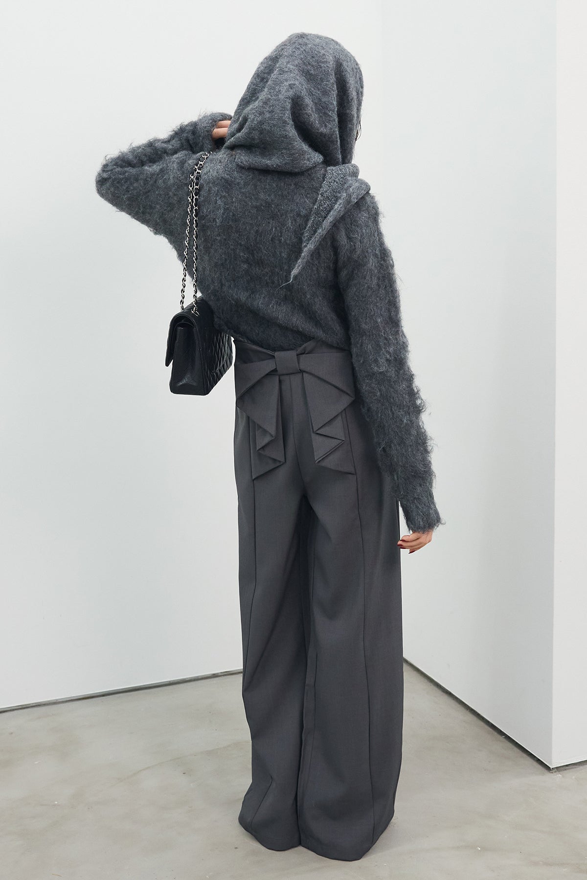 [予約/SET]モヘアタッチクロップドニットカーデ+モヘアタッチトライアングルスカーフ+バックリボンストレートパンツ(3set)