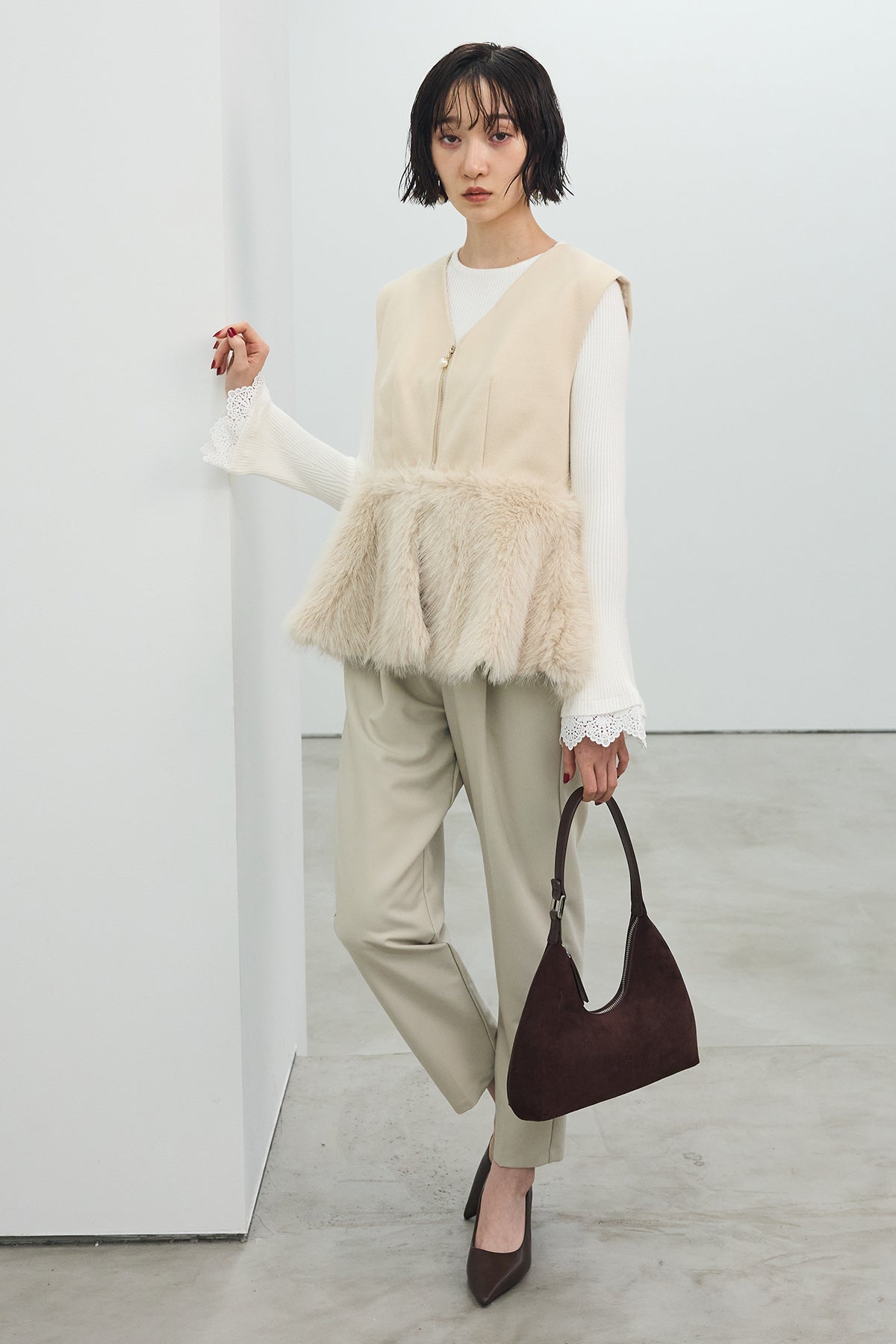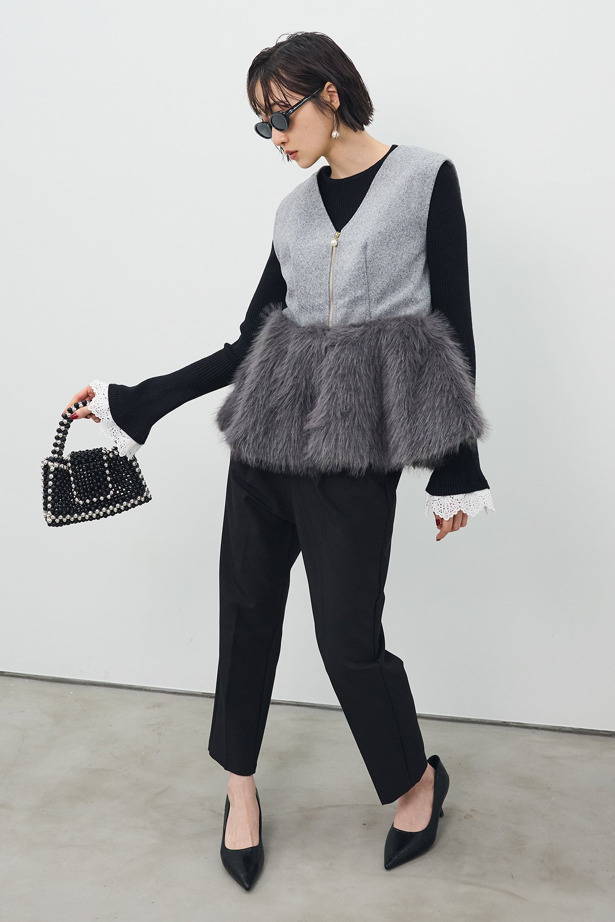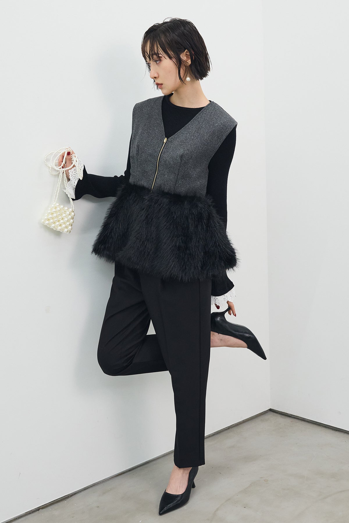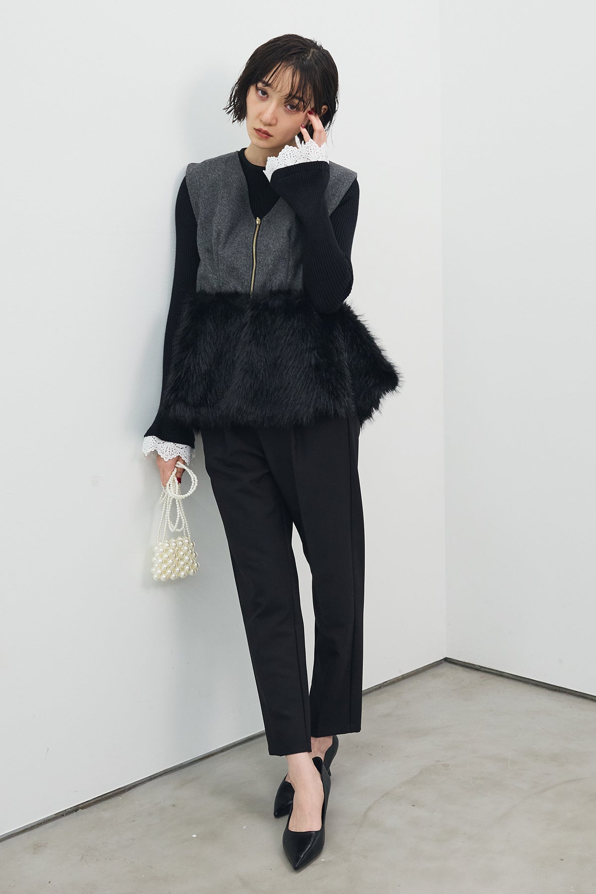 [予約/SET]フレアレースカフスリブニット+フェイクファードッキングZIPベスト+タックテーパードパンツ(3set)