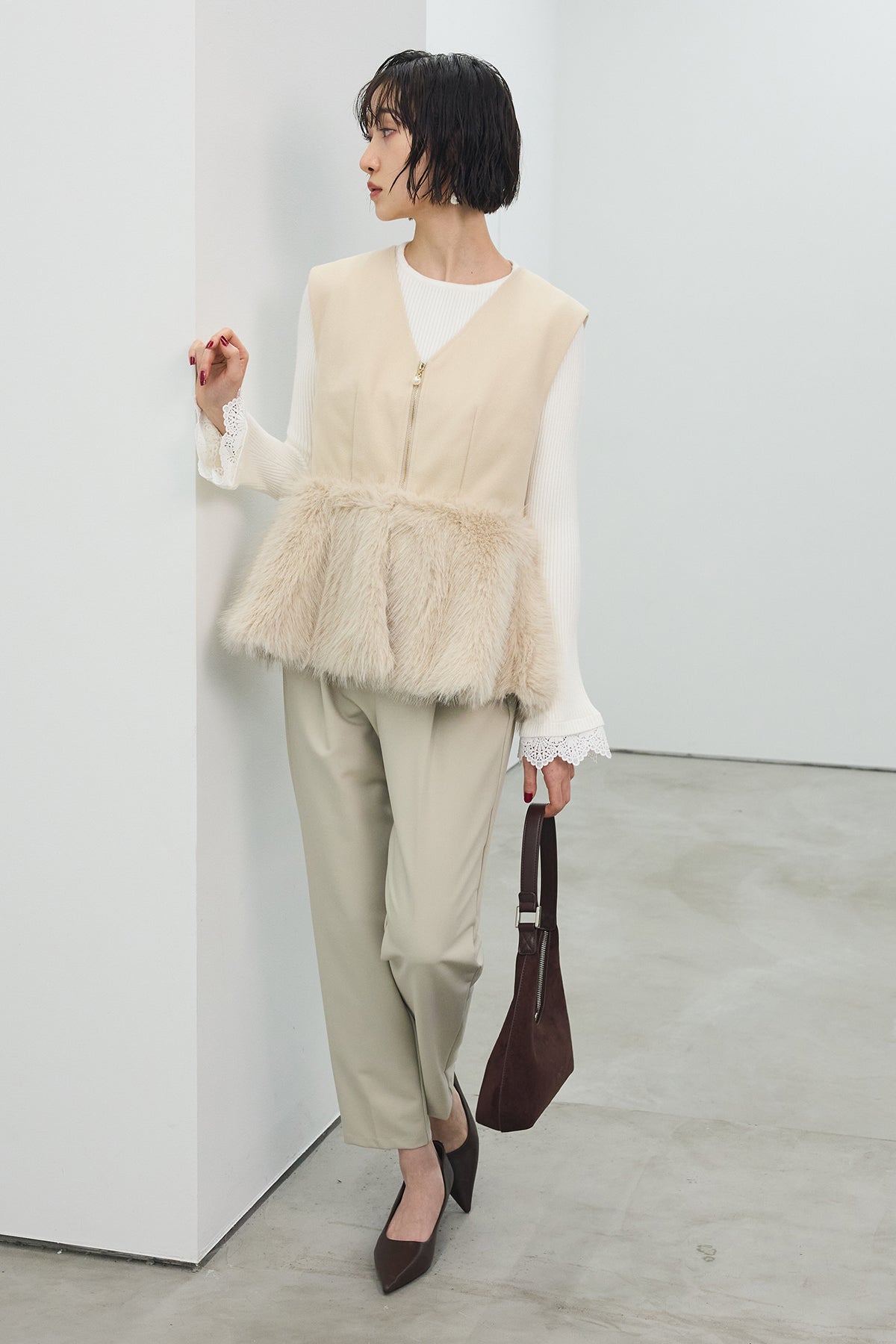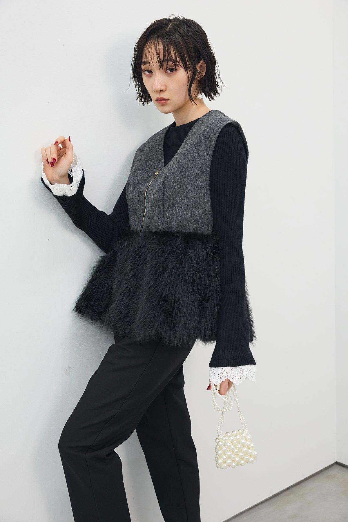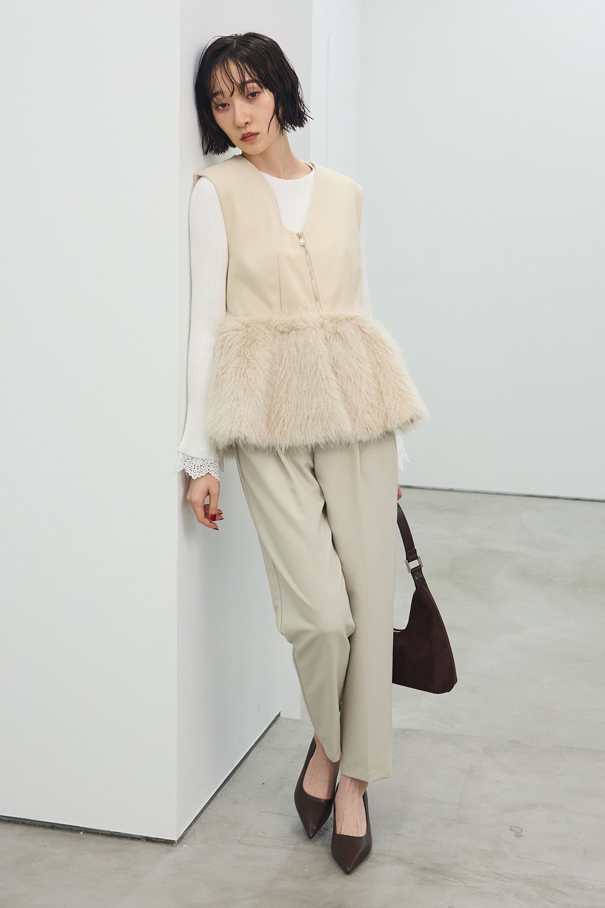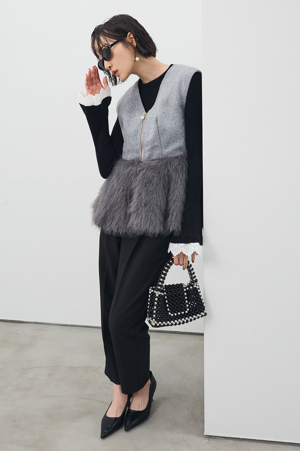 [予約/SET]フレアレースカフスリブニット+フェイクファードッキングZIPベスト+タックテーパードパンツ(3set)