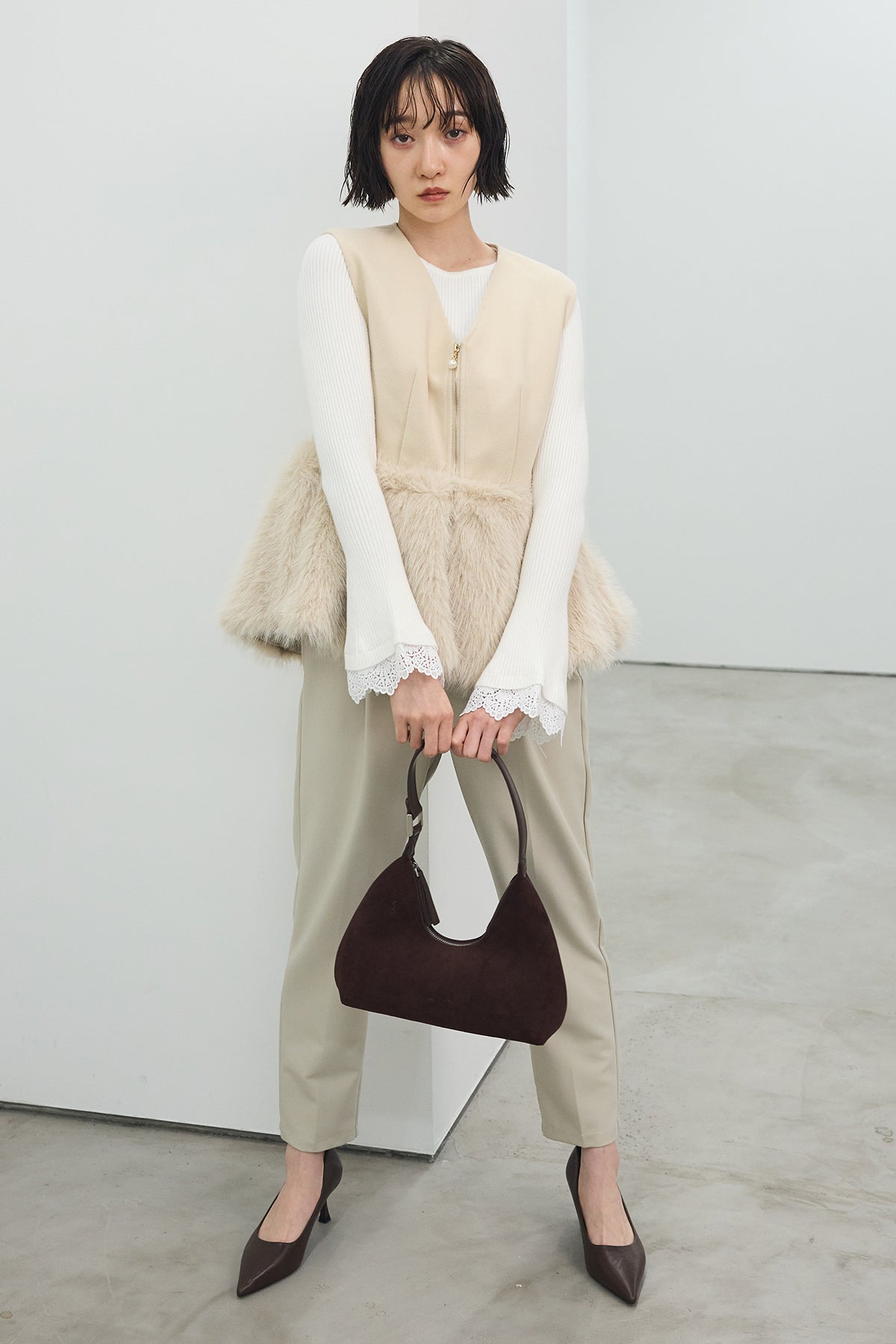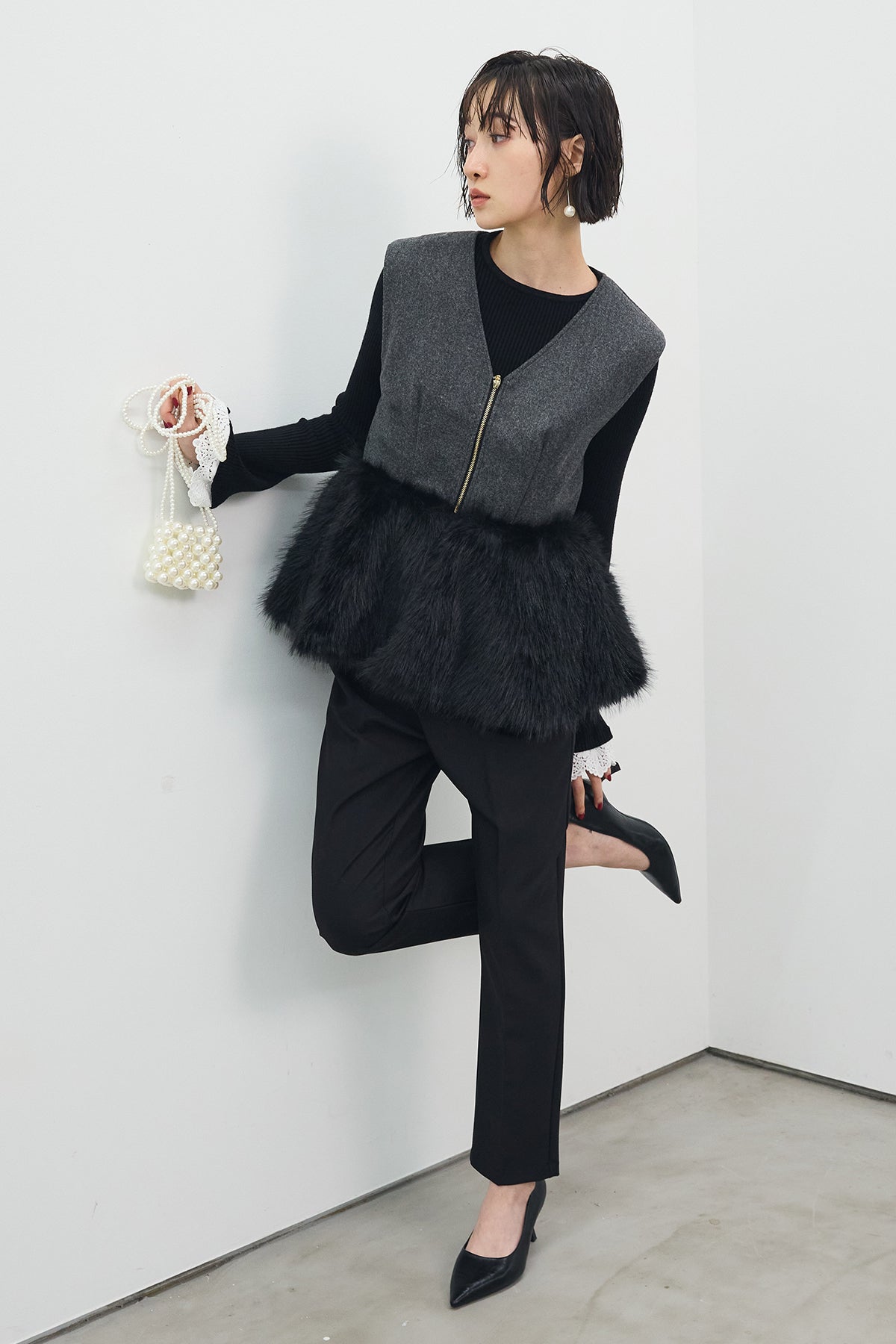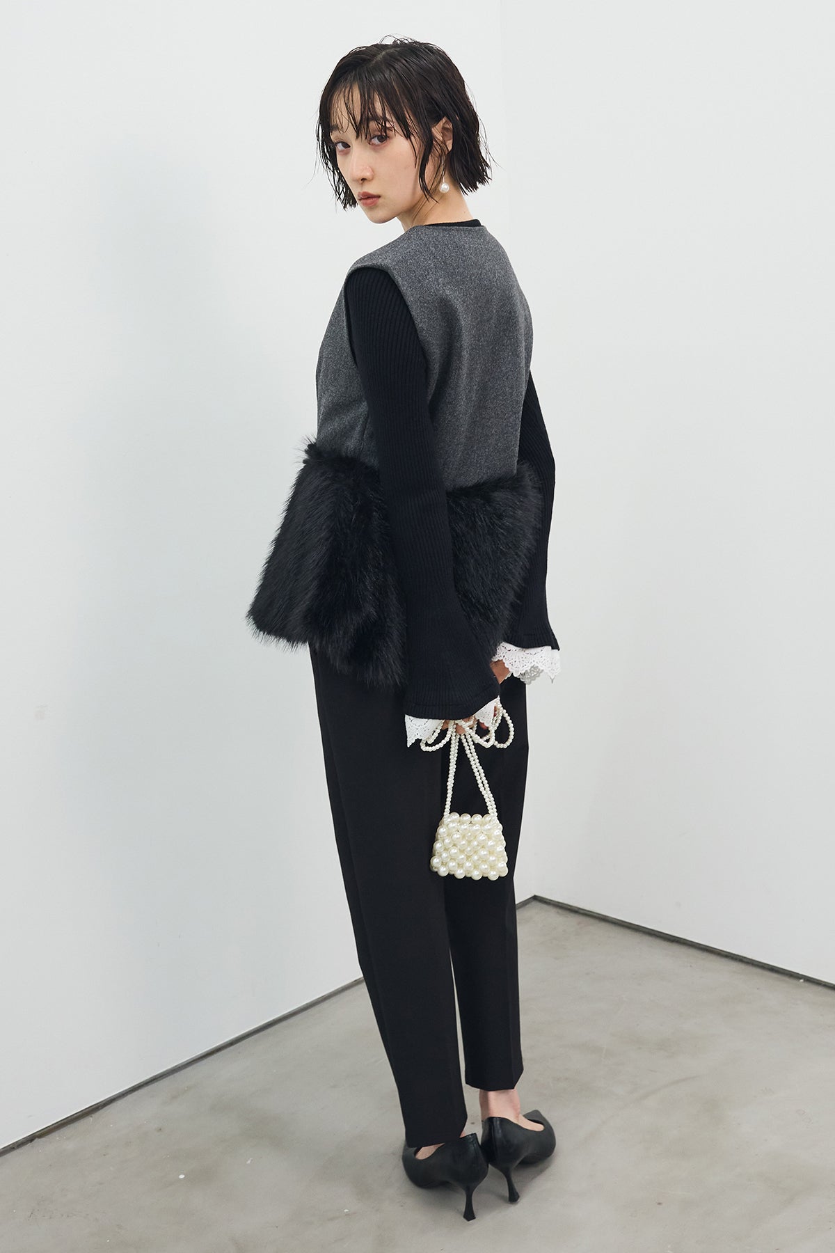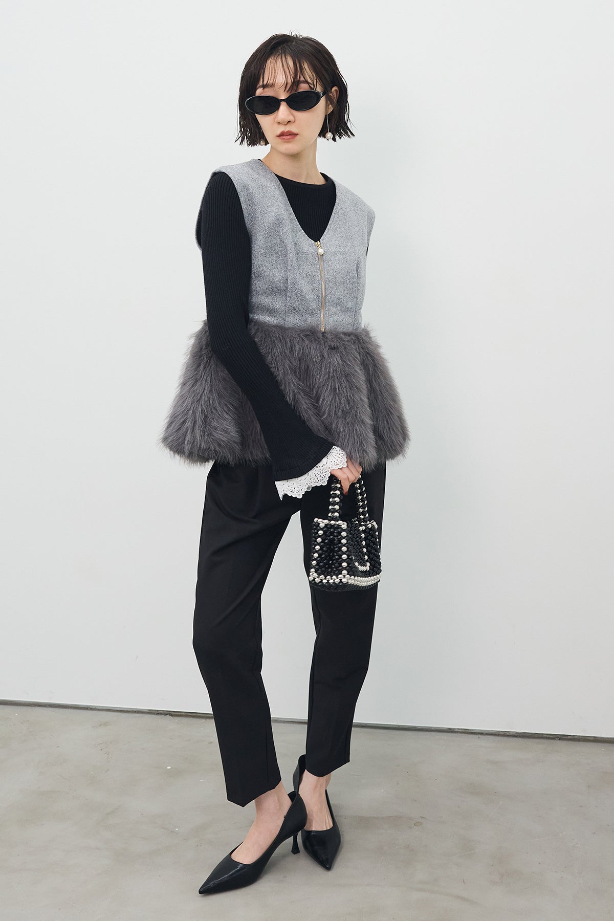 [予約/SET]フレアレースカフスリブニット+フェイクファードッキングZIPベスト+タックテーパードパンツ(3set)