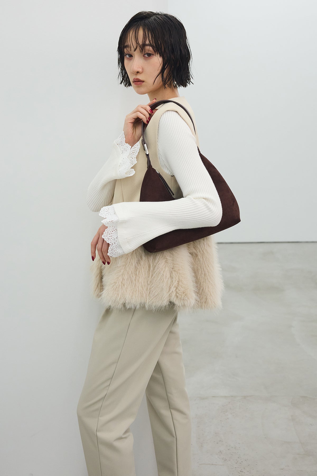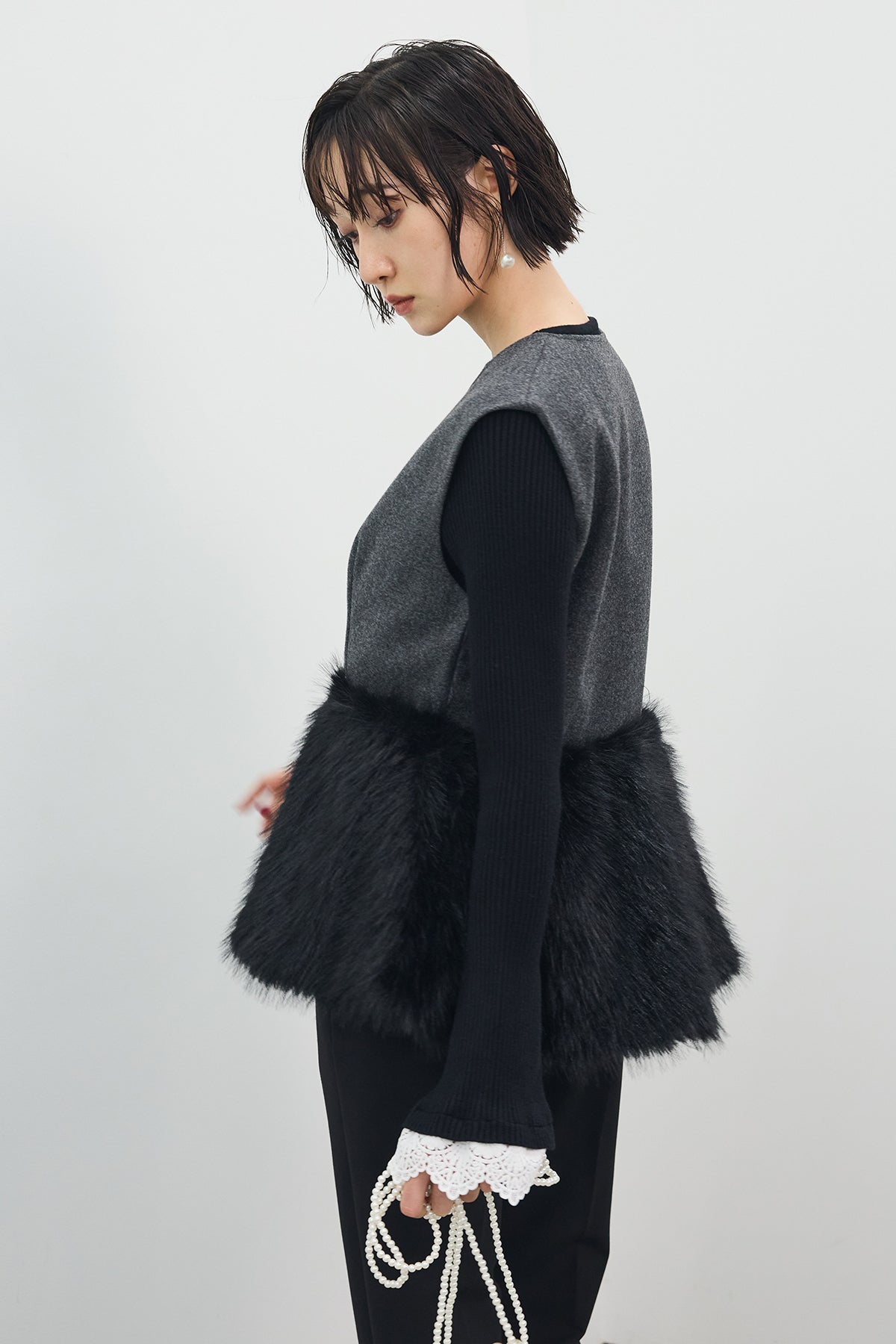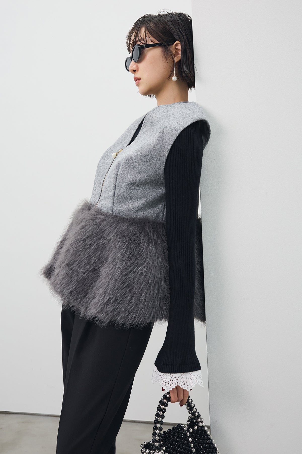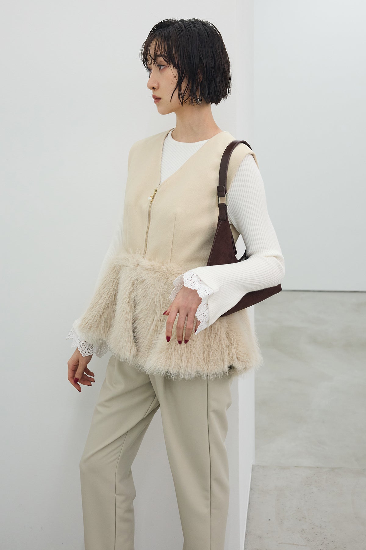 [予約/SET]フレアレースカフスリブニット+フェイクファードッキングZIPベスト+タックテーパードパンツ(3set)