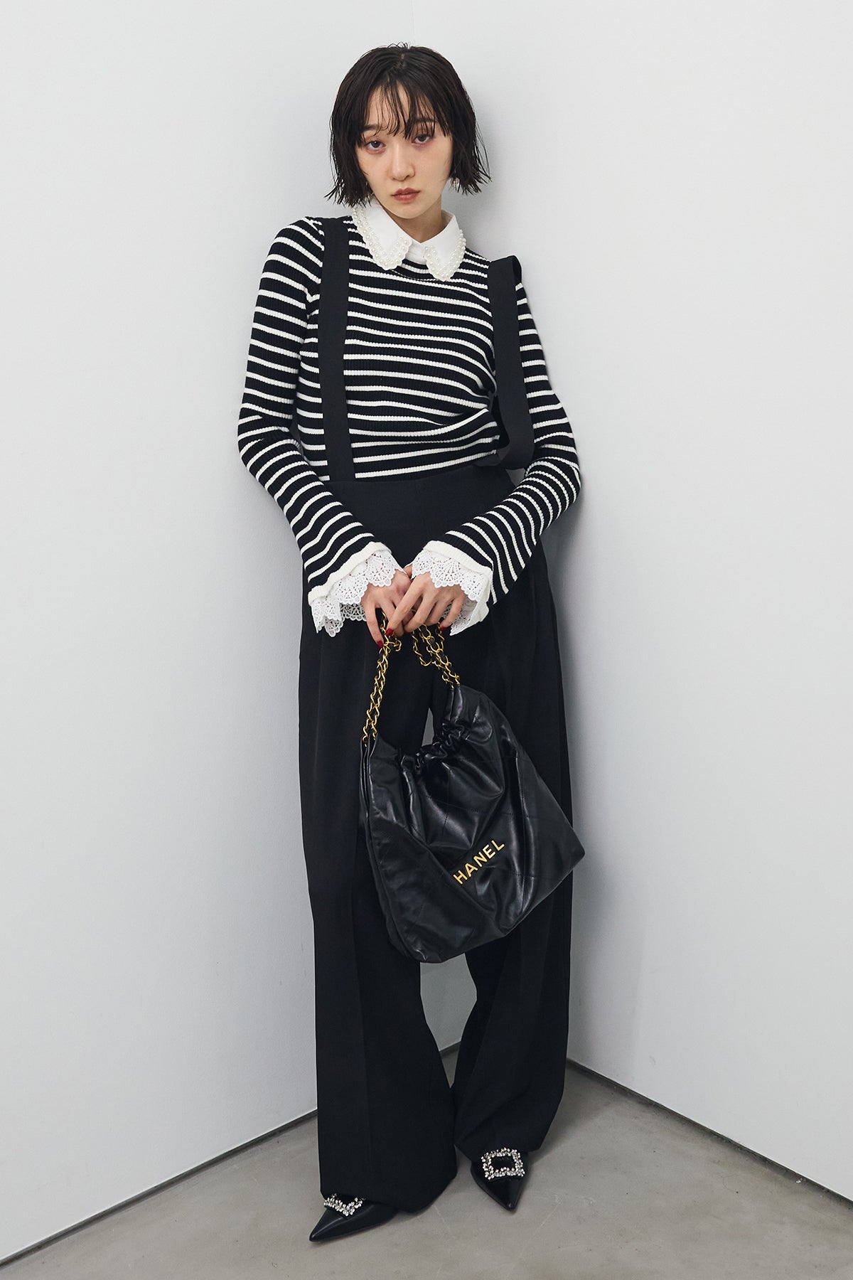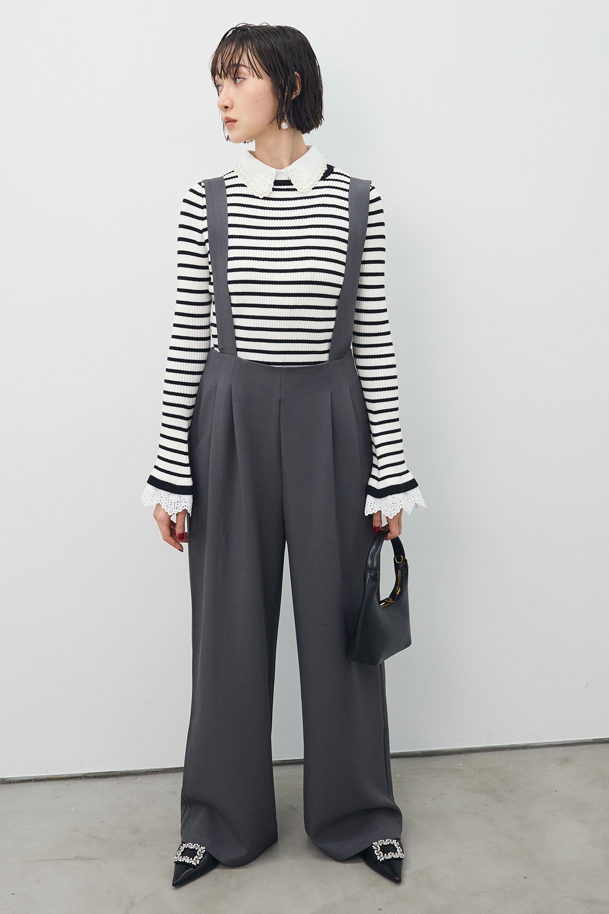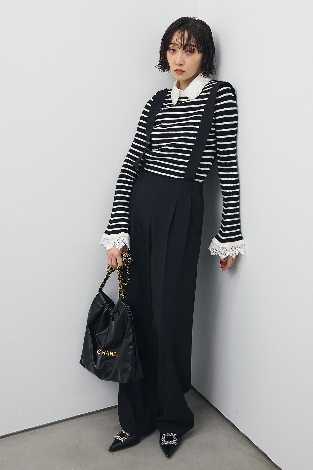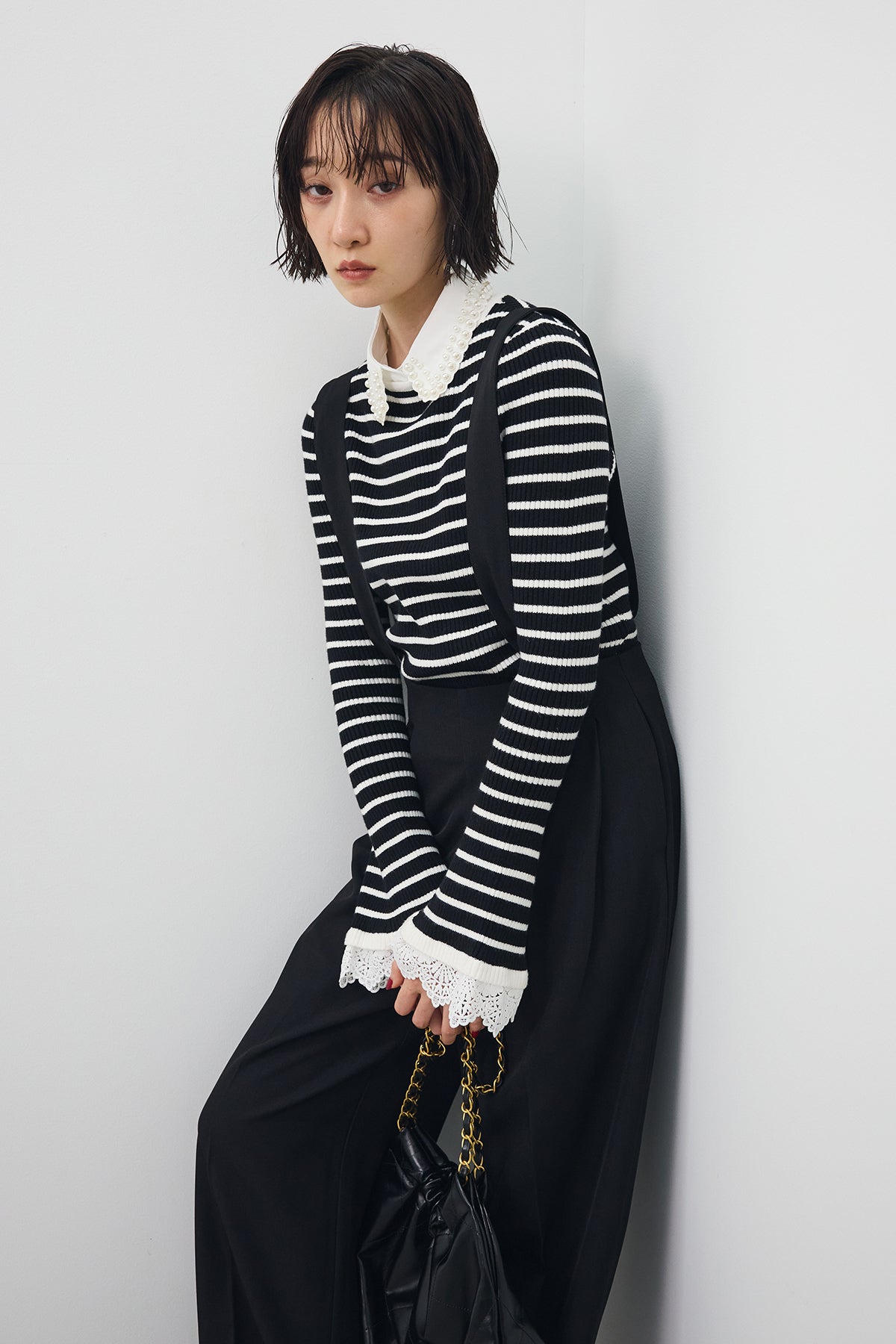 [予約/SET]フレアレースカフスリブニット+2連パール付け襟+とろみハイウエストサロペ(3set)