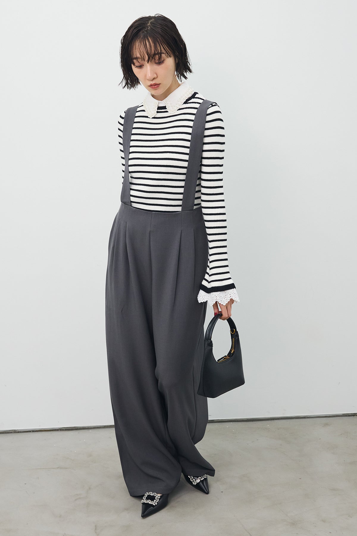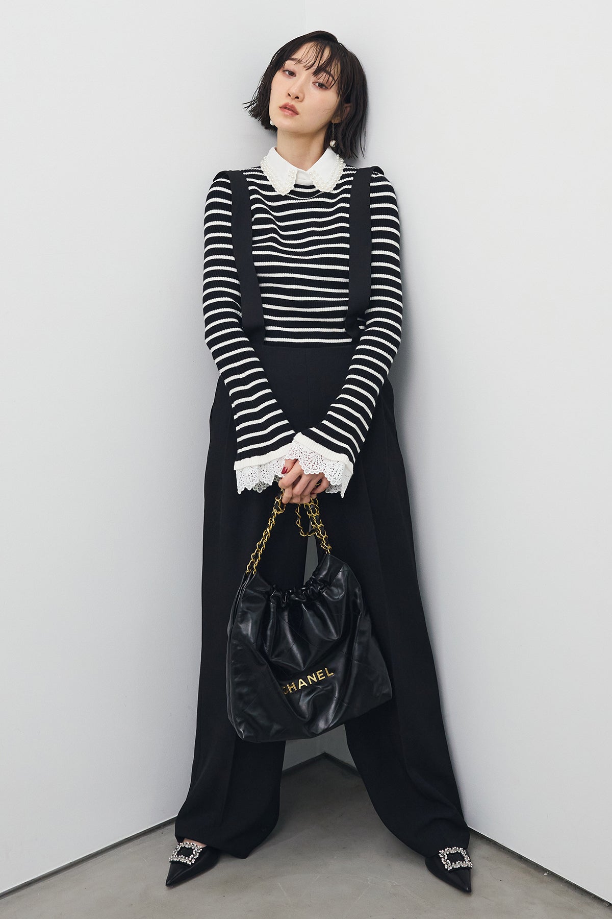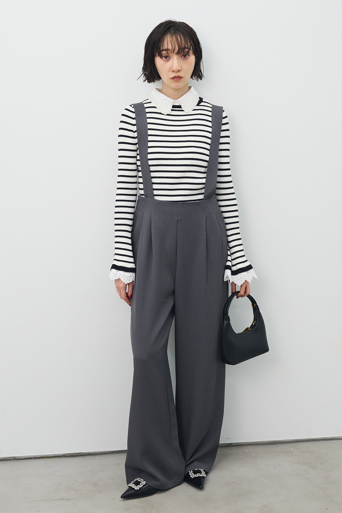 [予約/SET]フレアレースカフスリブニット+2連パール付け襟+とろみハイウエストサロペ(3set)