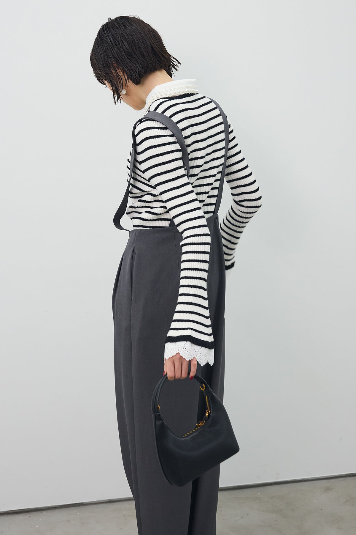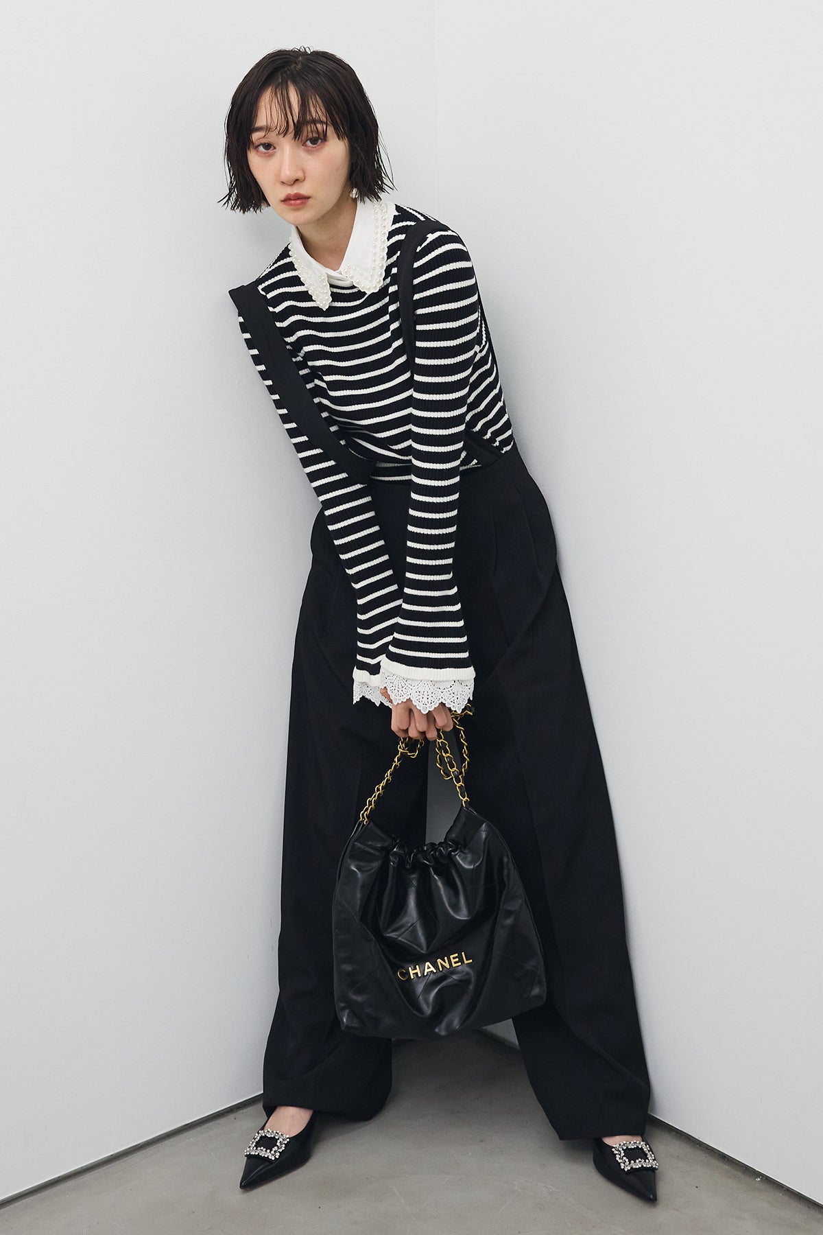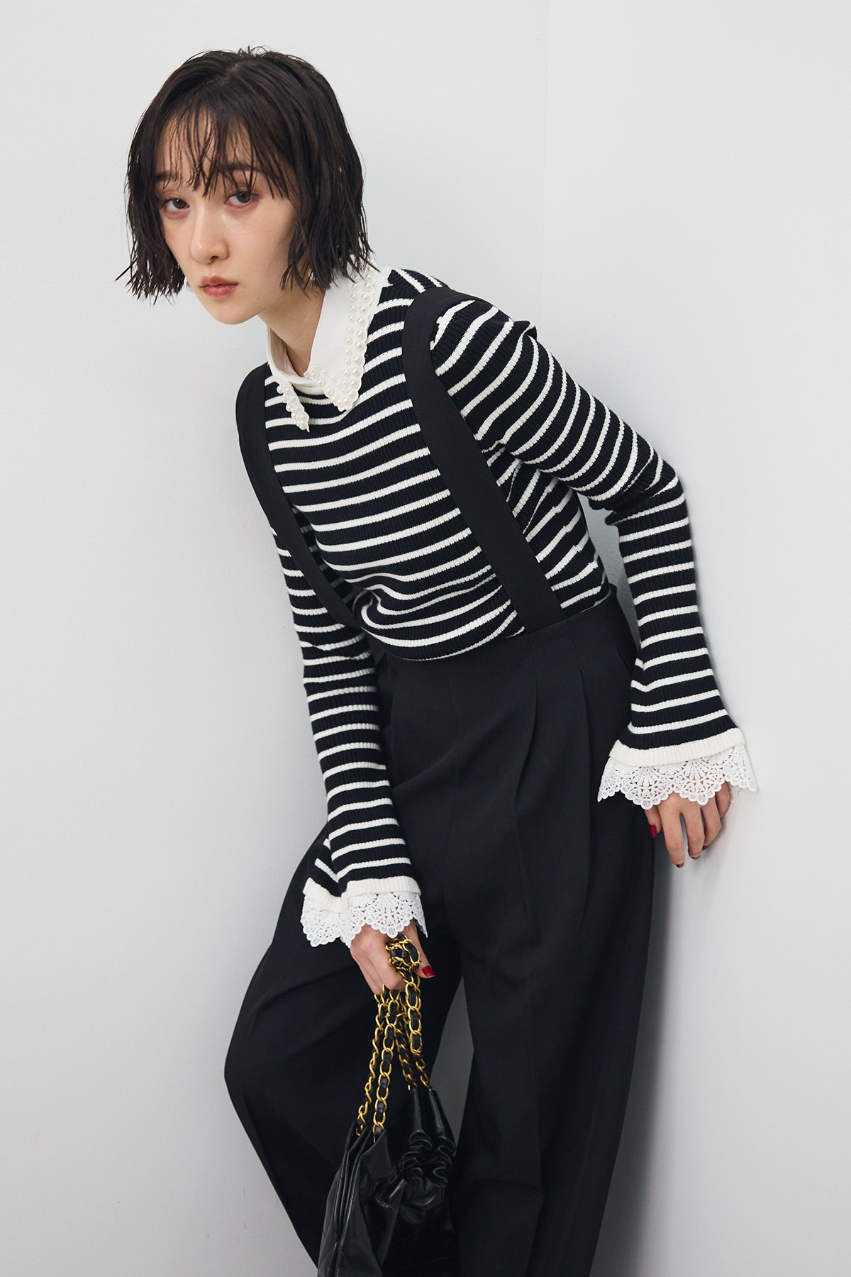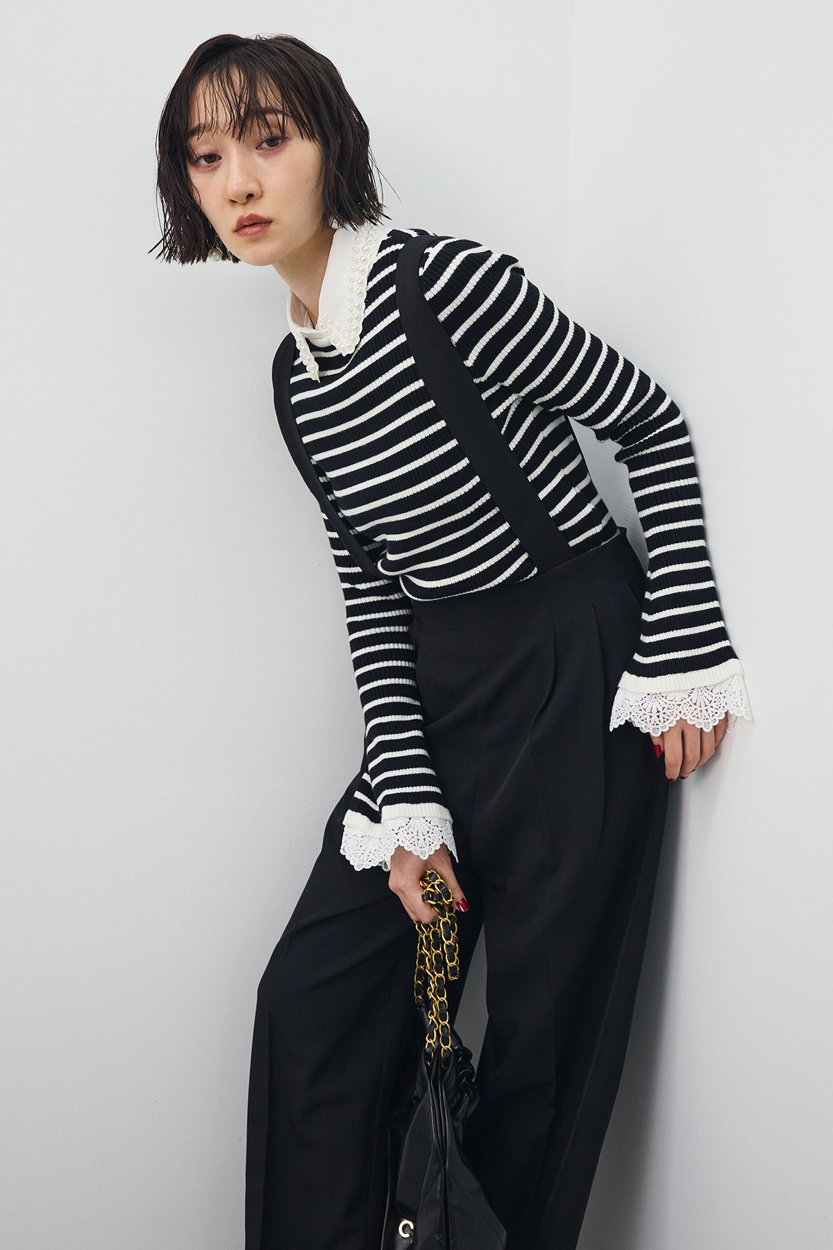 [予約/SET]フレアレースカフスリブニット+2連パール付け襟+とろみハイウエストサロペ(3set)