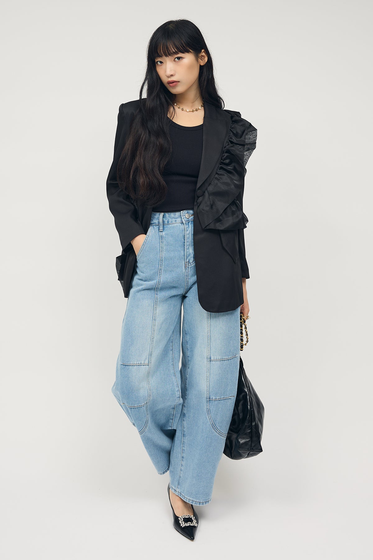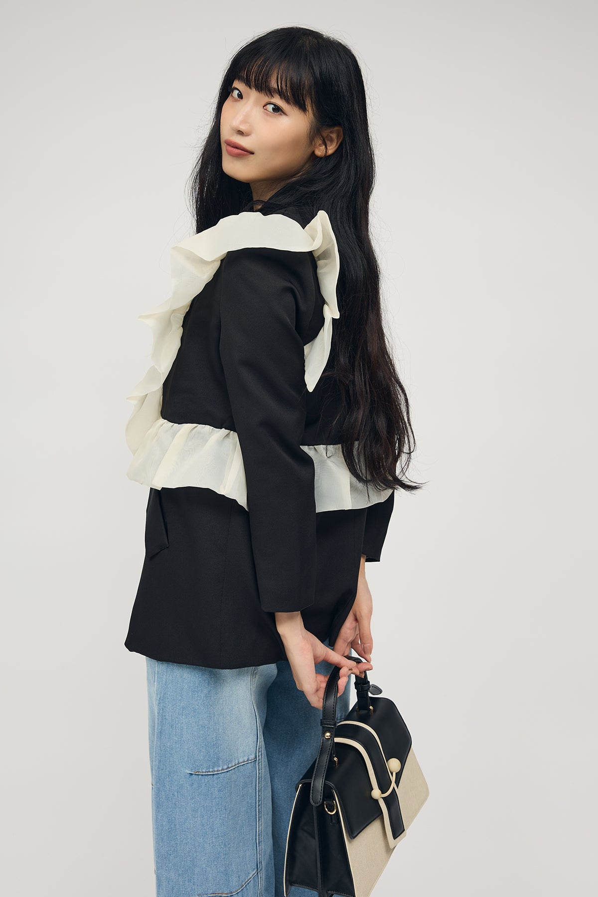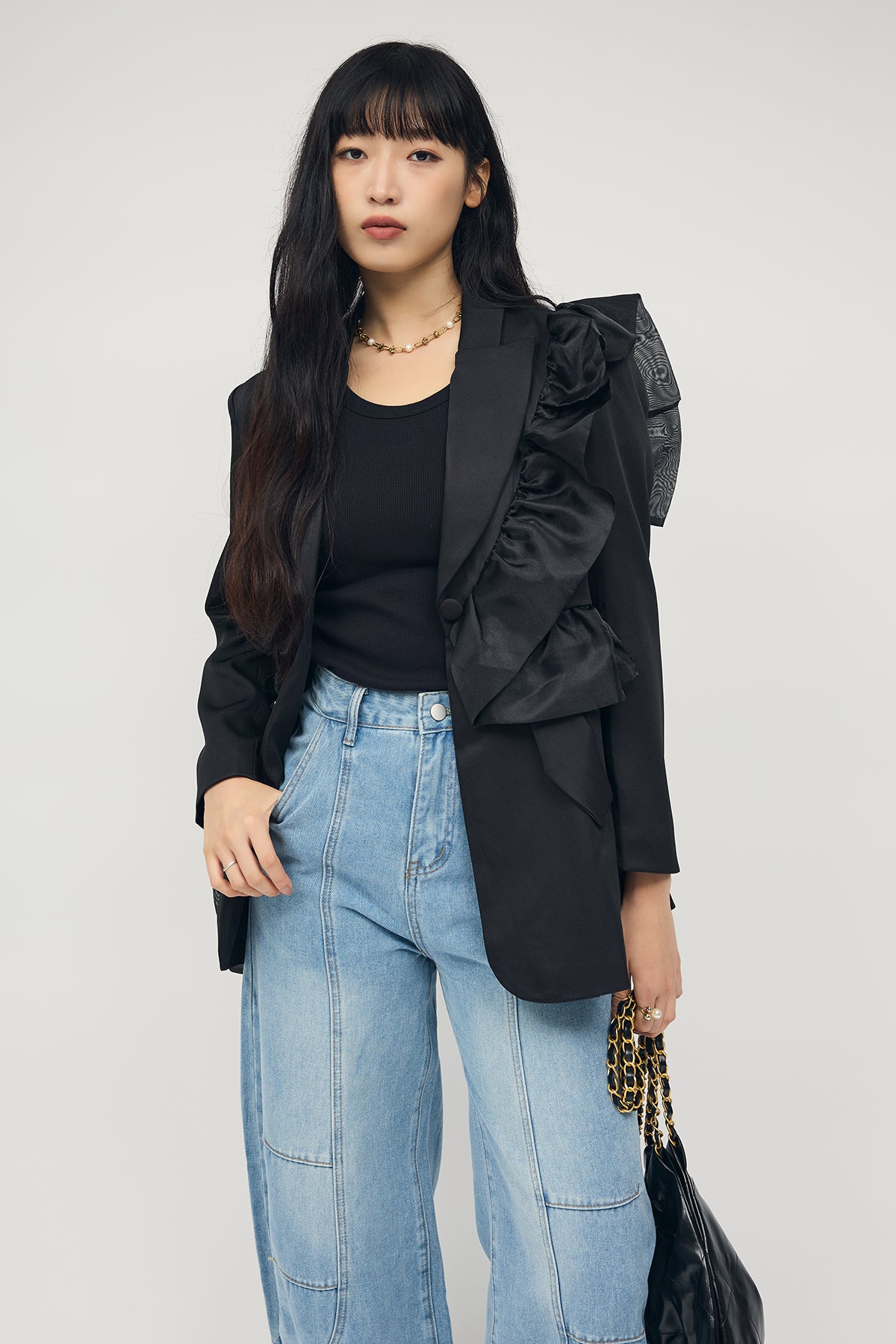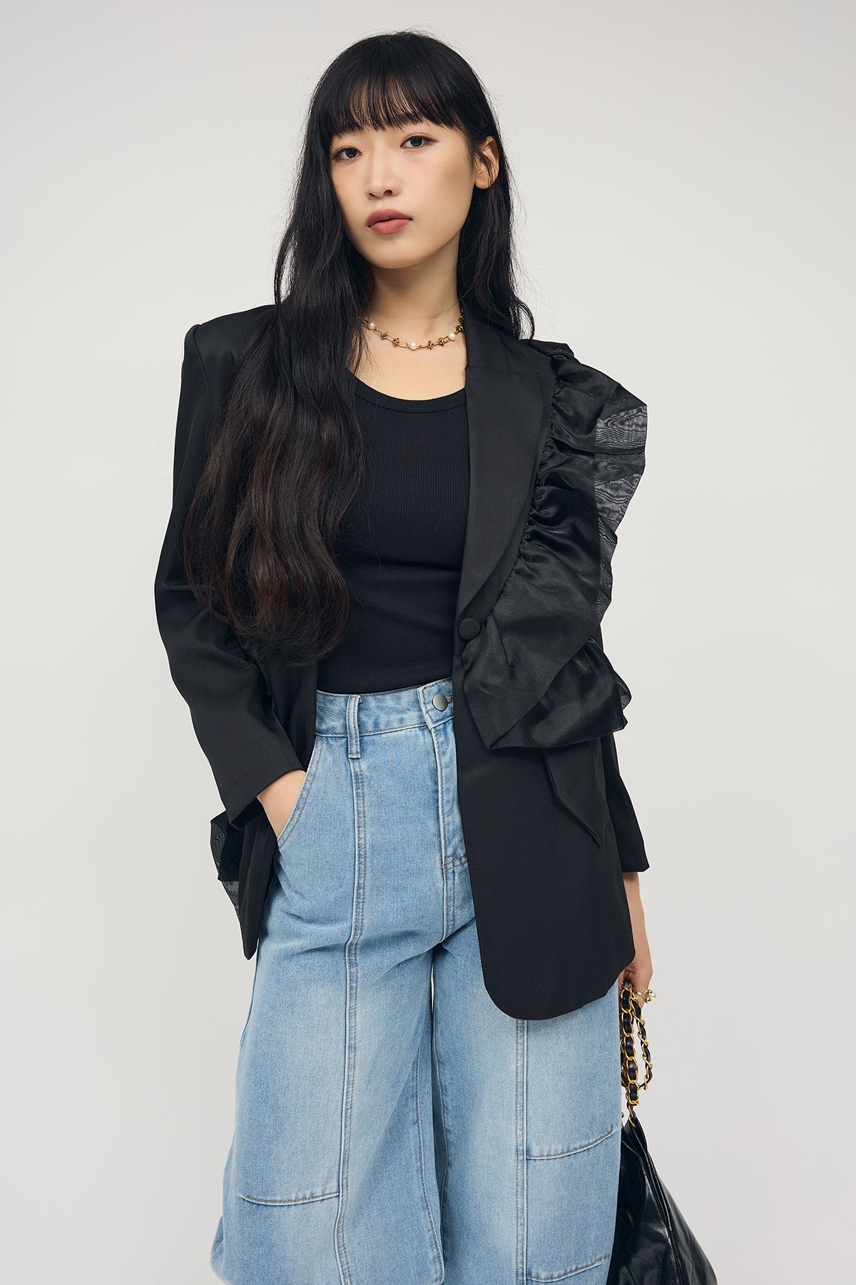 [予約/SET]アシメフリルマニッシュジャケット+ステッチ美ラインカーブデニムパンツ(2set)