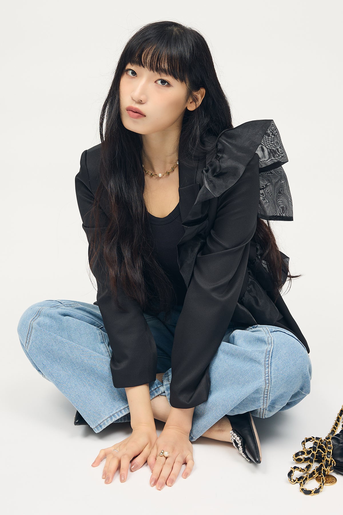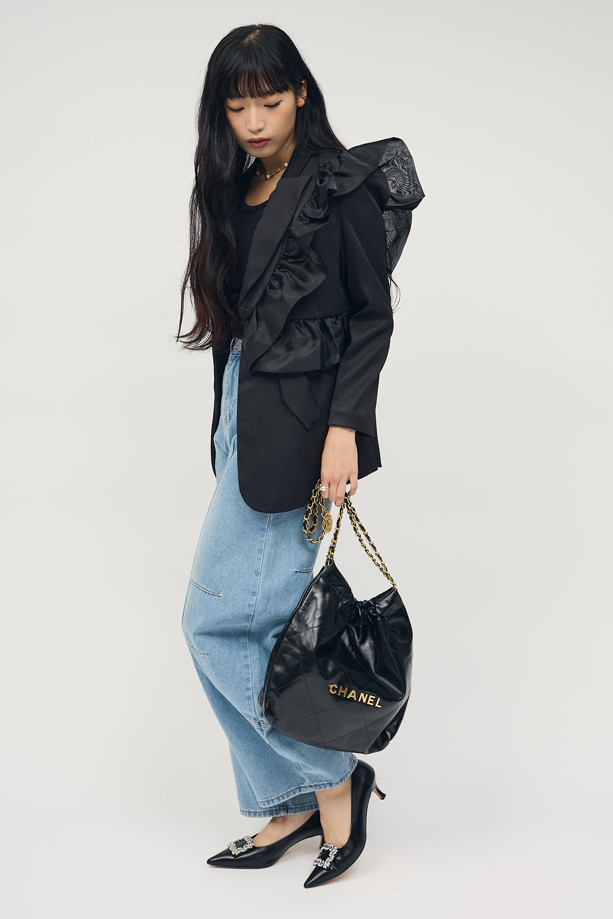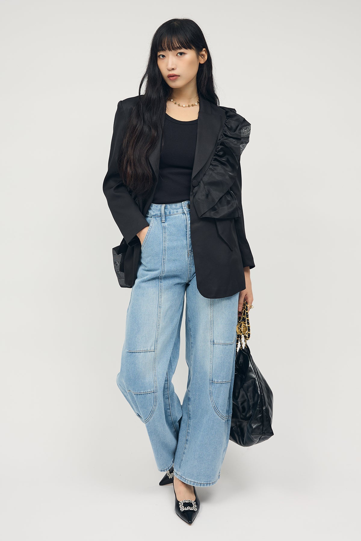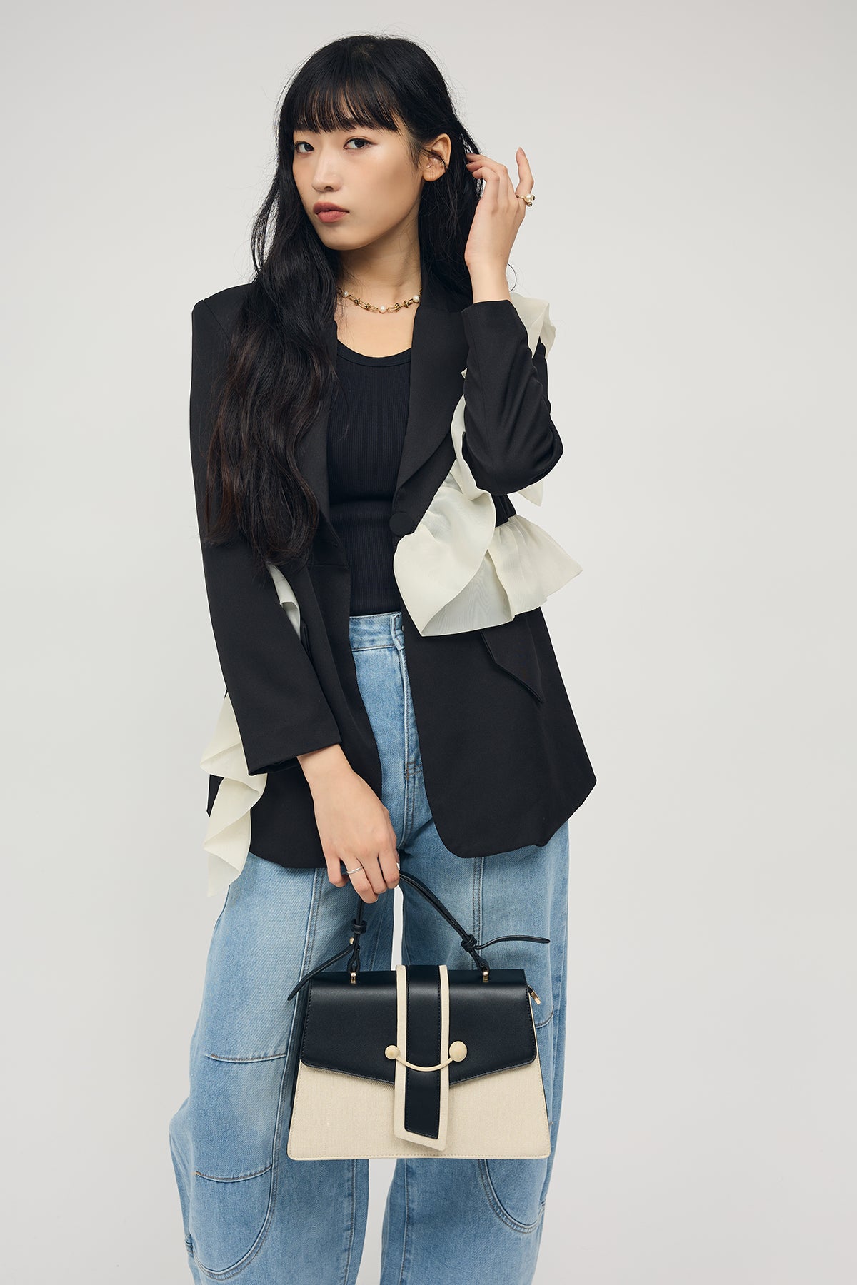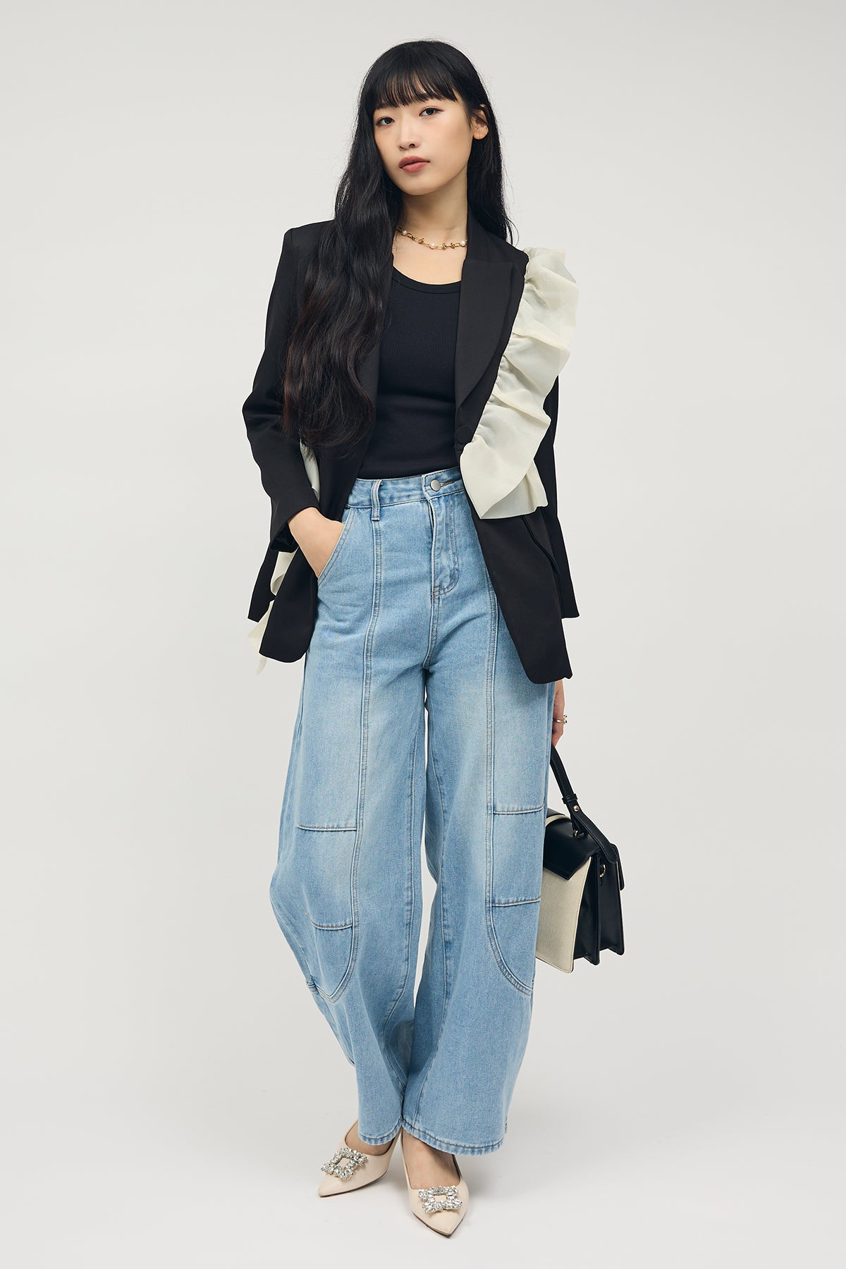 [予約/SET]アシメフリルマニッシュジャケット+ステッチ美ラインカーブデニムパンツ(2set)