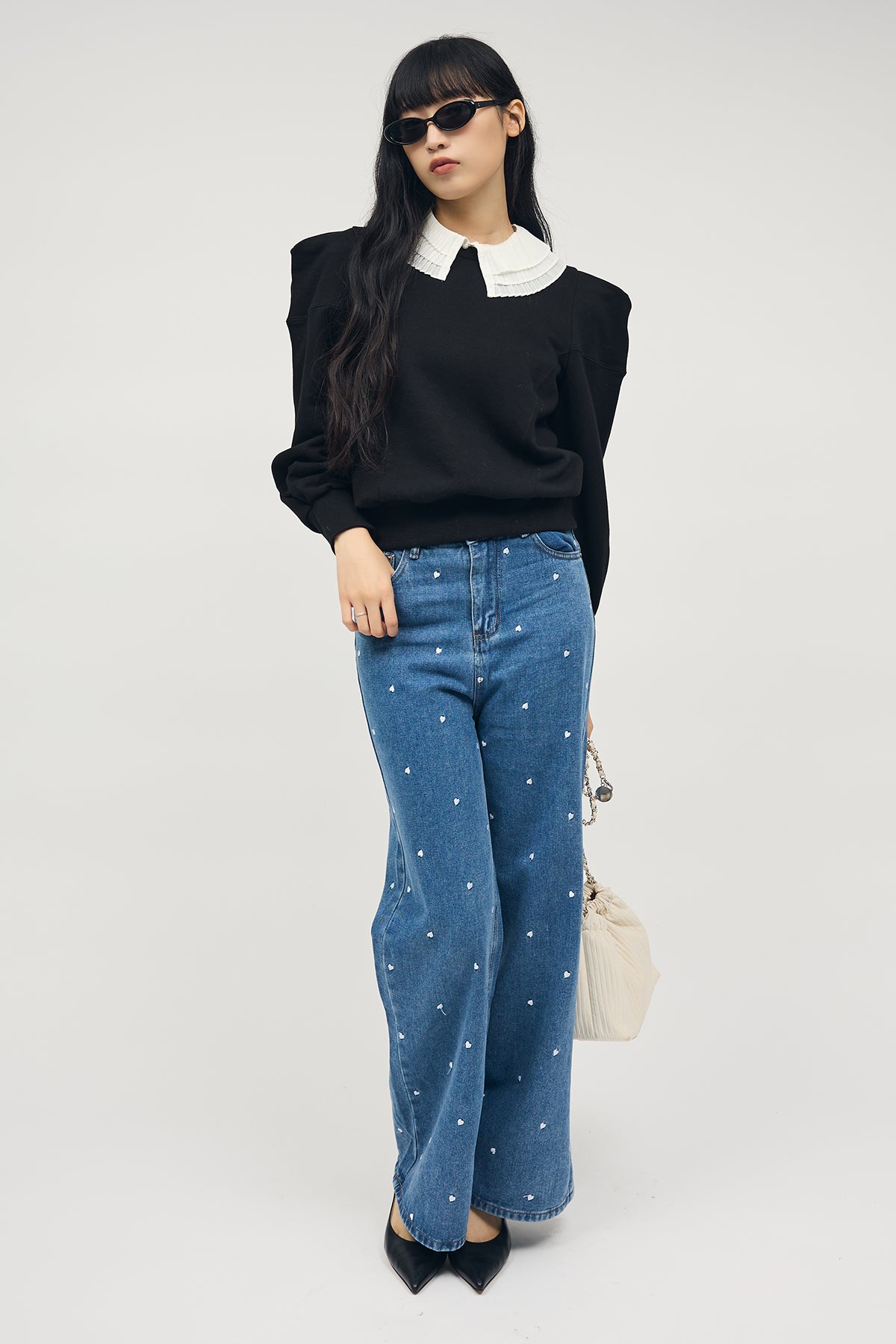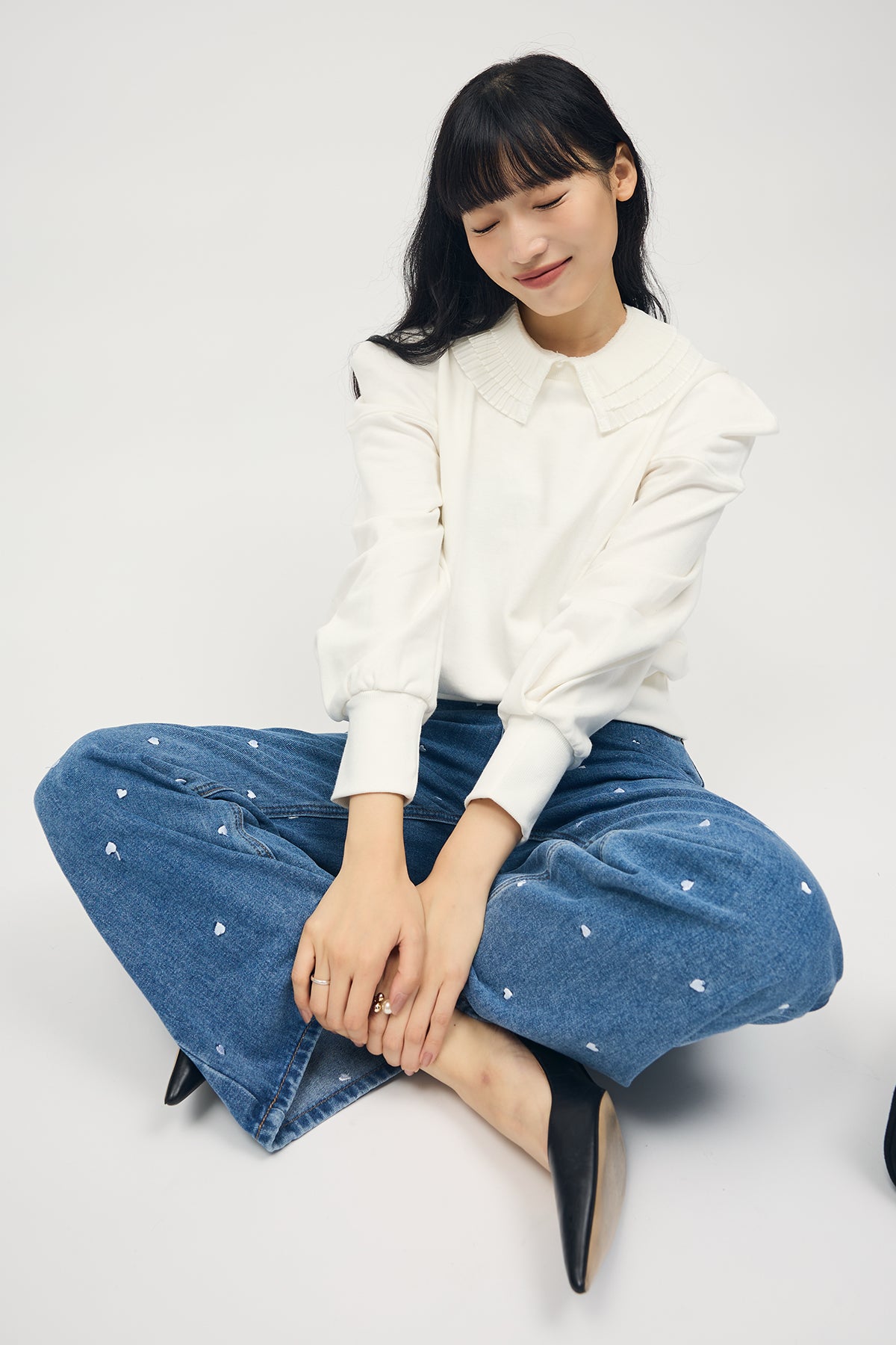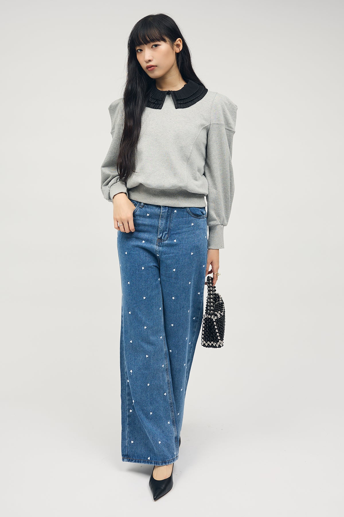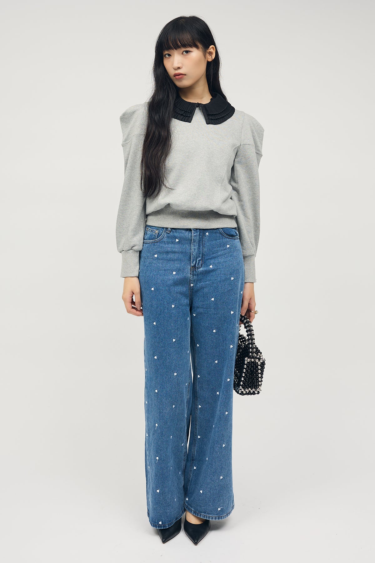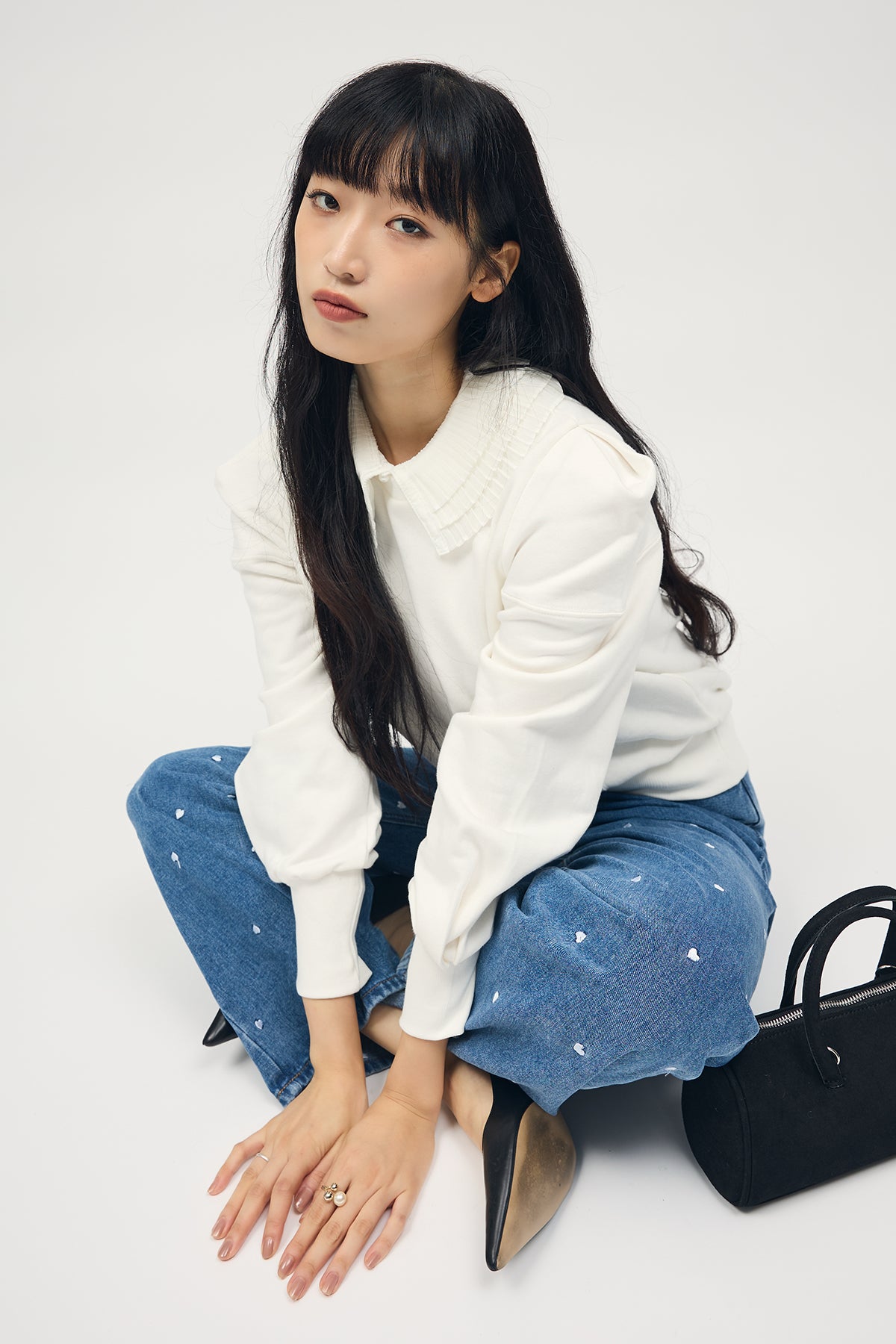 [予約/SET]プリーツレース付け襟+パワショルスウェットPO+ハート刺繍ハイウエストデニムパンツ(3set)