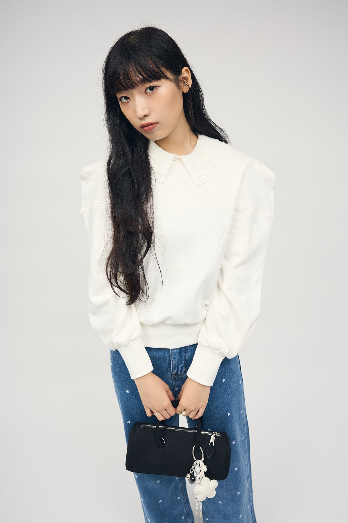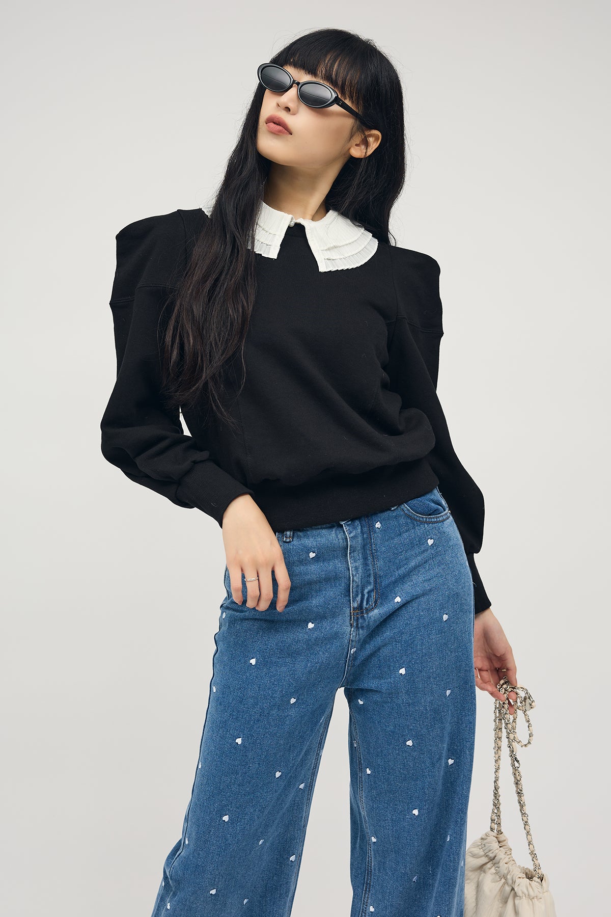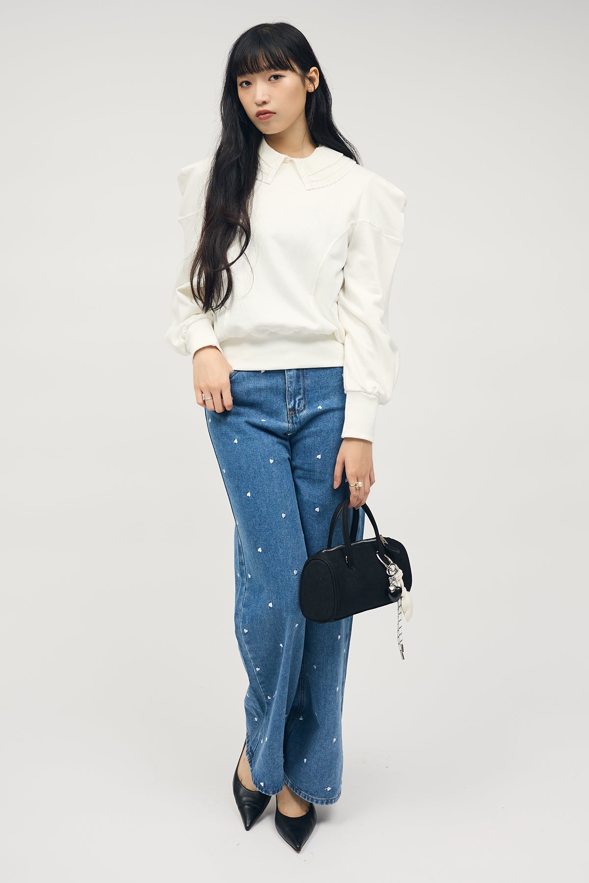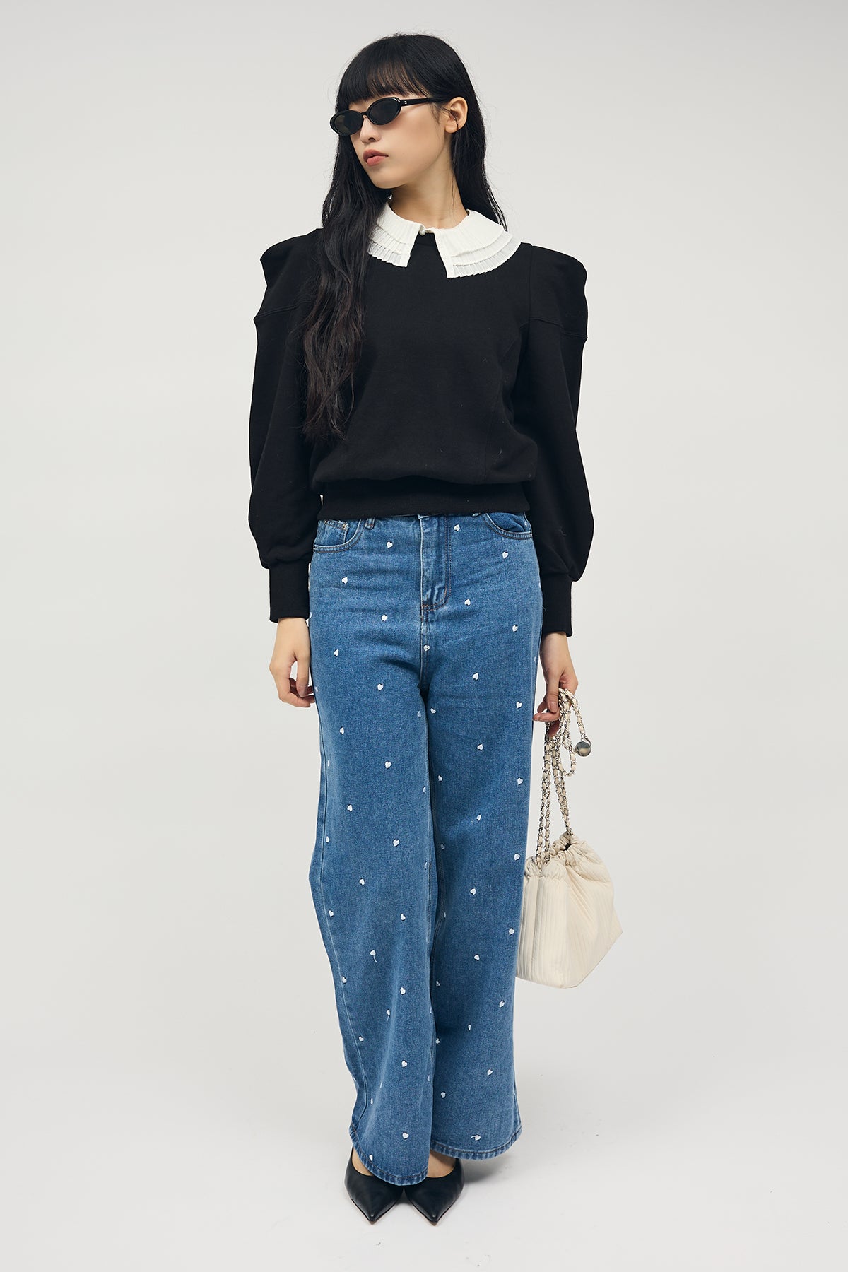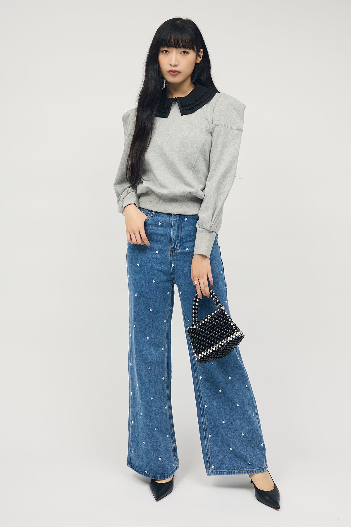 [予約/SET]プリーツレース付け襟+パワショルスウェットPO+ハート刺繍ハイウエストデニムパンツ(3set)