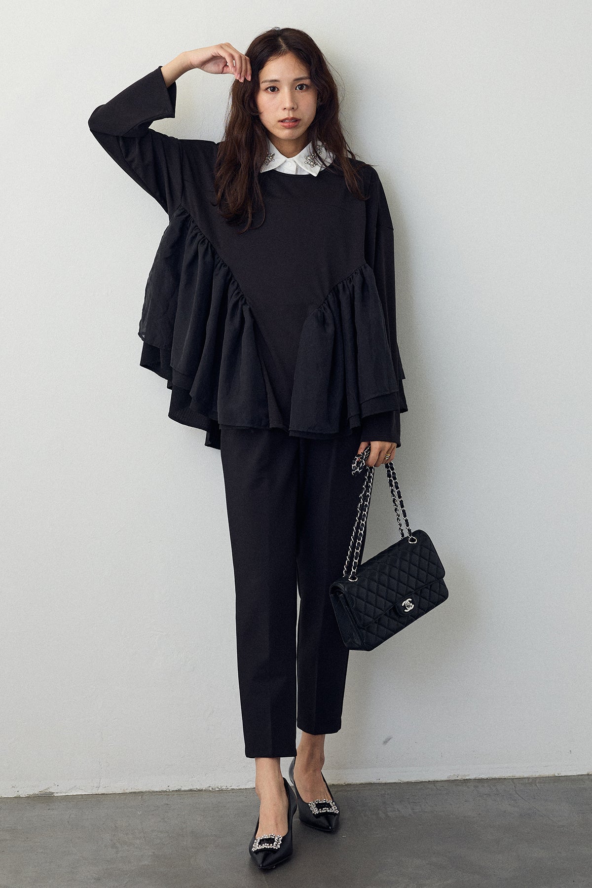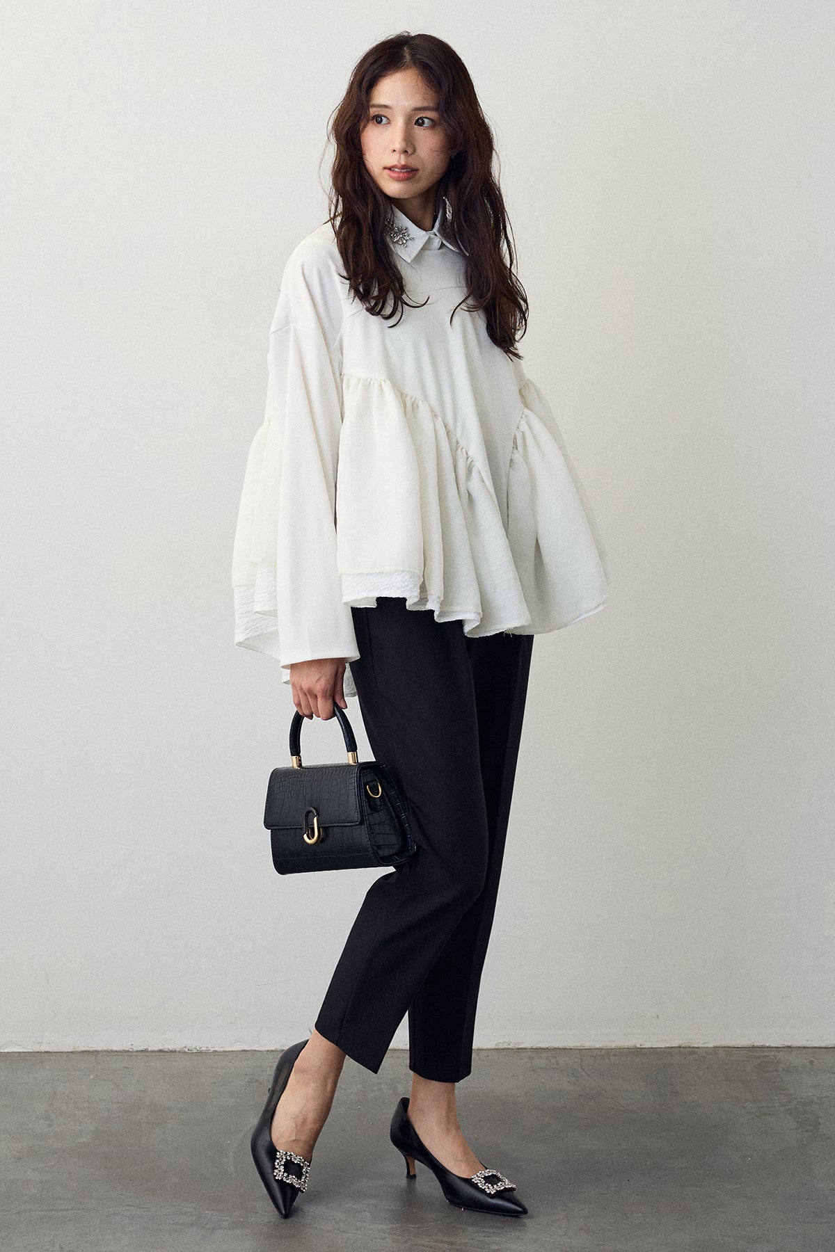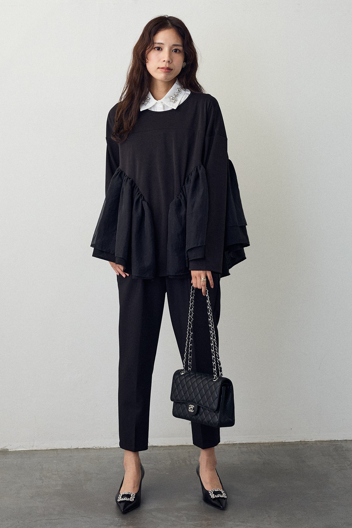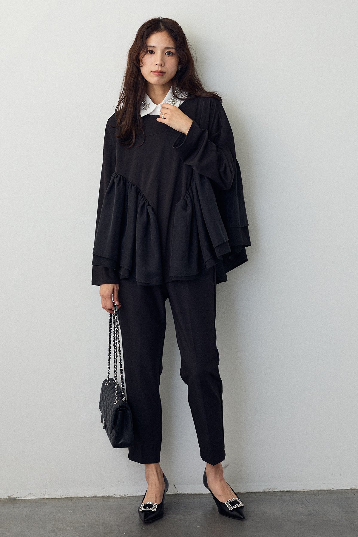 [予約/SET]ビジュー付け襟+フリルテール異素材切替チュニック+タックテーパードパンツ(3set)