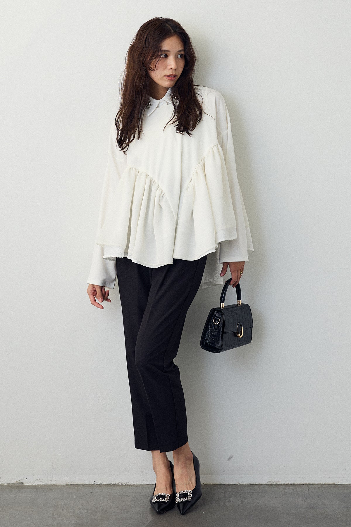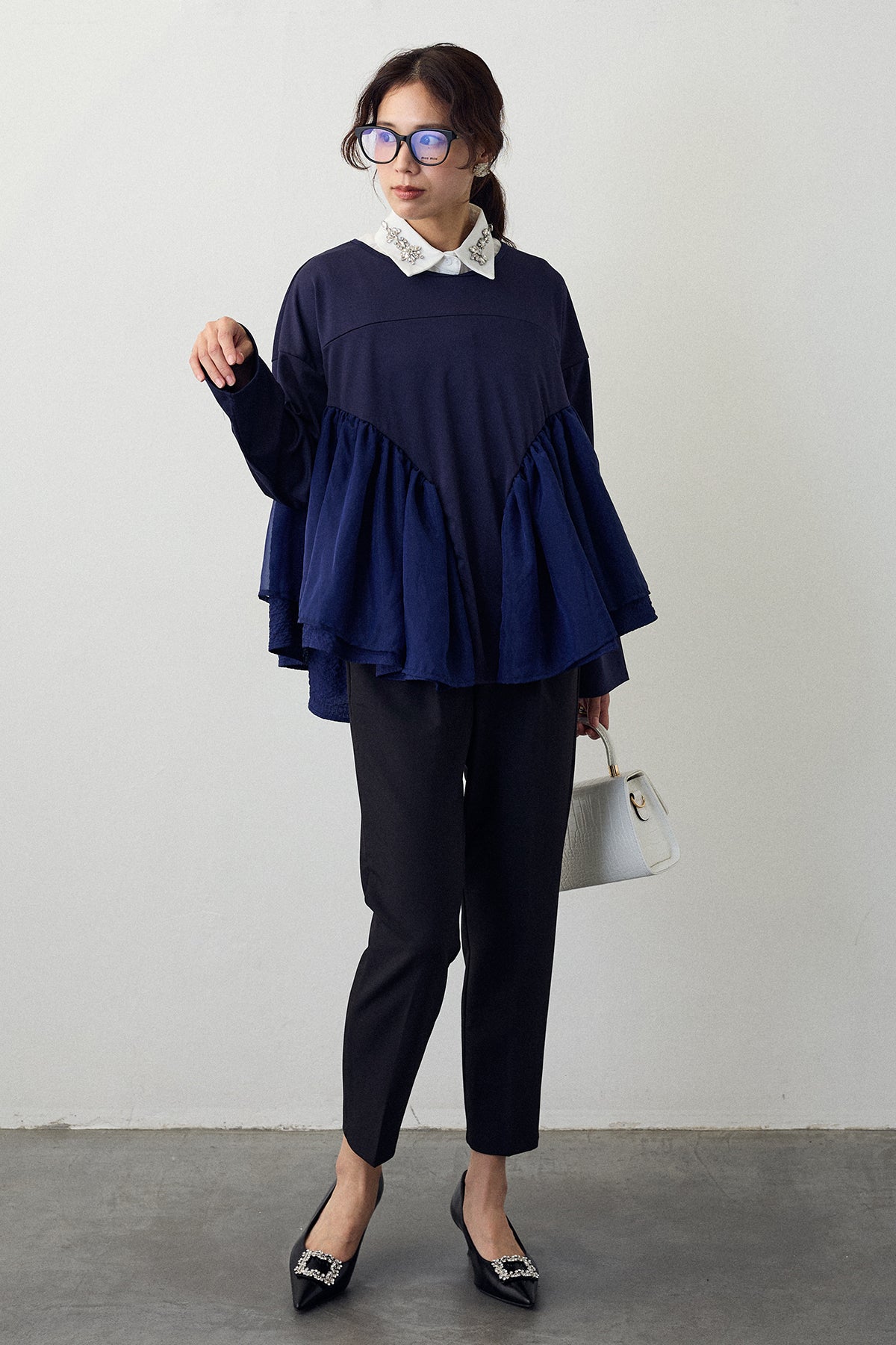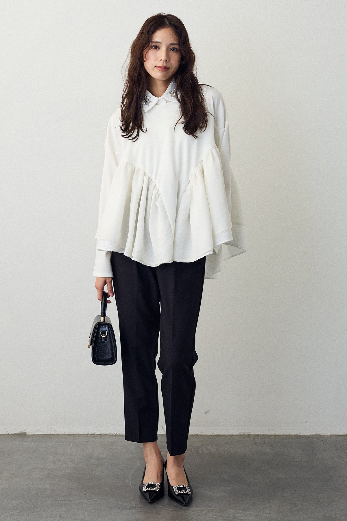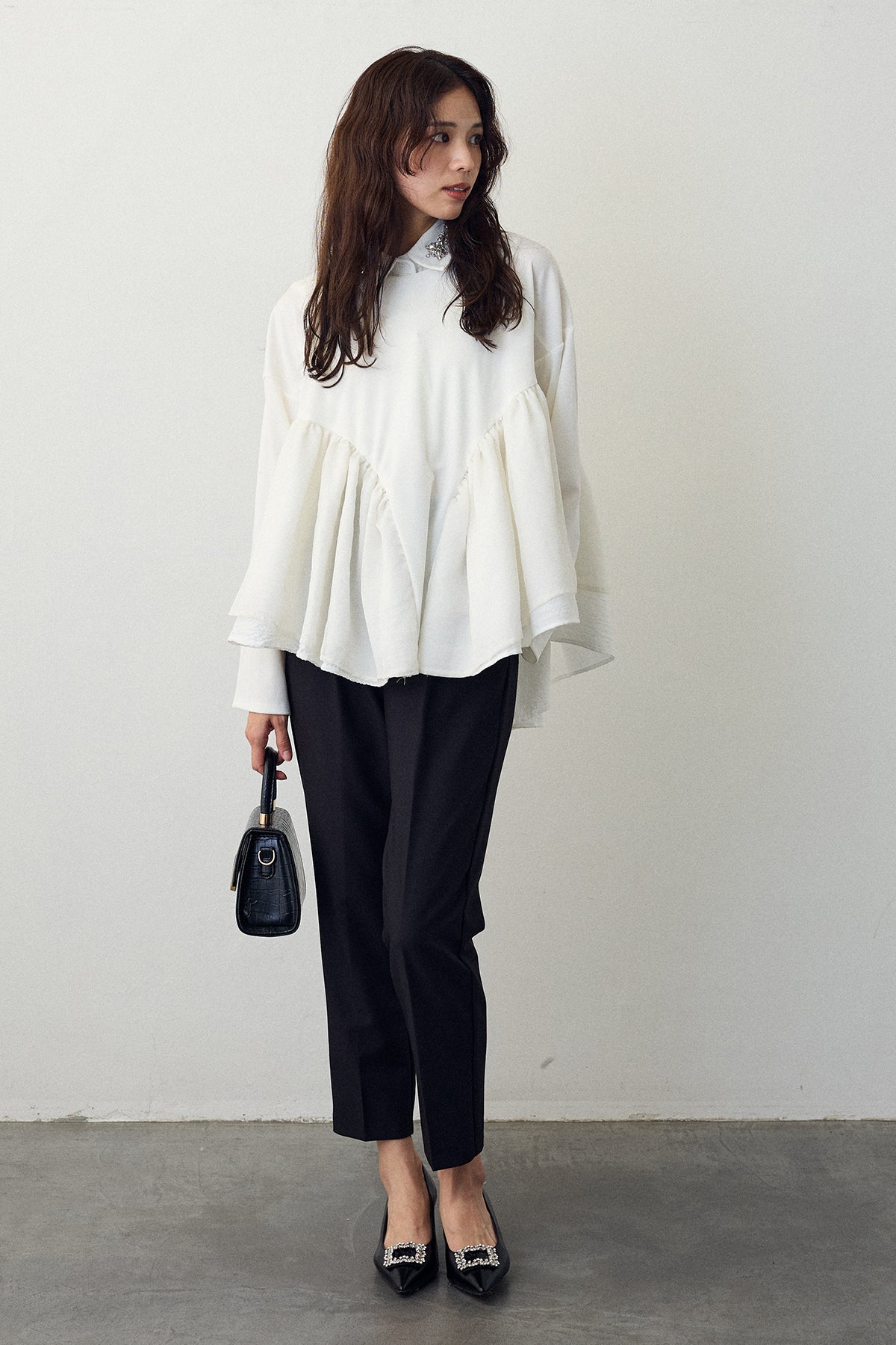 [予約/SET]ビジュー付け襟+フリルテール異素材切替チュニック+タックテーパードパンツ(3set)