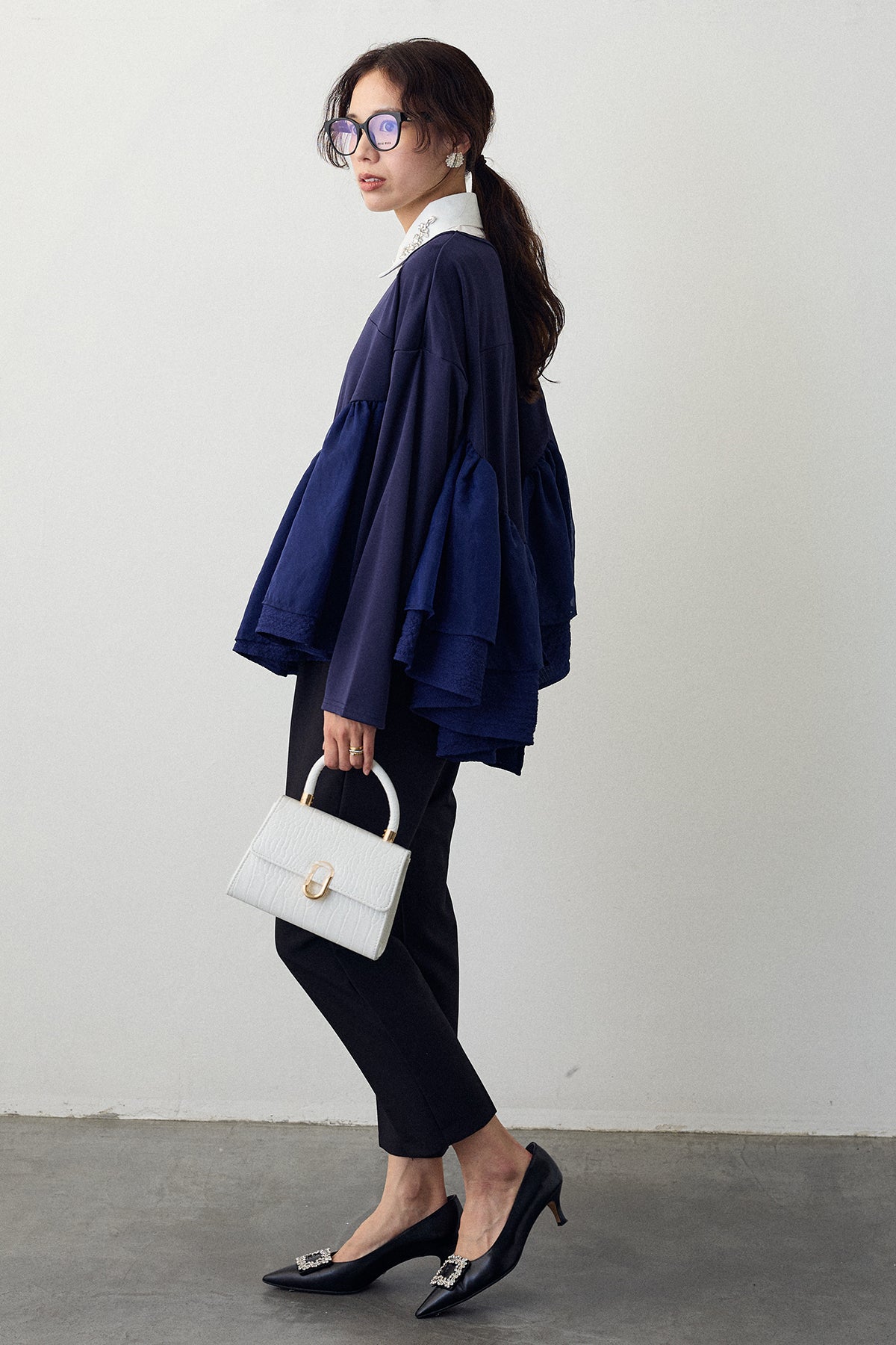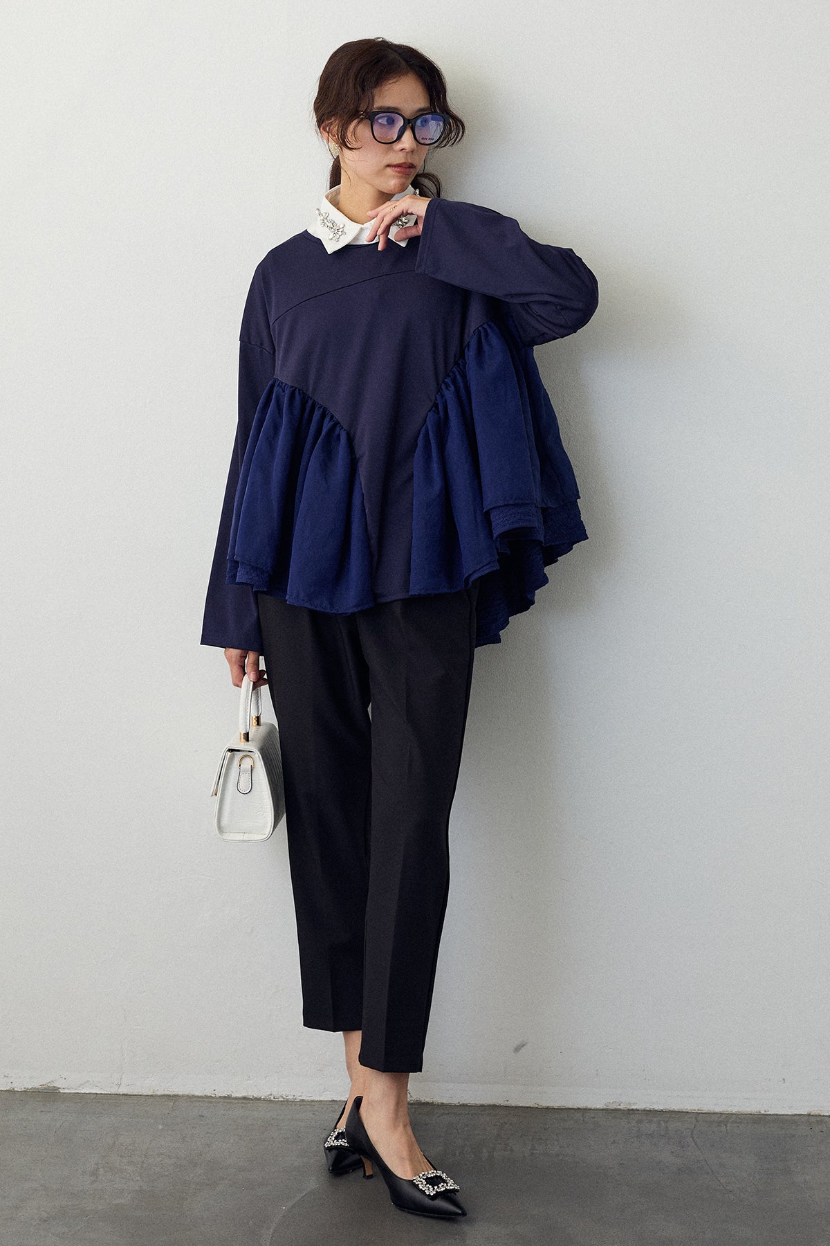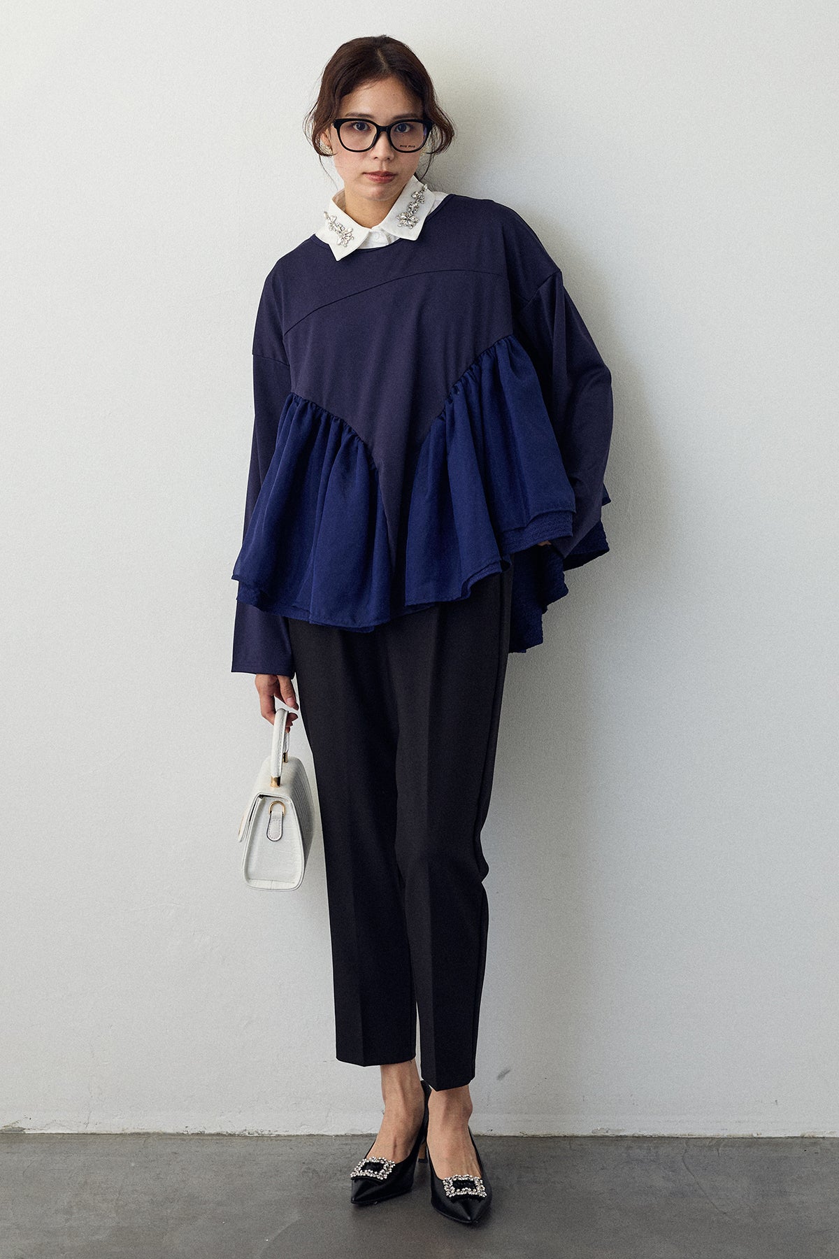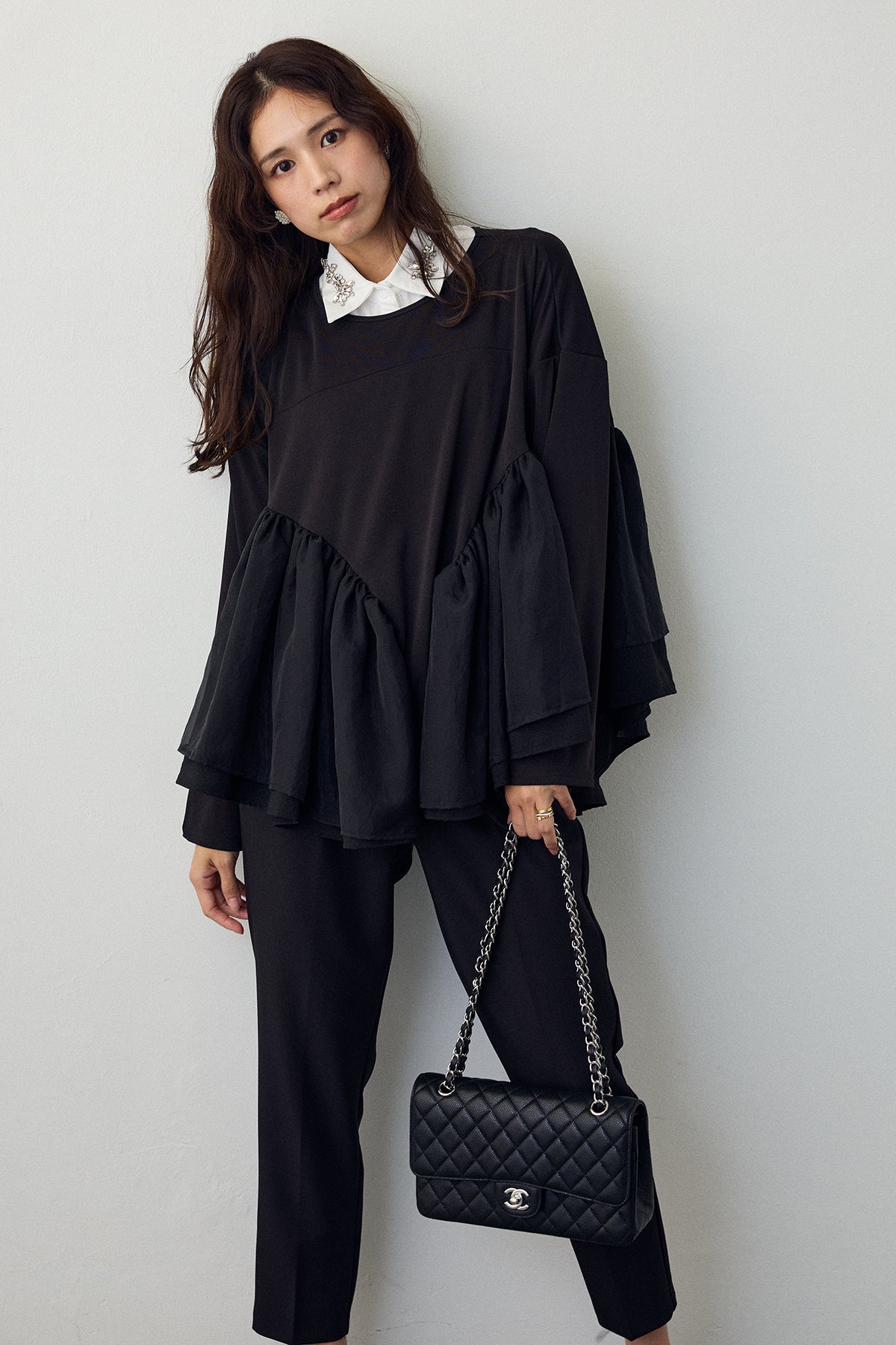 [予約/SET]ビジュー付け襟+フリルテール異素材切替チュニック+タックテーパードパンツ(3set)