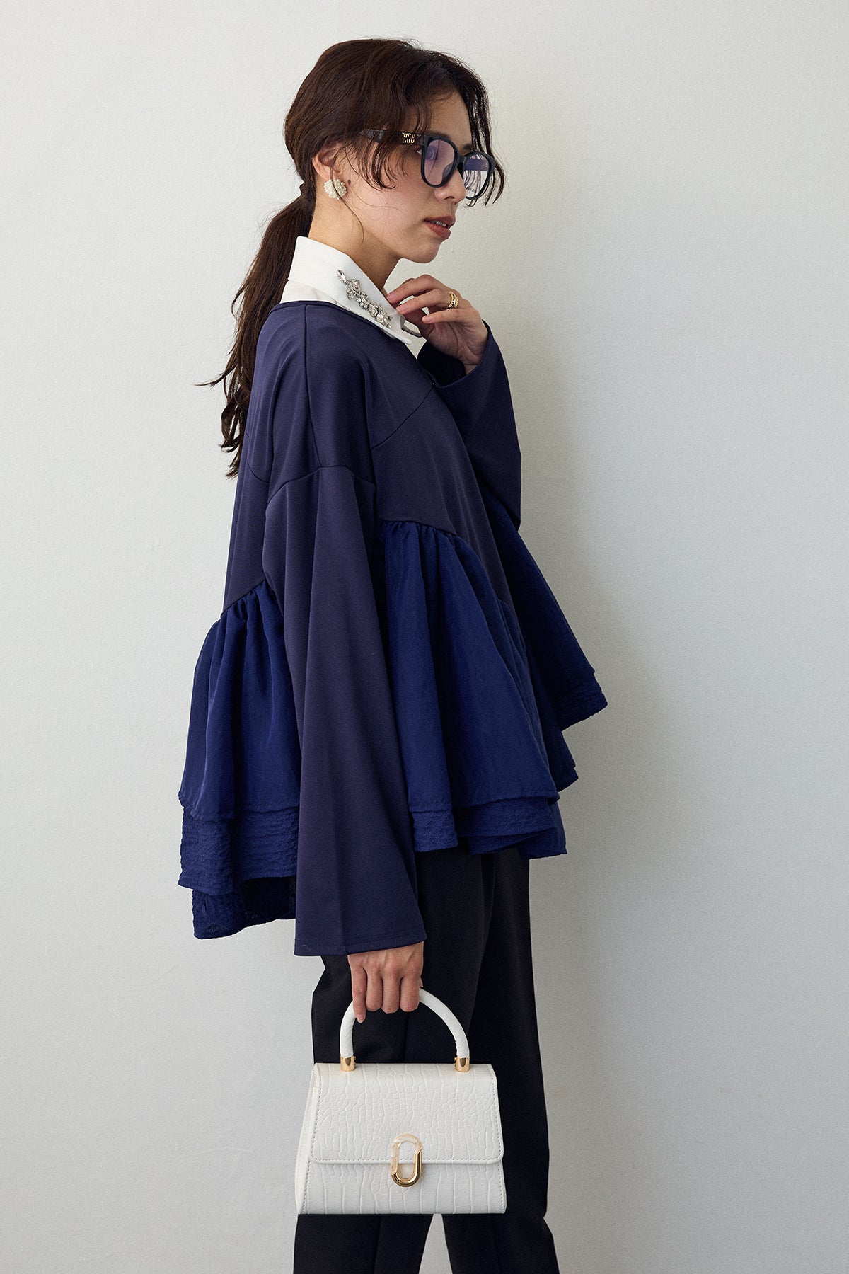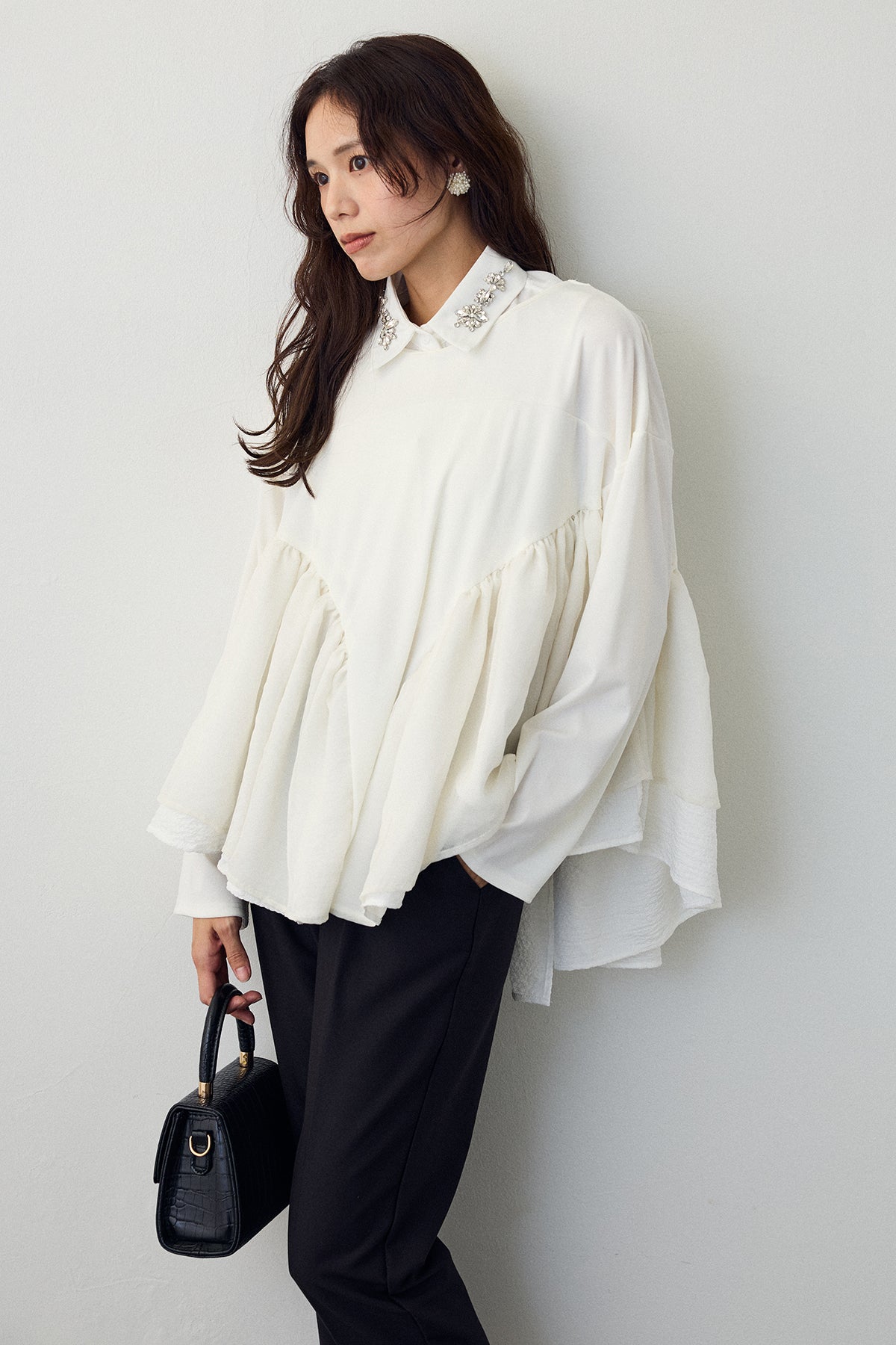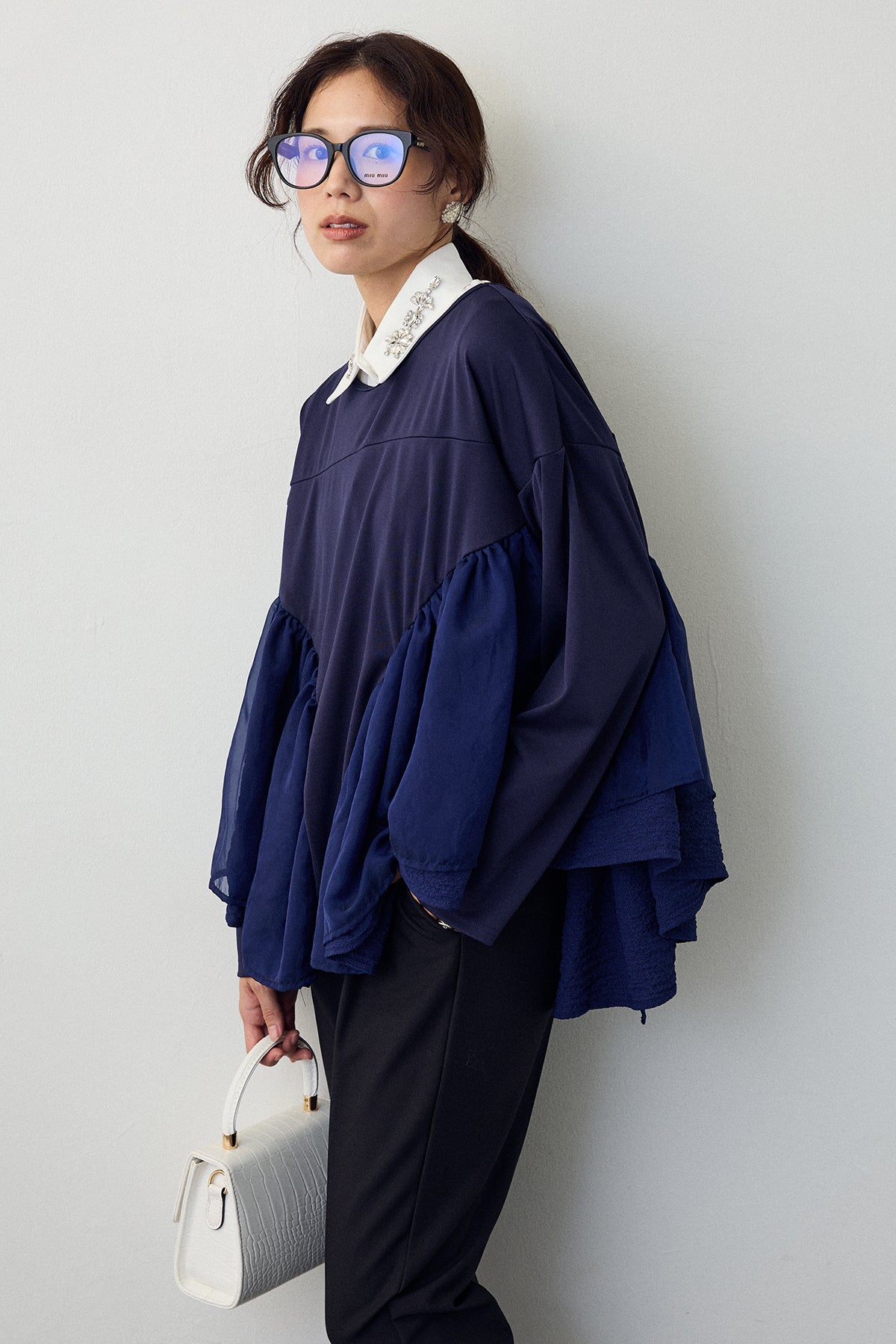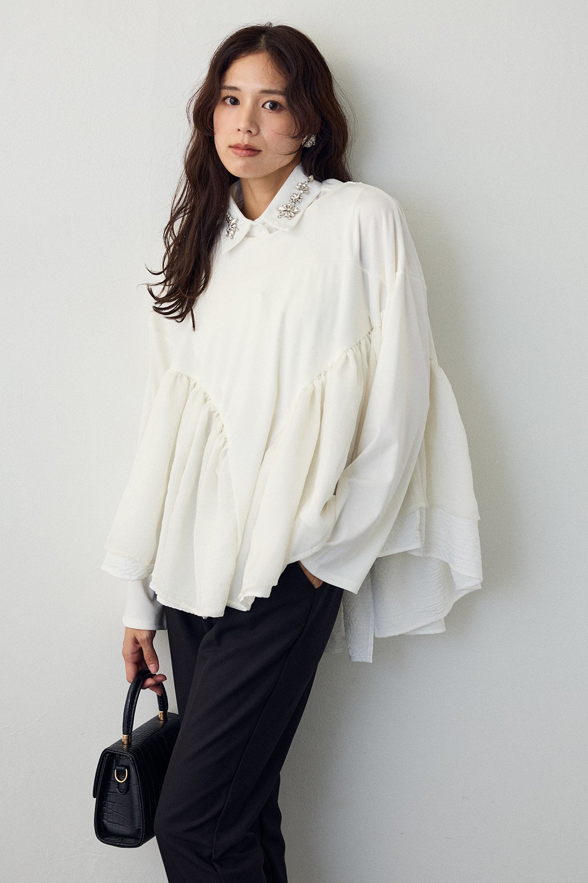 [予約/SET]ビジュー付け襟+フリルテール異素材切替チュニック+タックテーパードパンツ(3set)