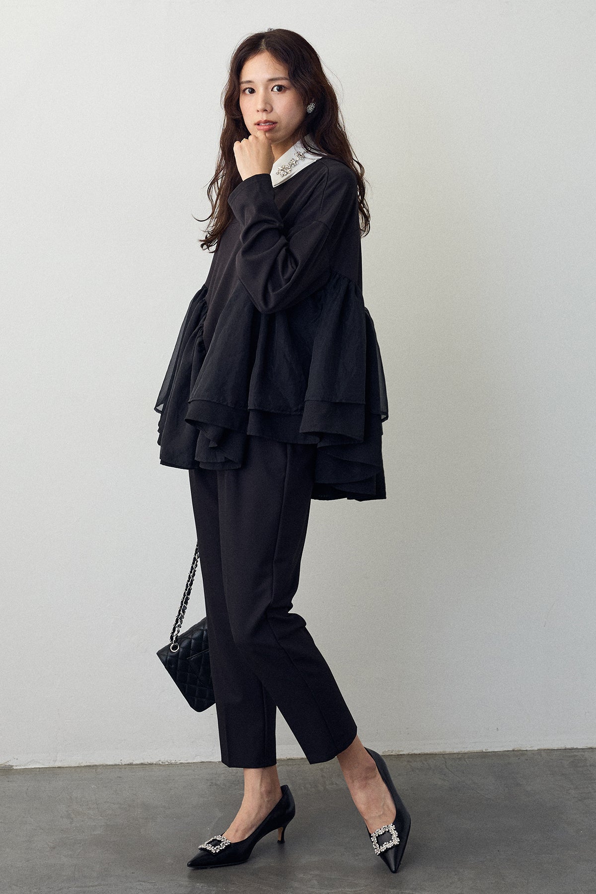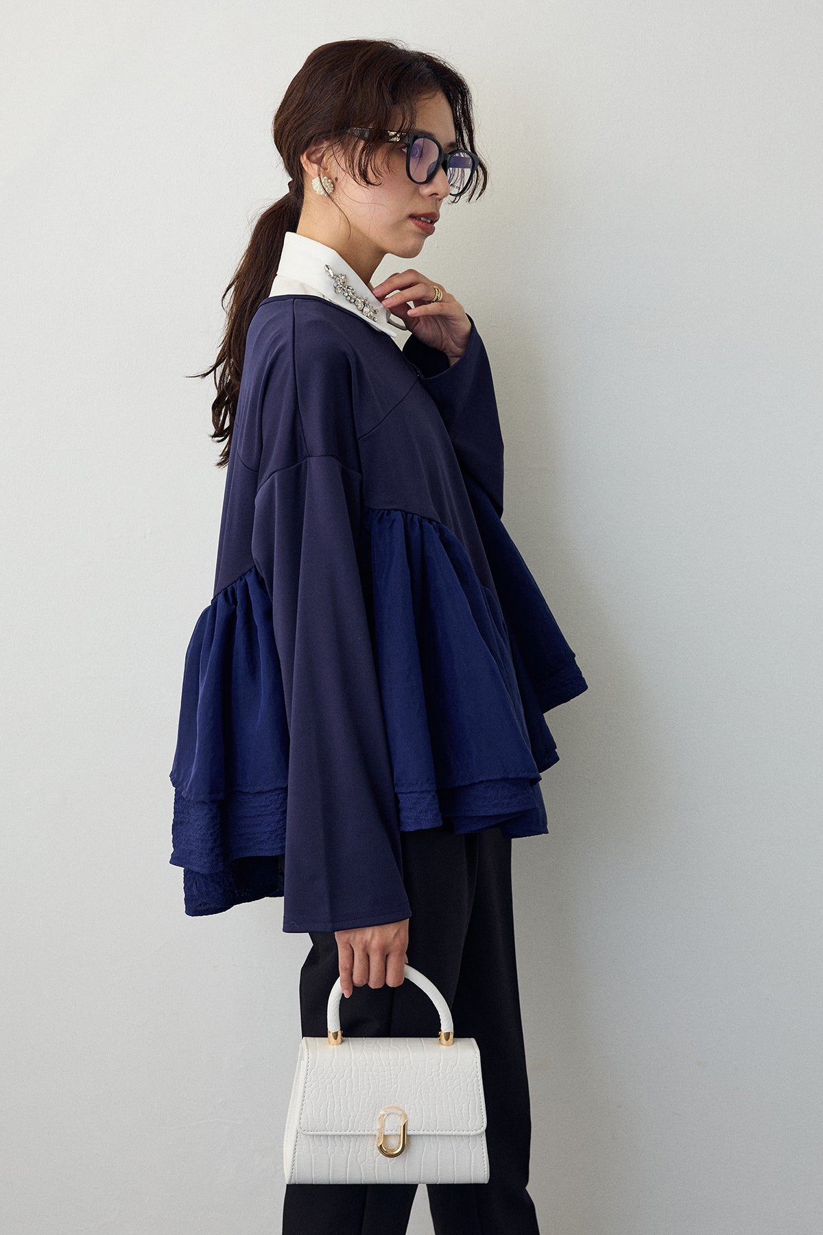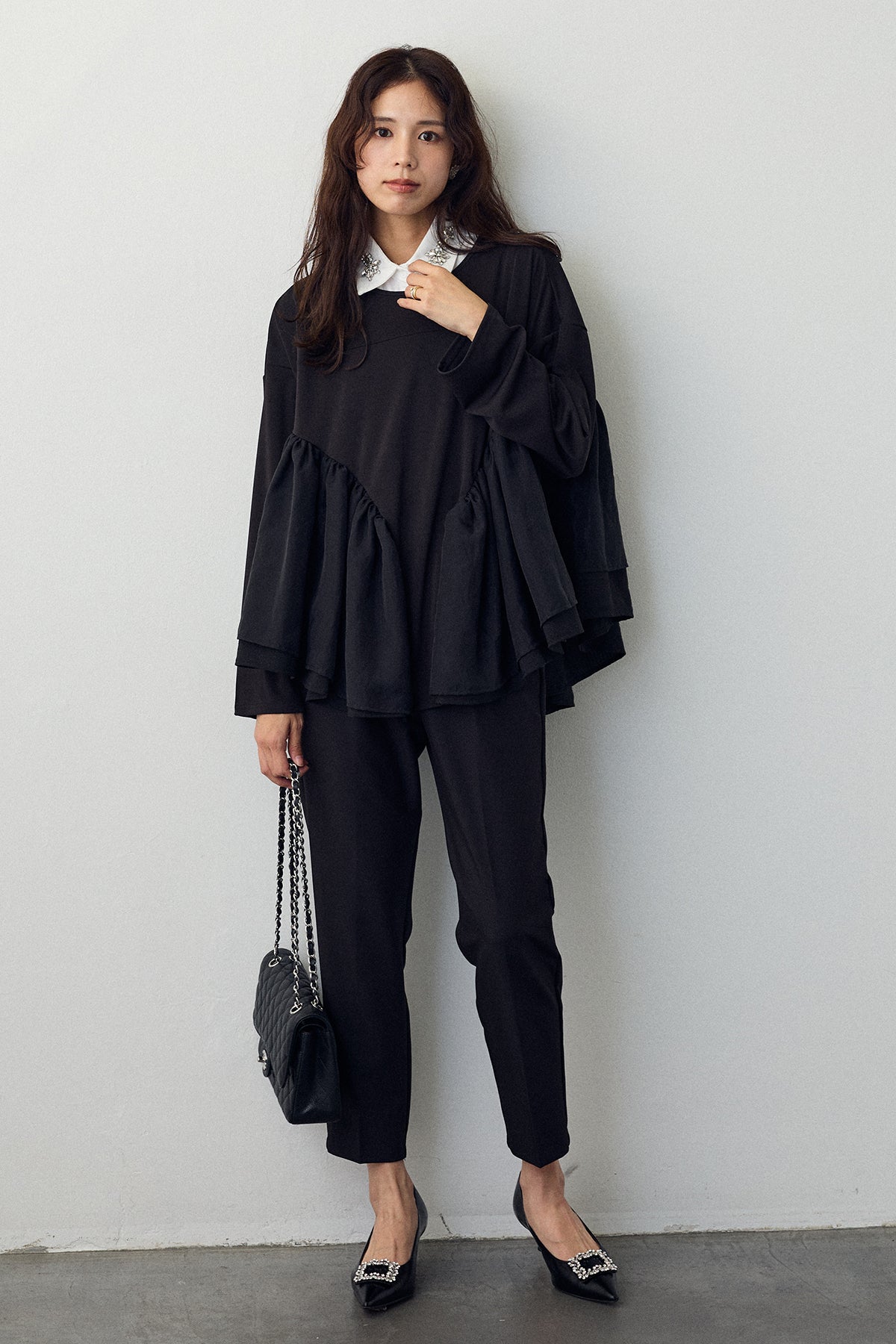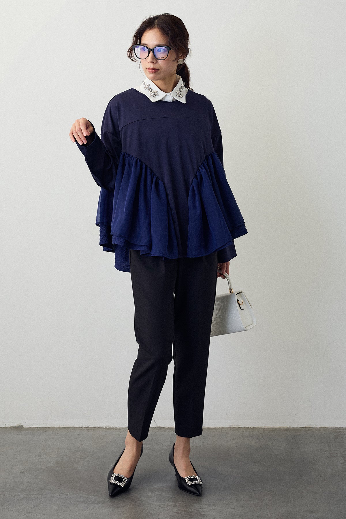 [予約/SET]ビジュー付け襟+フリルテール異素材切替チュニック(2set)
