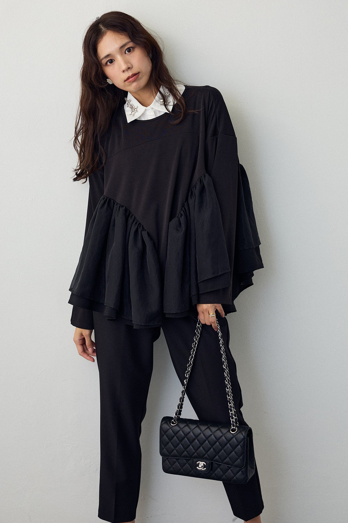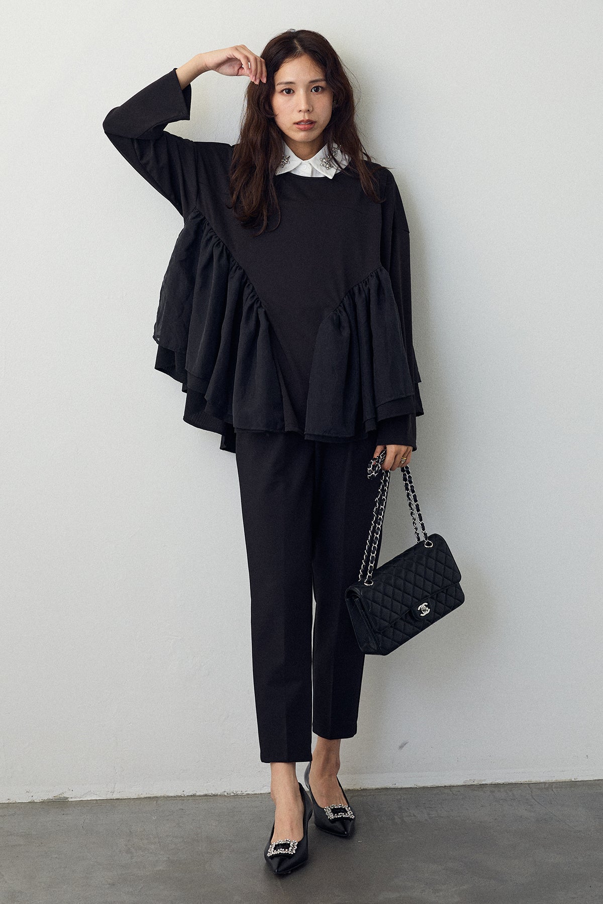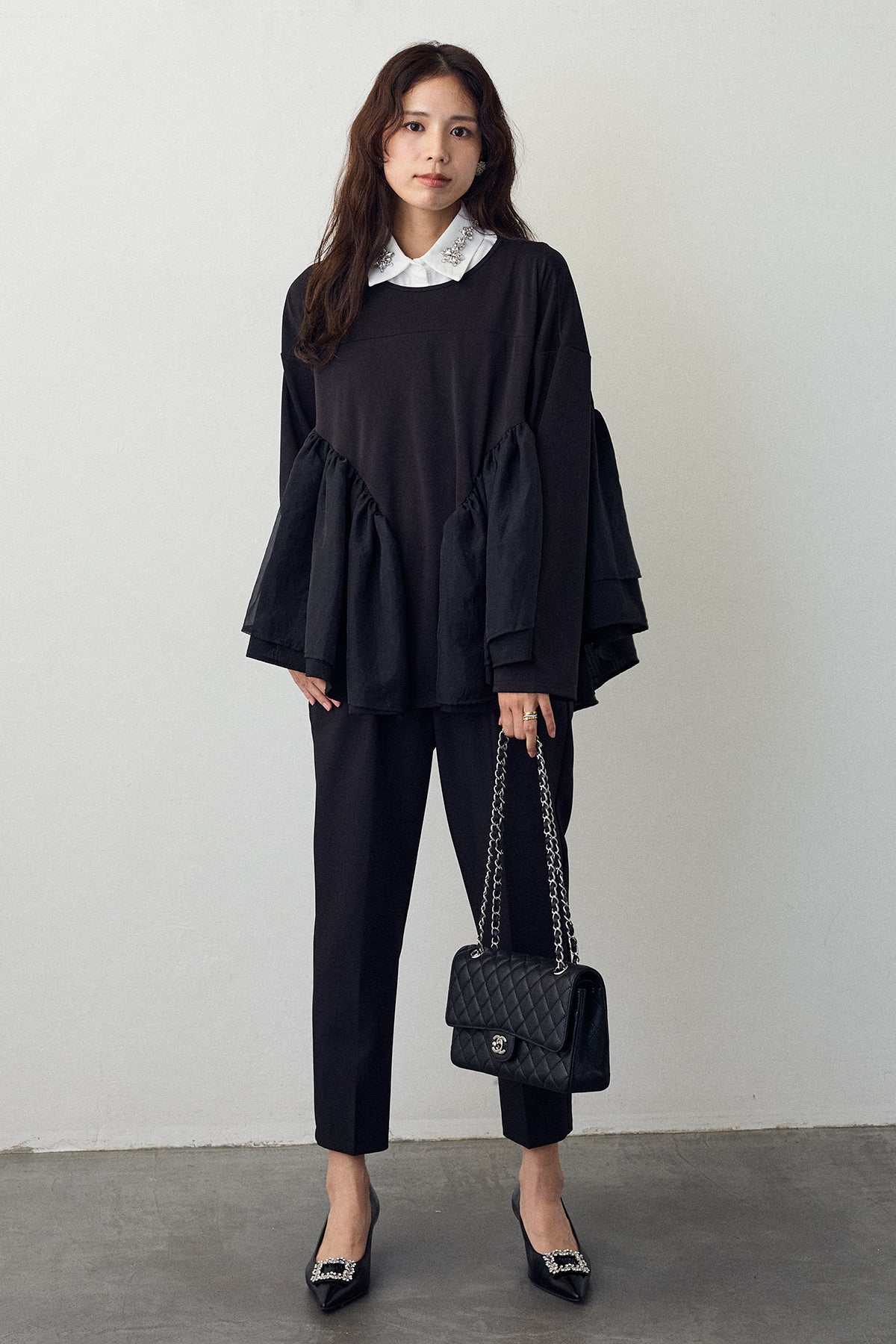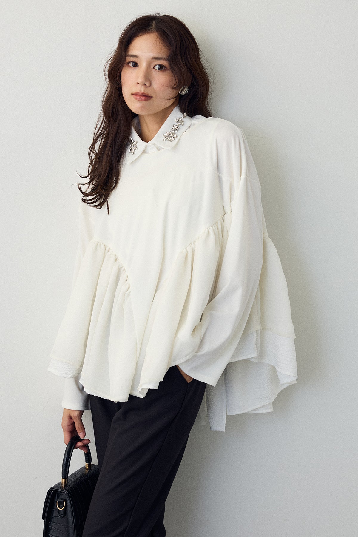 [予約/SET]ビジュー付け襟+フリルテール異素材切替チュニック(2set)