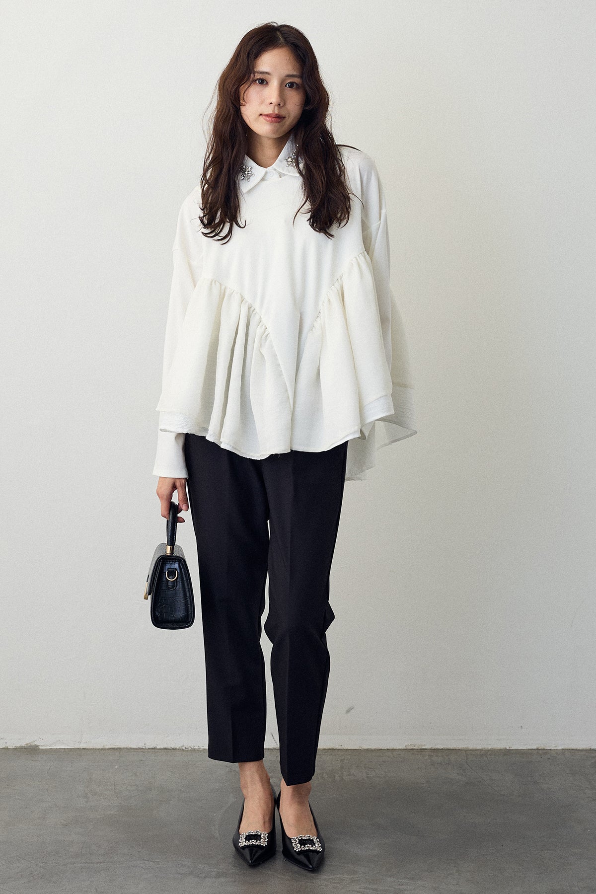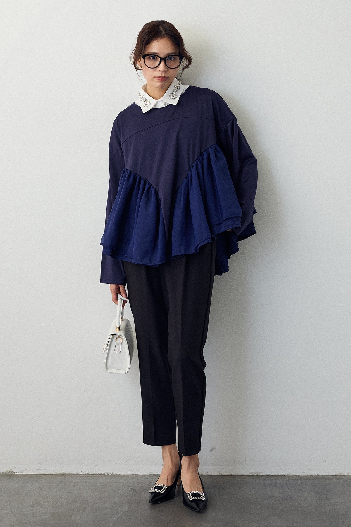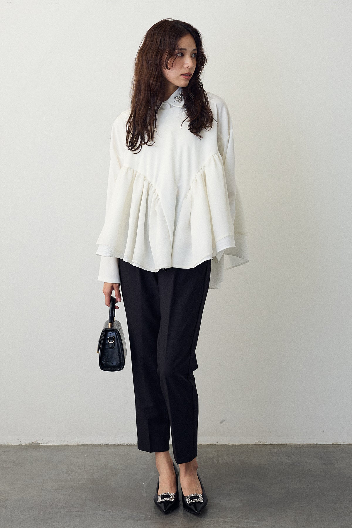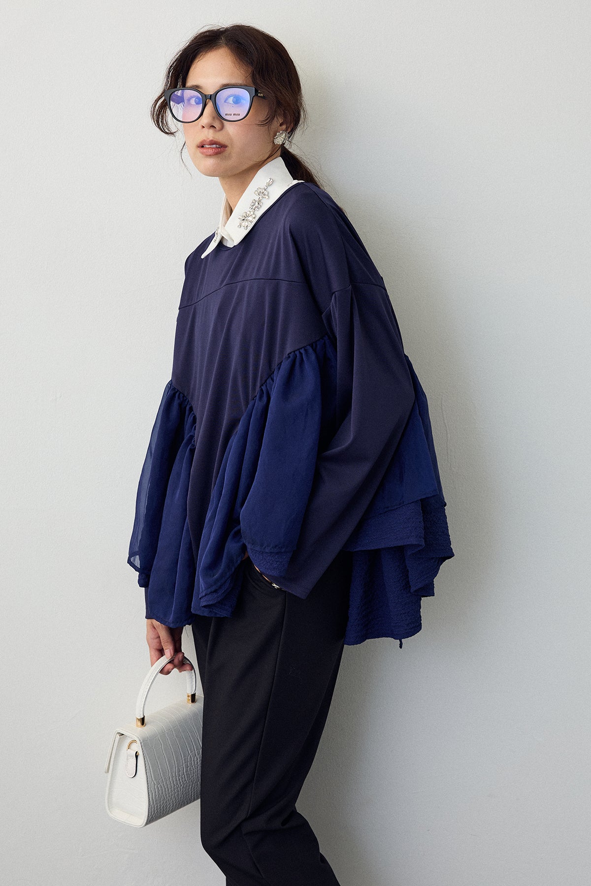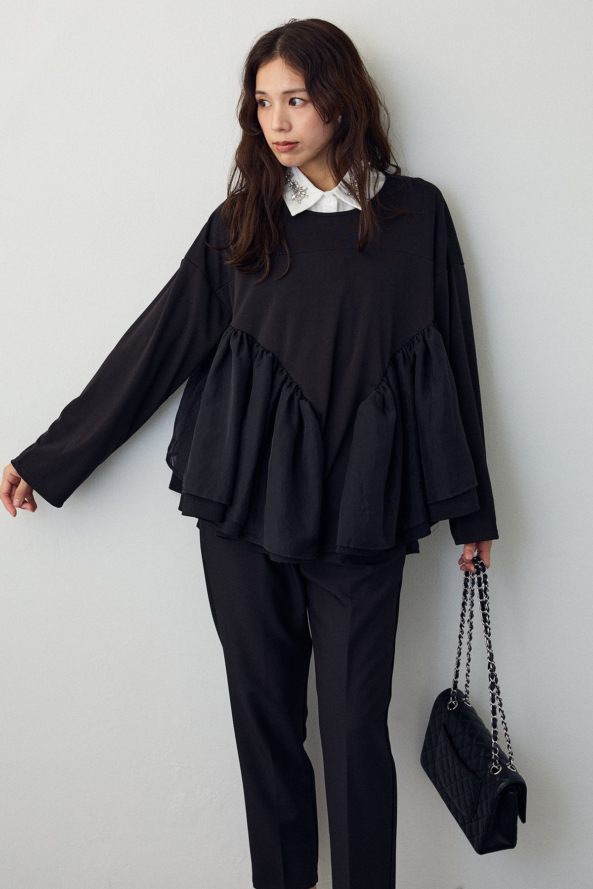 [予約/SET]ビジュー付け襟+フリルテール異素材切替チュニック(2set)