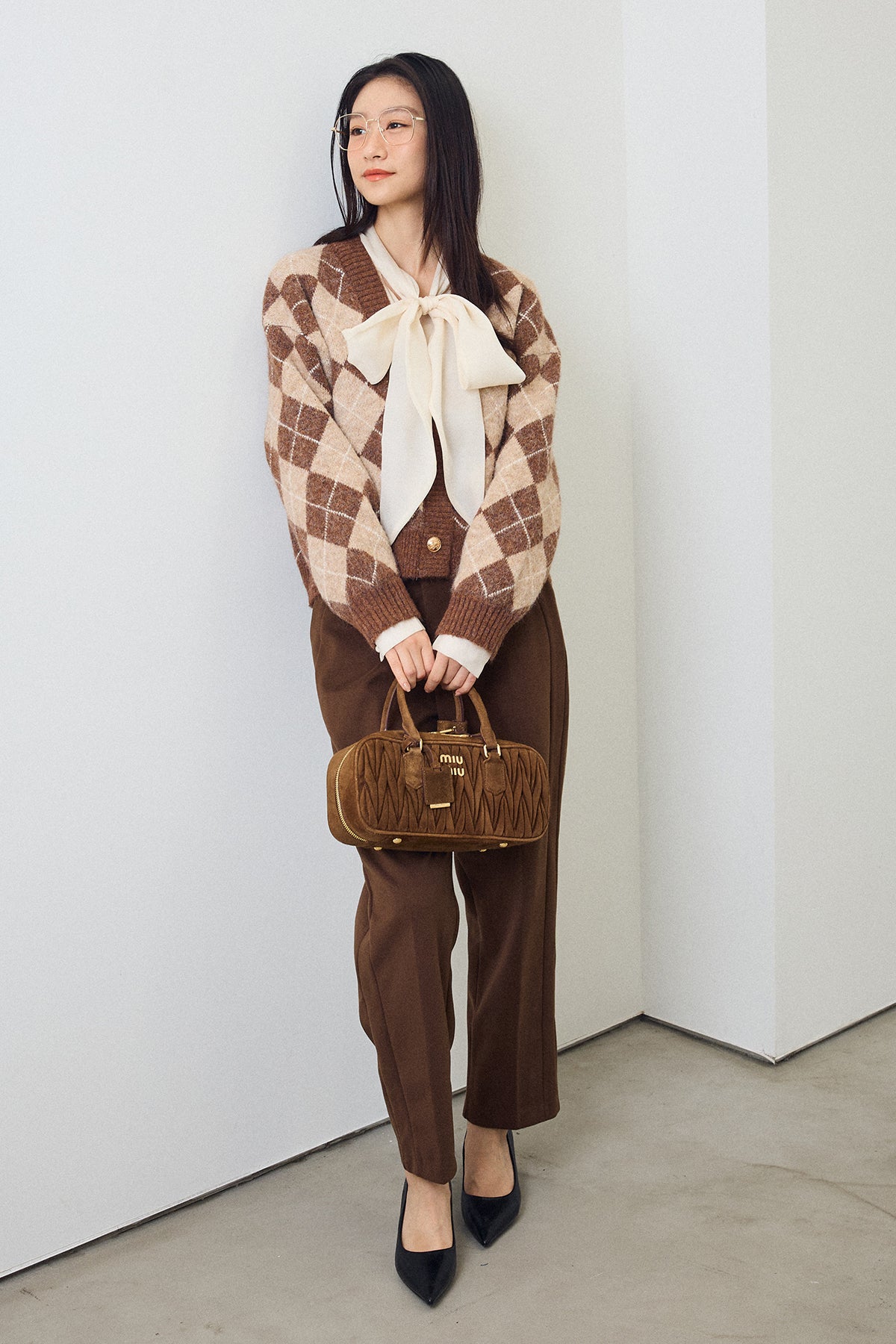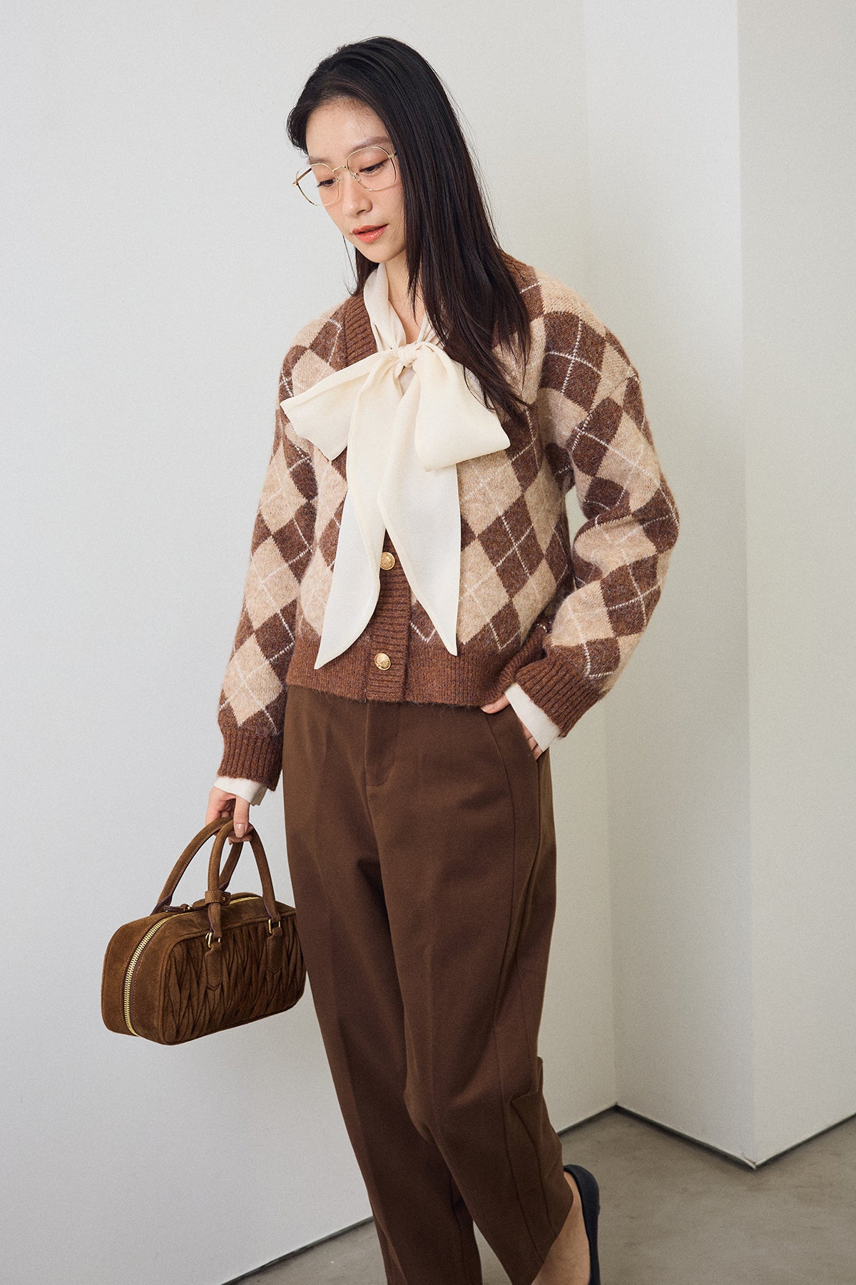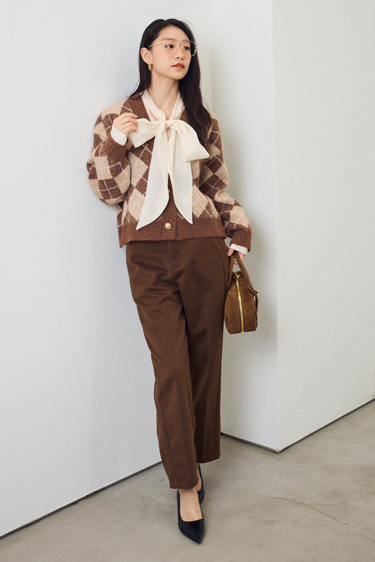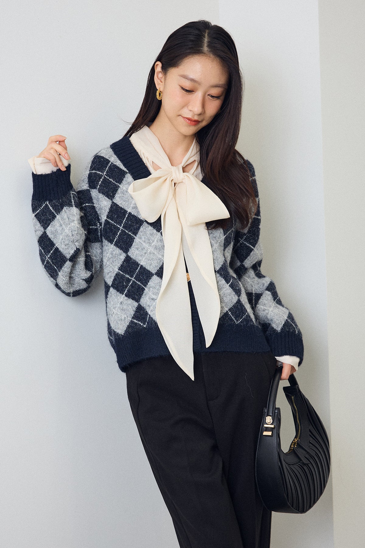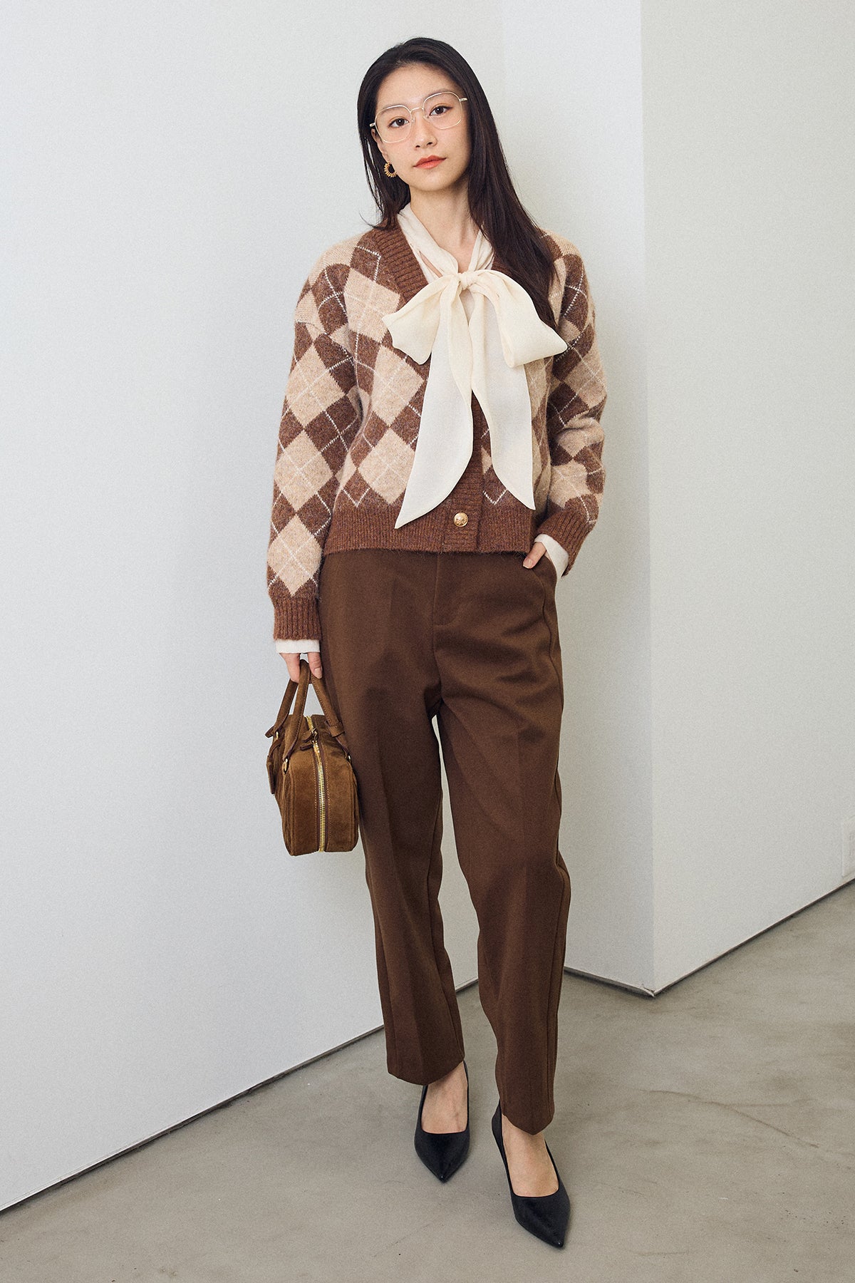 [予約/SET]前後2wayリボンシアーブラウス+アーガイル柄ゴールドボタンニットカーデ+ウォームセンタープレス美ラインテーパードパンツ(3set)