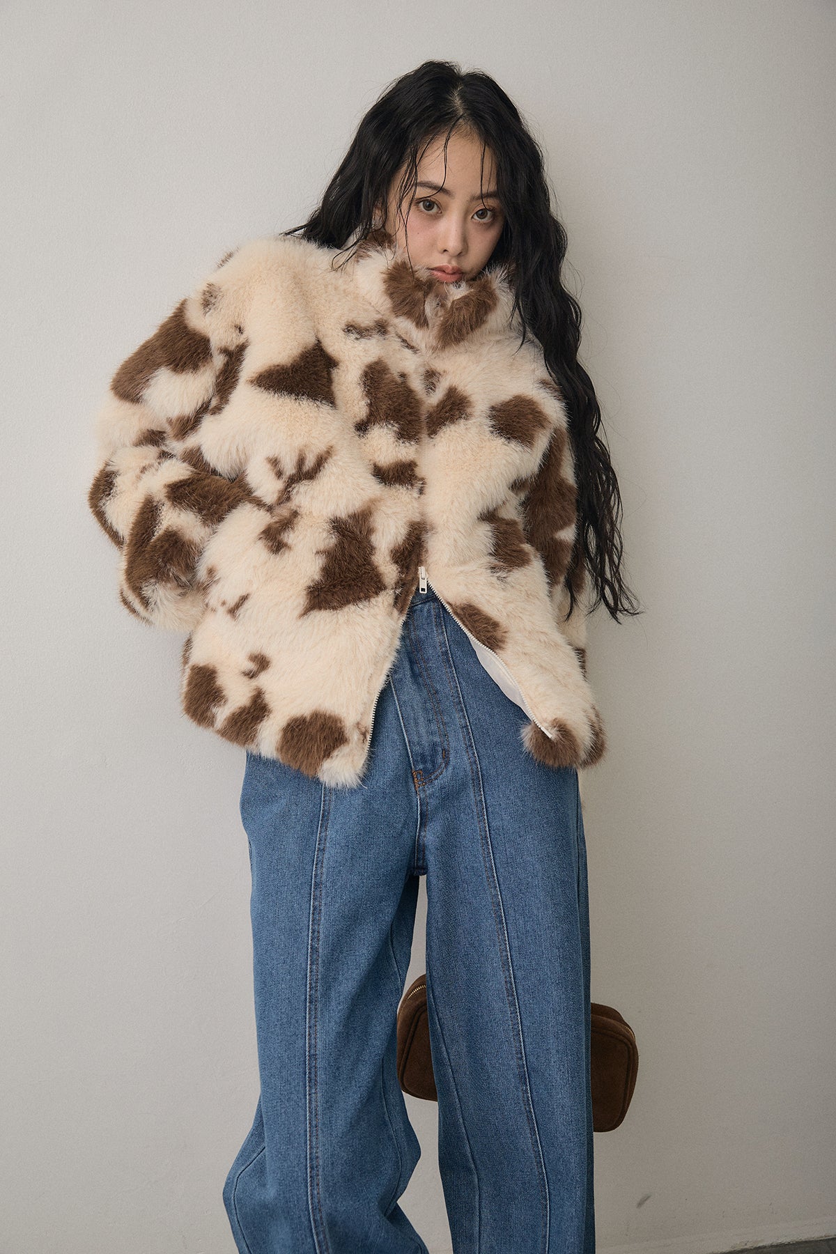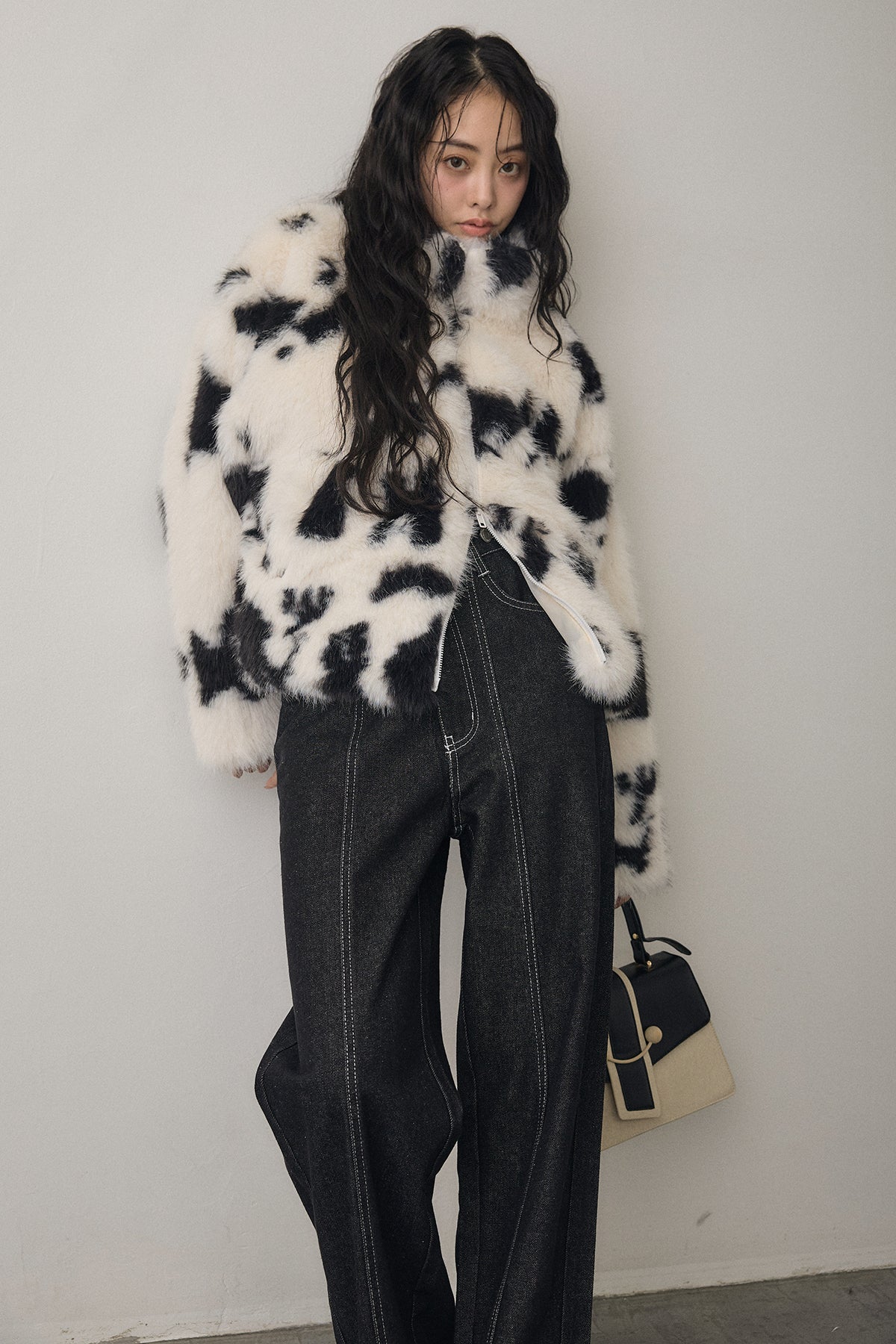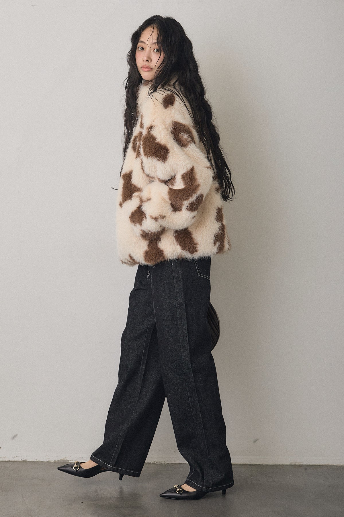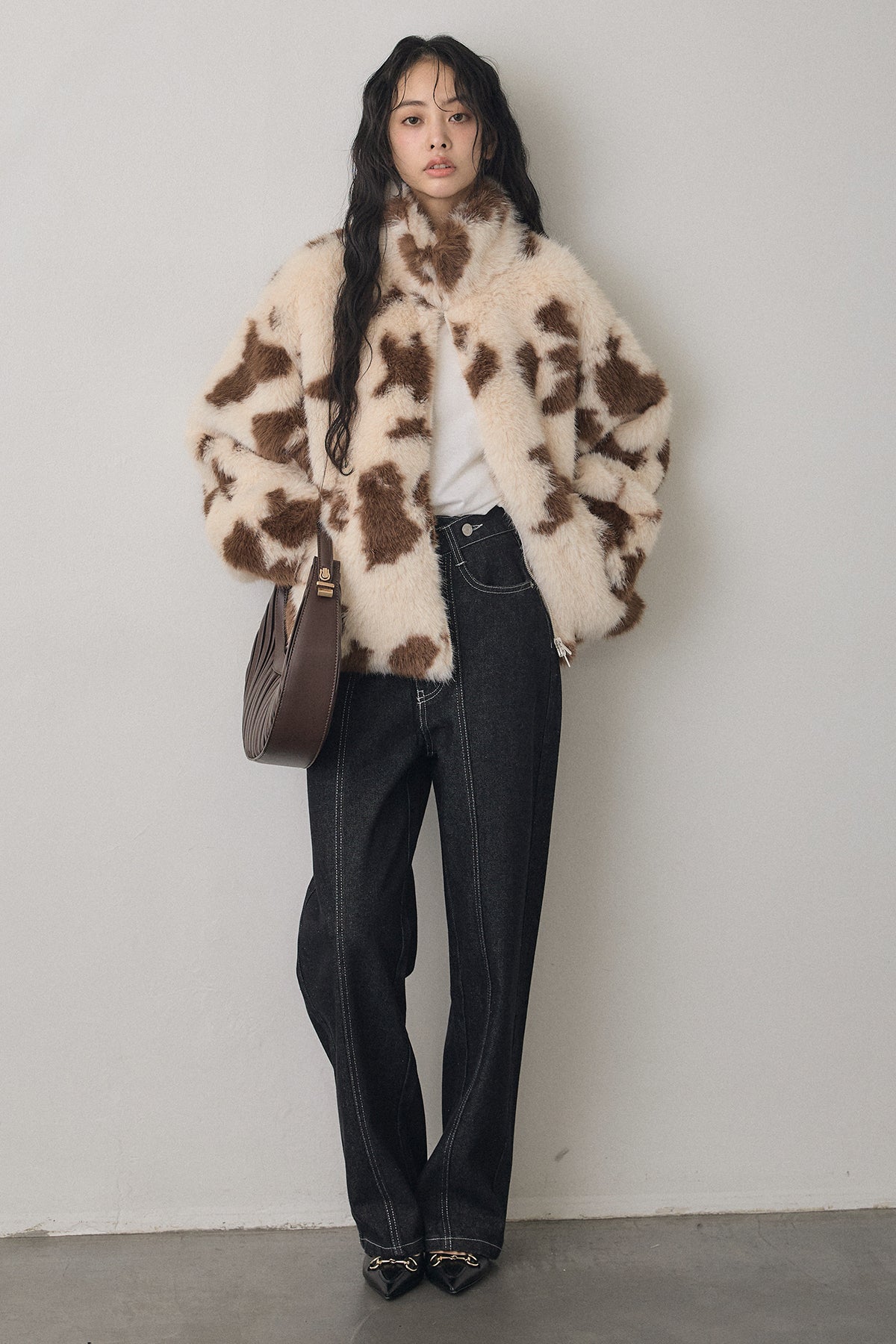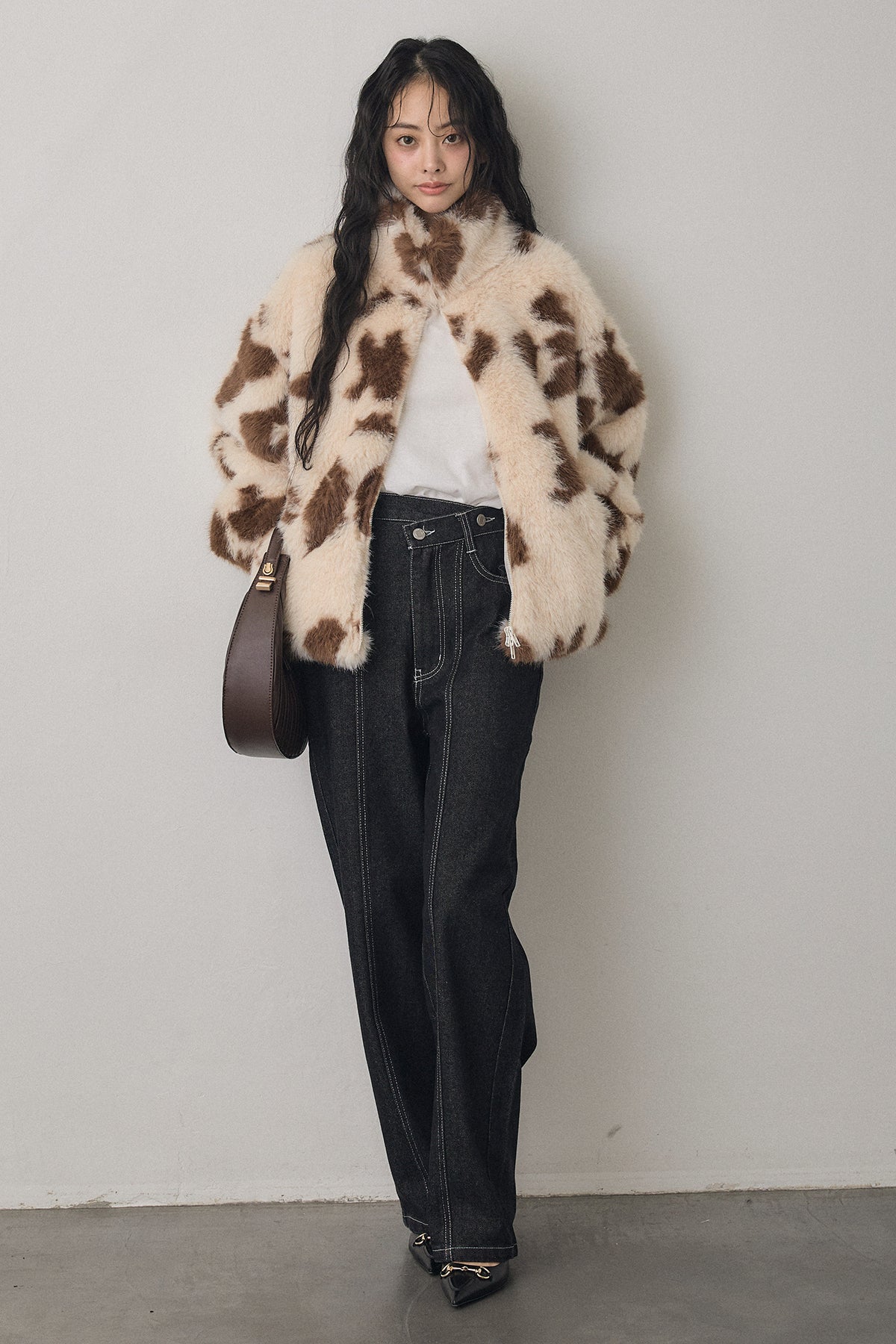 [予約/SET]COW柄スタンドファーライクコート+ウエストアシメデニムパンツ(2set)