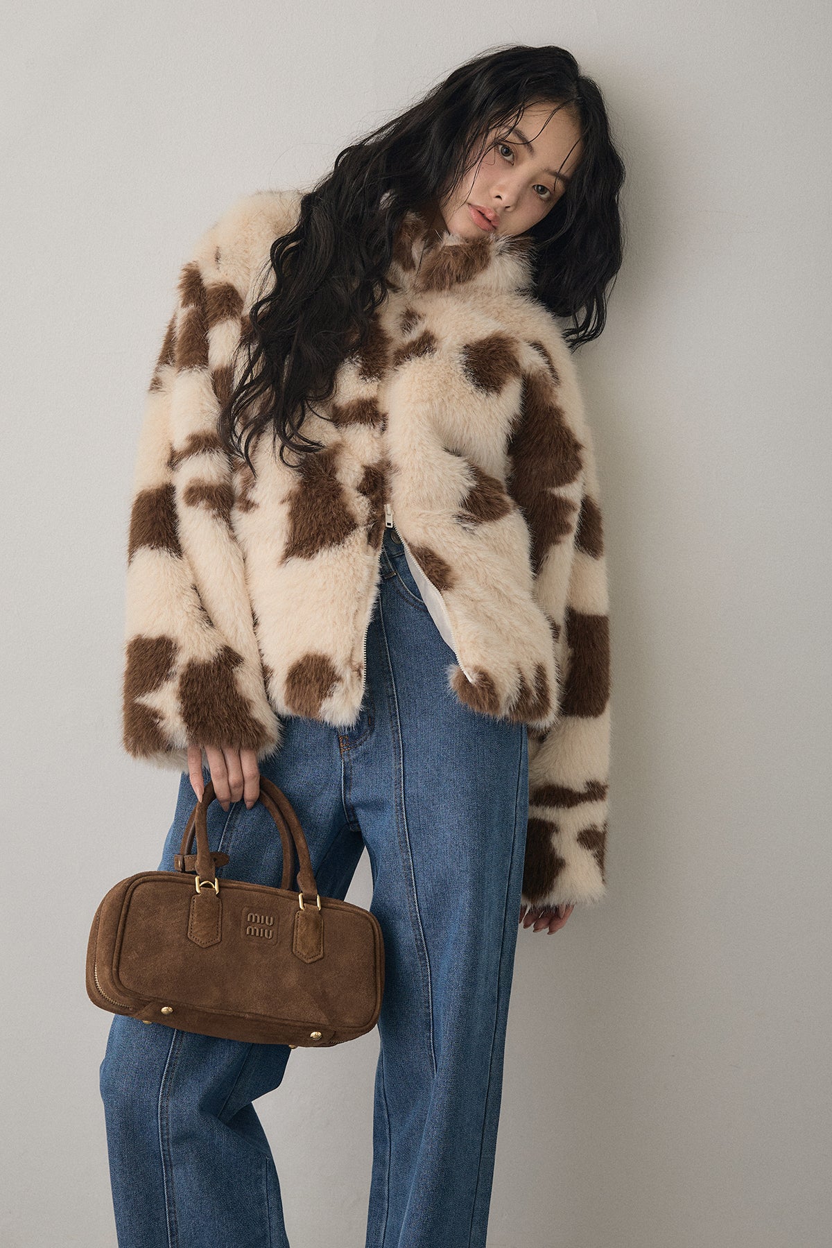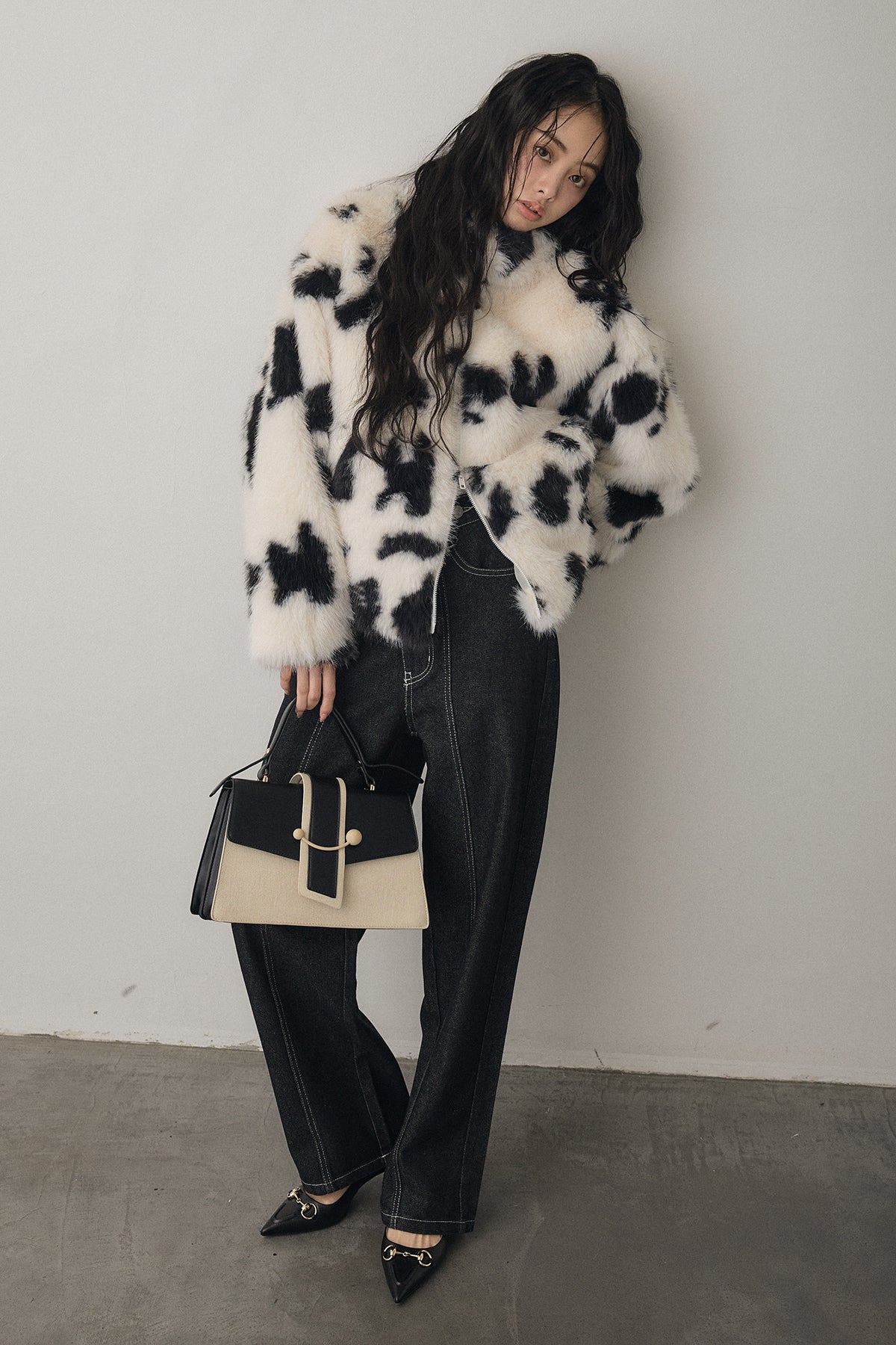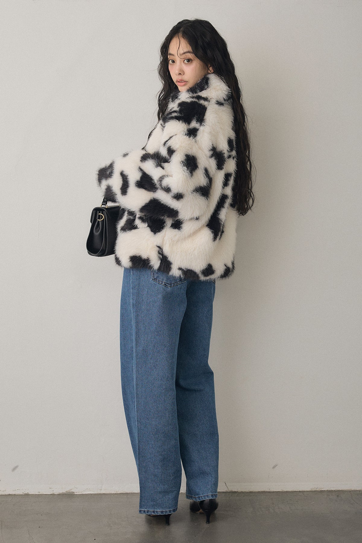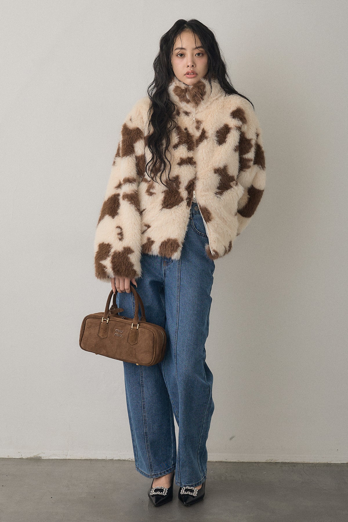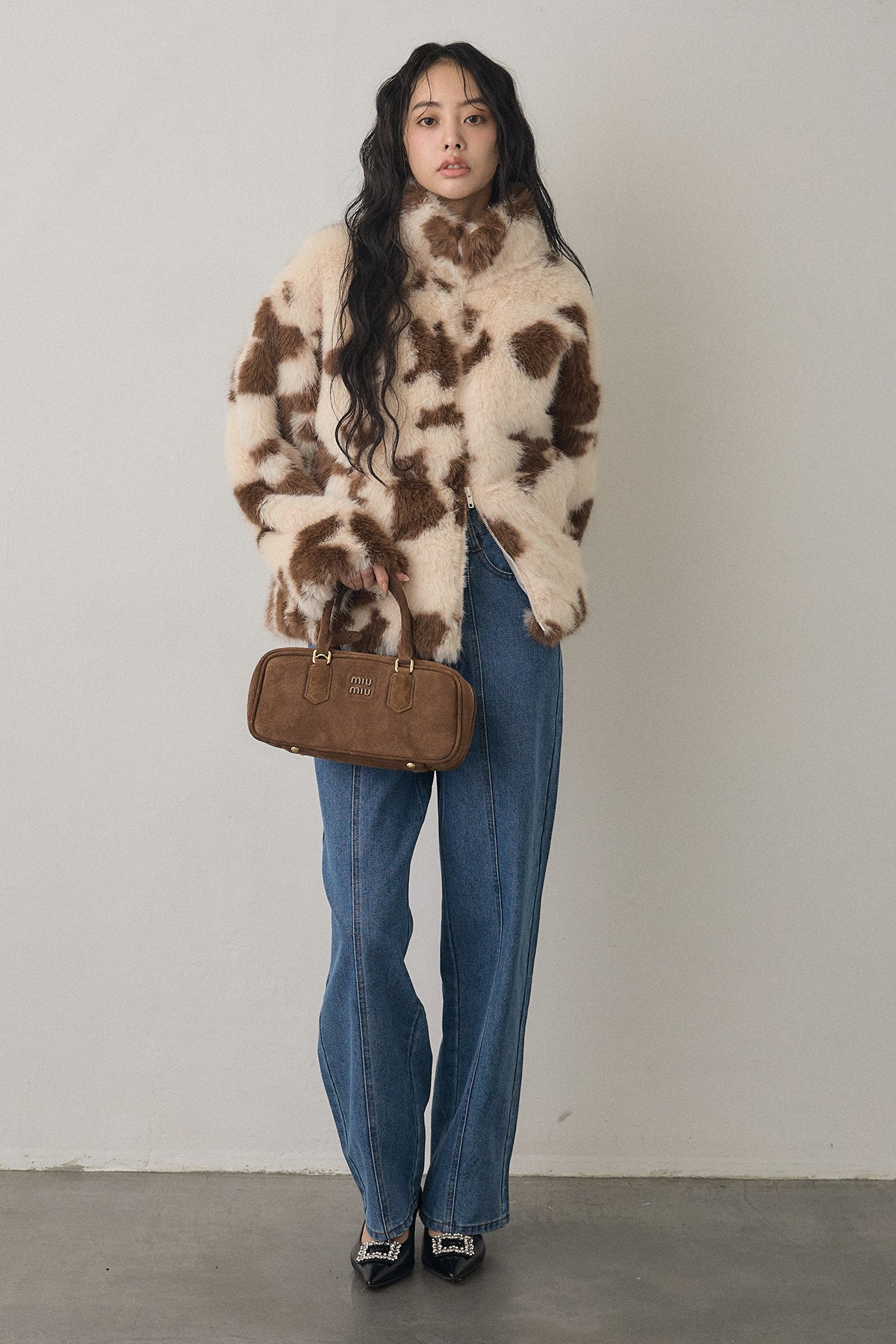[予約/SET]COW柄スタンドファーライクコート+ウエストアシメデニムパンツ(2set)