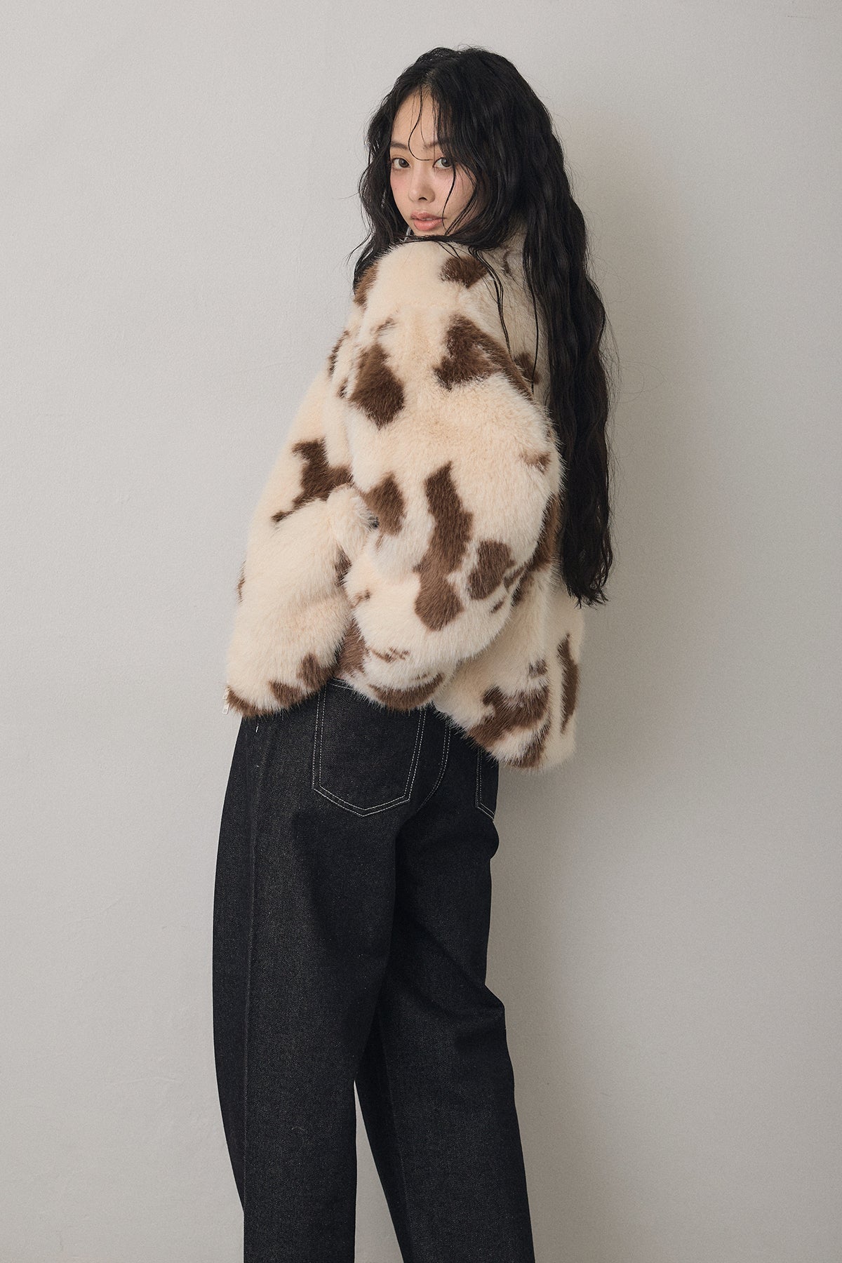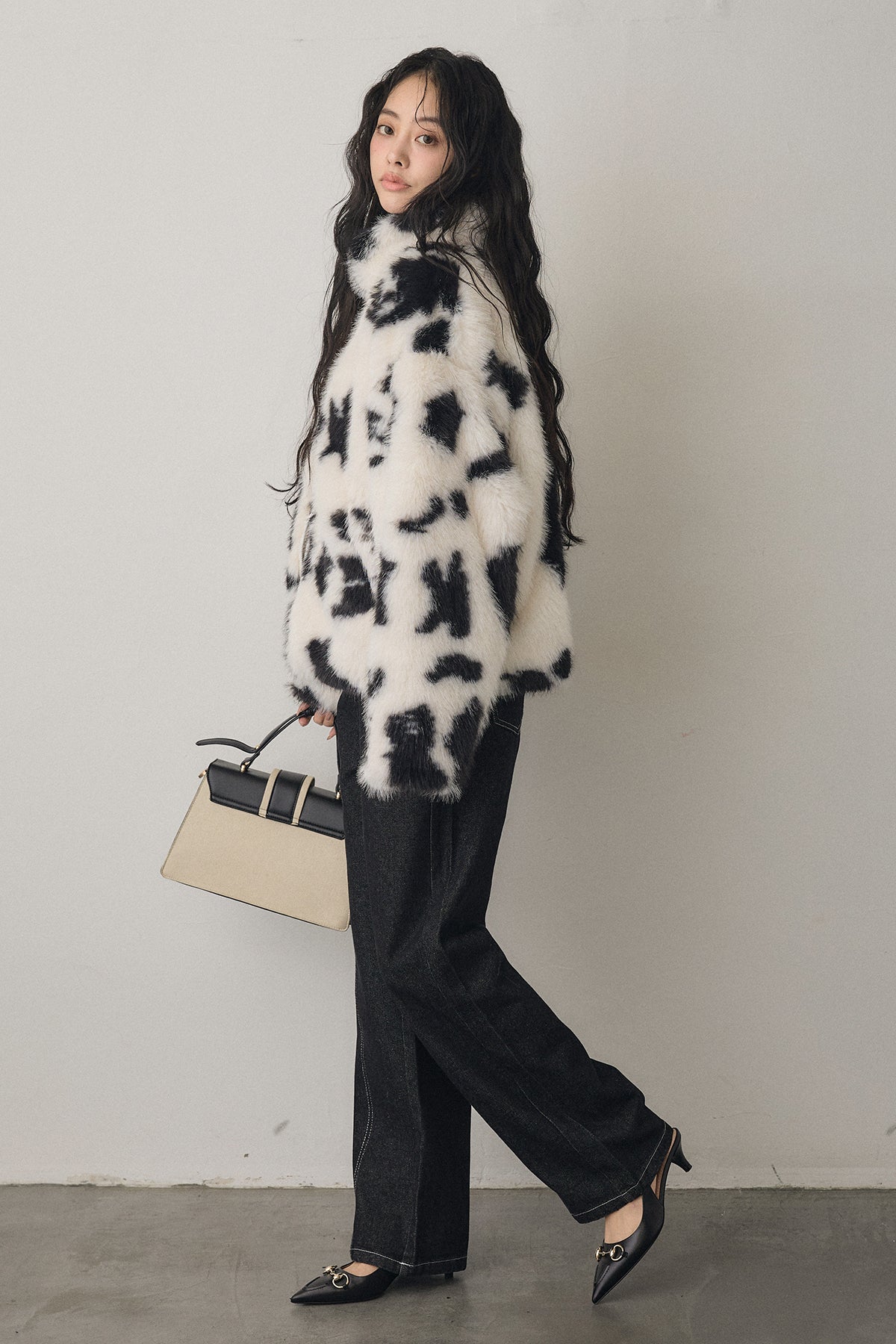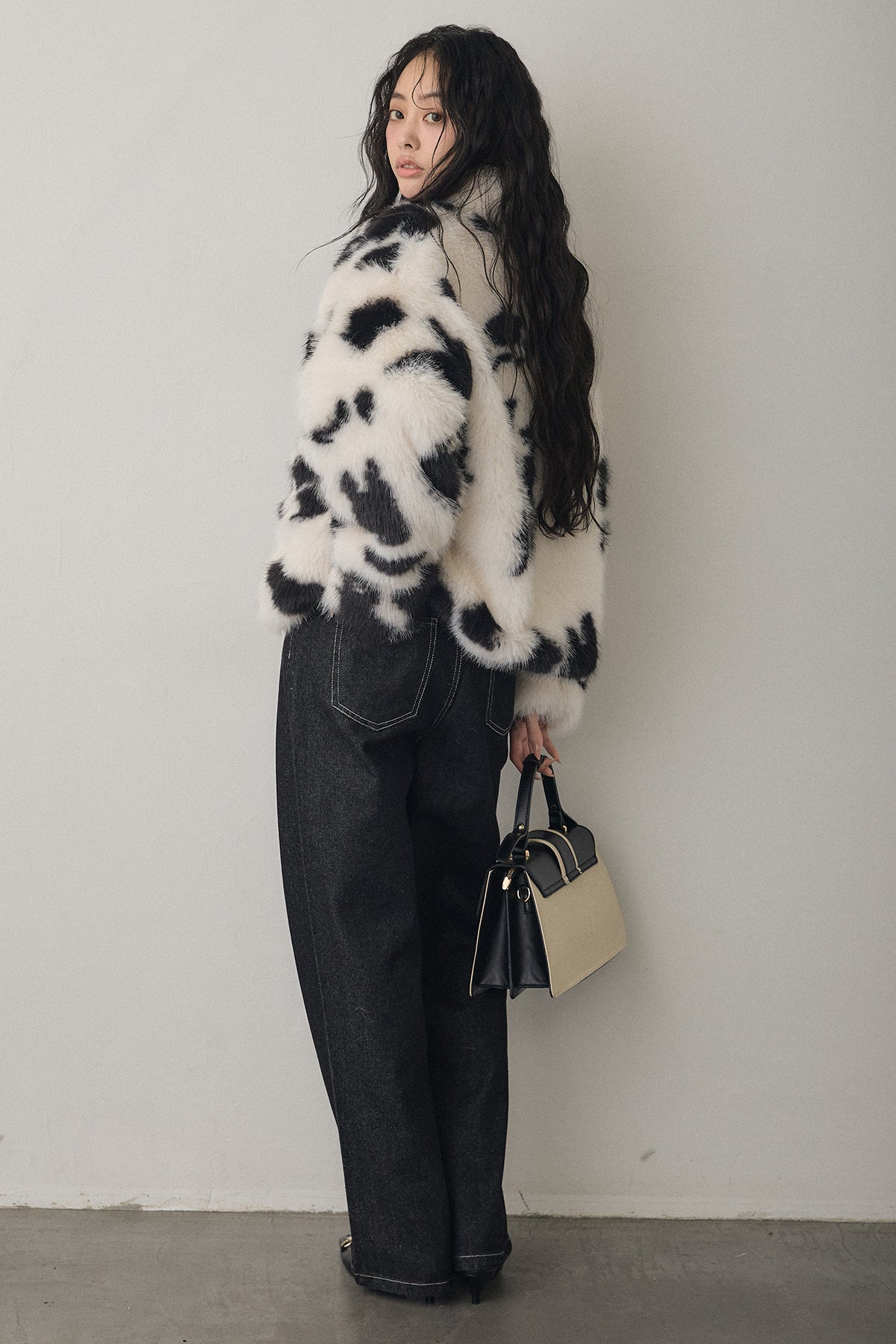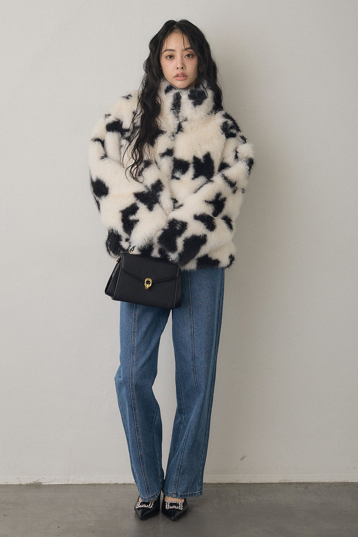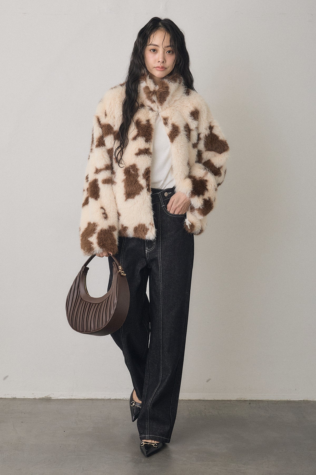 [予約/SET]COW柄スタンドファーライクコート+ウエストアシメデニムパンツ(2set)