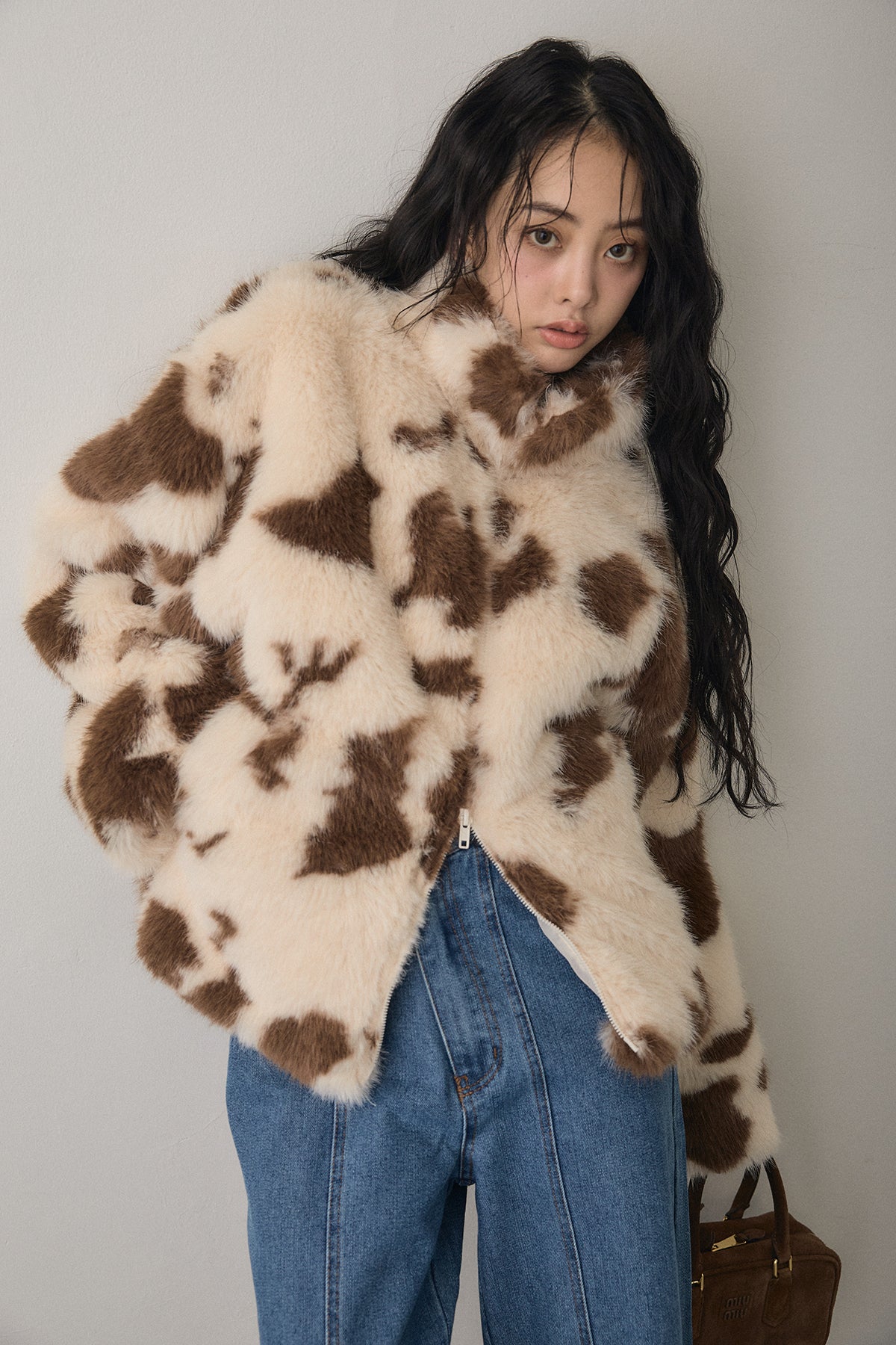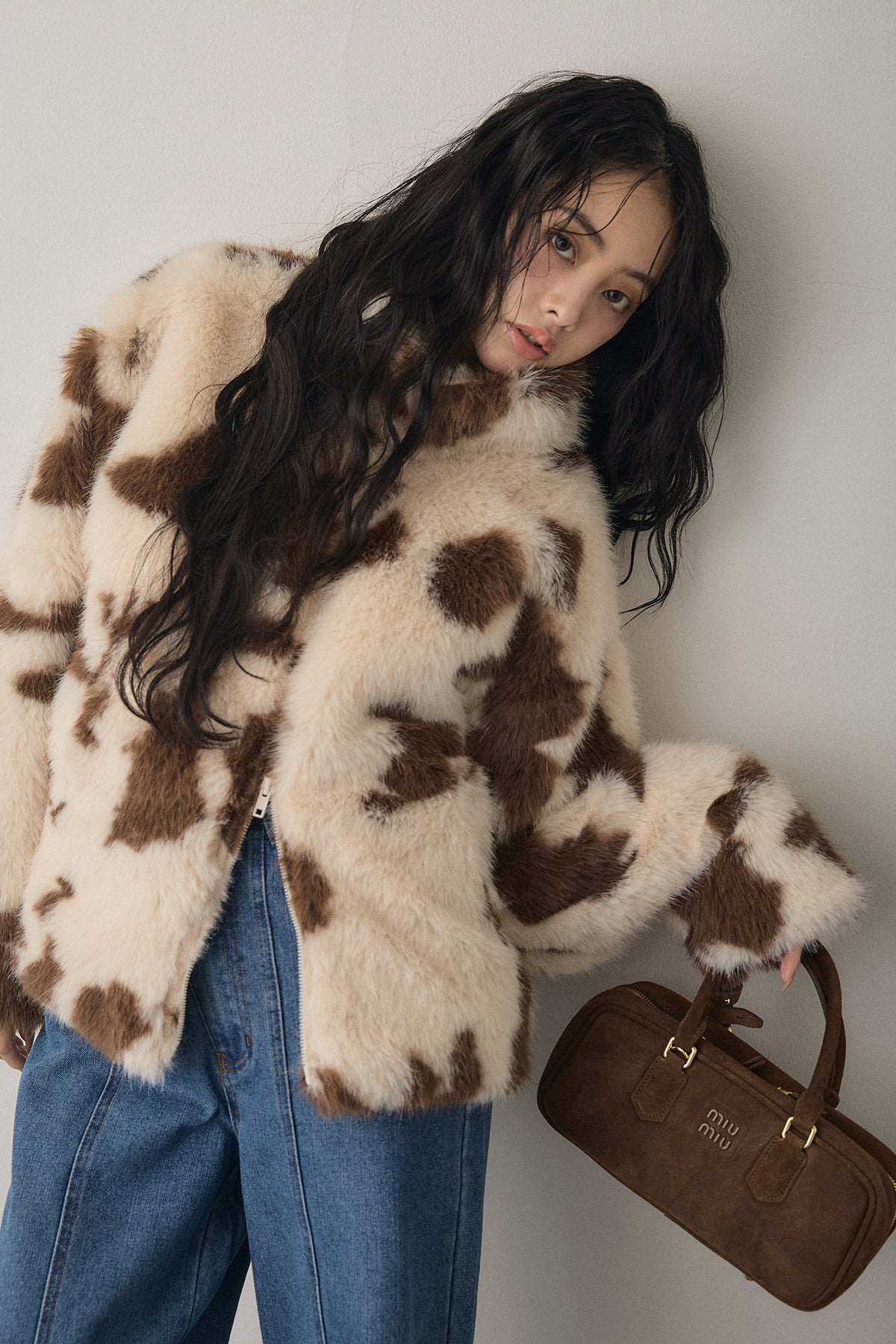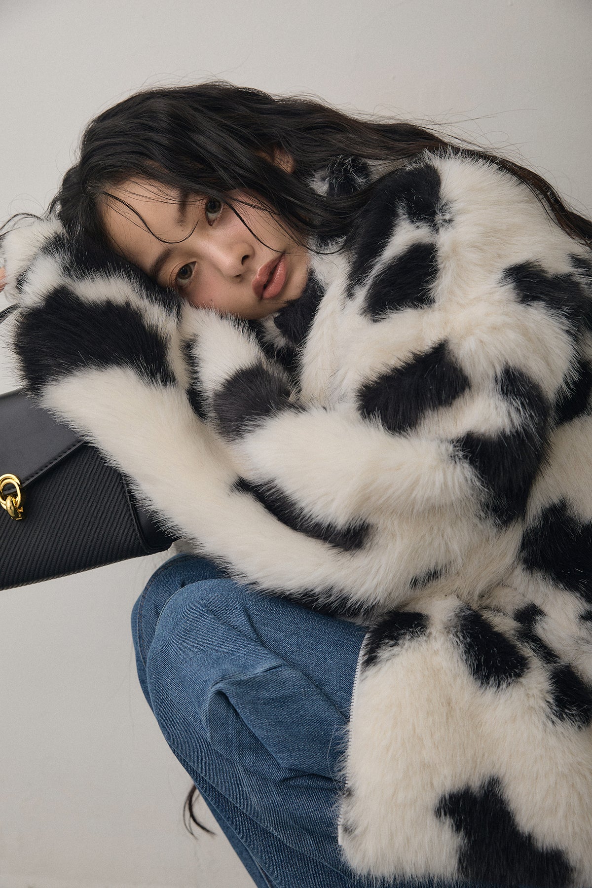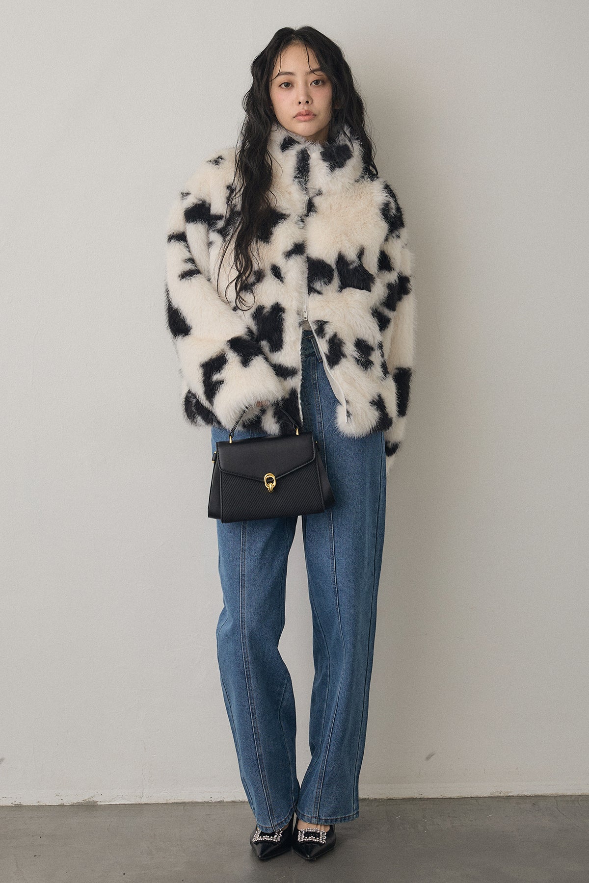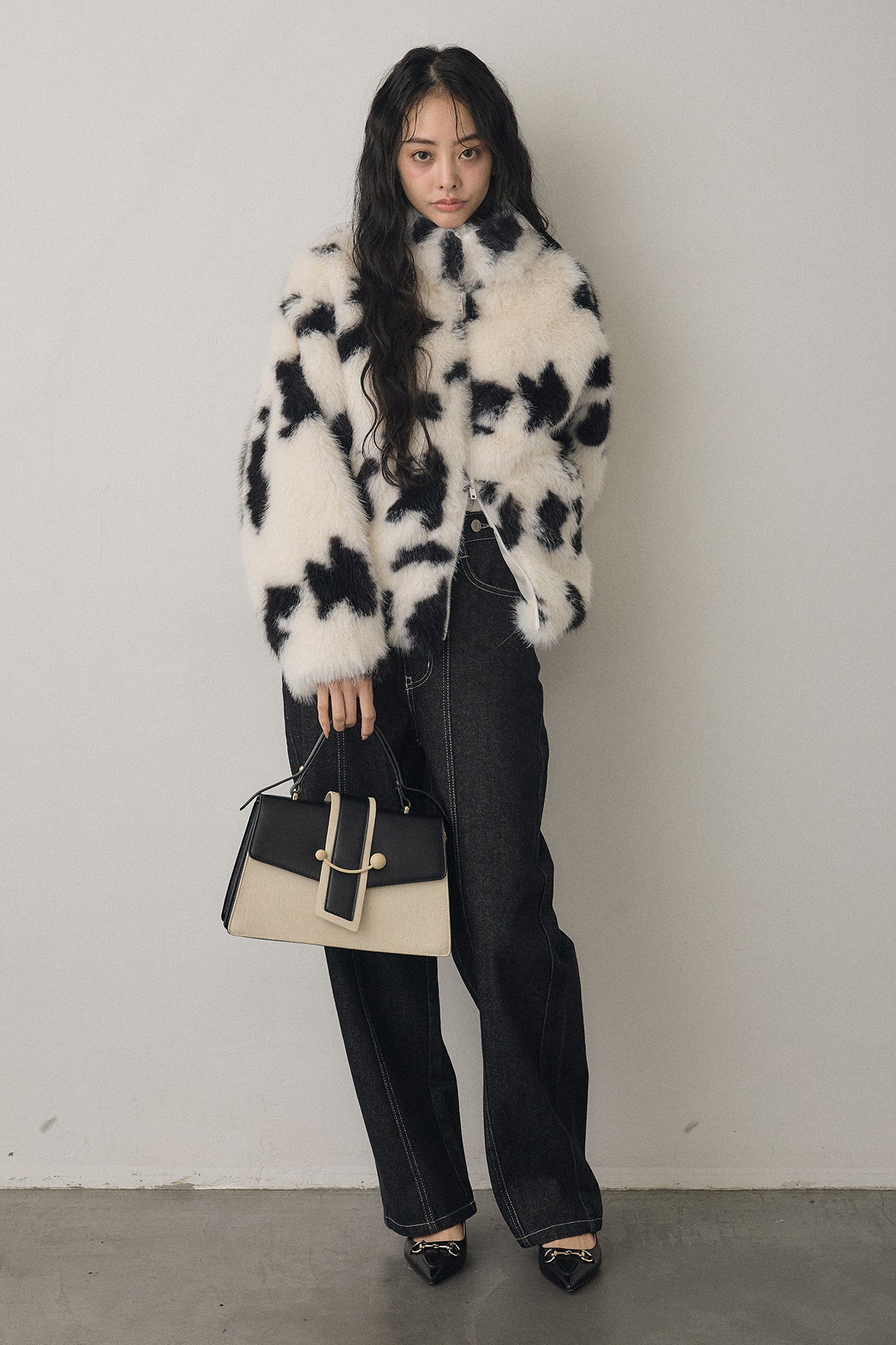 [予約/SET]COW柄スタンドファーライクコート+ウエストアシメデニムパンツ(2set)