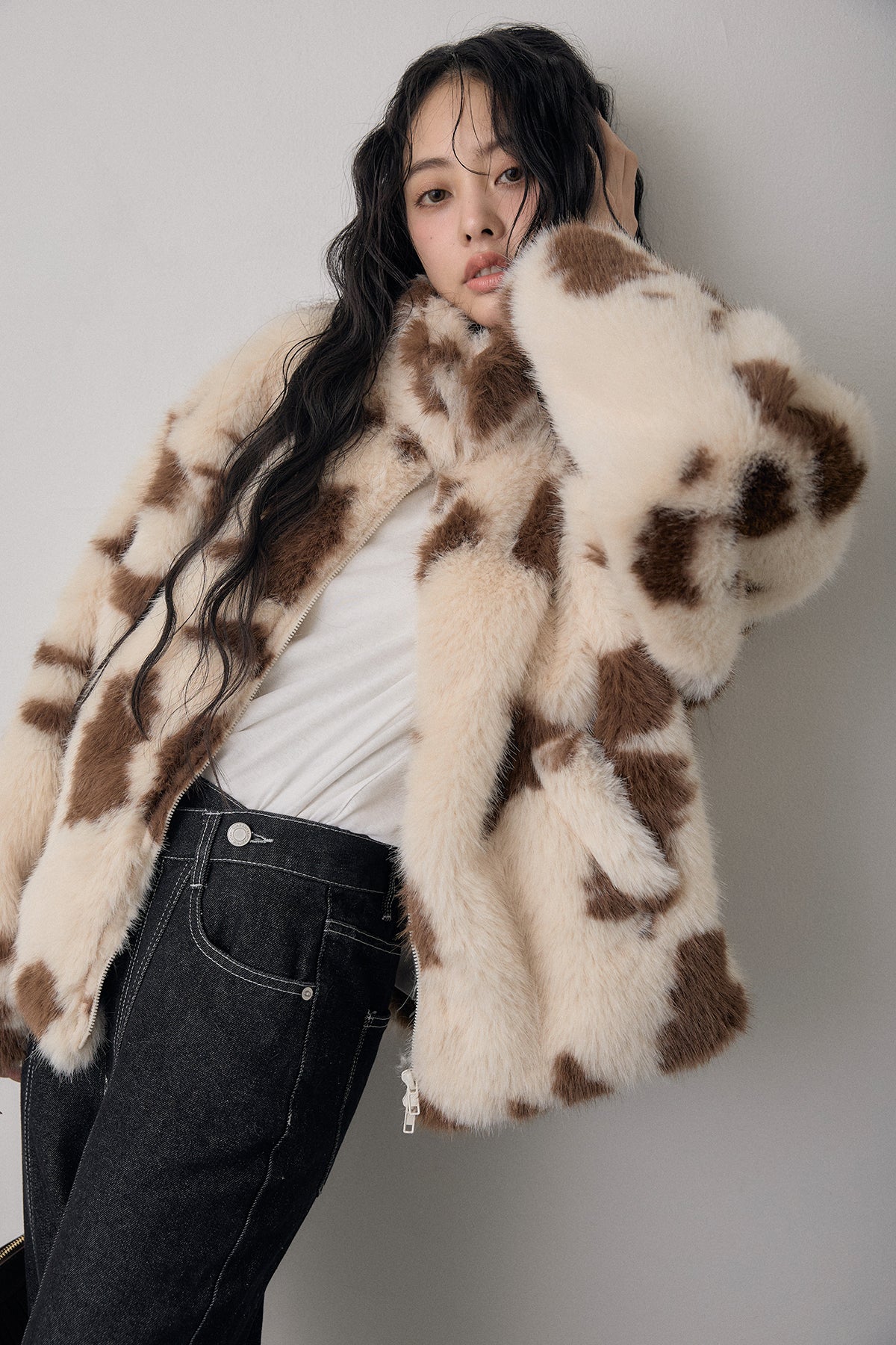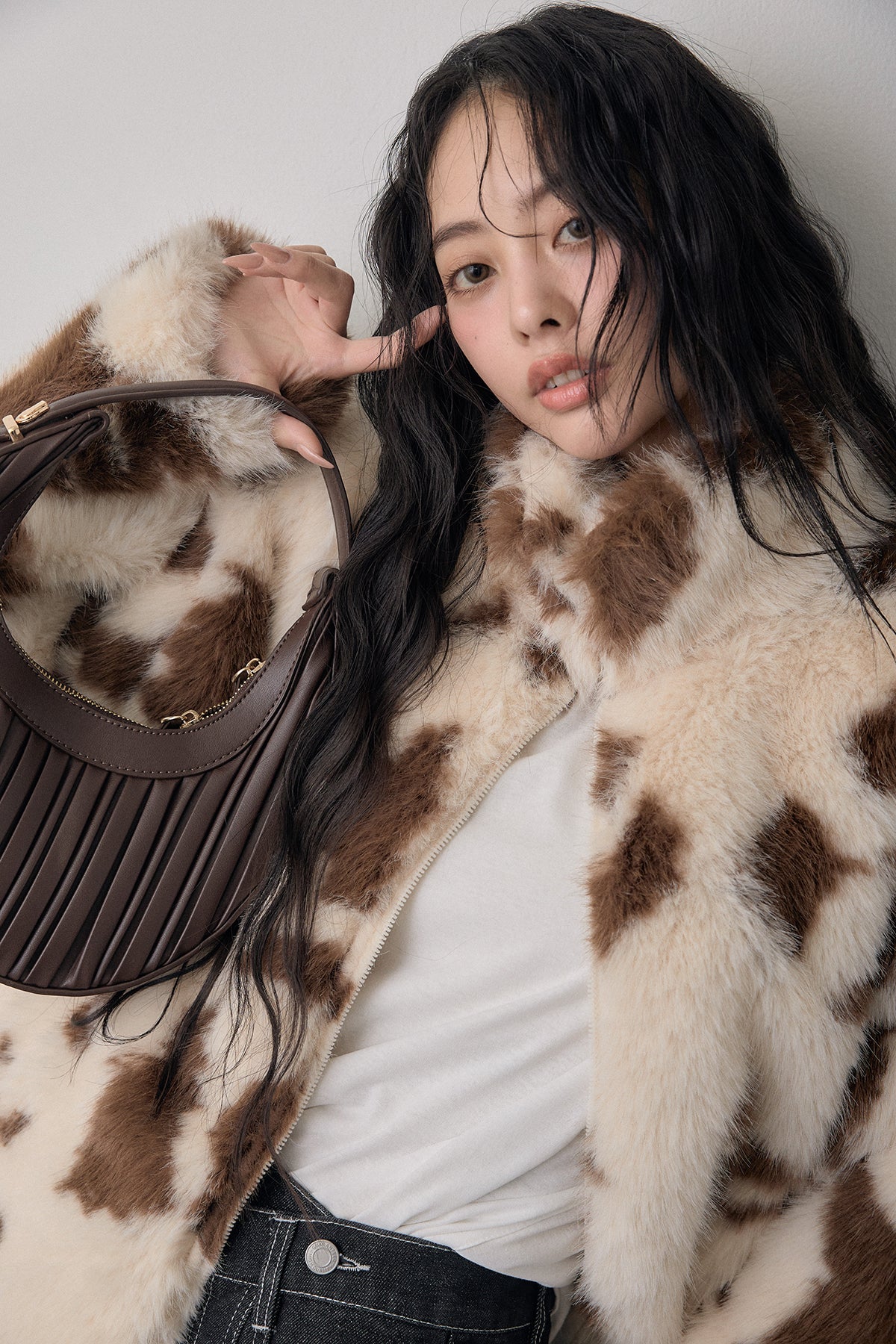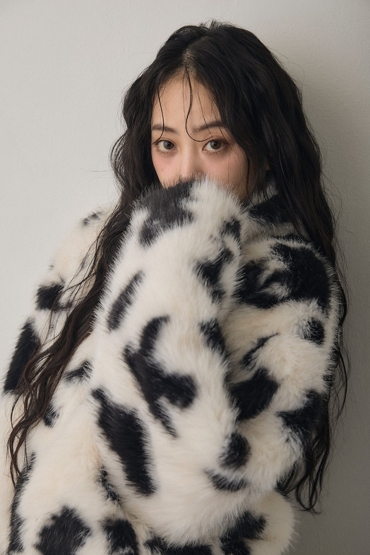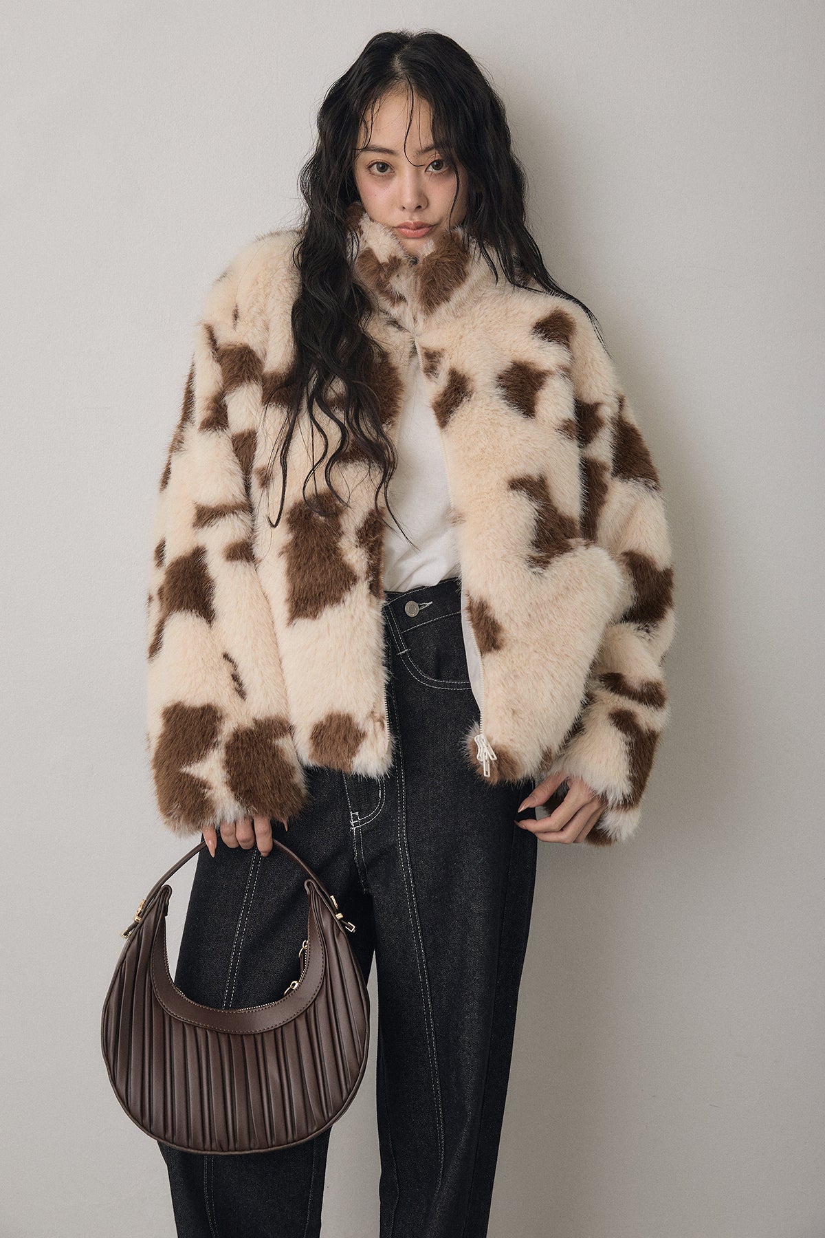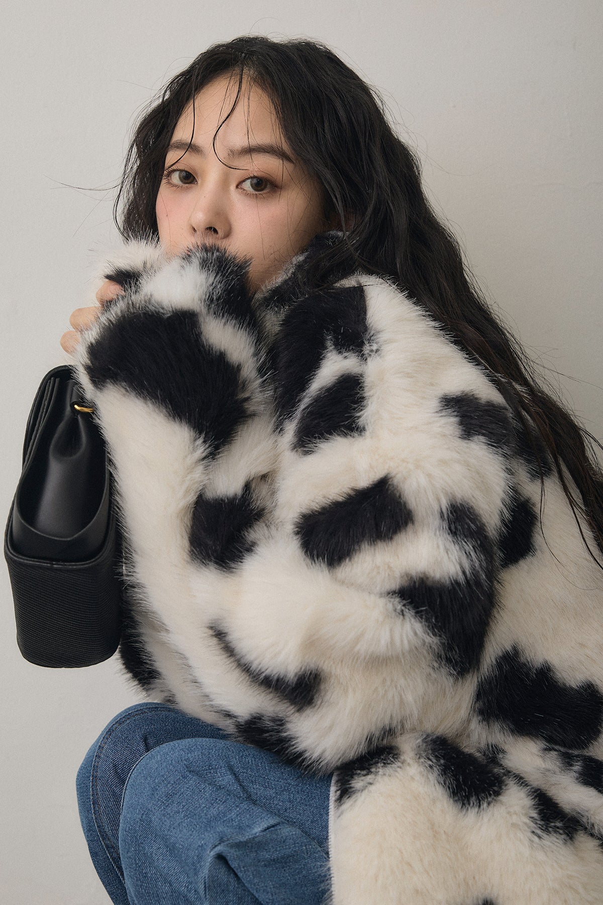 [予約/SET]COW柄スタンドファーライクコート+ウエストアシメデニムパンツ(2set)