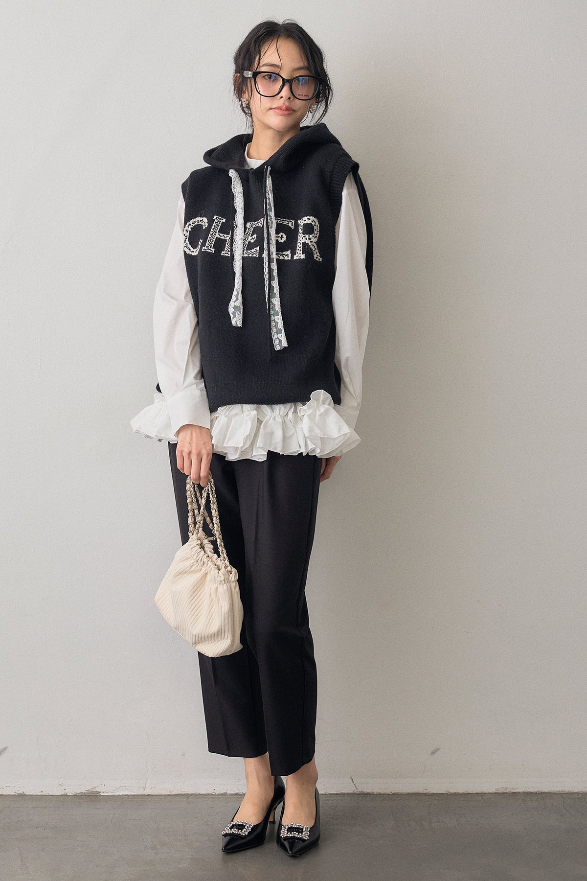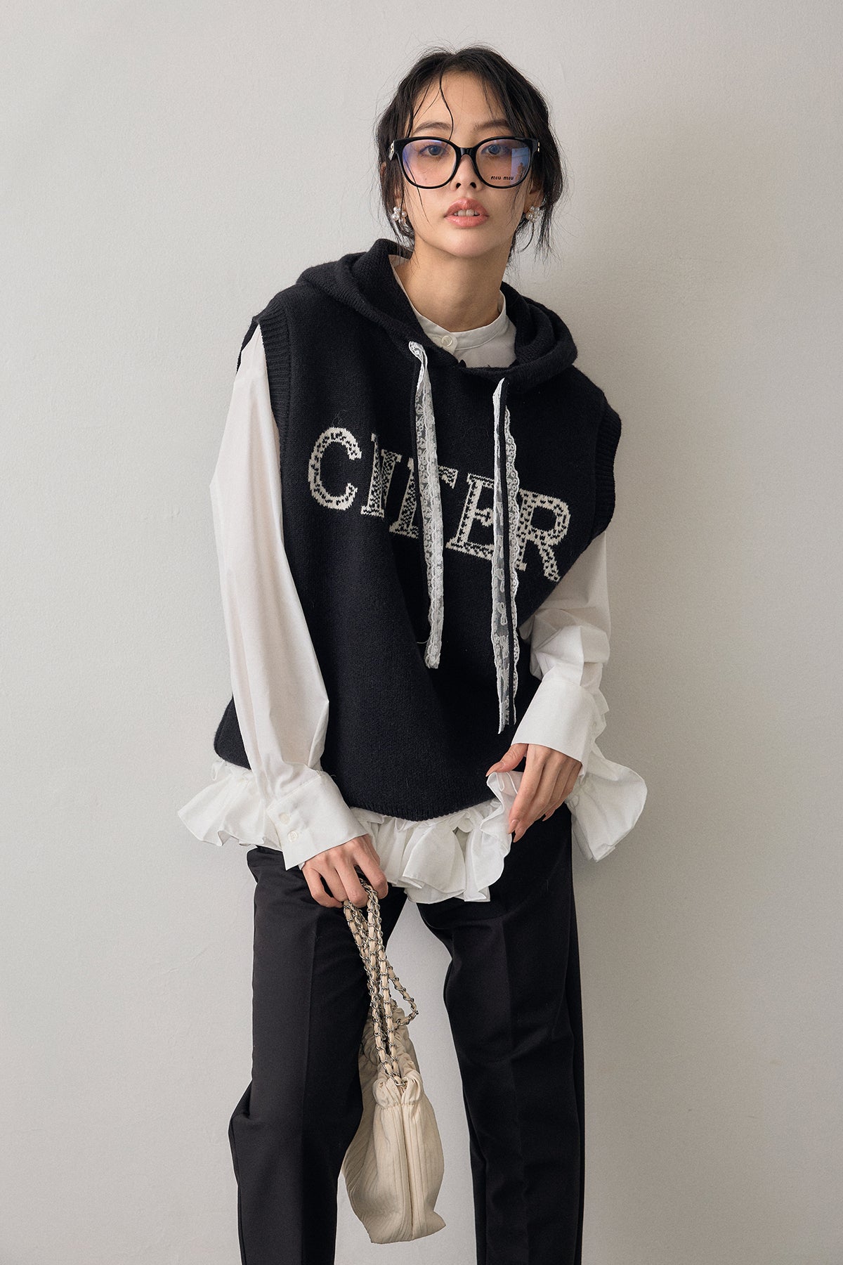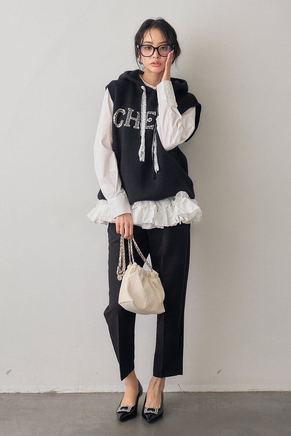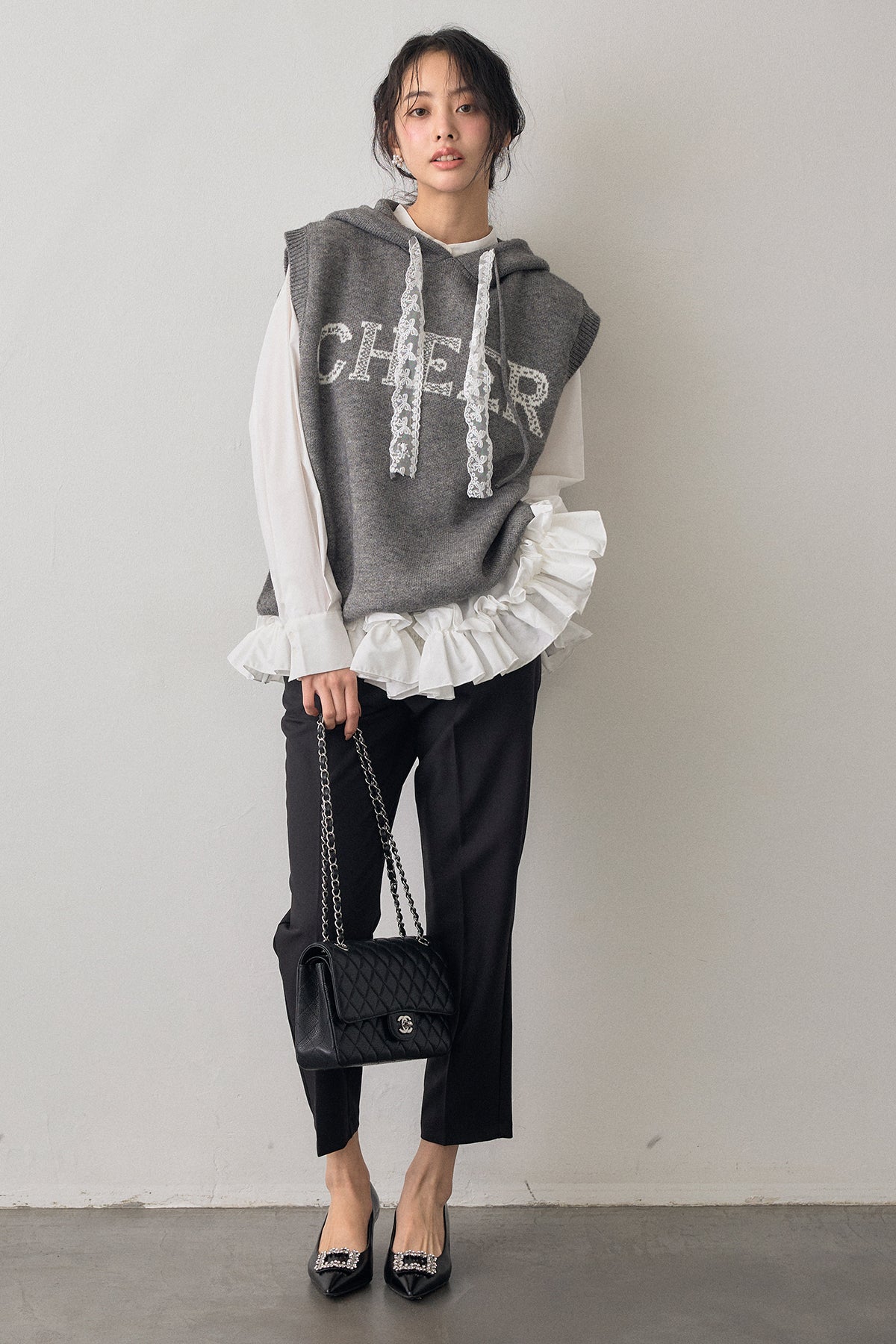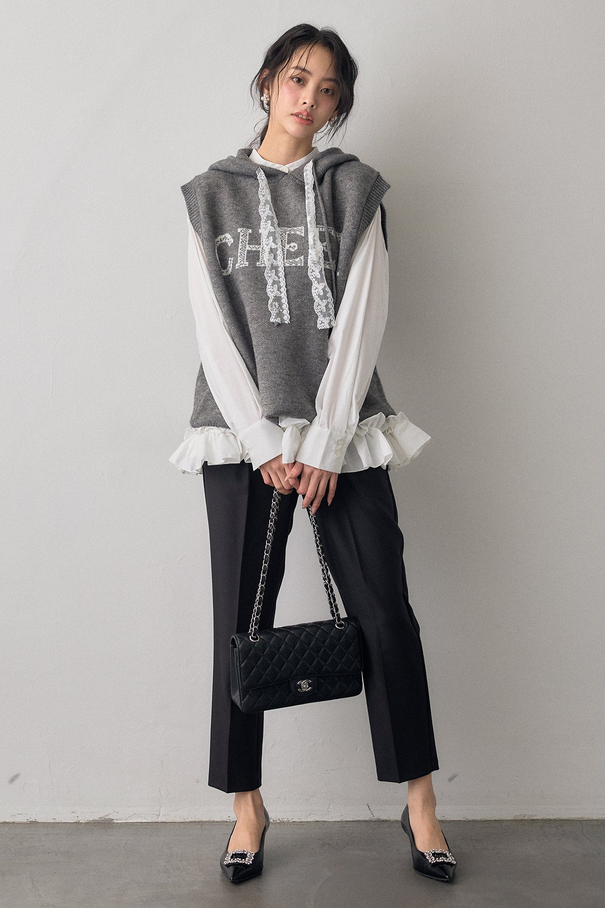 [予約/SET]パネルフレアヘムシャツ+レースリボンロゴフードスリーブレスニット+タックテーパードパンツ(3set)