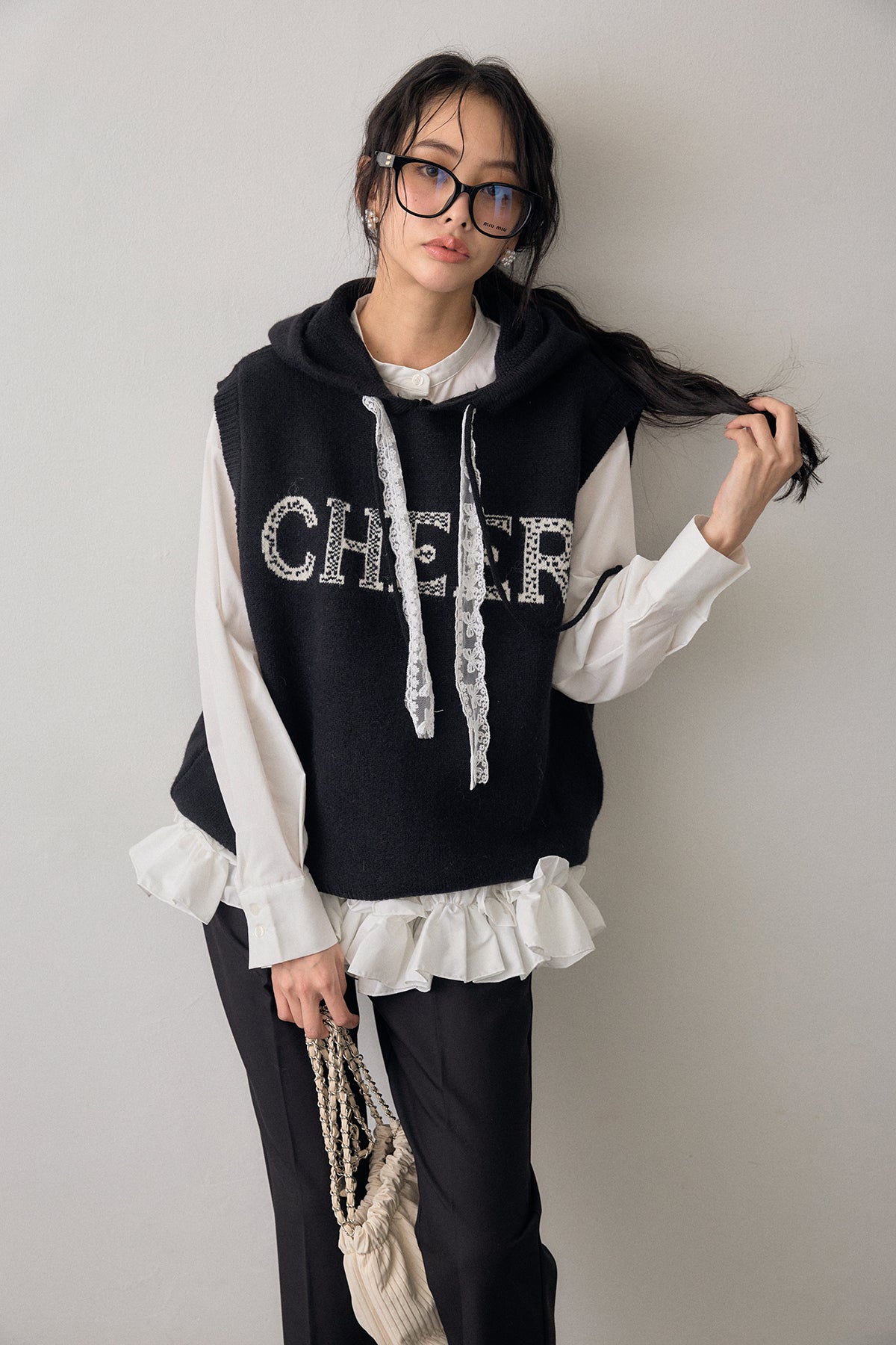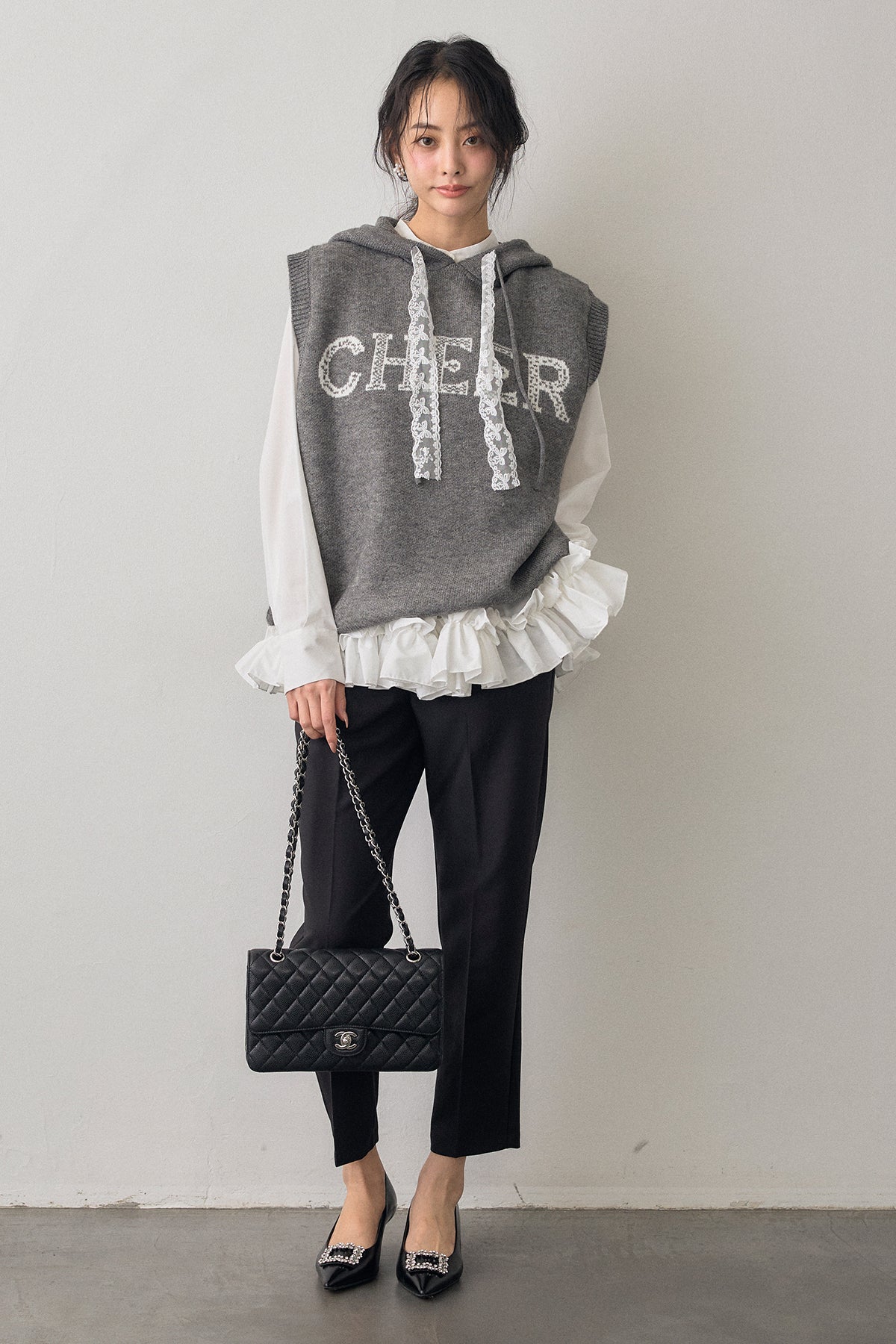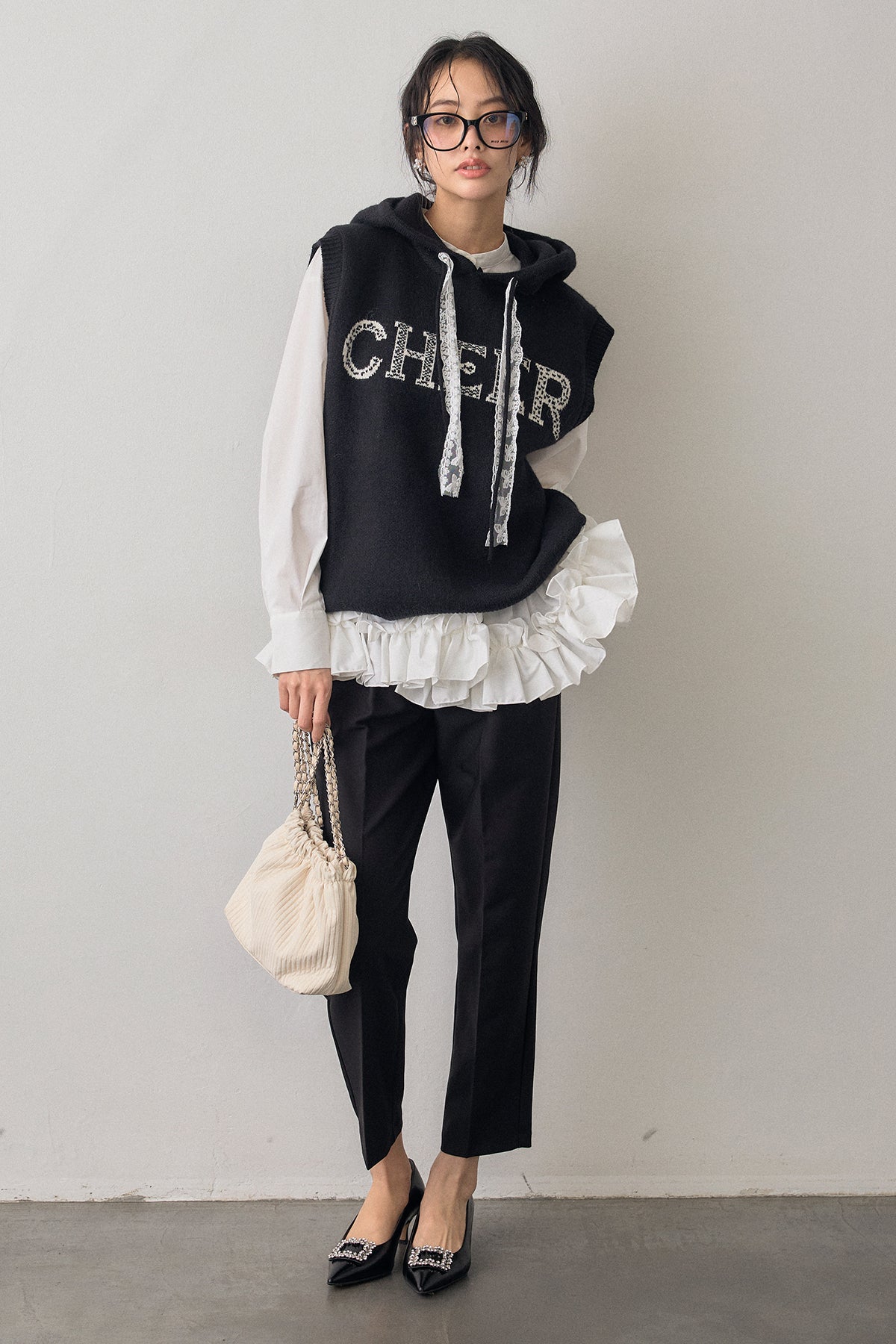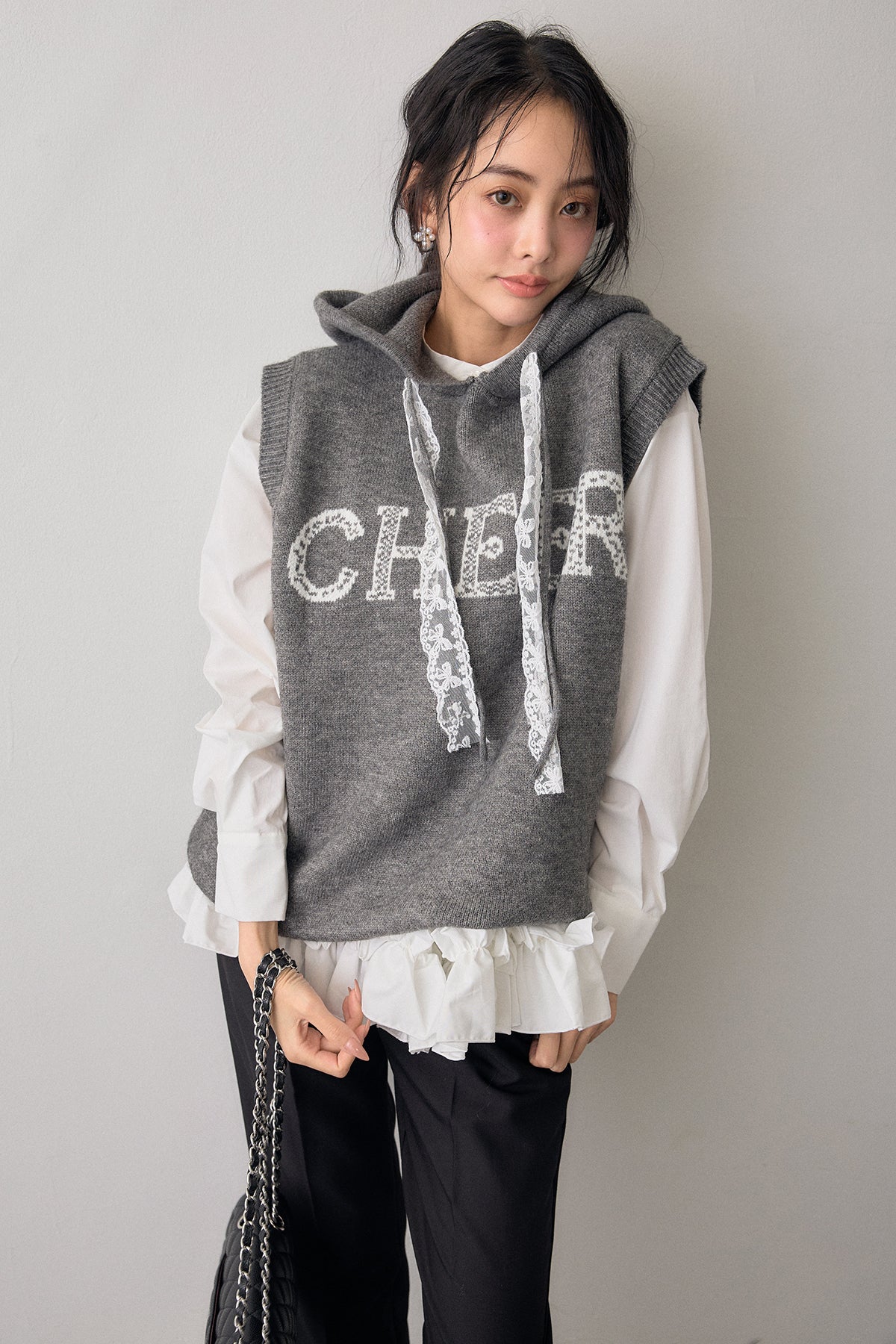 [予約/SET]パネルフレアヘムシャツ+レースリボンロゴフードスリーブレスニット+タックテーパードパンツ(3set)