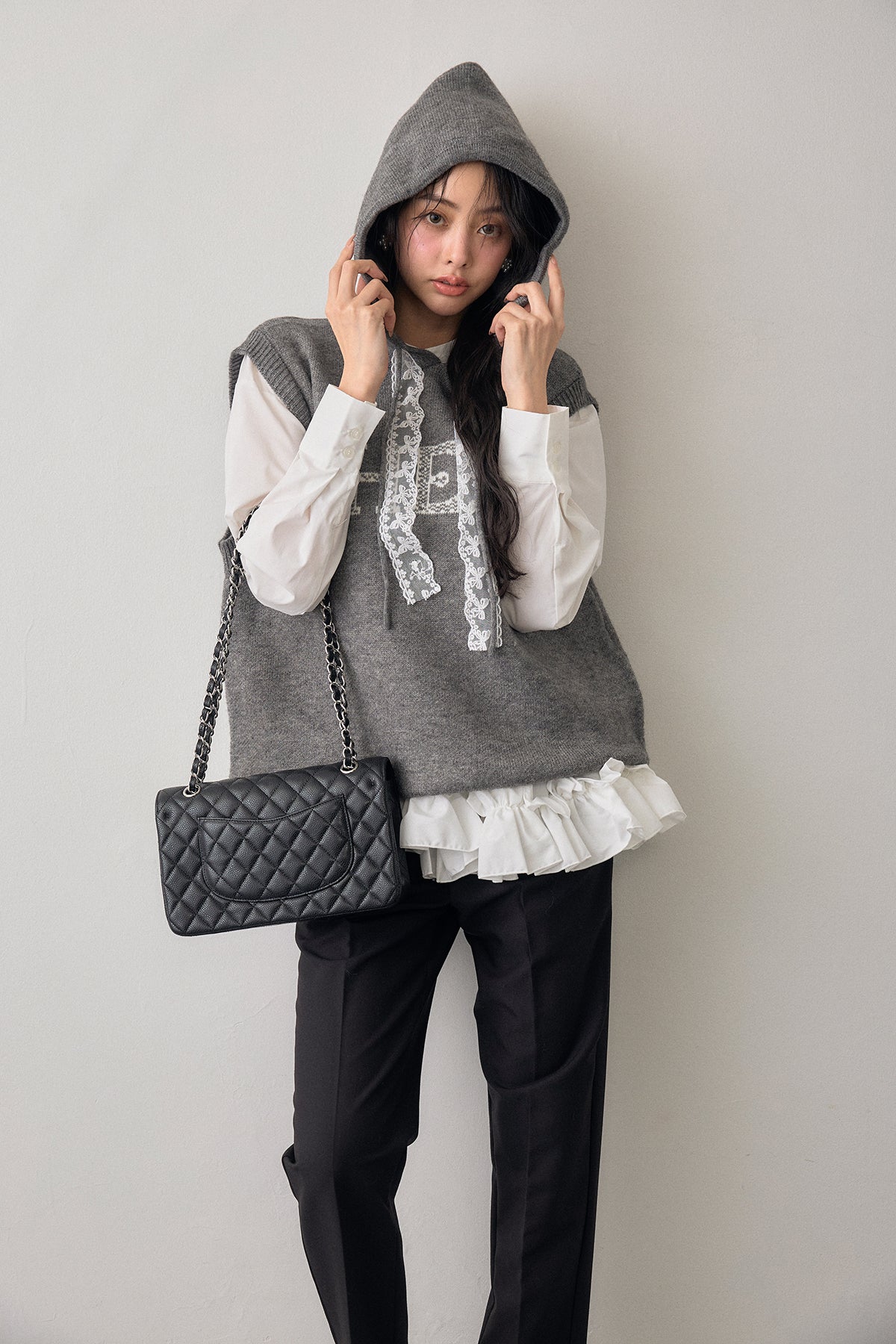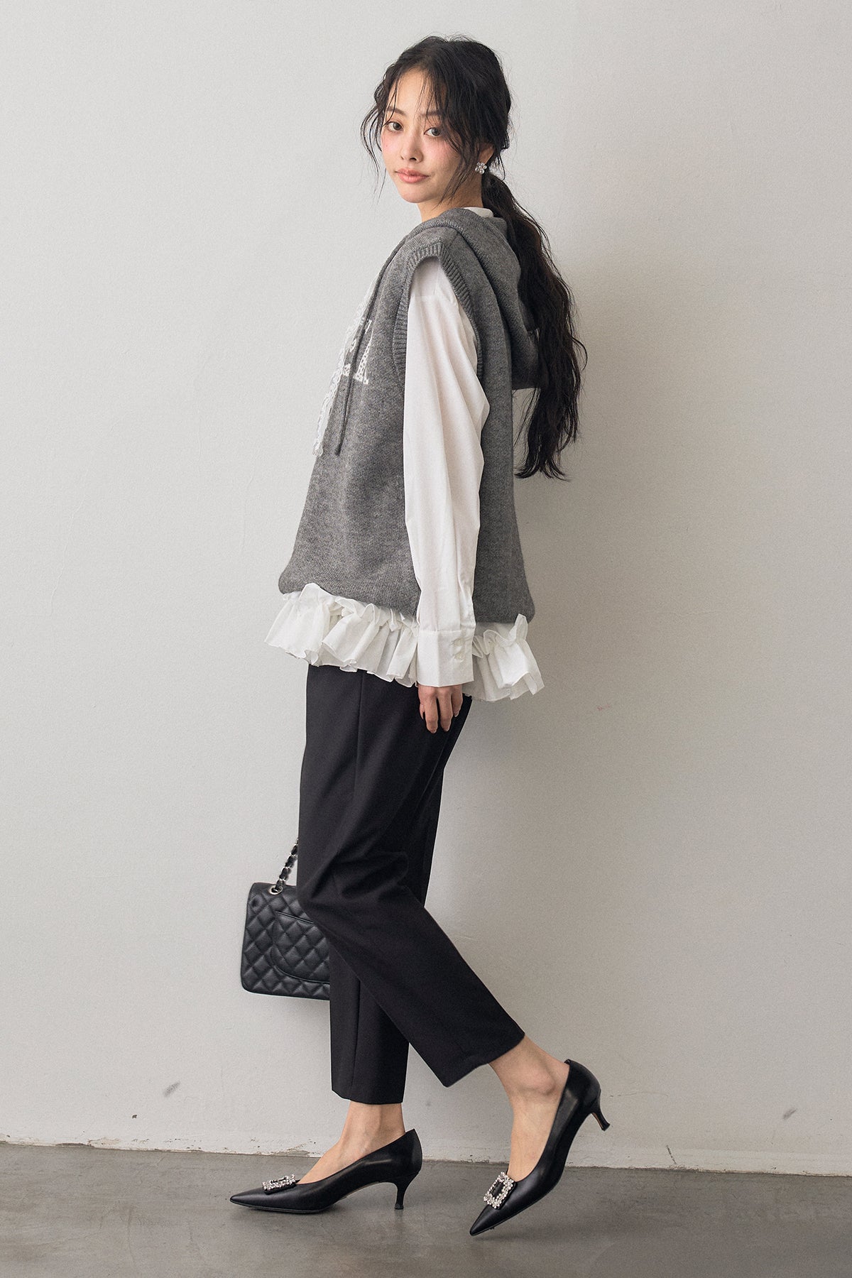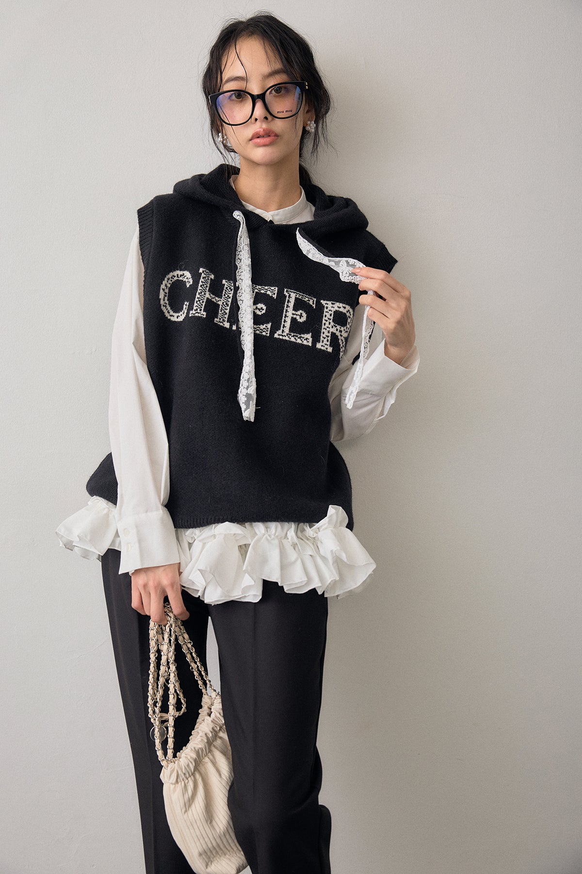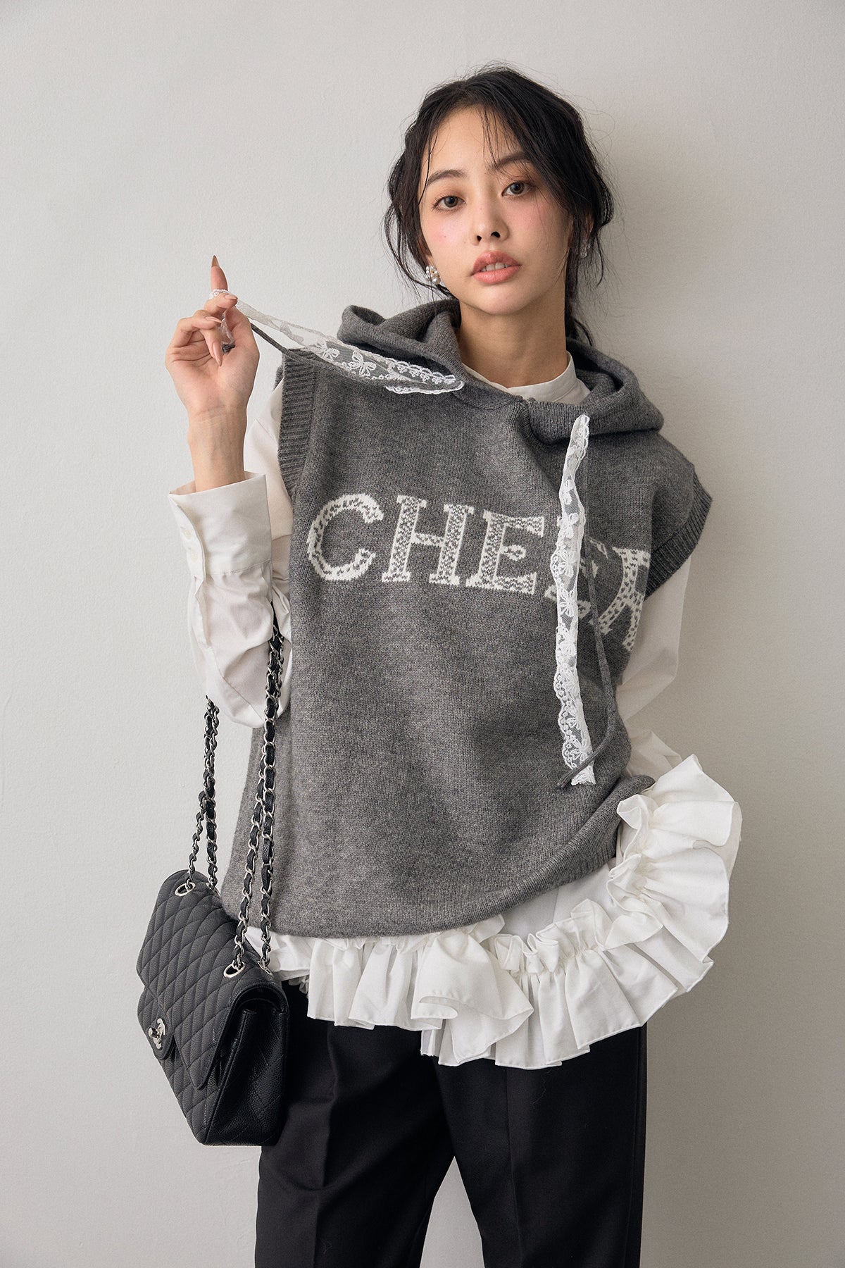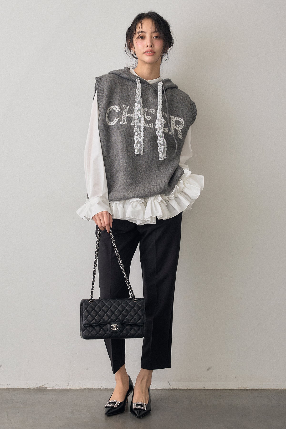 [予約/SET]パネルフレアヘムシャツ+レースリボンロゴフードスリーブレスニット+タックテーパードパンツ(3set)