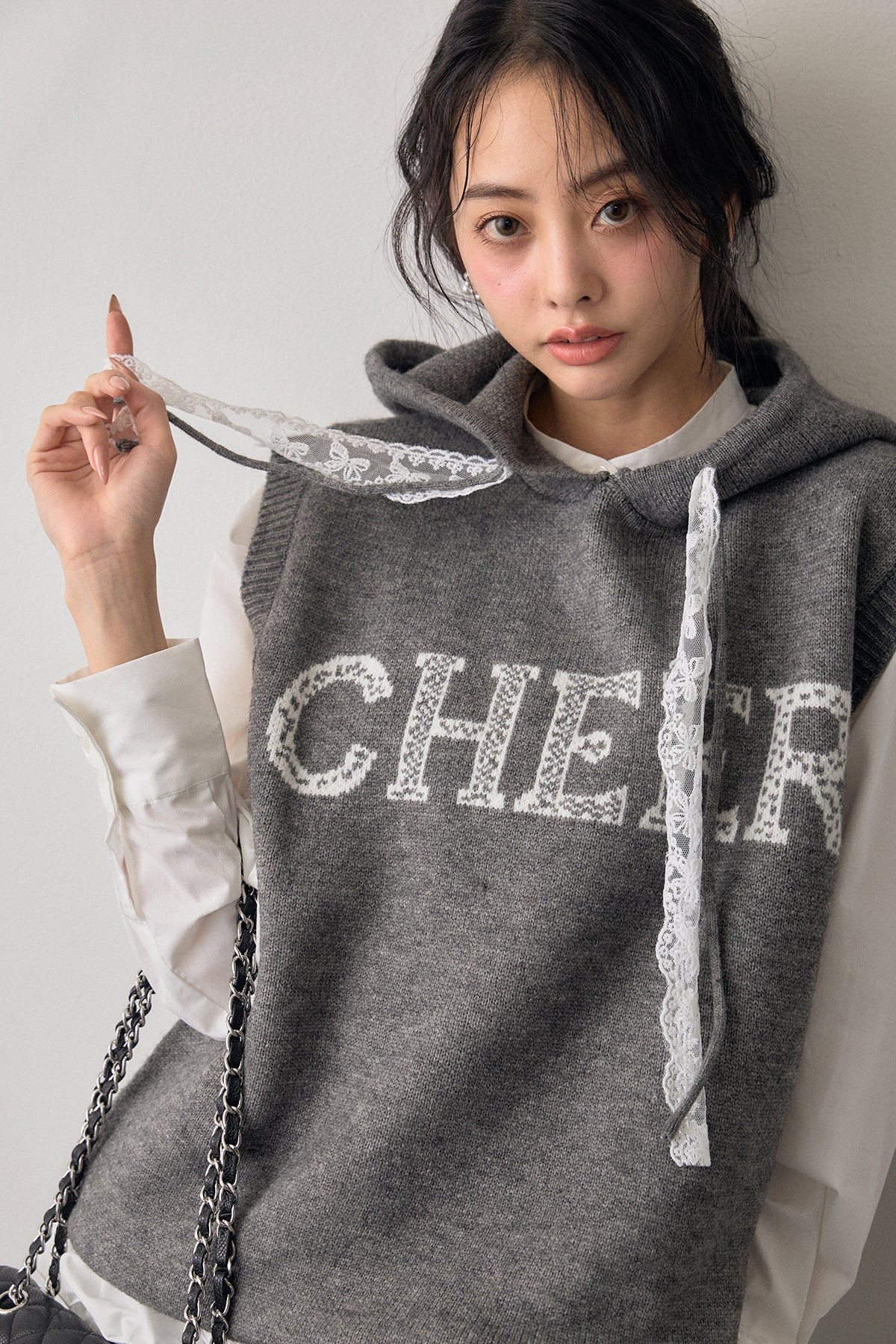 ◆ レースリボンロゴフードスリーブレスニット